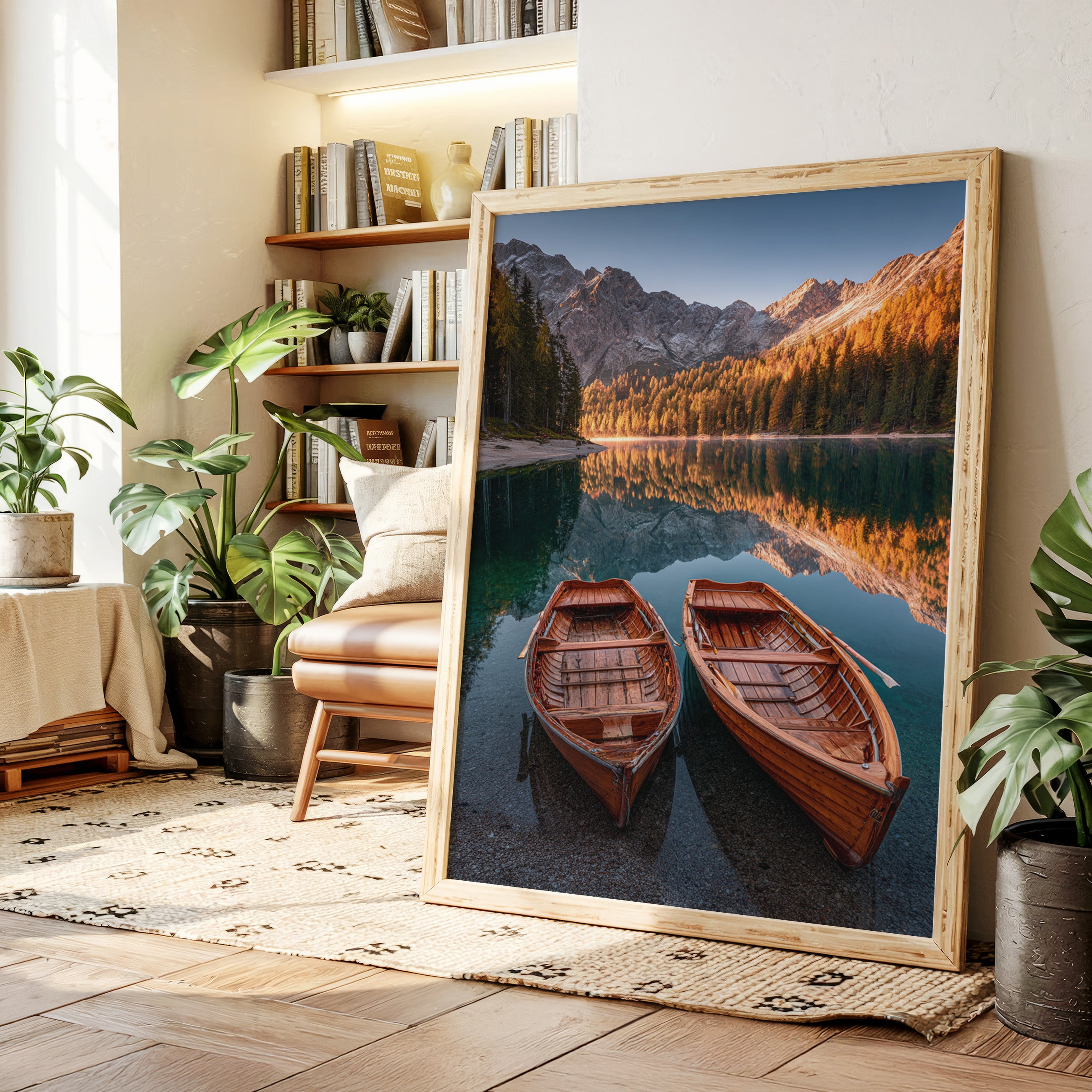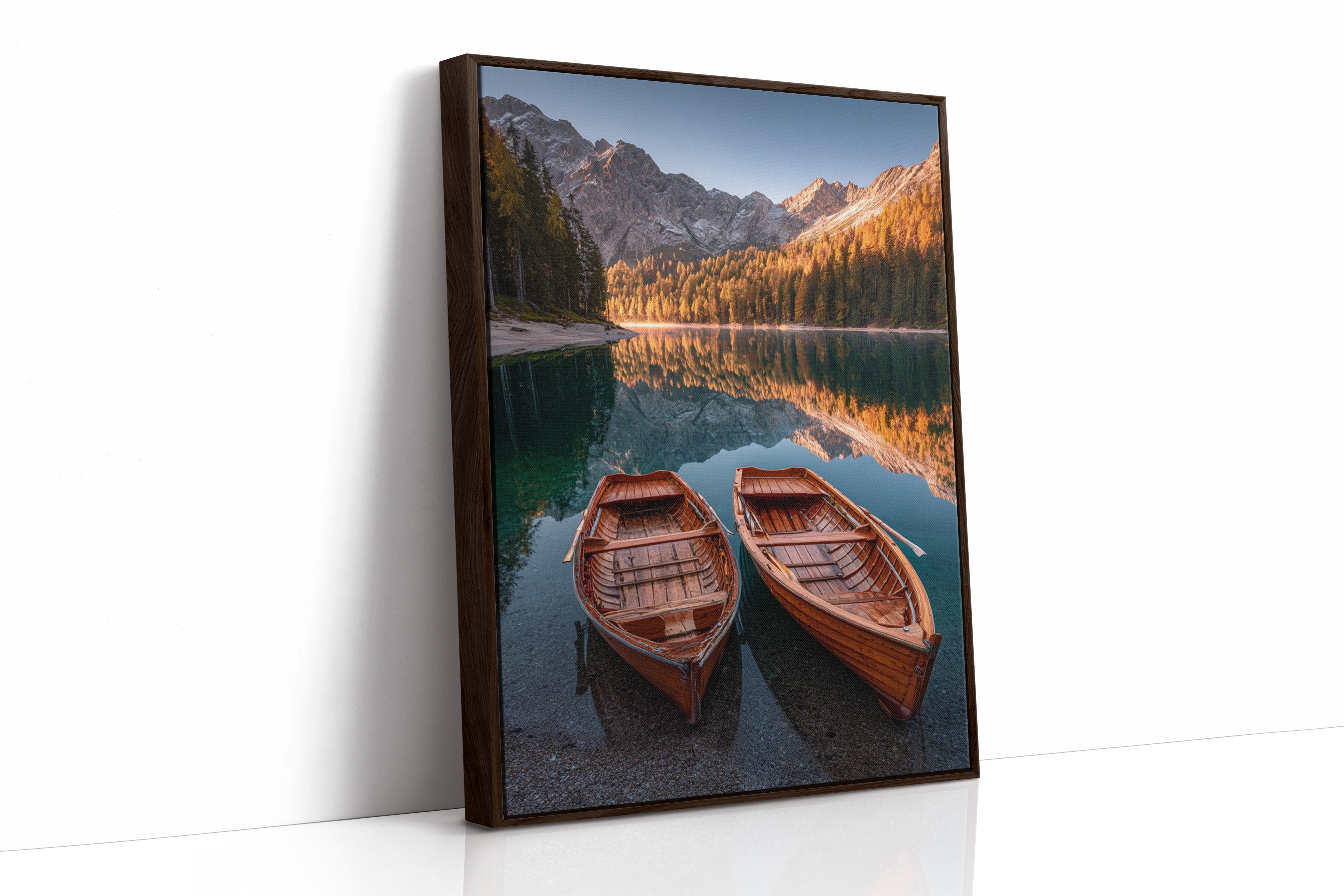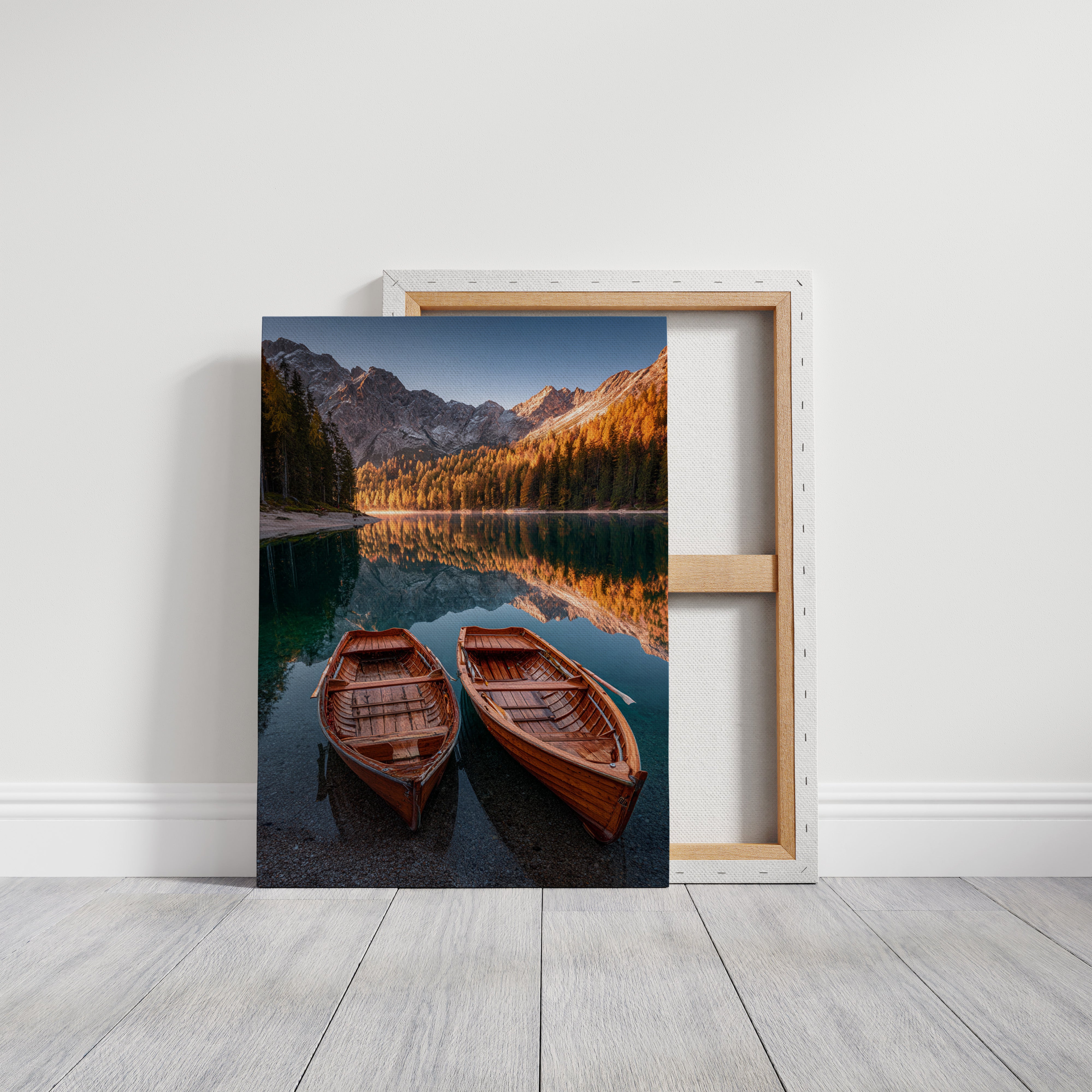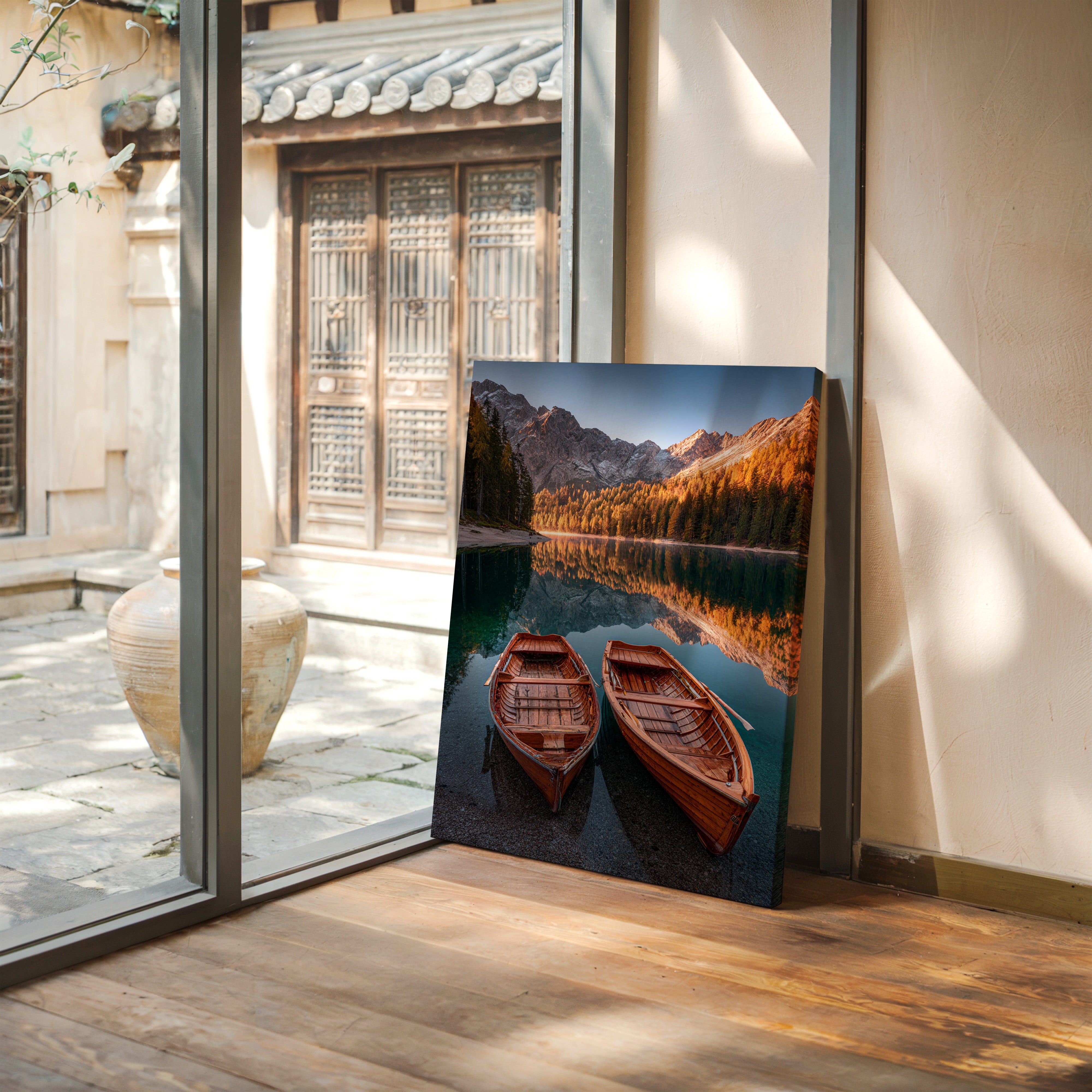 As the sun dips below the peaks, two wooden boats rest in tranquil waters, their reflections merging with the fiery hues of autumn foliage. A serene addition to the Artisanal collection, this piece captures nature's elegance in its purest form. The rich textures of the boats and the shimmering lake evoke a sense of nostalgia, inviting the viewer to imagine stories of journeys past and quiet moments shared. Perfect for a cozy living room or a serene study, this artwork brings warmth and a touch of adventure to any space.