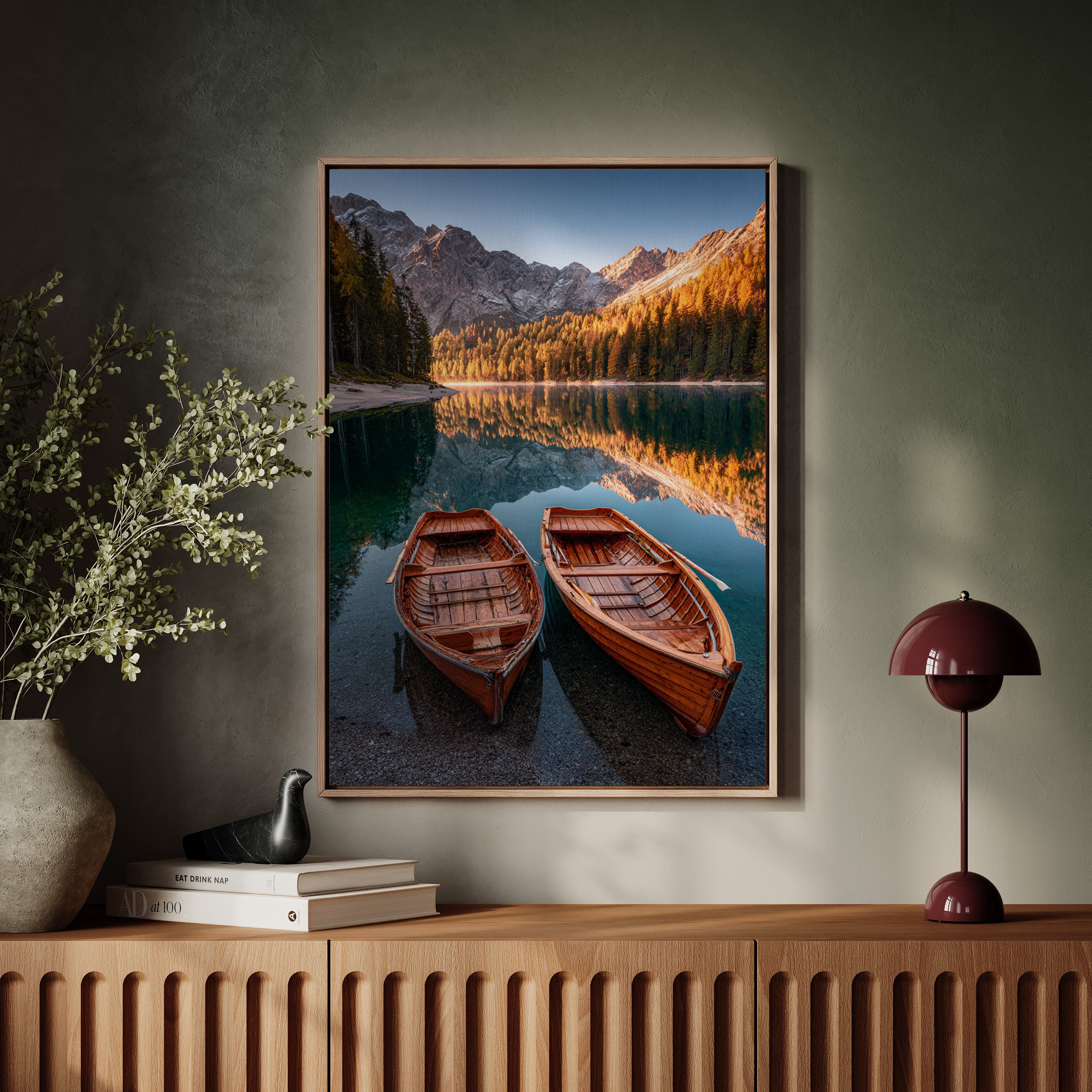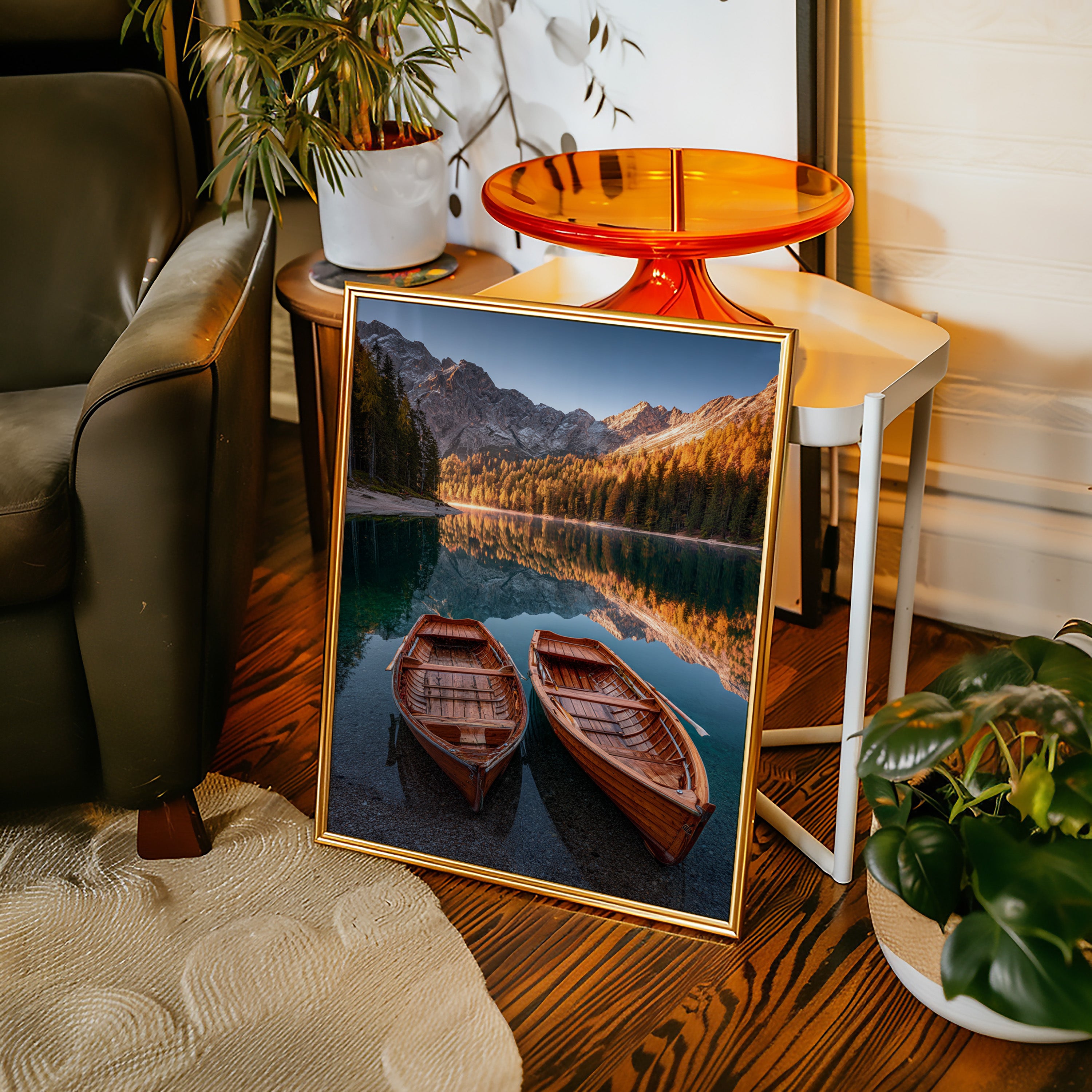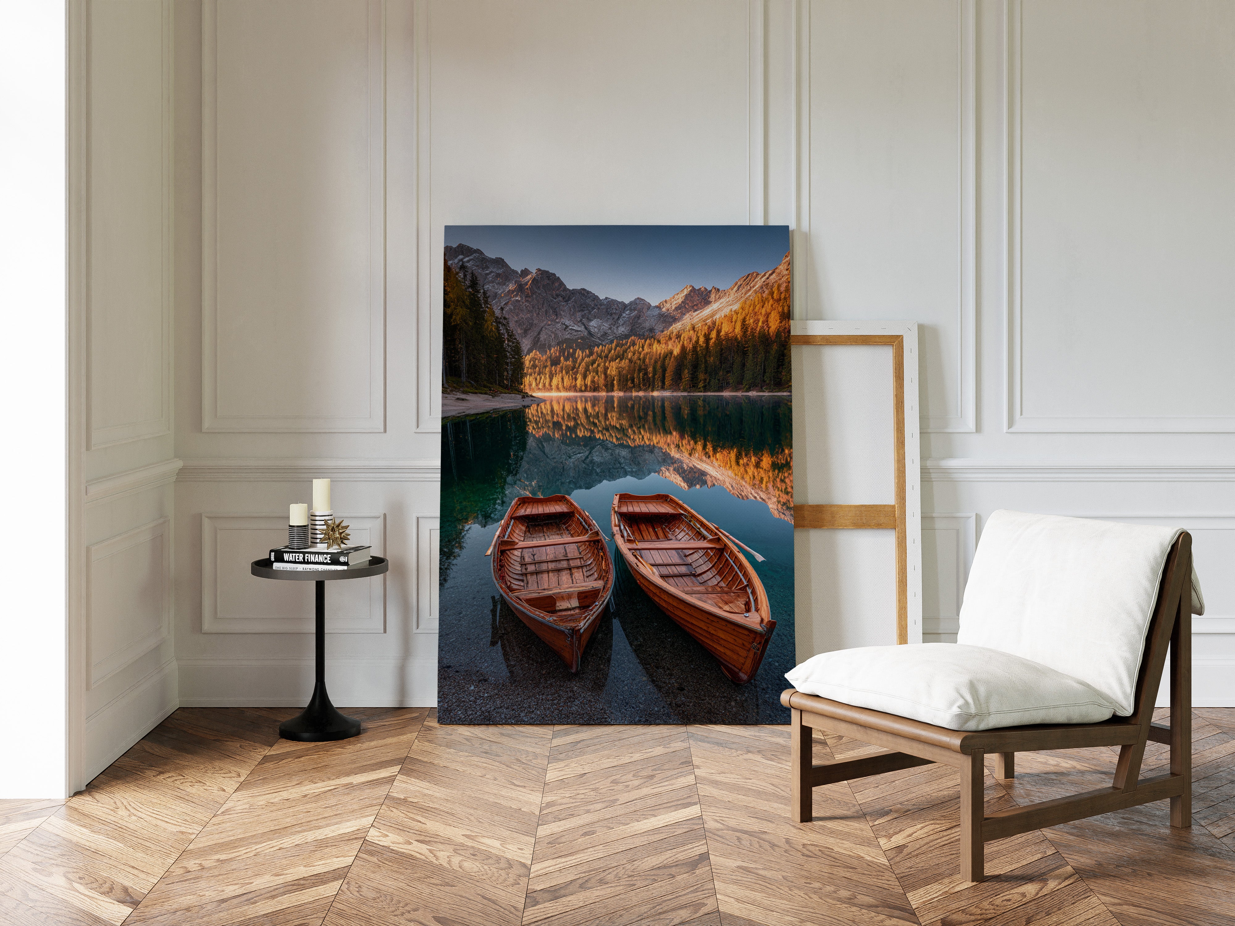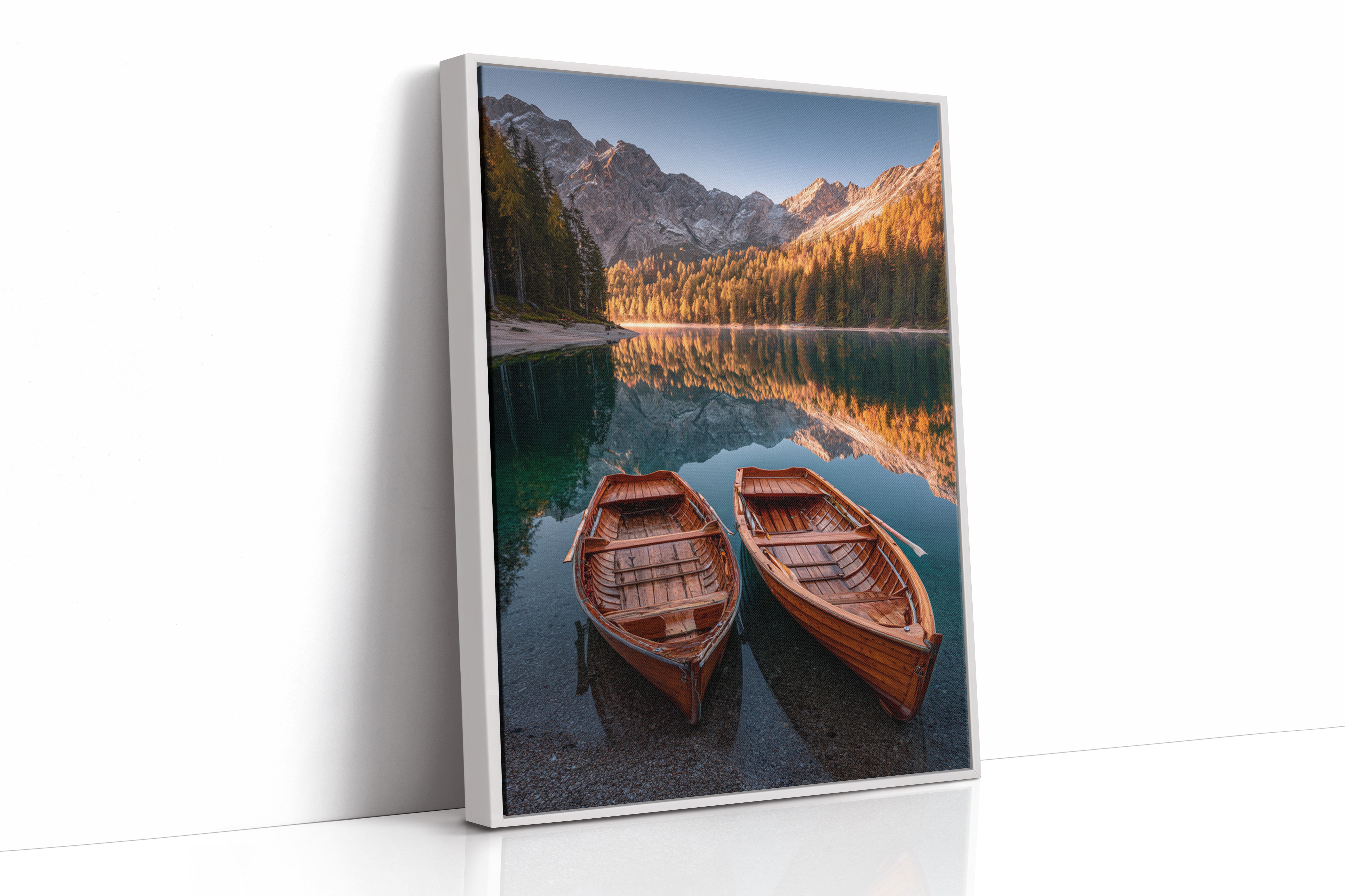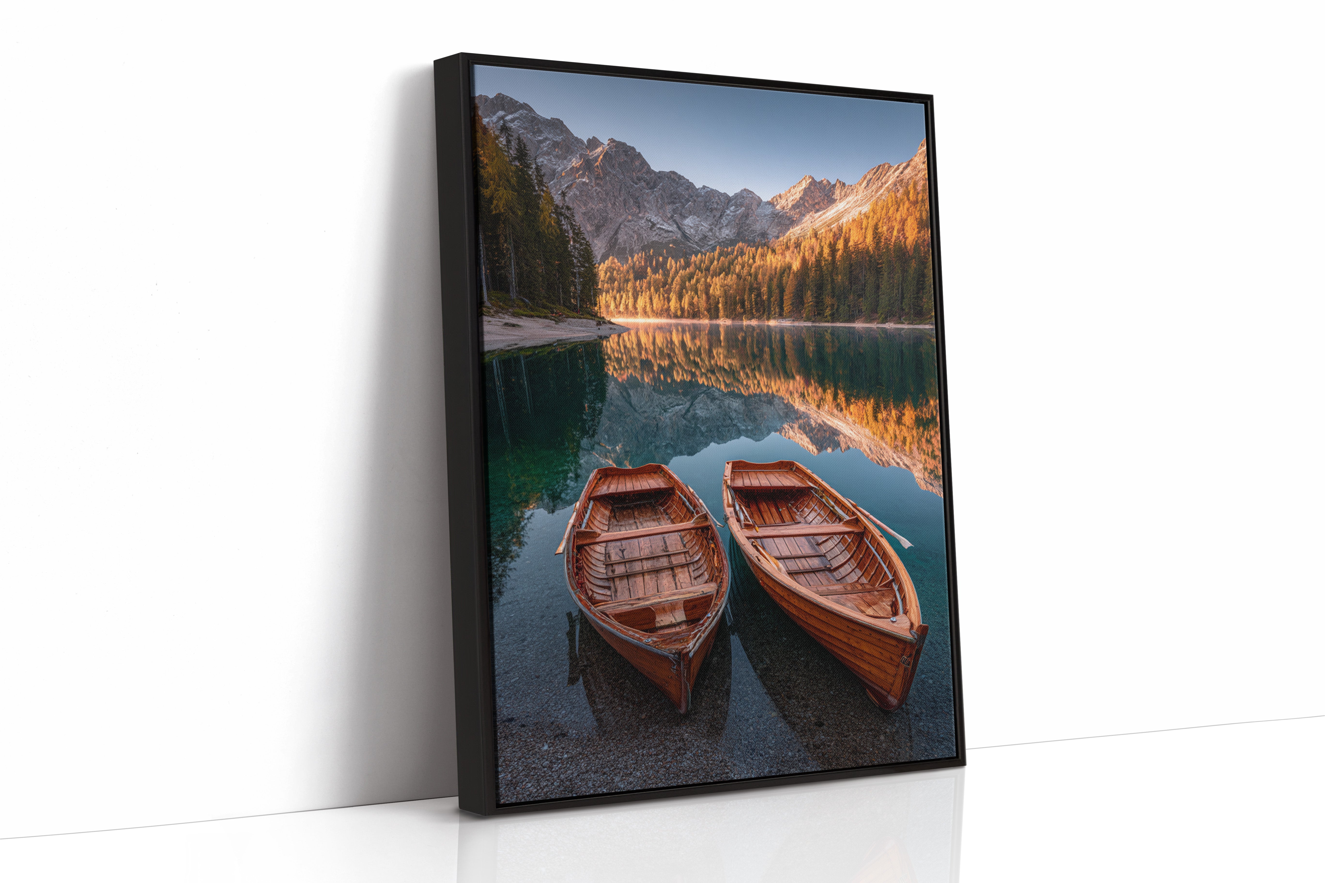As the sun dips below the peaks, two wooden boats rest in tranquil waters, their reflections merging with the fiery hues of autumn foliage. A serene addition to the Artisanal collection, this piece captures nature's elegance in its purest form. The rich textures of the boats and the shimmering lake evoke a sense of nostalgia, inviting the viewer to imagine stories of journeys past and quiet moments shared. Perfect for a cozy living room or a serene study, this artwork brings warmth and a touch of adventure to any space.