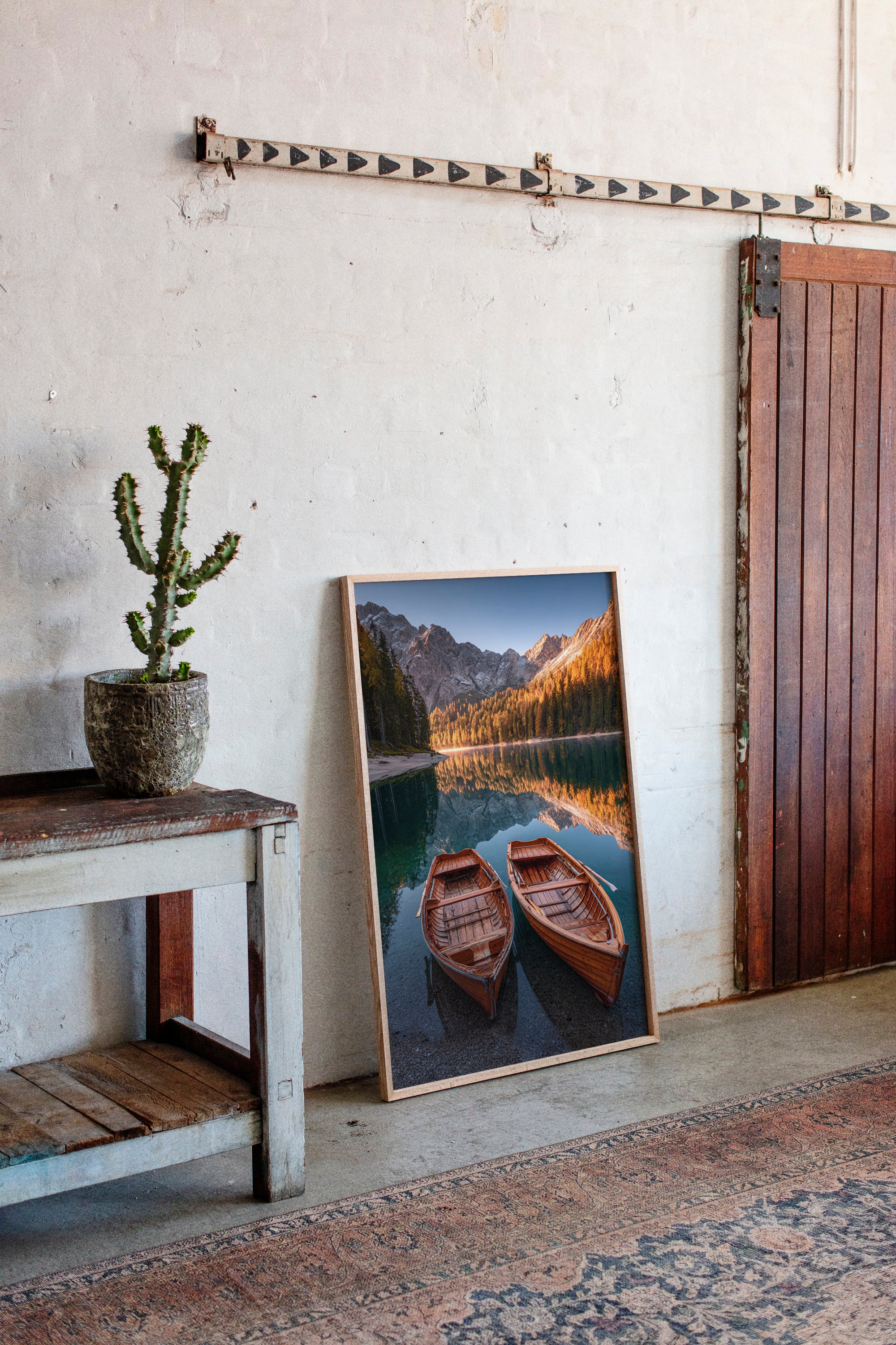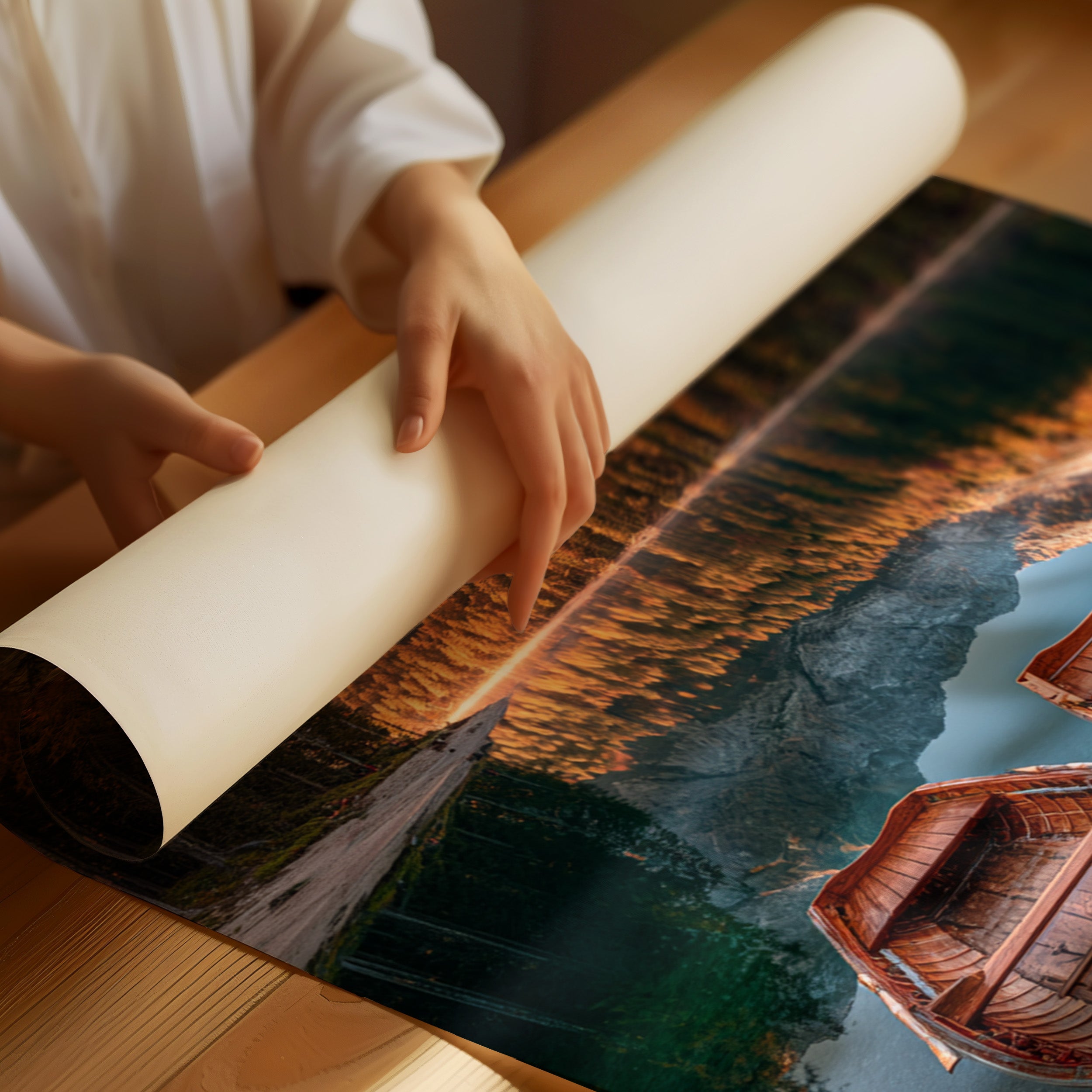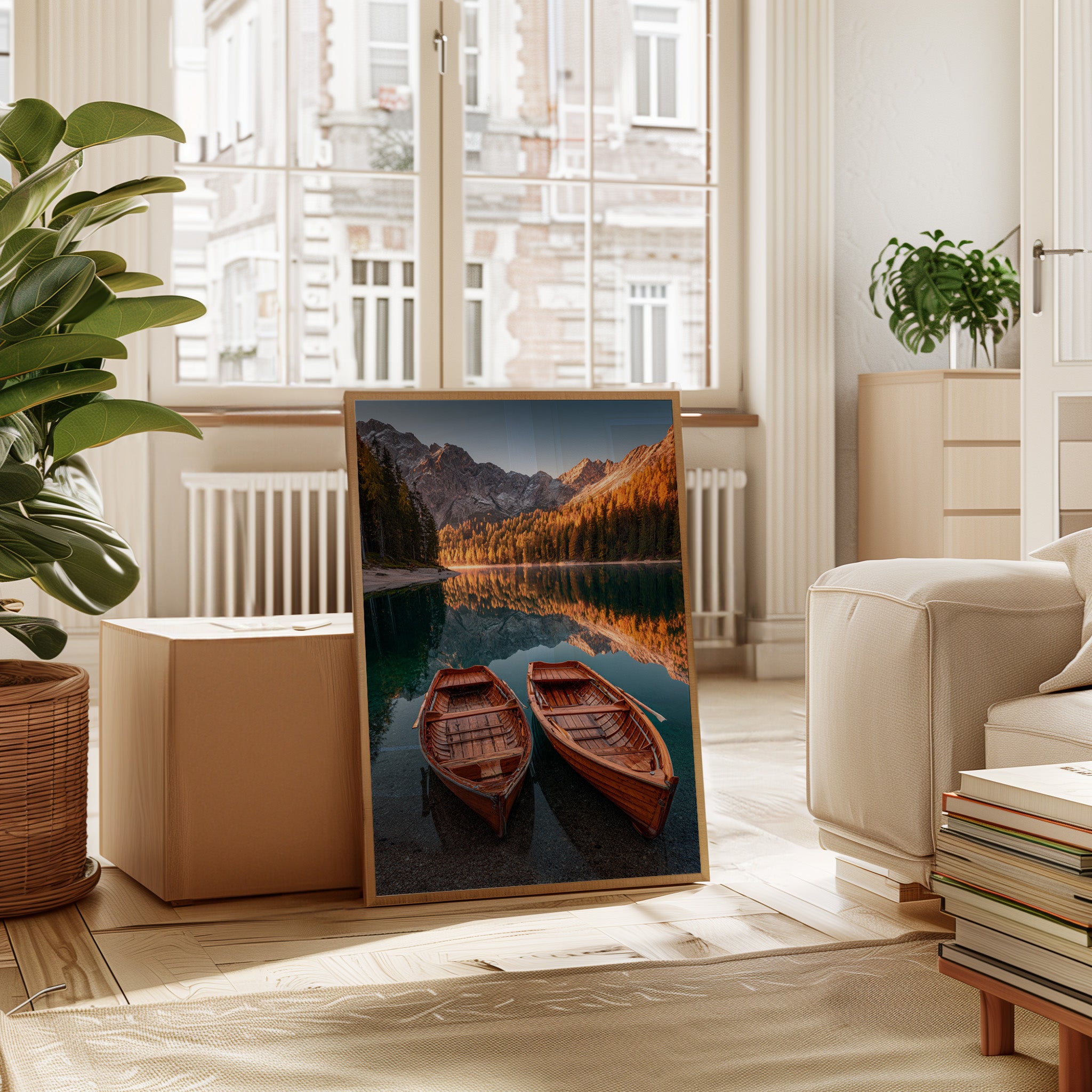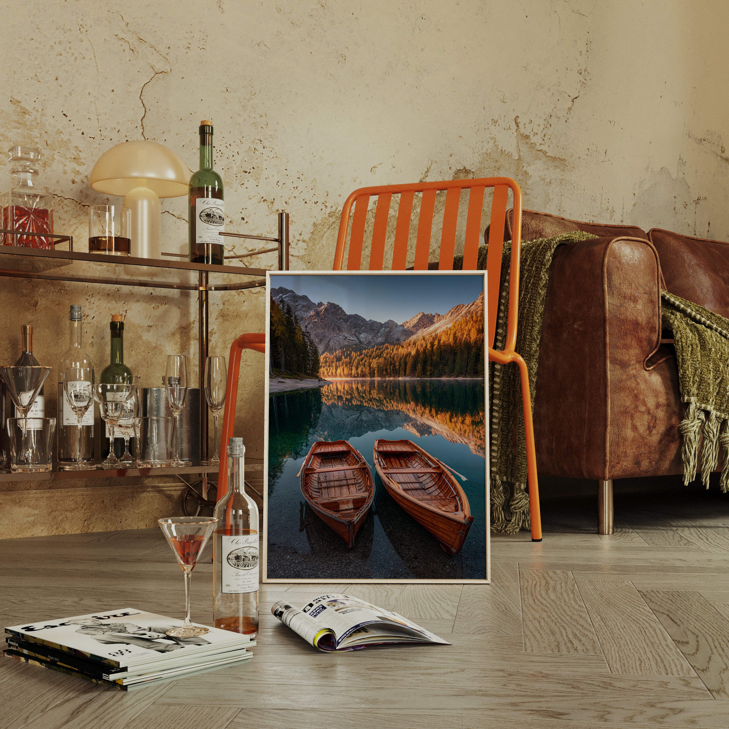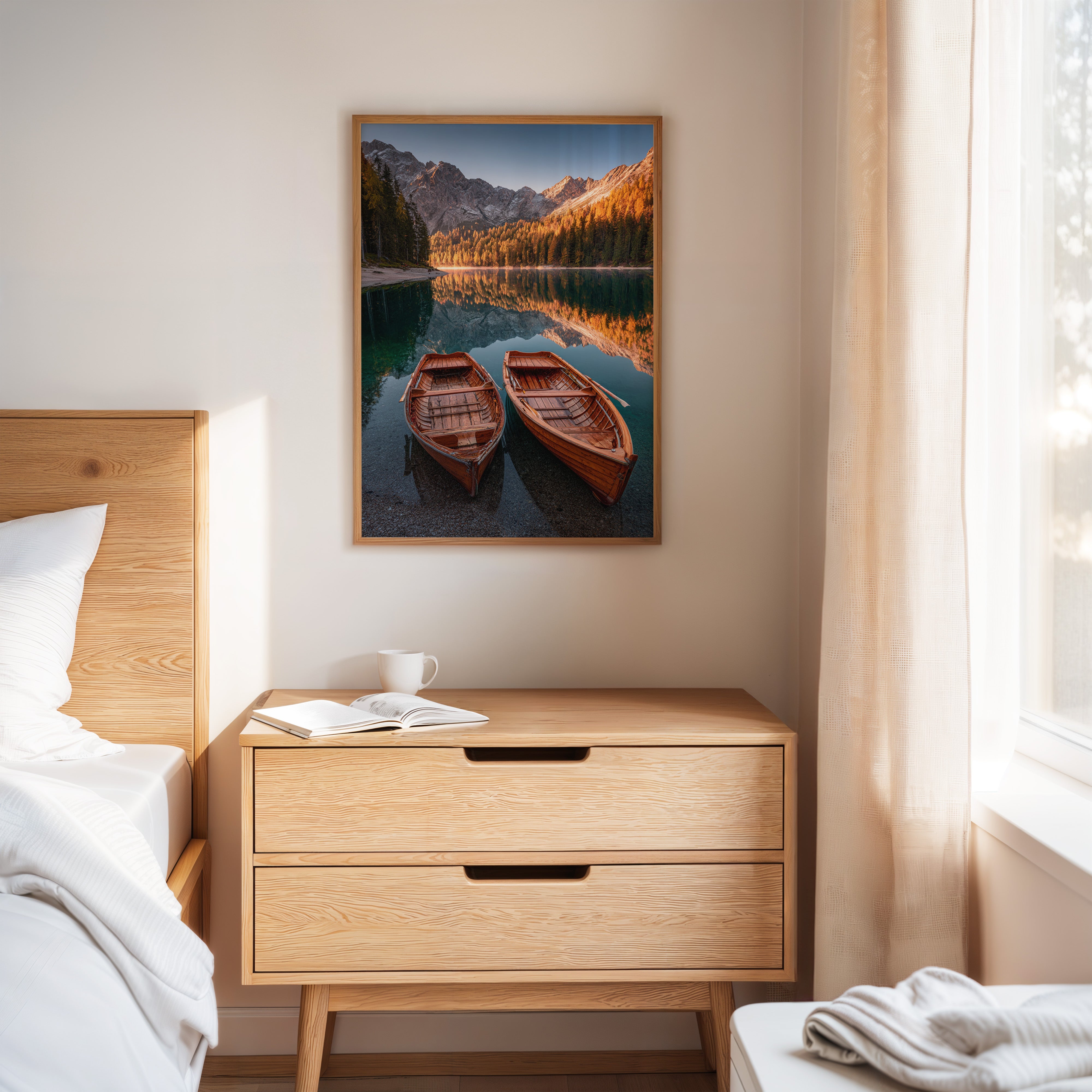 As the sun dips below the peaks, two wooden boats rest in tranquil waters, their reflections merging with the fiery hues of autumn foliage. A serene addition to the Artisanal collection, this piece captures nature's elegance in its purest form. The rich textures of the boats and the shimmering lake evoke a sense of nostalgia, inviting the viewer to imagine stories of journeys past and quiet moments shared. Perfect for a cozy living room or a serene study, this artwork brings warmth and a touch of adventure to any space.