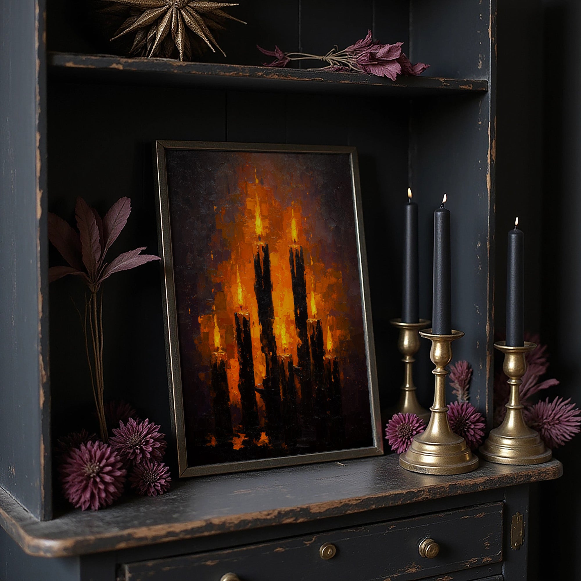 Heat radiates from the canvas as molten towers emerge from darkness. Bold strokes of amber, crimson, and gold create a metropolitan silhouette that seems to burn against the night, textured impasto suggesting both destruction and rebirth. The reflection below mirrors this fiery skyline, creating a symmetry that speaks to the duality of urban existenceboth vibrant and consuming.