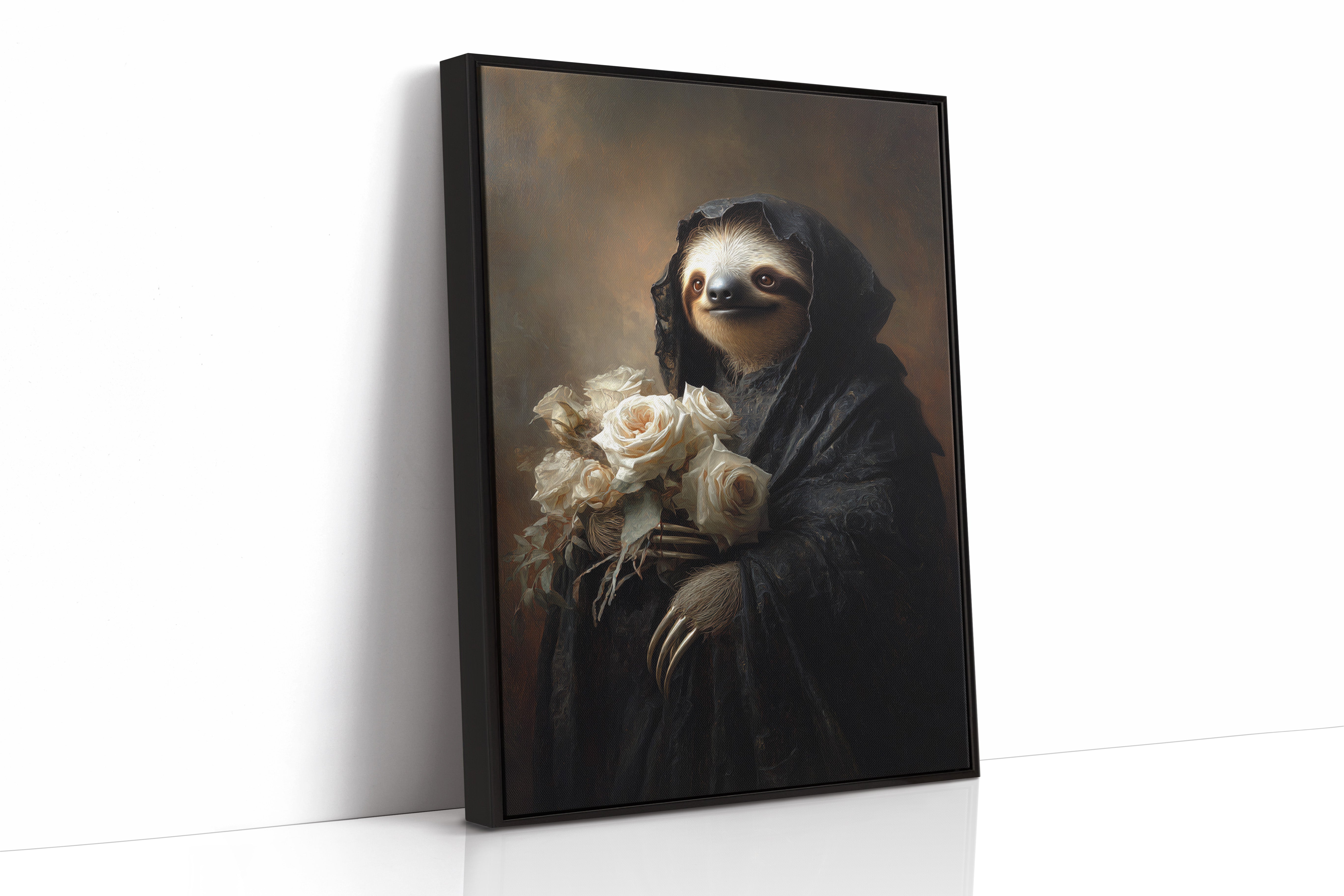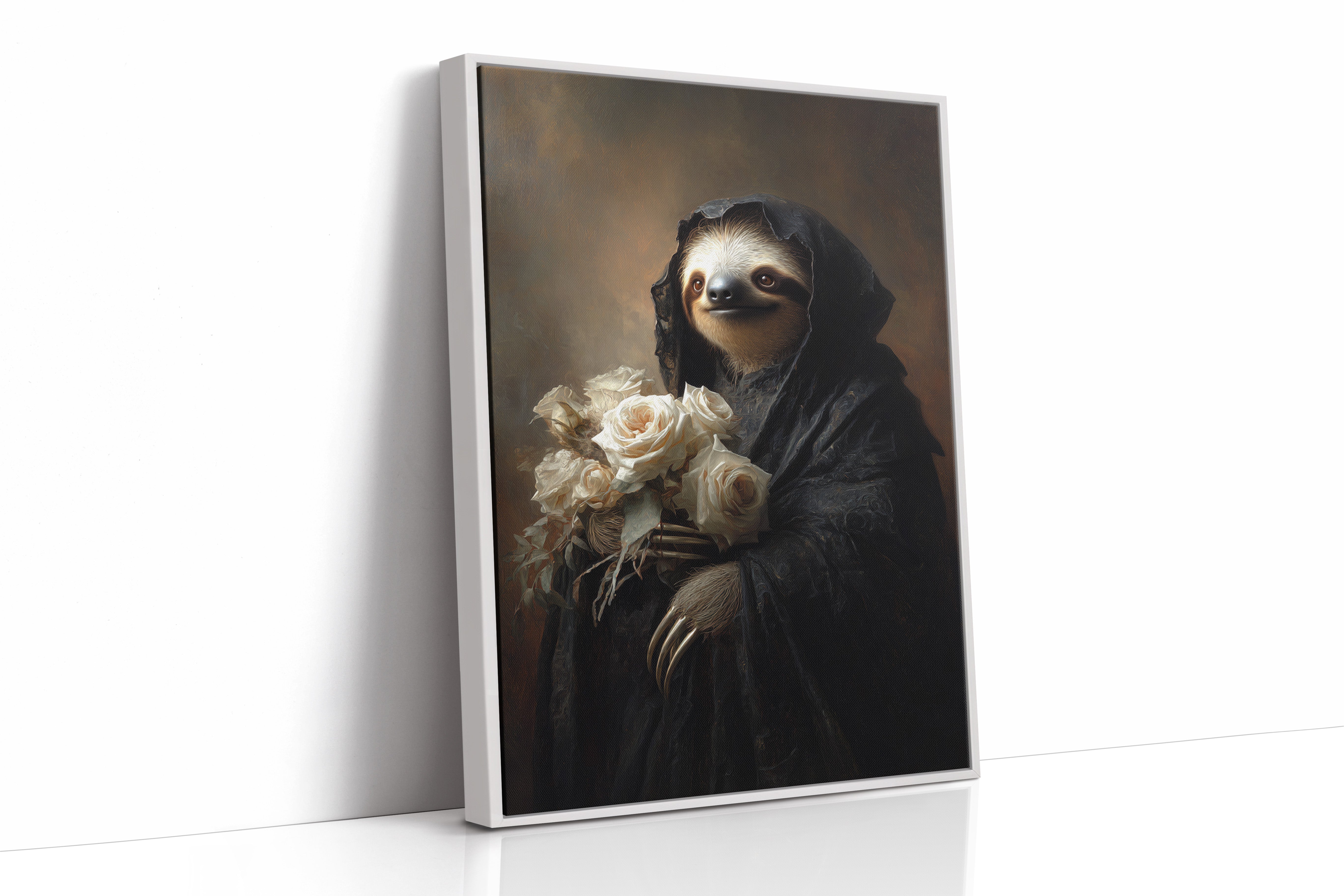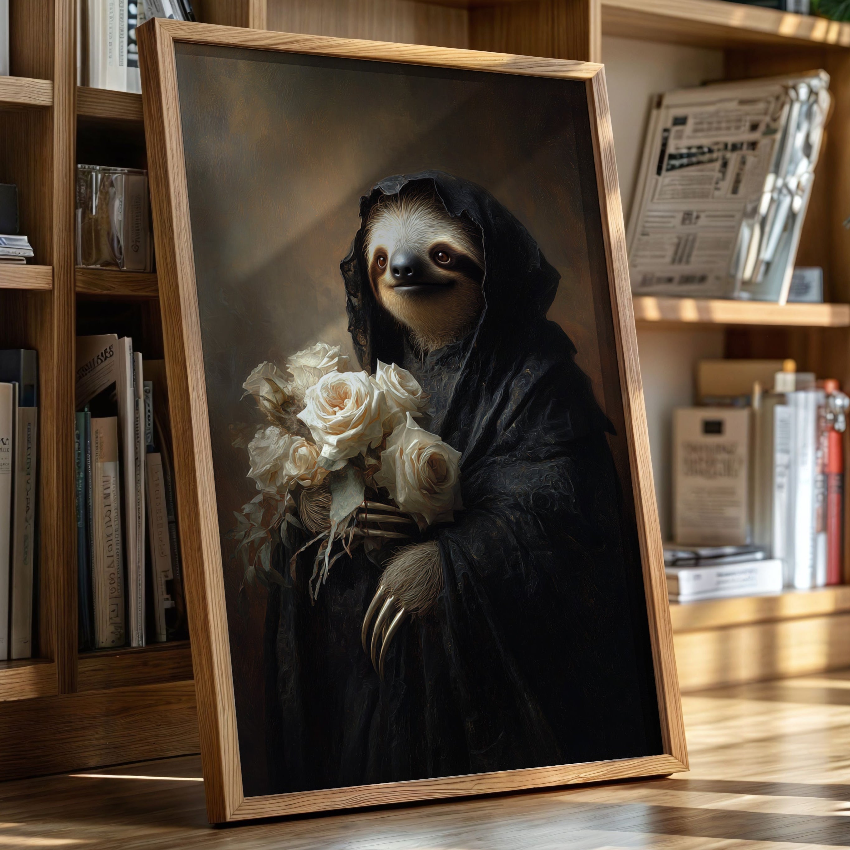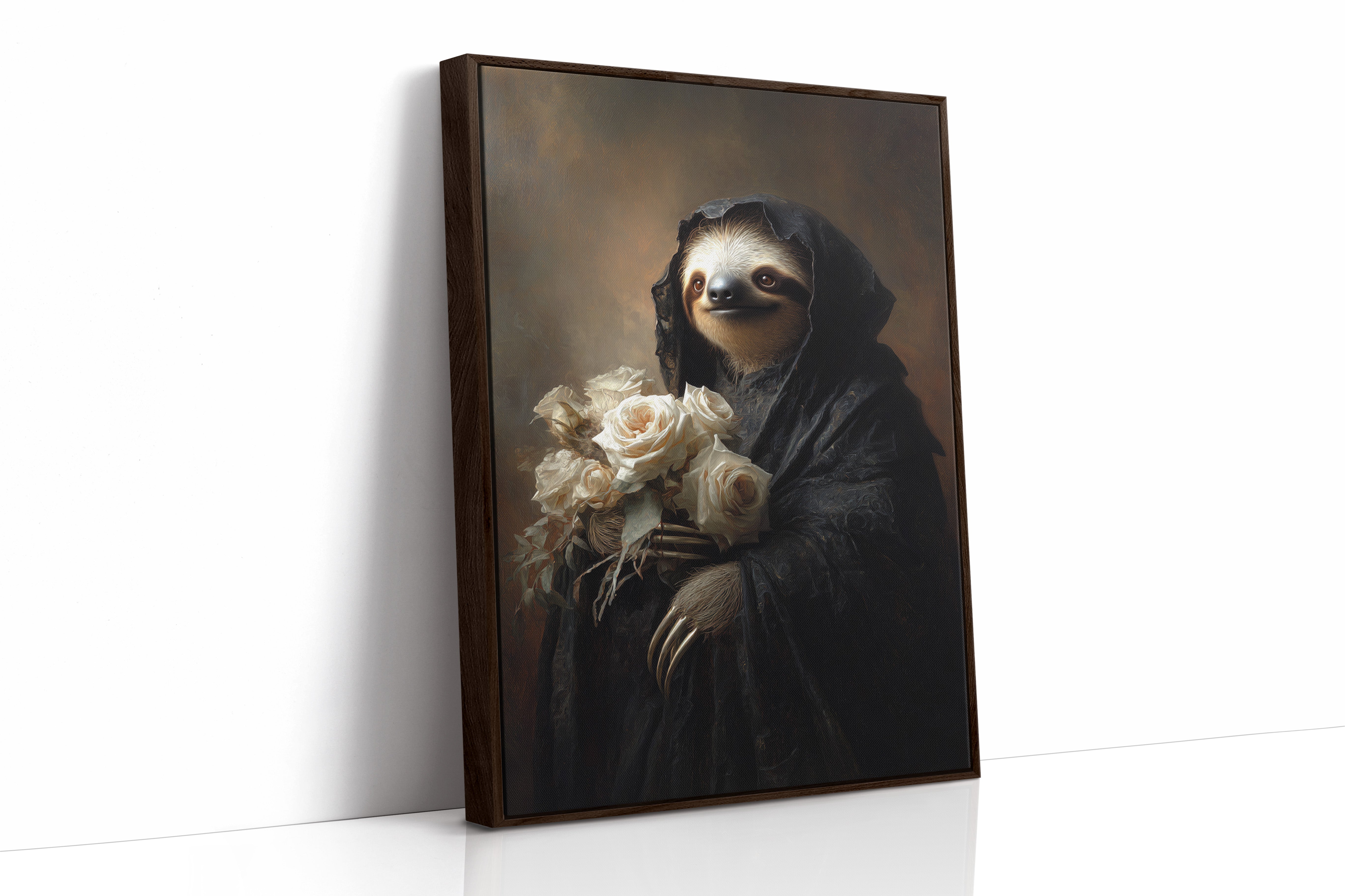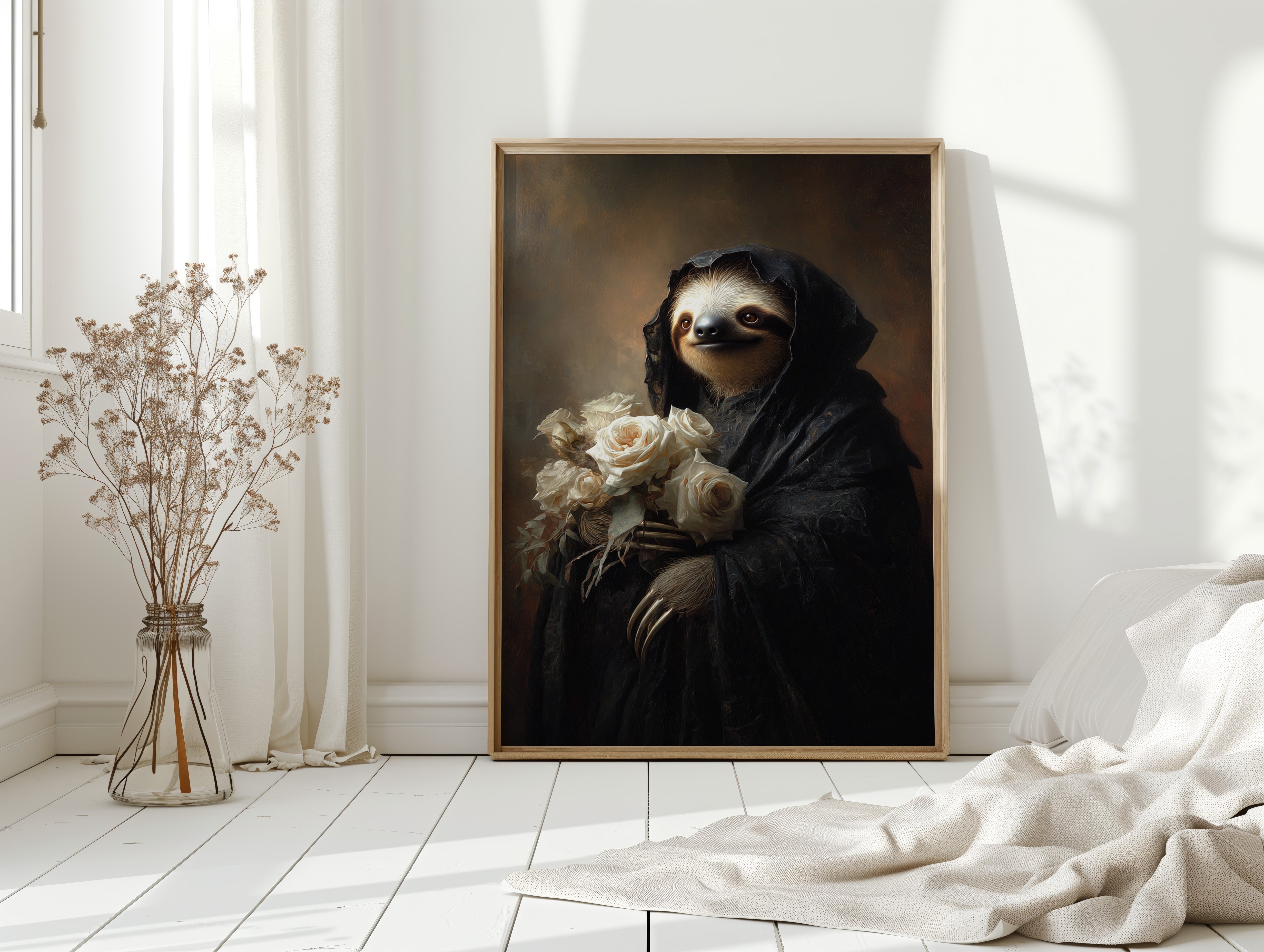 In a world where time slows, a sloth draped in a dark cloak cradles a bouquet of white roses. The scene resonates with a quiet elegance, embodying a moment suspended in tenderness. The intricate textures of the cloak contrast beautifully with the soft petals, creating a visual harmony that invites reflection on lifes delicate balance. Ideal for a cozy reading nook or an introspective corner, this piece invites contemplation and warmth.