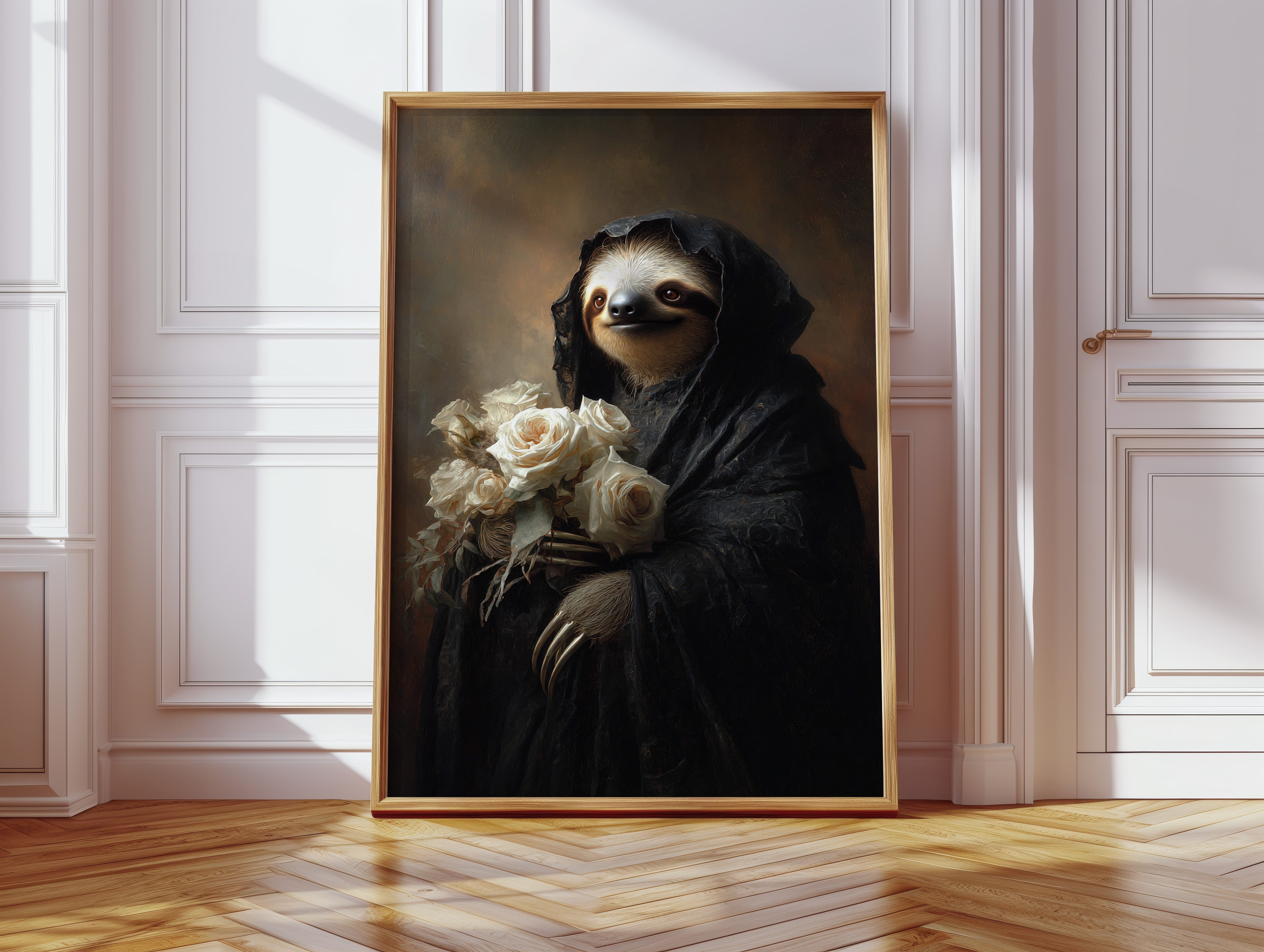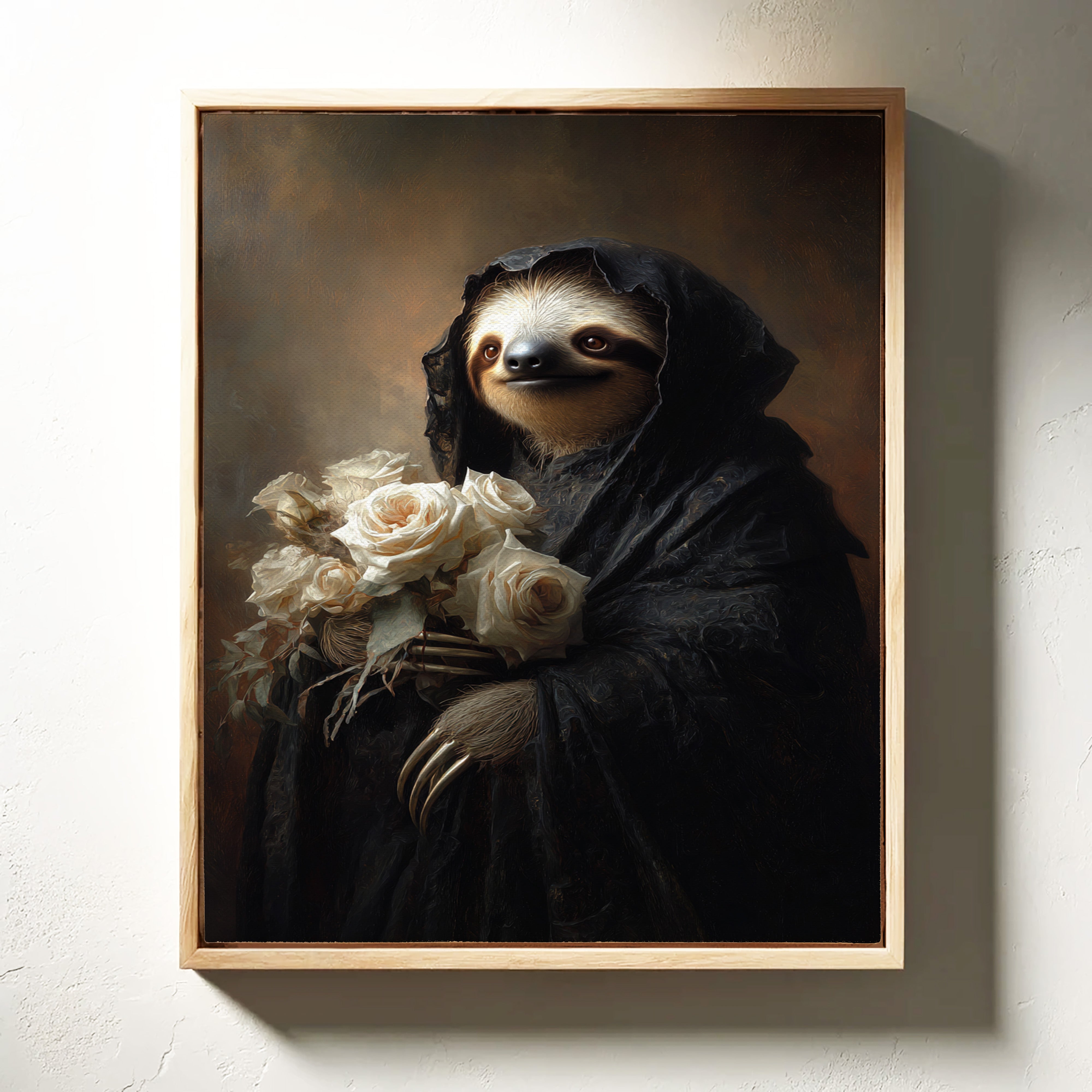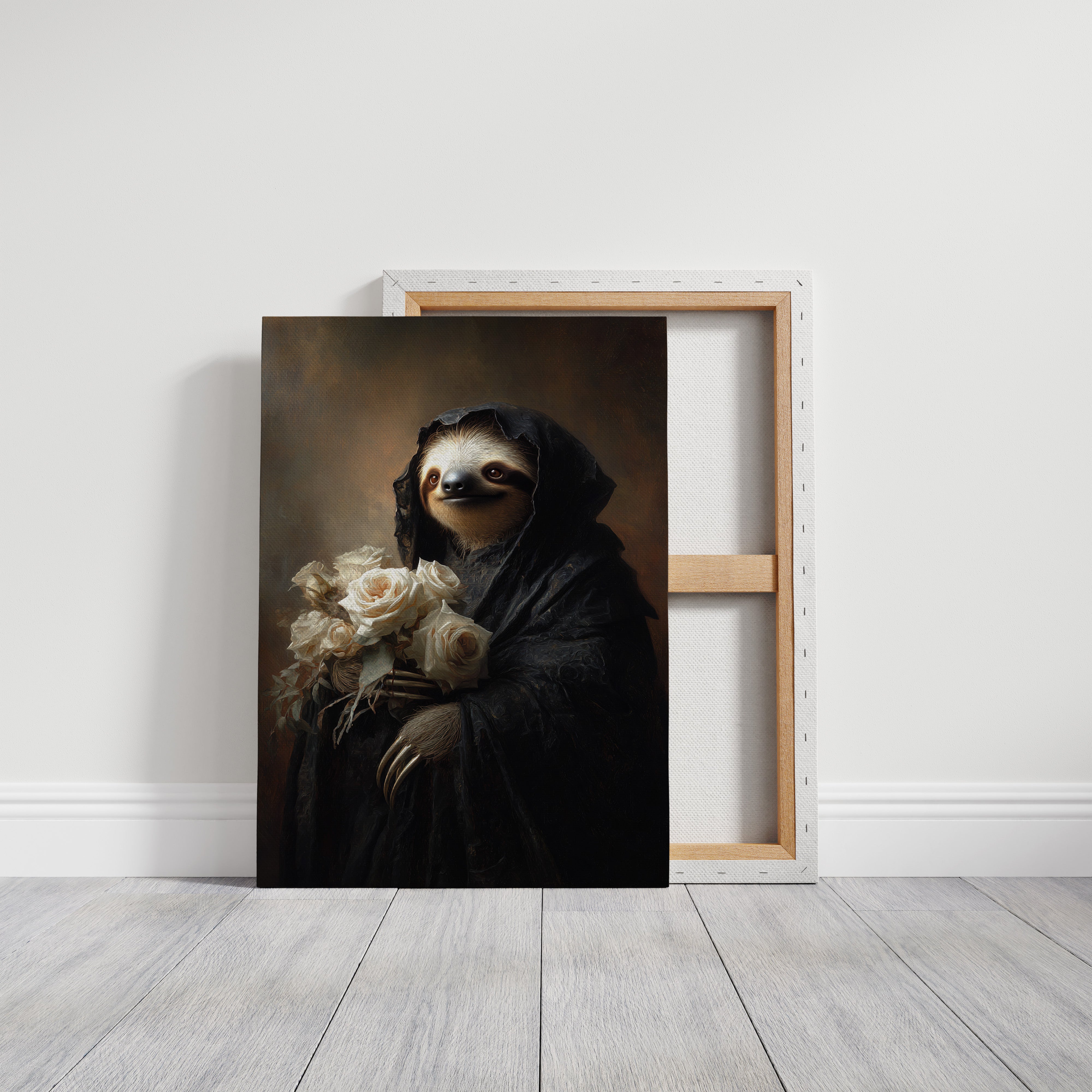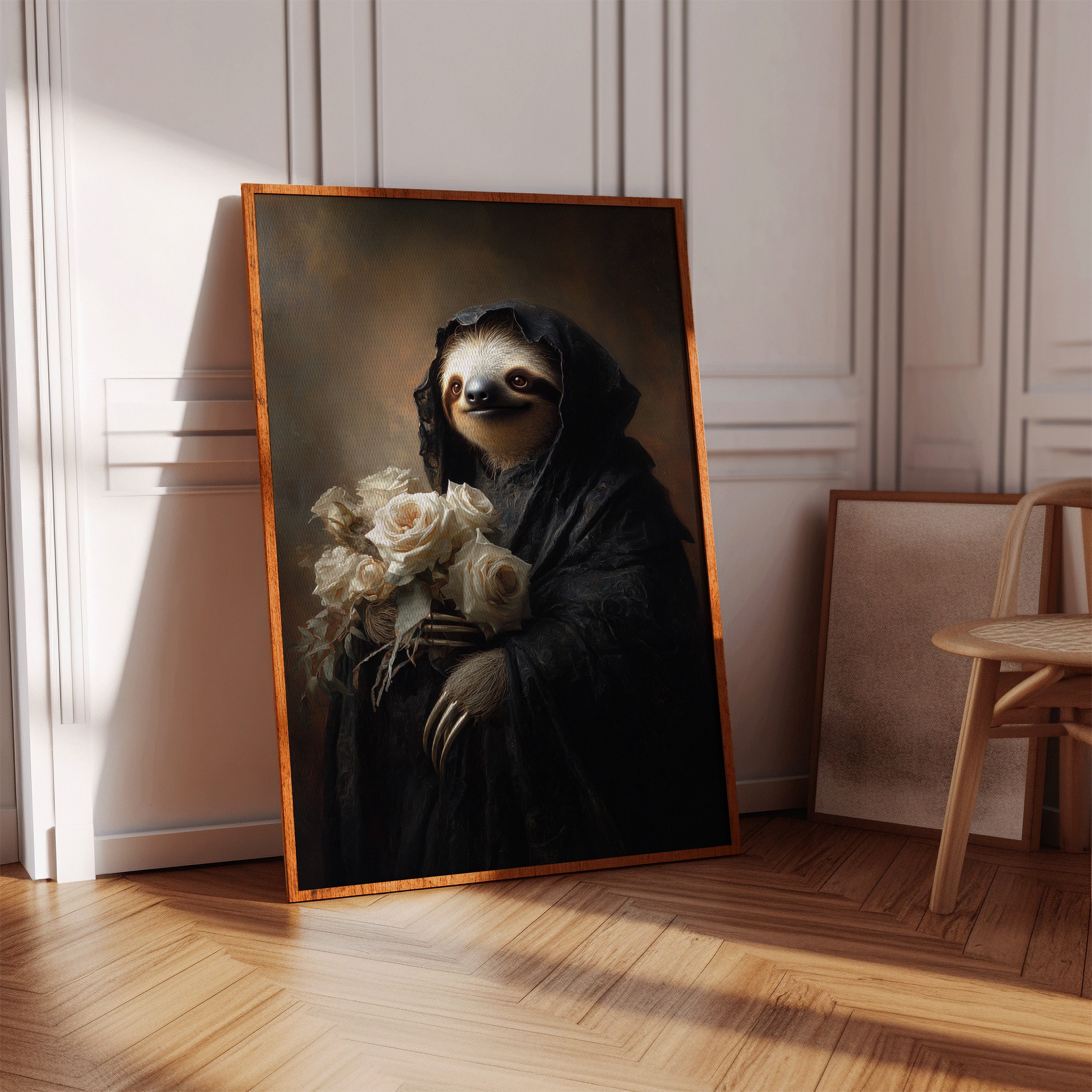 In a world where time slows, a sloth draped in a dark cloak cradles a bouquet of white roses. The scene resonates with a quiet elegance, embodying a moment suspended in tenderness. The intricate textures of the cloak contrast beautifully with the soft petals, creating a visual harmony that invites reflection on lifes delicate balance. Ideal for a cozy reading nook or an introspective corner, this piece invites contemplation and warmth.