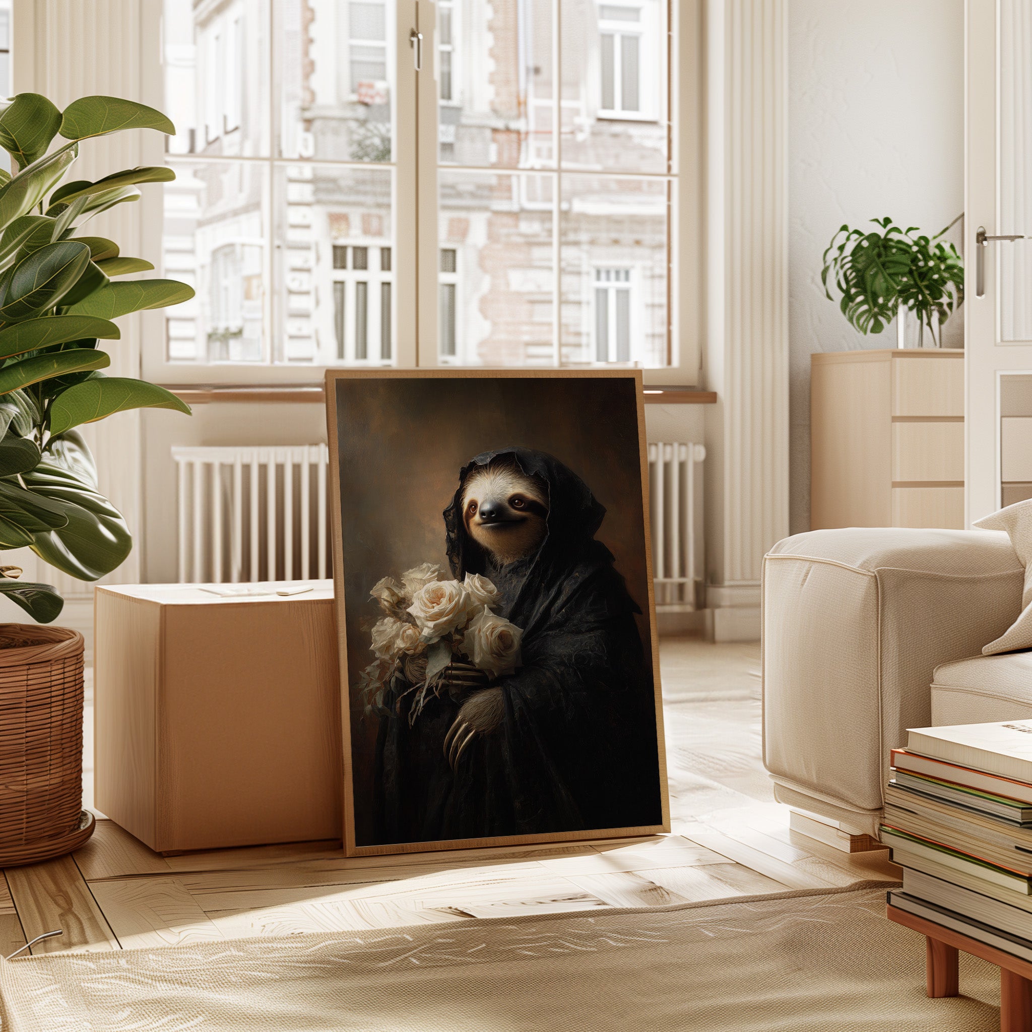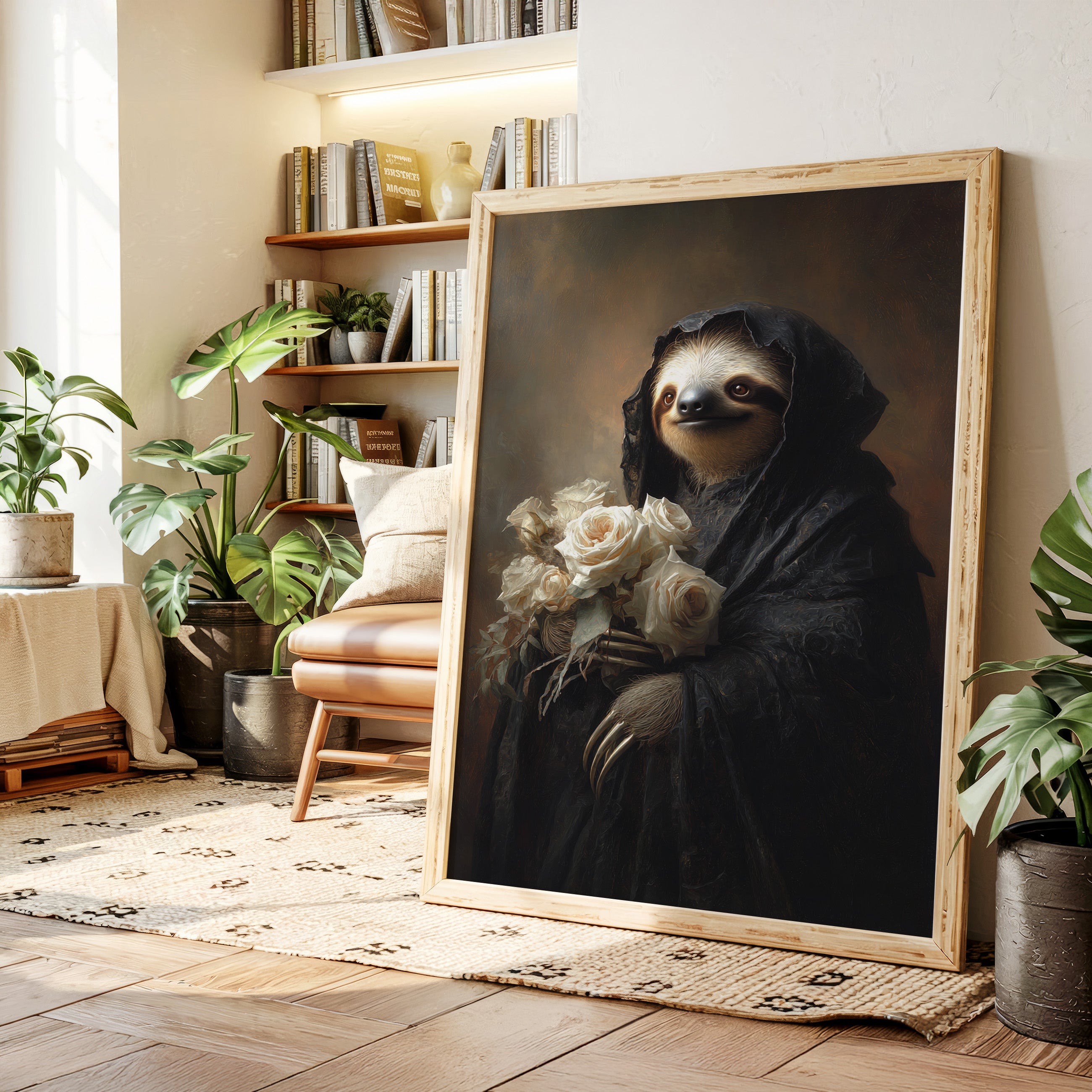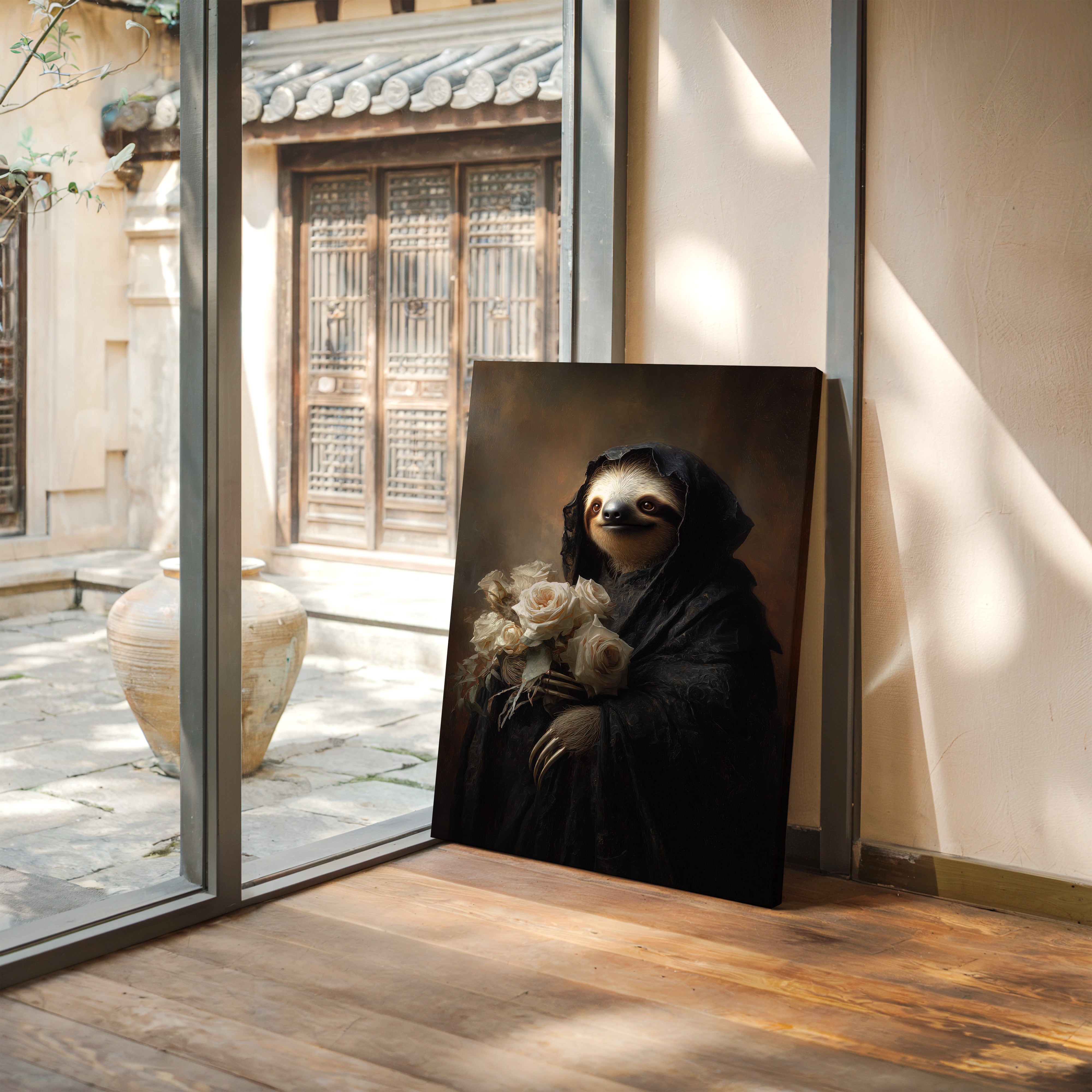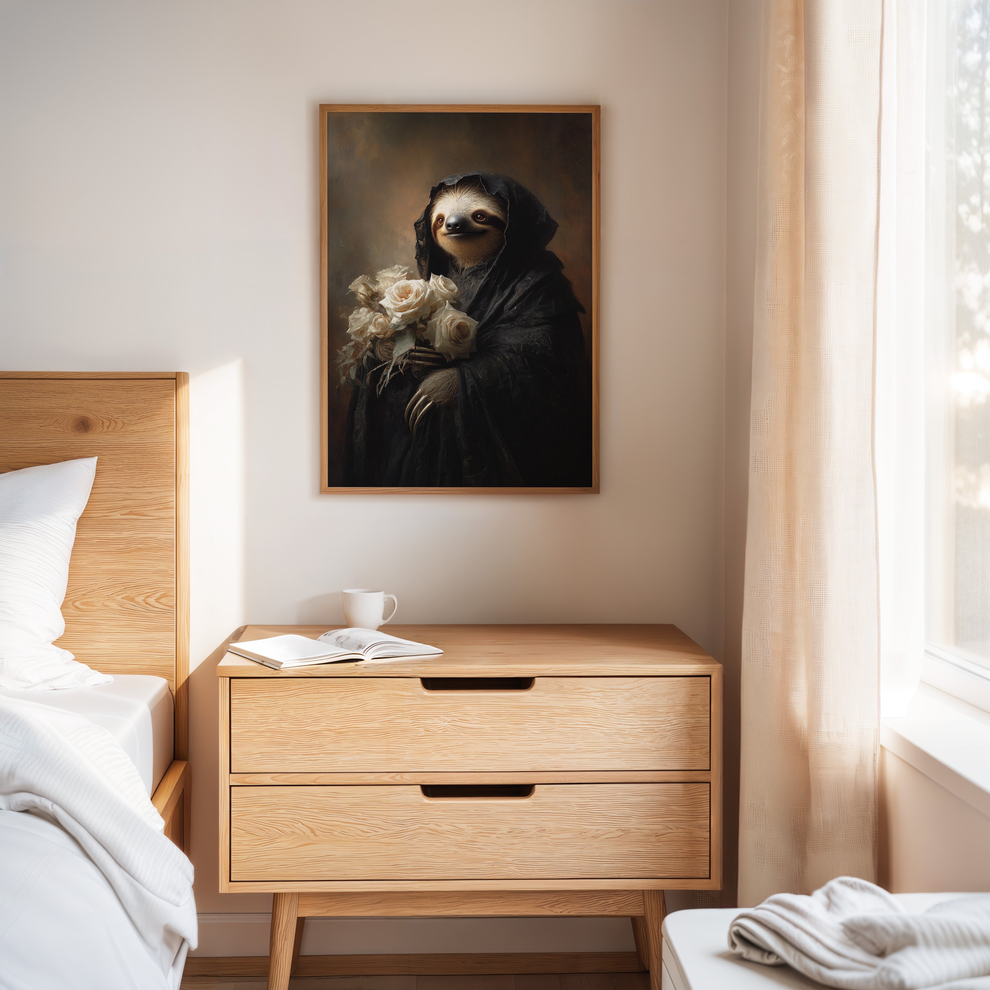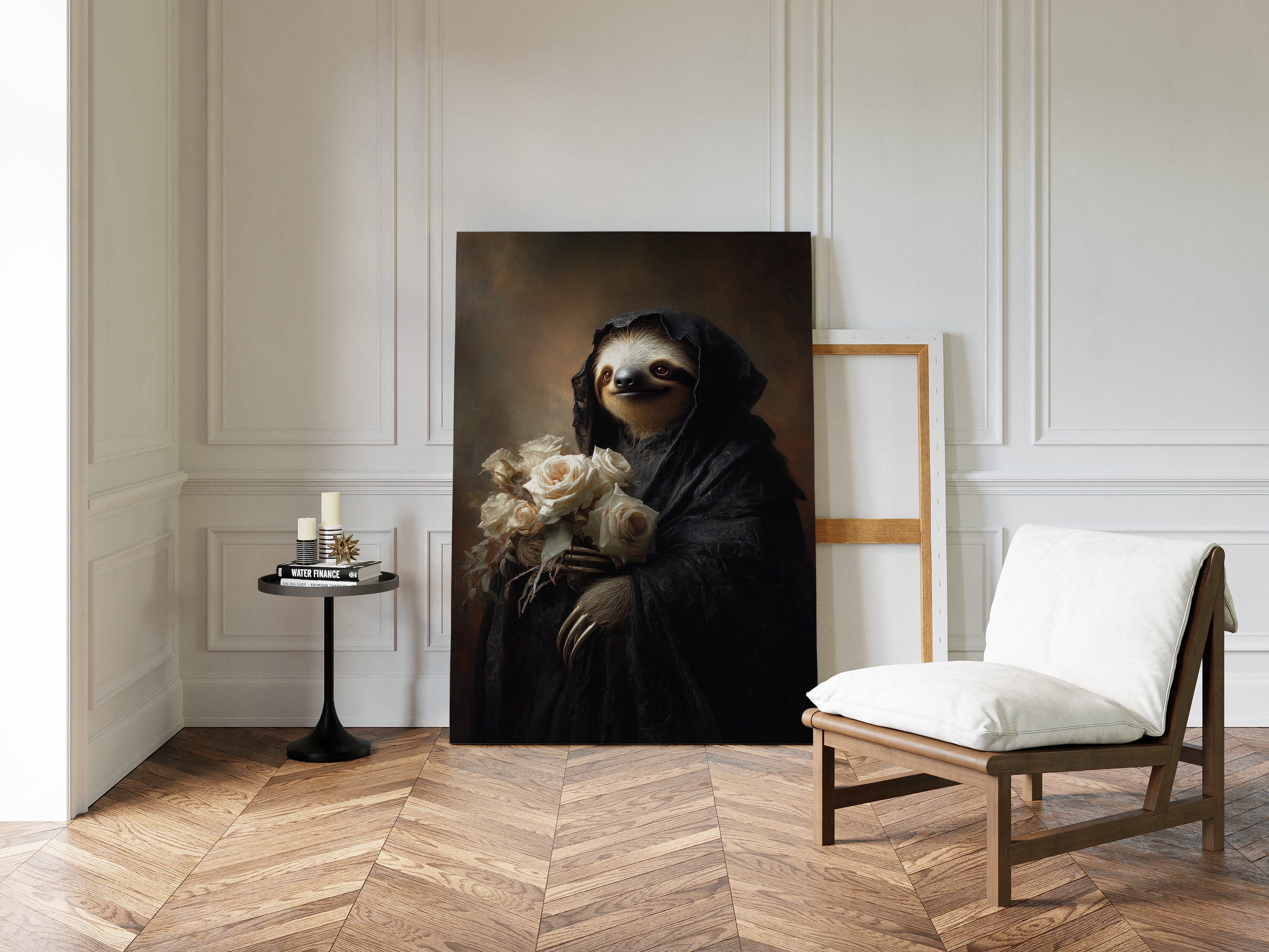 In a world where time slows, a sloth draped in a dark cloak cradles a bouquet of white roses. The scene resonates with a quiet elegance, embodying a moment suspended in tenderness. The intricate textures of the cloak contrast beautifully with the soft petals, creating a visual harmony that invites reflection on lifes delicate balance. Ideal for a cozy reading nook or an introspective corner, this piece invites contemplation and warmth.