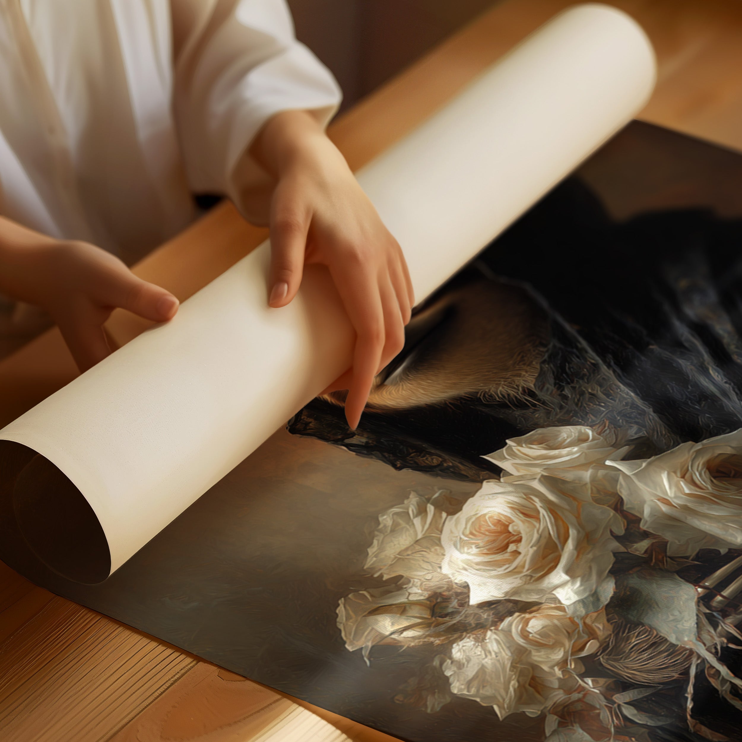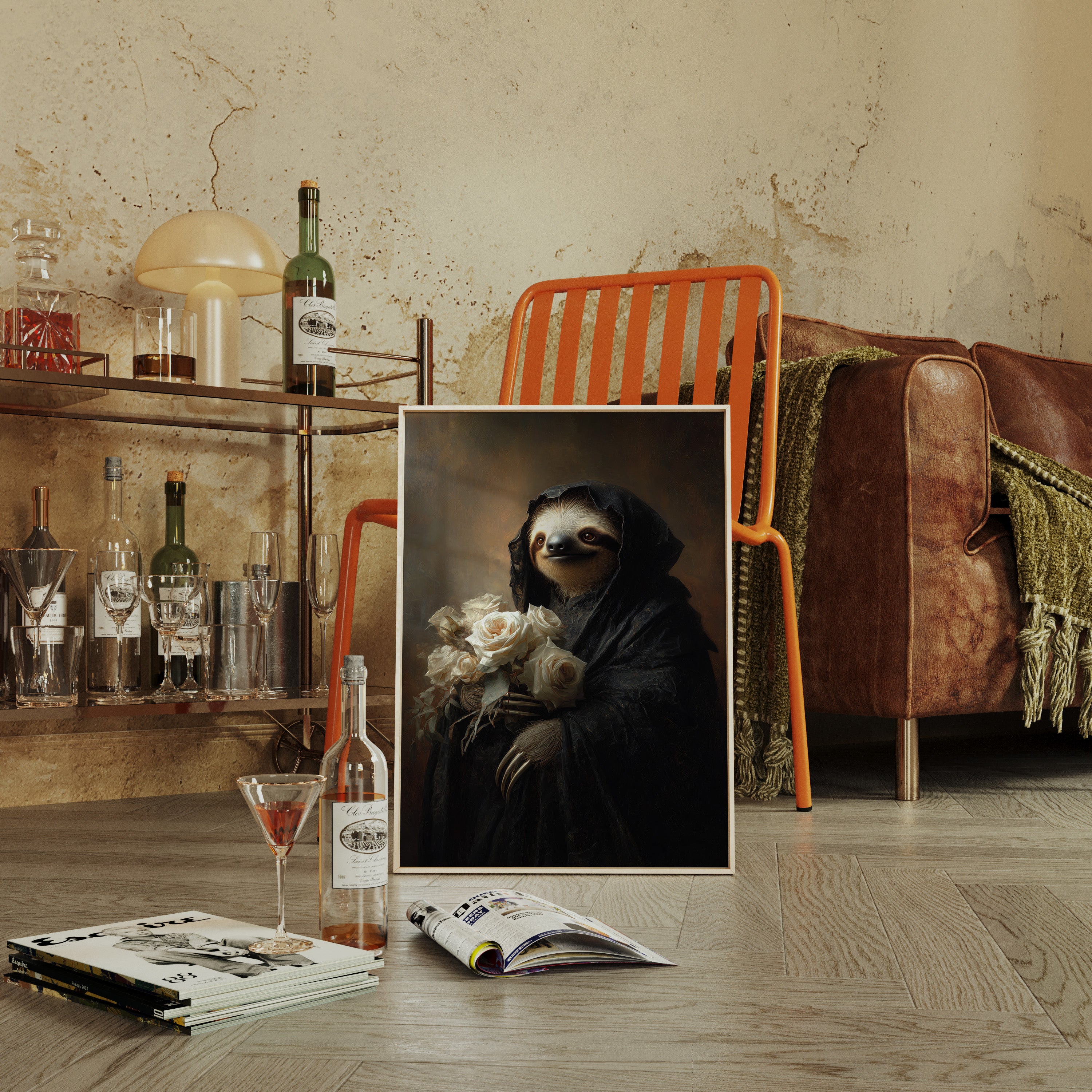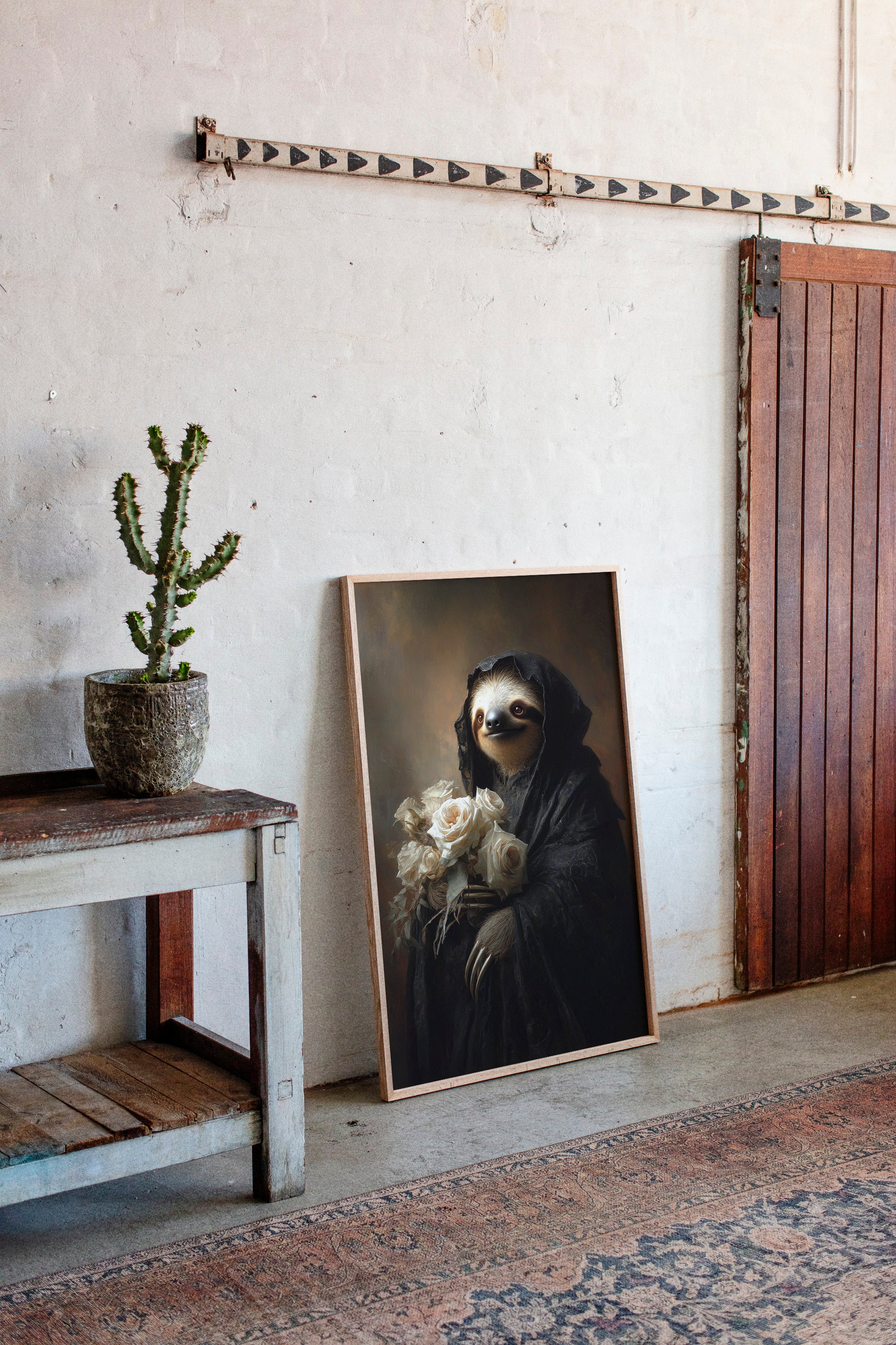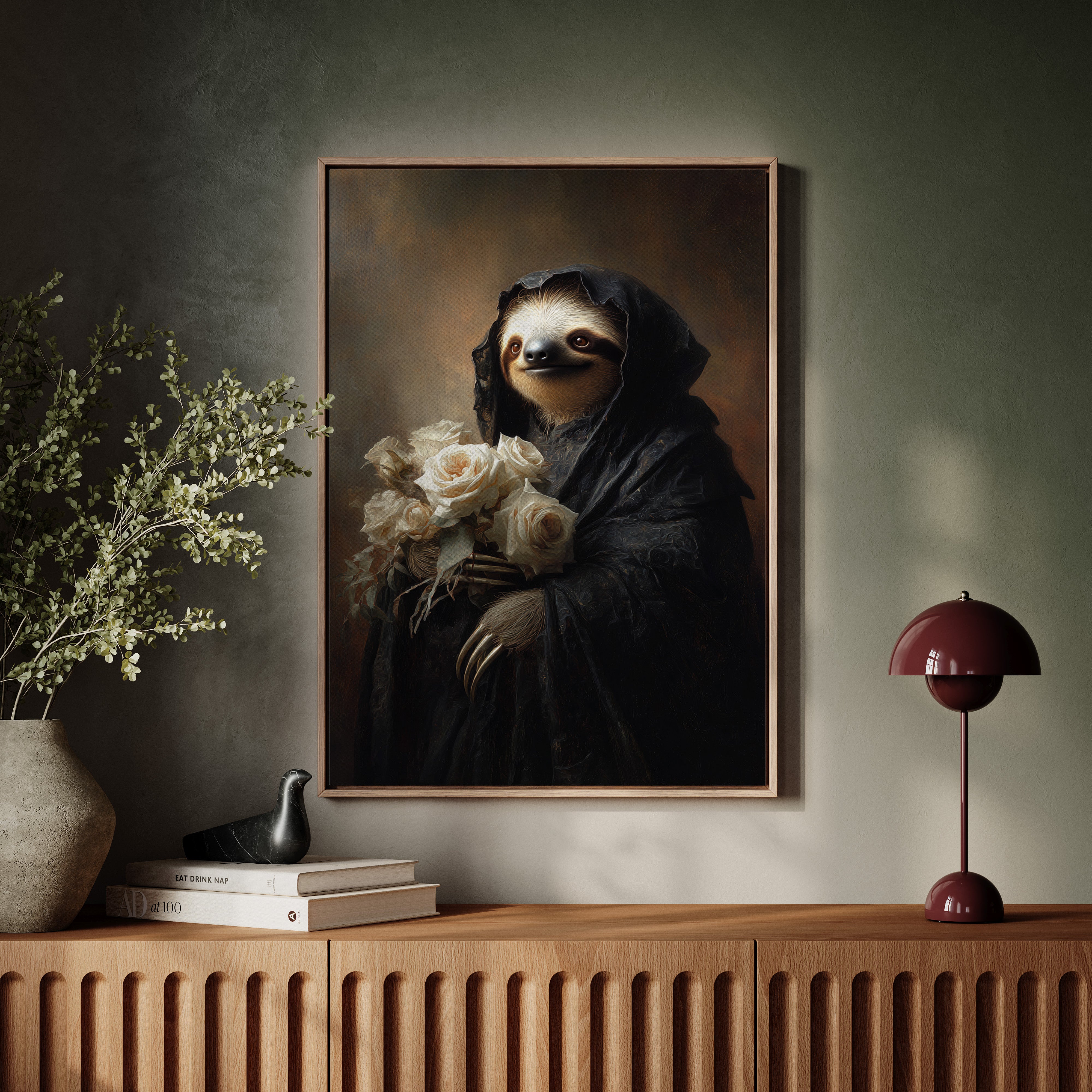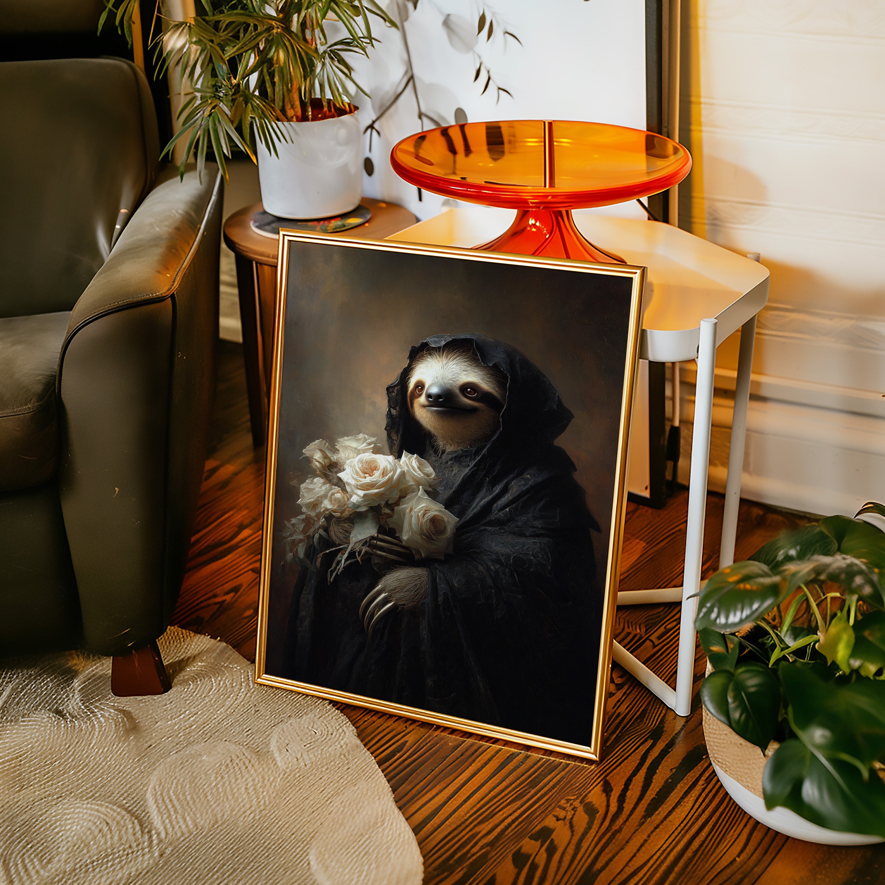 In a world where time slows, a sloth draped in a dark cloak cradles a bouquet of white roses. The scene resonates with a quiet elegance, embodying a moment suspended in tenderness. The intricate textures of the cloak contrast beautifully with the soft petals, creating a visual harmony that invites reflection on lifes delicate balance. Ideal for a cozy reading nook or an introspective corner, this piece invites contemplation and warmth.