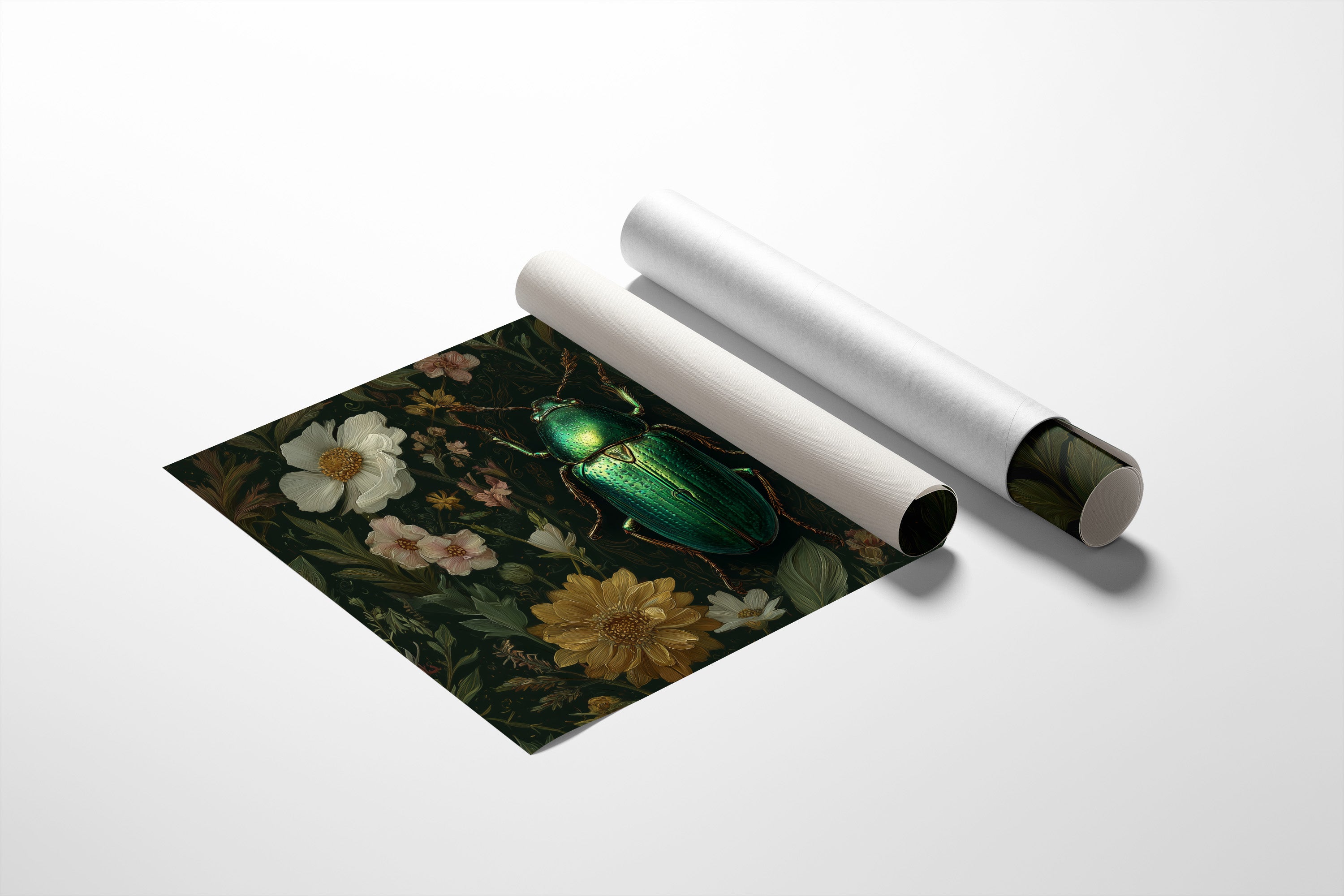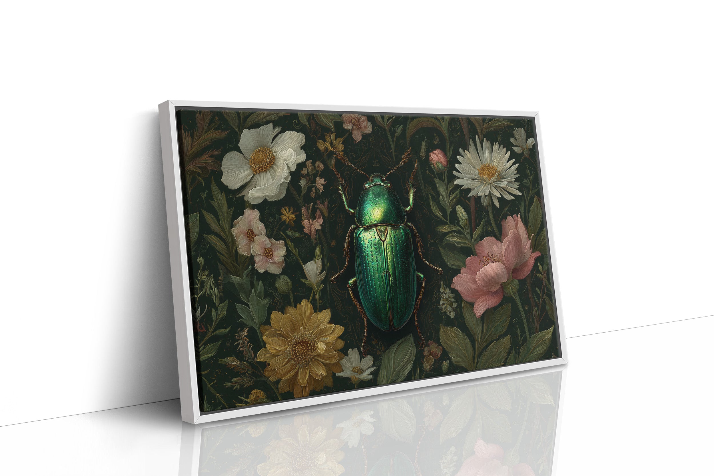 A metallic green beetle rests at the center of a lush botanical world, commanding attention amid delicate blossoms. The rich painting contrasts the insect's jewel-like carapace against soft petals of white daisies, blush peonies, and golden flowers, all set against a deep verdant background. This elegant entomological study sits perfectly framed on a wooden console, backed by floor-to-ceiling bookshelves filled with leather-bound volumes and literary treasures.