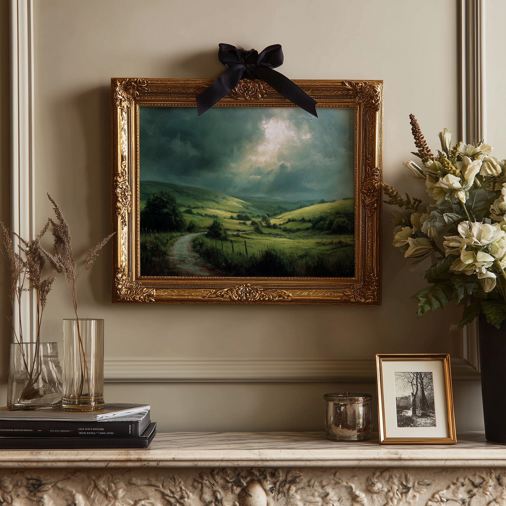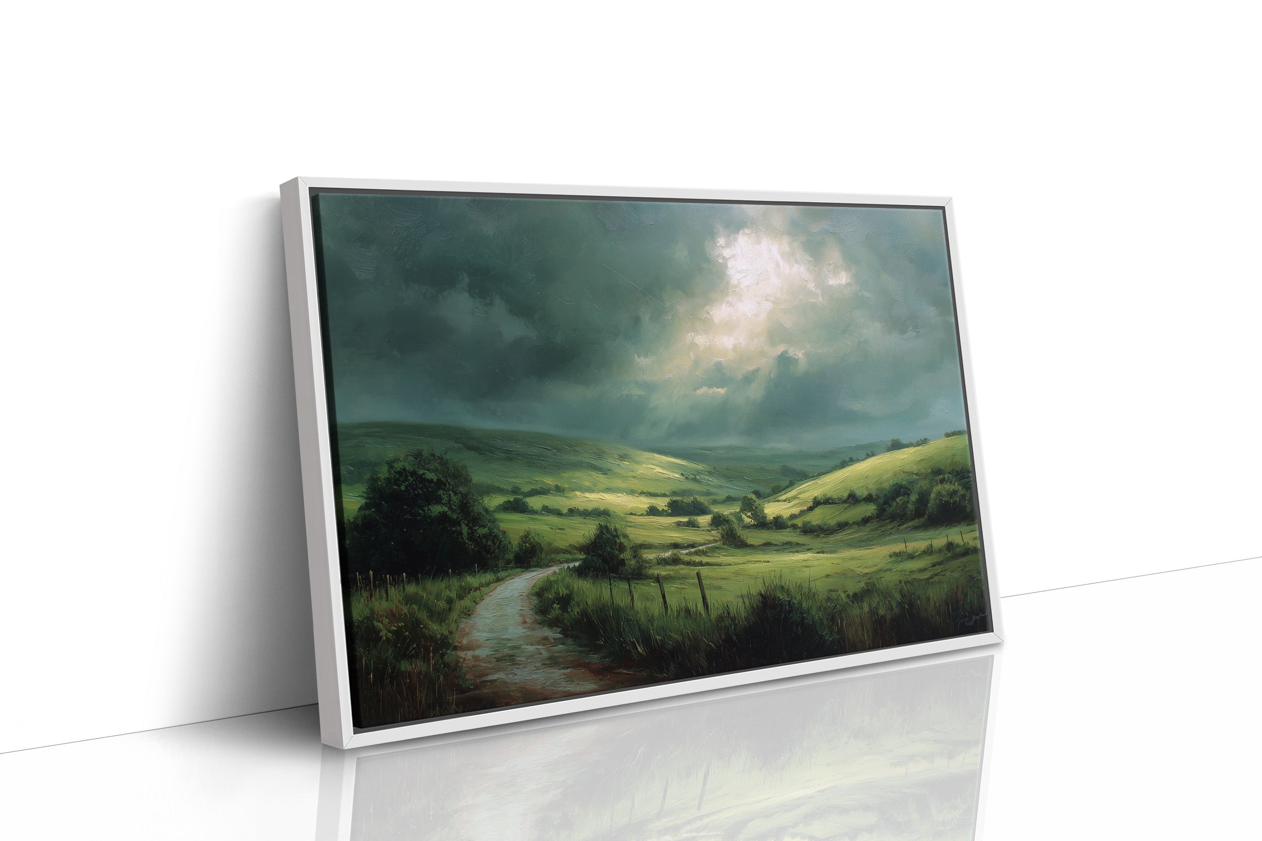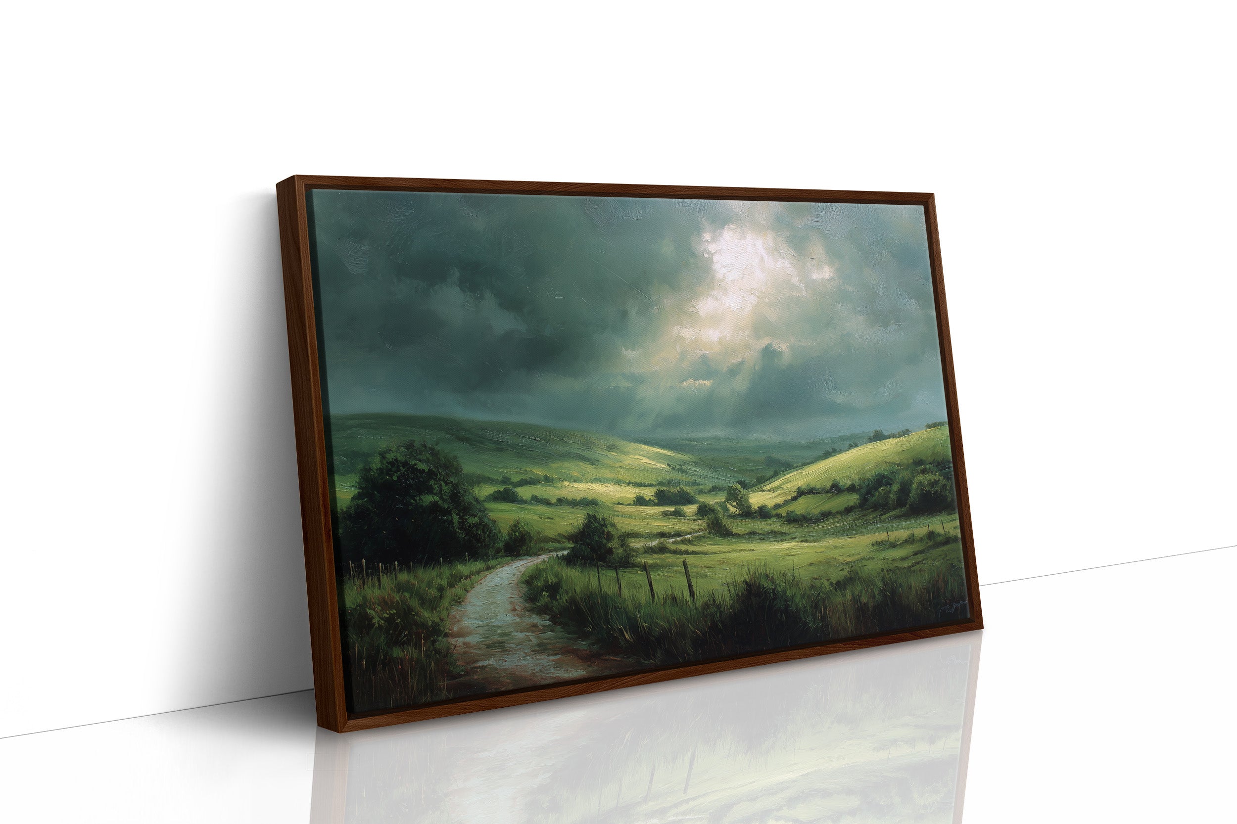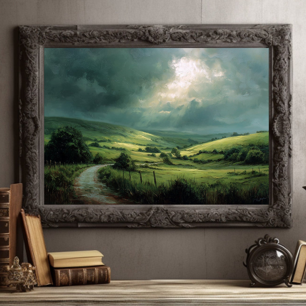 A moment suspended between calm and tempest, where sunlight breaks through gathering clouds to illuminate rolling countryside. The landscape painting captures the dramatic interplay of light and shadow across verdant hills, with a winding path inviting the eye deeper into the scene. Rich emerald tones contrast with moody storm clouds, creating a nostalgic portrait of rural tranquility on the edge of transformation.