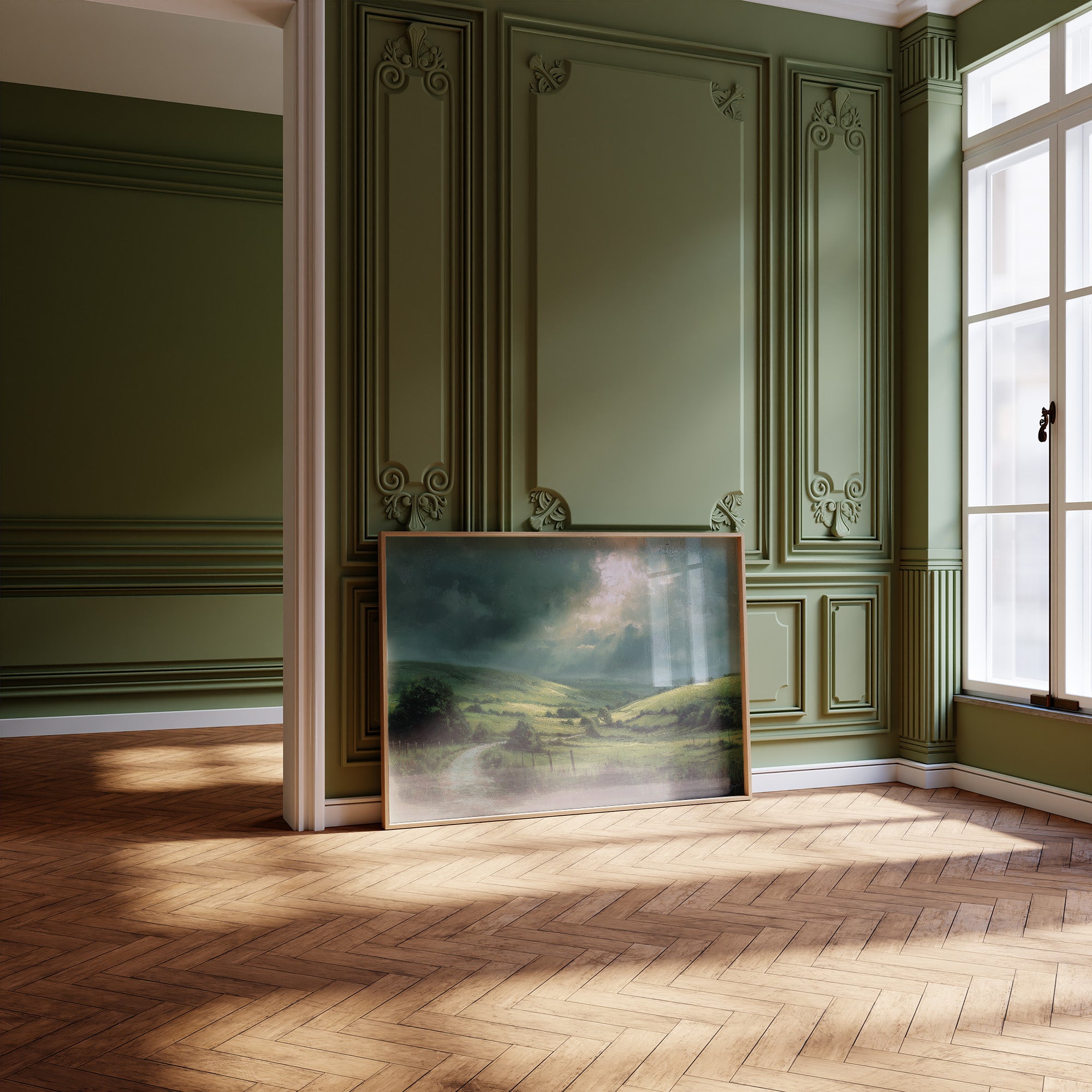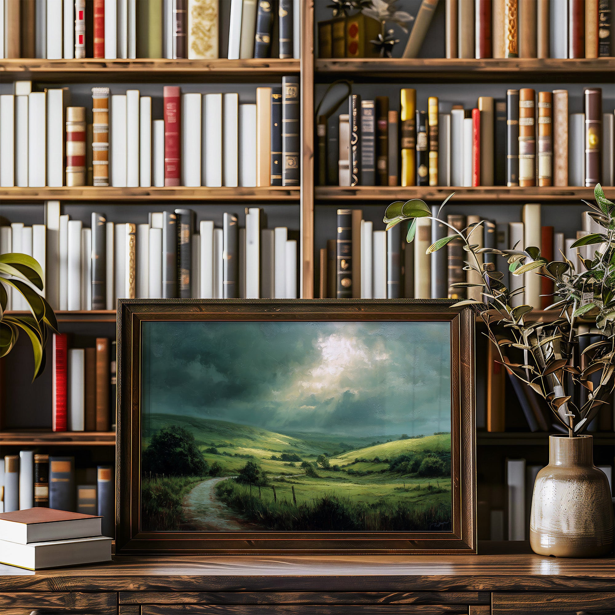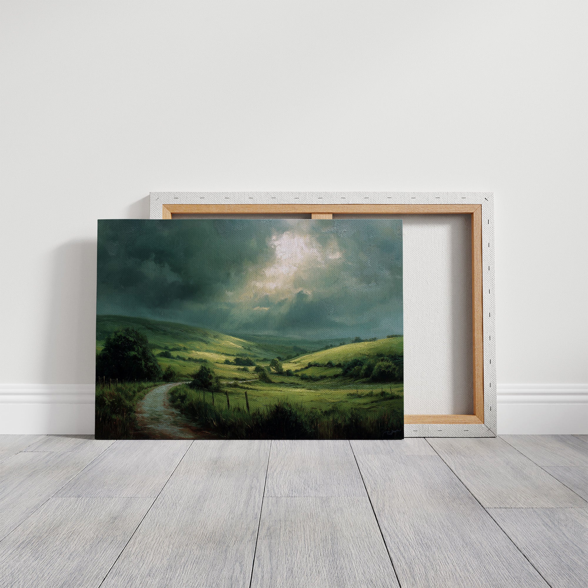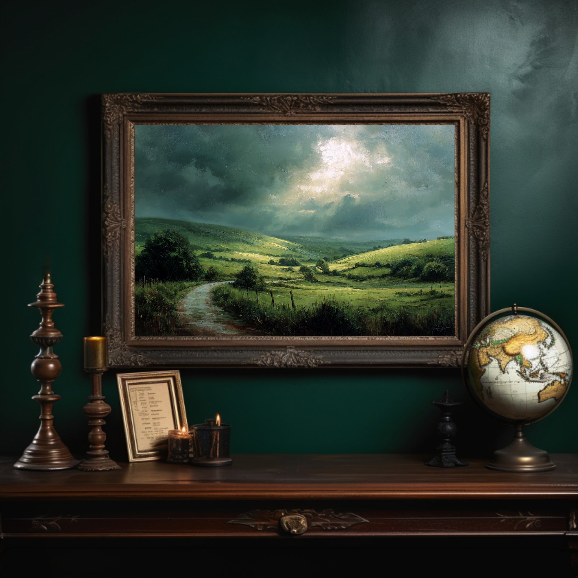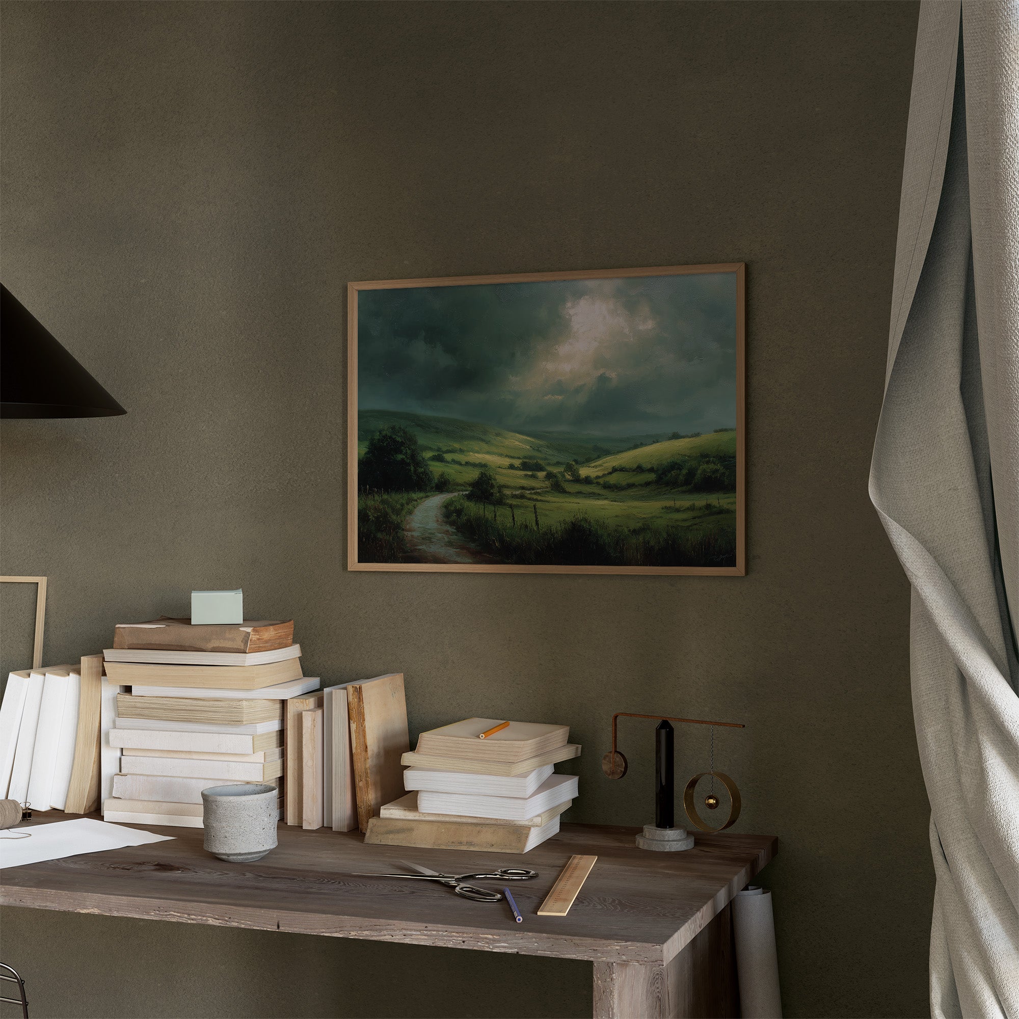 A moment suspended between calm and tempest, where sunlight breaks through gathering clouds to illuminate rolling countryside. The landscape painting captures the dramatic interplay of light and shadow across verdant hills, with a winding path inviting the eye deeper into the scene. Rich emerald tones contrast with moody storm clouds, creating a nostalgic portrait of rural tranquility on the edge of transformation.