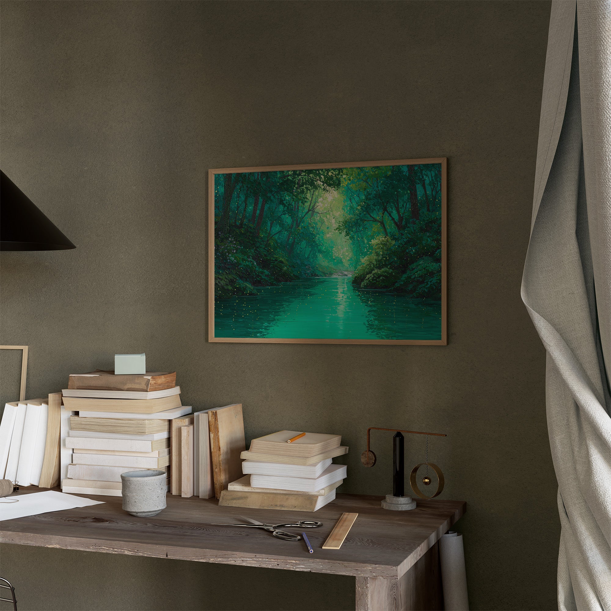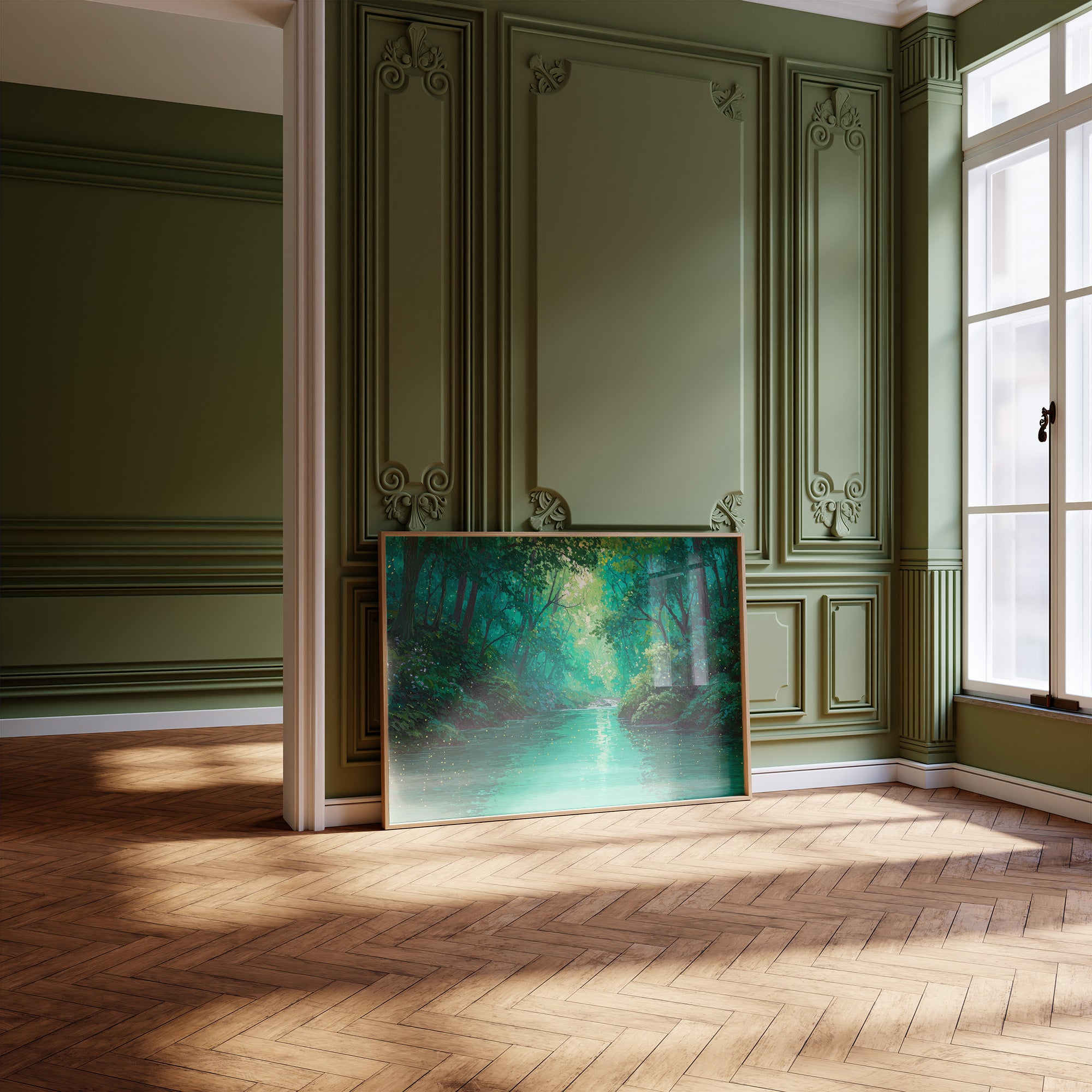 Light filters through verdant canopies, casting an otherworldly glow upon the tranquil turquoise waters below. The painting captures that magical moment when a forest opens its secrets, revealing a luminous pathway that seems to flow between realms. Rich emerald and jade tones create depth against the darker silhouettes of ancient trees, while gentle ripples catch fragments of sunlight like scattered thoughts waiting to be collected.