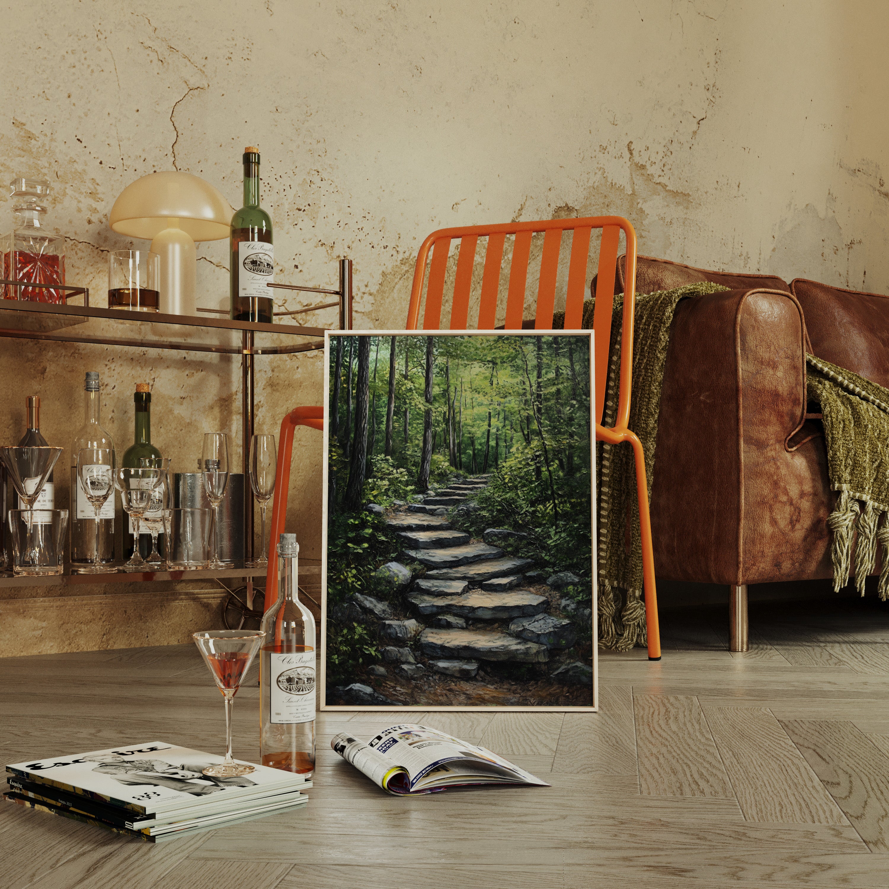 Step into a tranquil world with 'Emerald Pathway Reverie,' where nature's lush green hues guide you along a stone path into the serene embrace of a forest sanctuary. This artwork captures the essence of calm and invites mindfulness into your space, offering a gentle reminder of the beauty that lies in simplicity. Perfect for creating a cozy, meditative atmosphere in any room, this piece is a harmonious blend of natural elements and minimalist elegance.