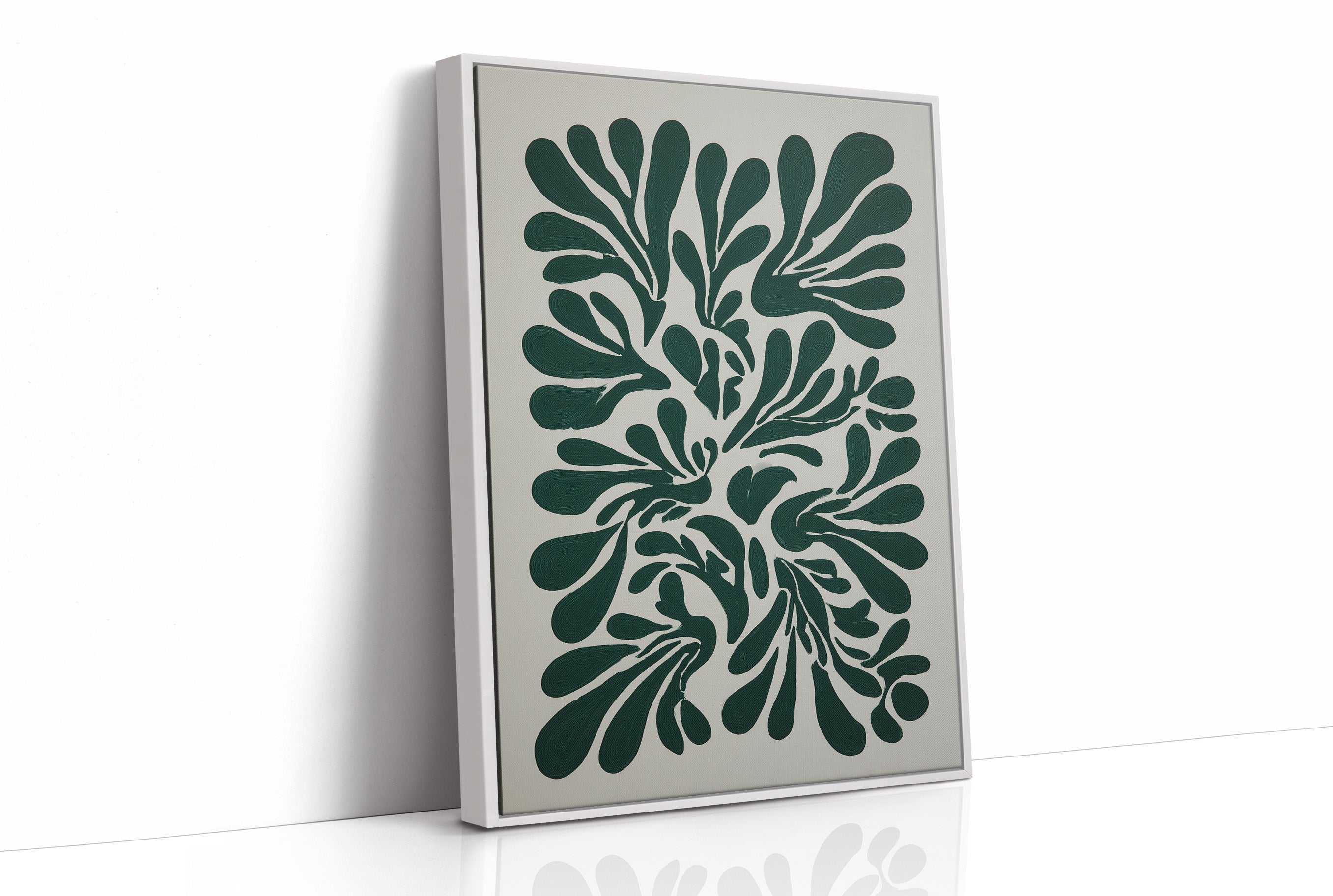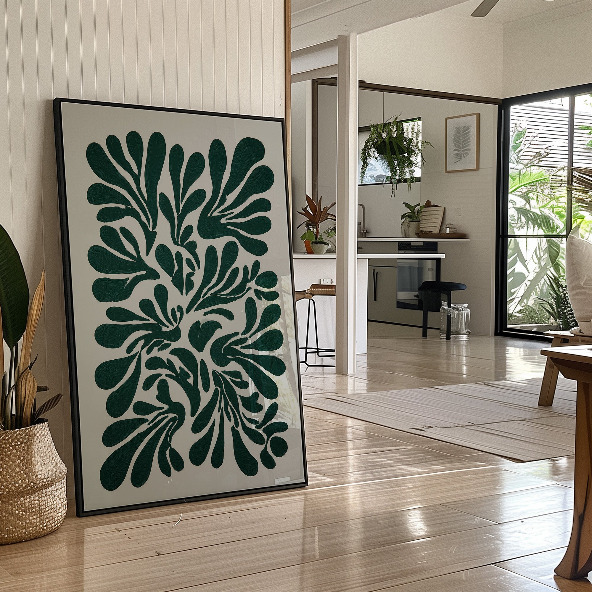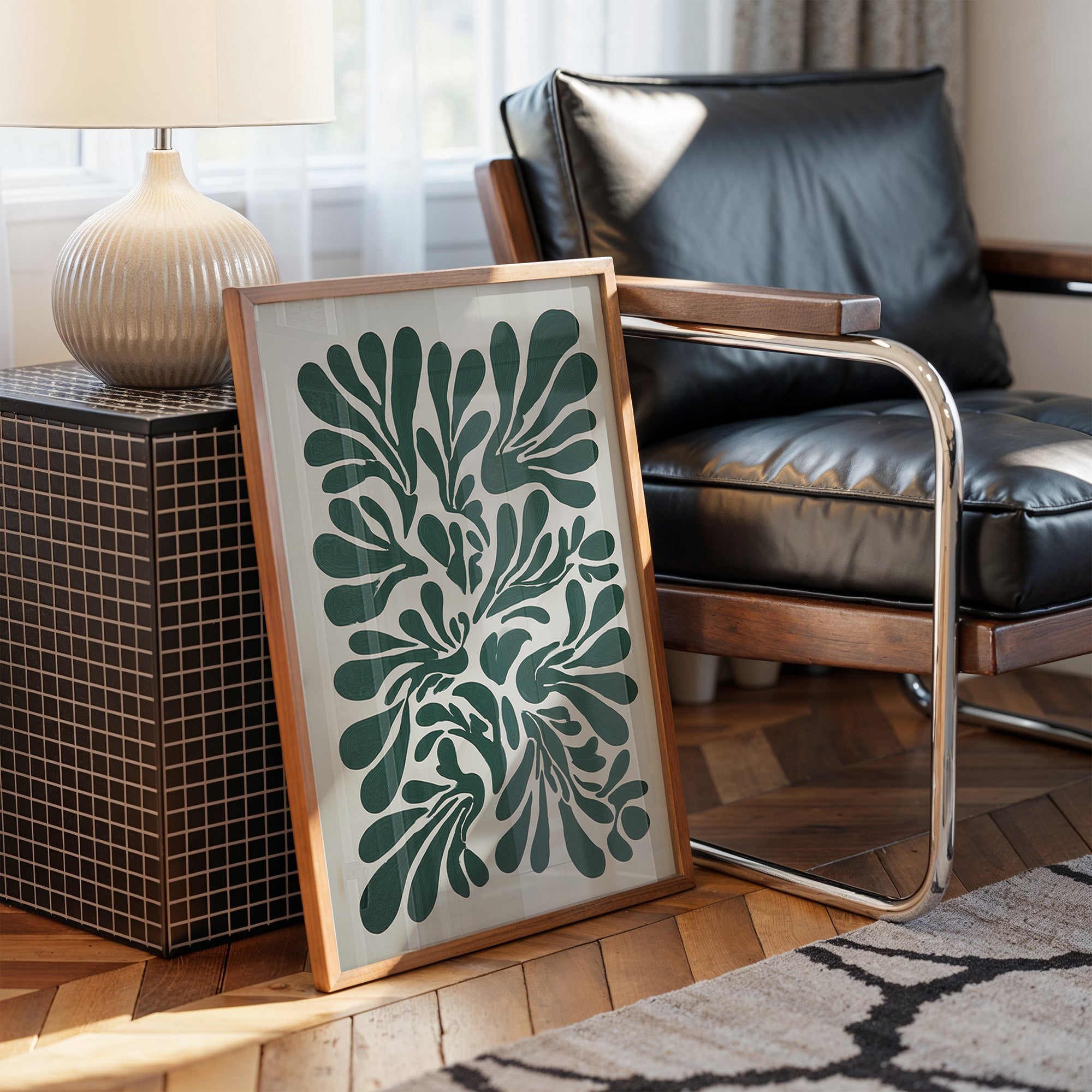 Sunlight streams across hardwood floors, illuminating an elegant botanical print where deep green forms bloom against cream-colored paper. The organic shapes spiral outward in a mesmerizing dance, creating a modern interpretation of natural growth patterns. Rich wood framing and chrome furniture details create a sophisticated dialogue between warm and cool elements, while the ribbed ceramic lamp adds textural depth to the scene. This piece would elevate a contemporary living room, home office, or dining space where its bold yet refined presence can anchor a curated collection of modern furnishings.