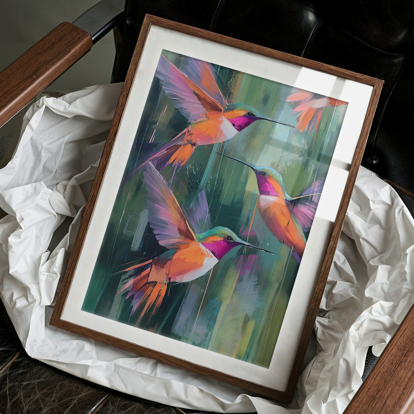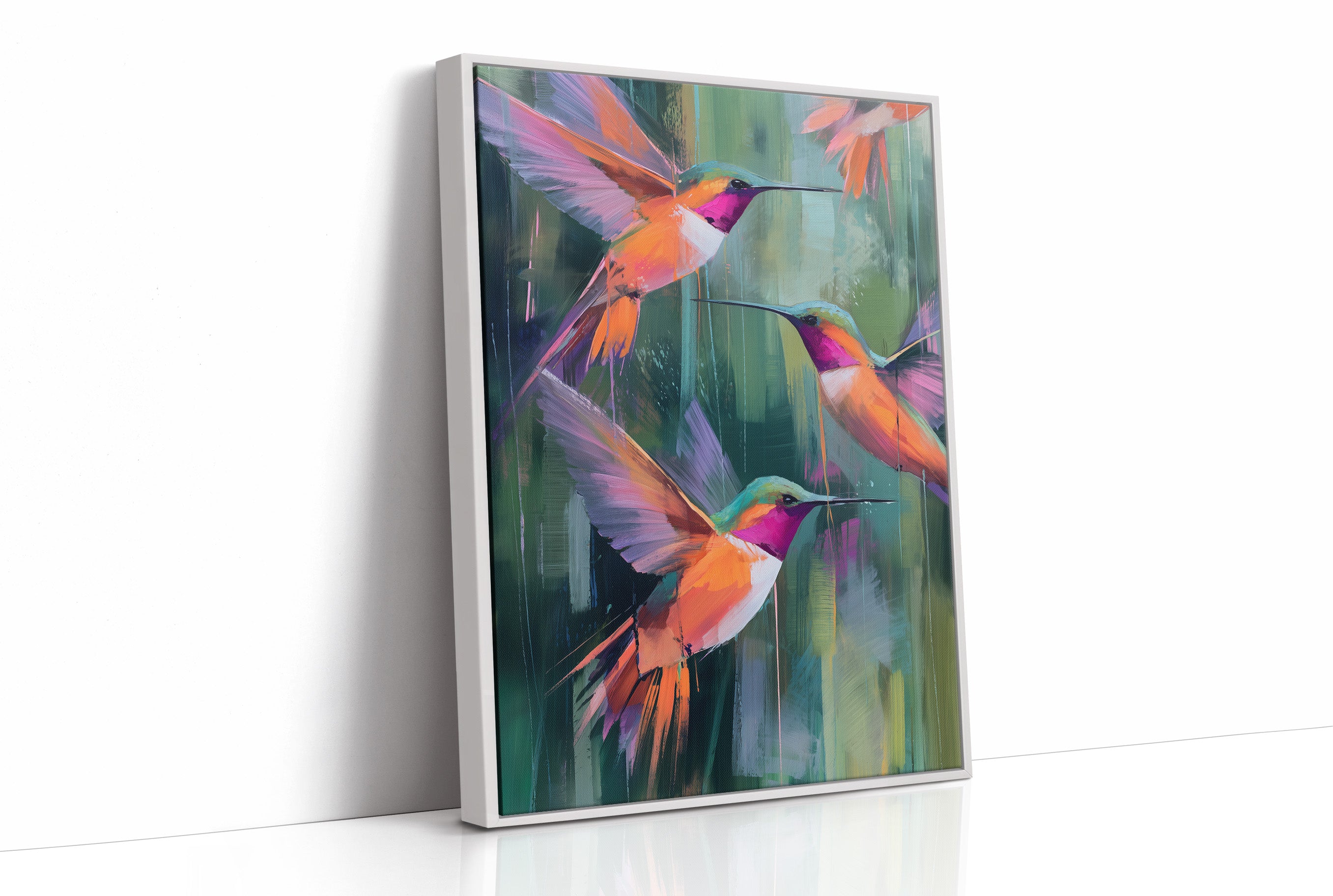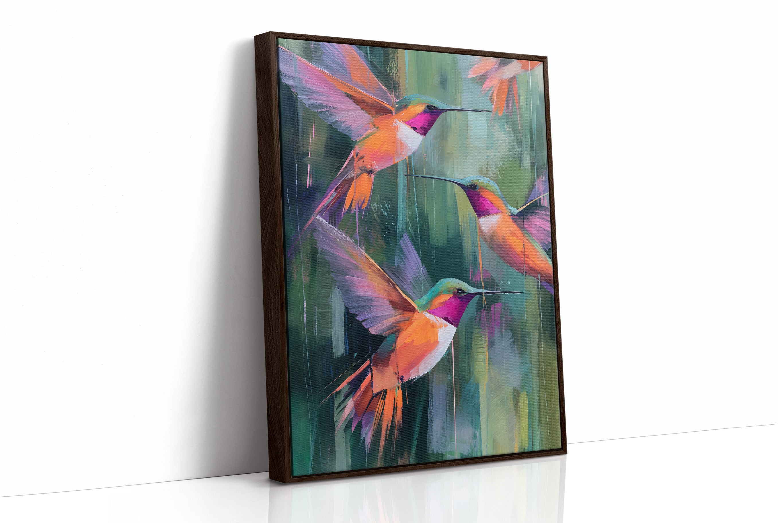 A vibrant canvas depicting three hummingbirds in mid-flight against a backdrop of abstract emerald and jade brushstrokes. The birds feature striking magenta throats and brilliant orange-coral plumage with violet wing accents. Their long beaks extend gracefully as they hover in a harmonious formation.