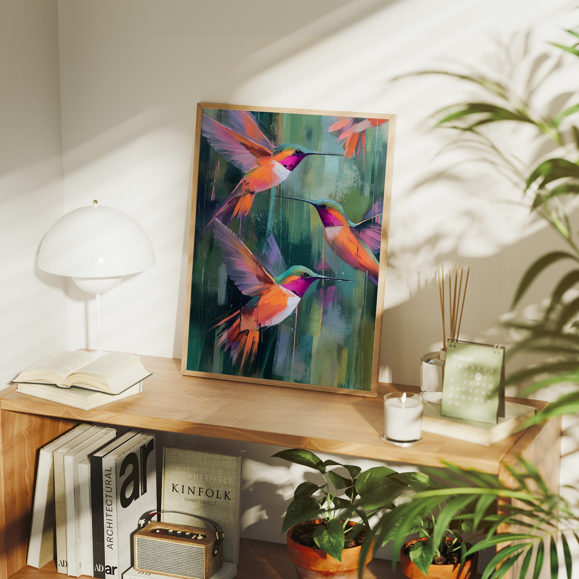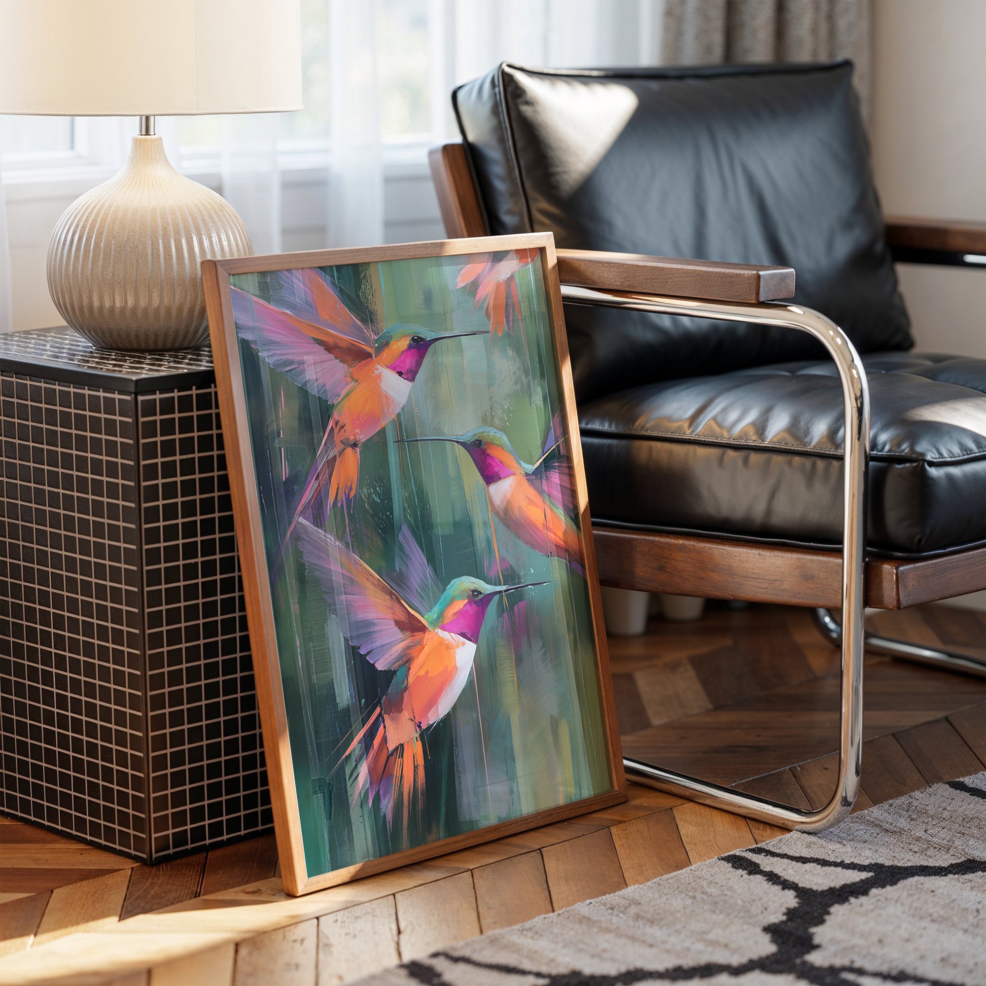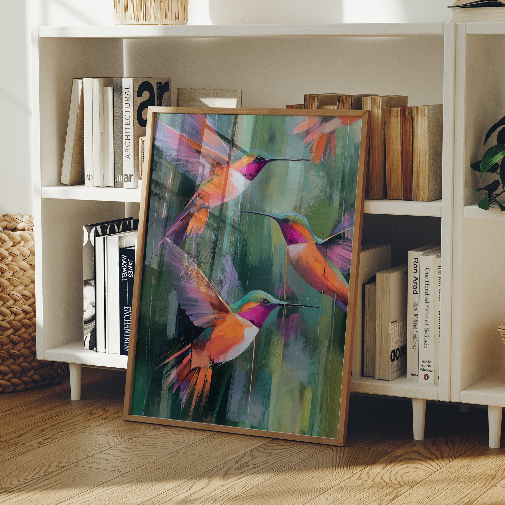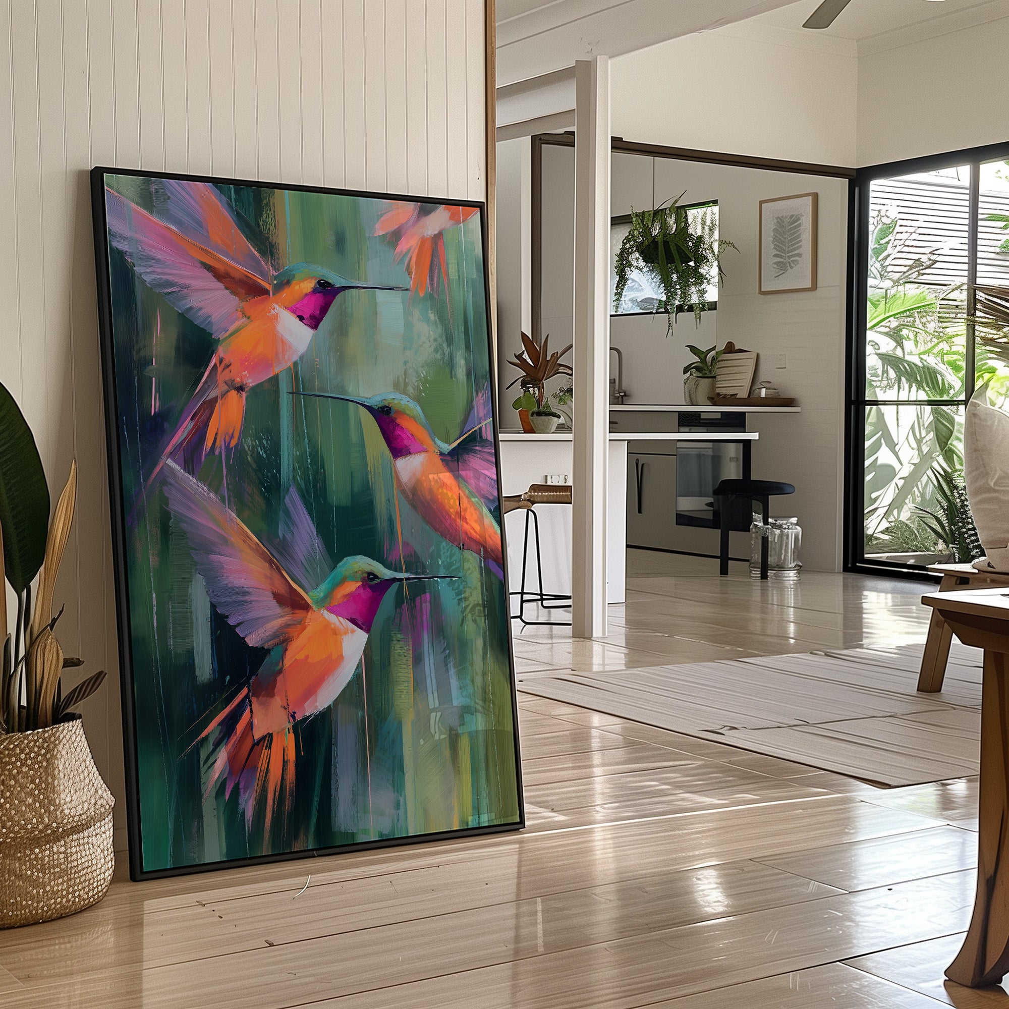 A vibrant canvas depicting three hummingbirds in mid-flight against a backdrop of abstract emerald and jade brushstrokes. The birds feature striking magenta throats and brilliant orange-coral plumage with violet wing accents. Their long beaks extend gracefully as they hover in a harmonious formation.