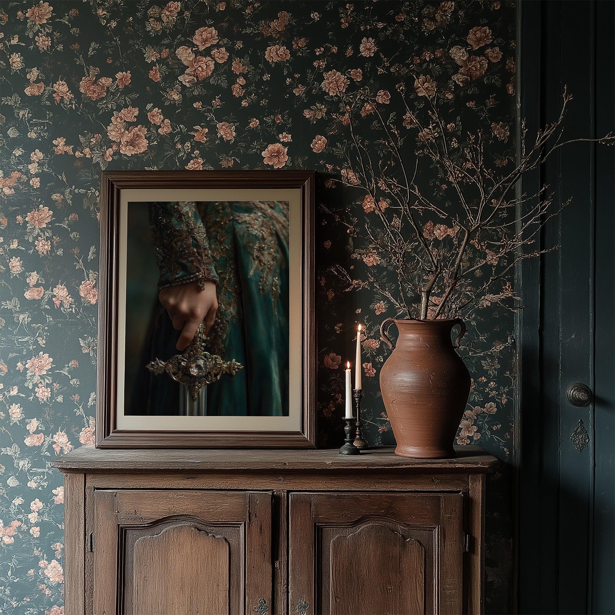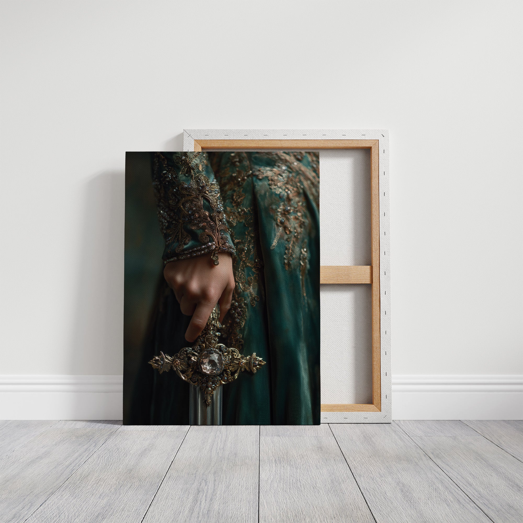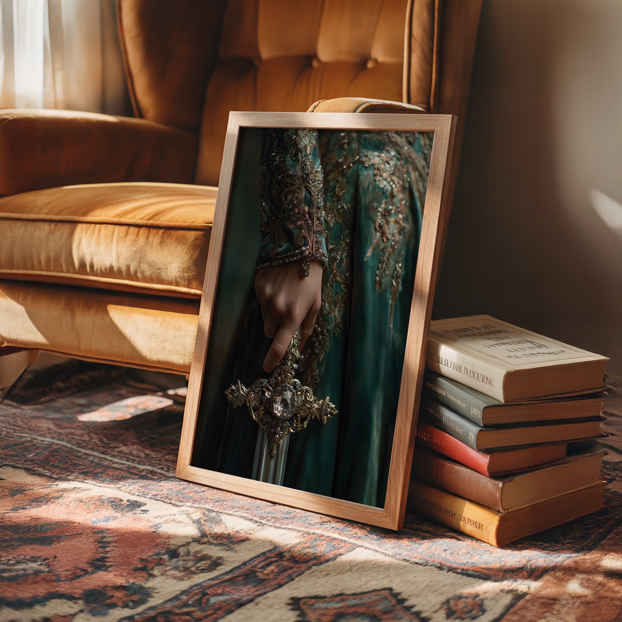 A single hand emerges from luxurious teal fabric adorned with intricate golden embroidery, reaching toward an ornate jeweled artifact. The rich textures of the embellished garment catch light in their metallic threads, creating a tension between opulence and mystery. Deep emerald tones contrast with the warm glow of gold embroidery, suggesting a narrative of royal heritage or ceremonial significance.