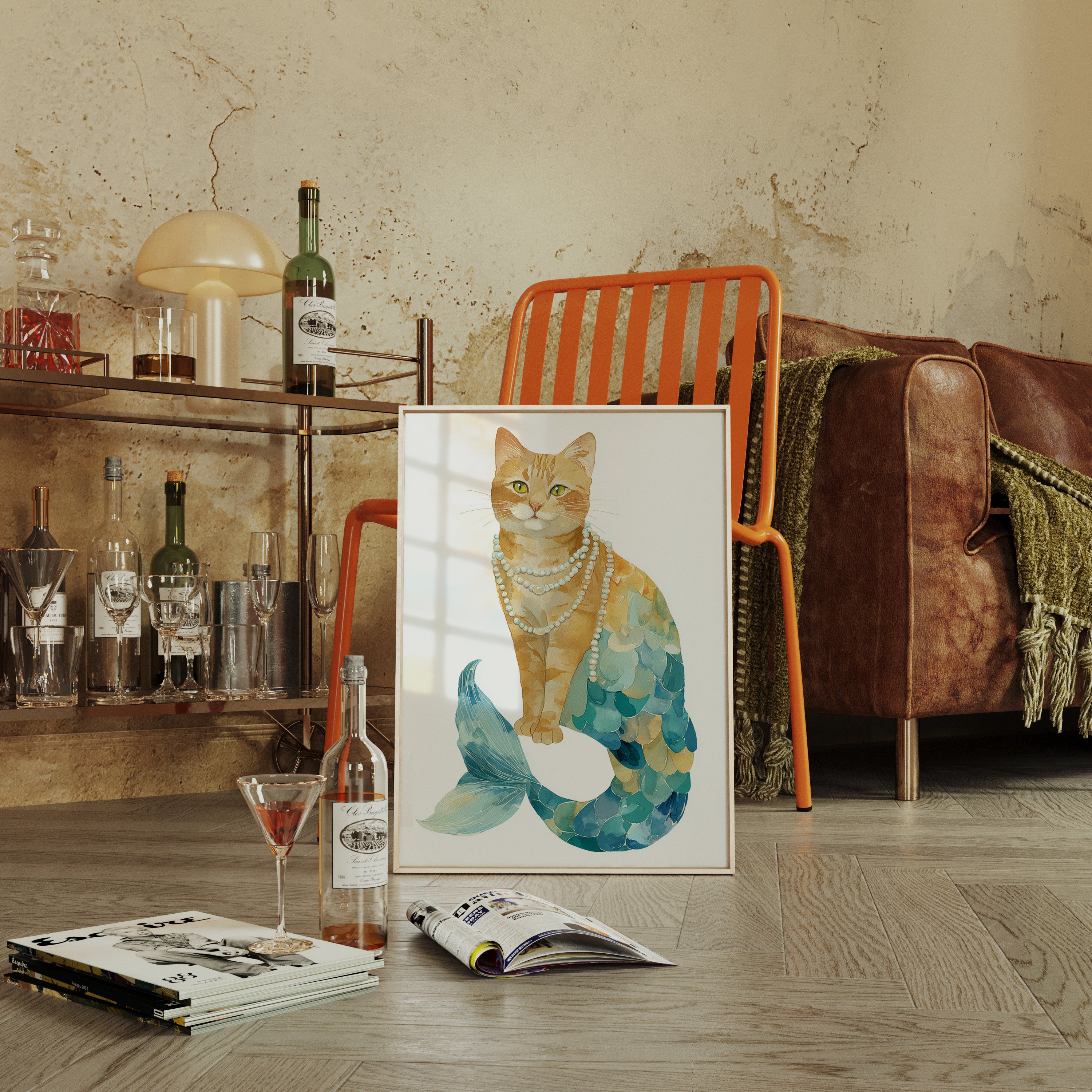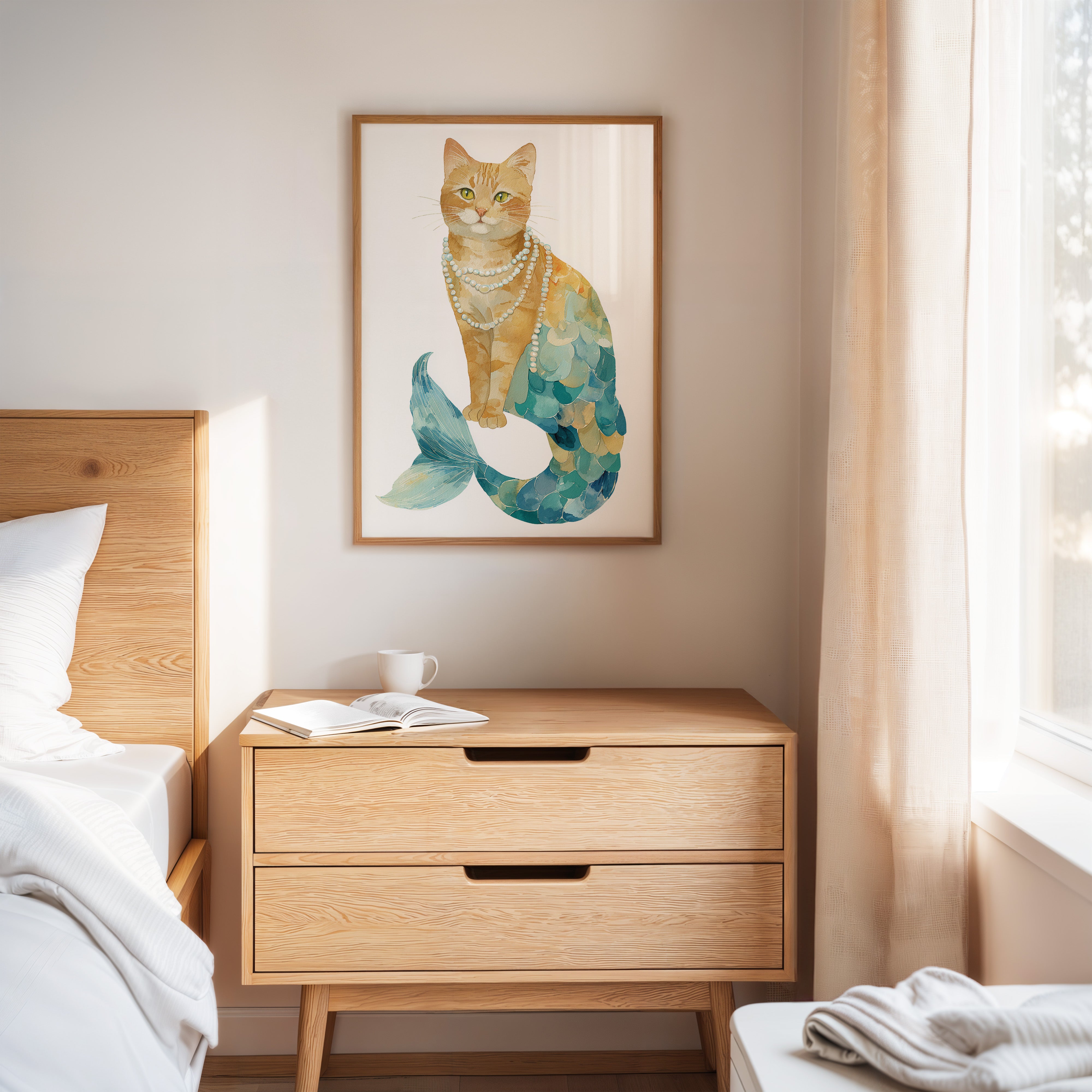 In a world where the sea meets the sky, a regal cat adorned with pearls and shimmering scales sits poised, exuding charm and mystery. This piece captures the essence of whimsical artistry, intertwining the ordinary with the fantastical. The warm hues of the felines fur blend seamlessly with the cool blues of the mermaid tail, creating a striking contrast that invites the viewer to explore the depths of imagination. Ideal for a cozy reading nook or a playful children's room, it brings a touch of magic to any space.