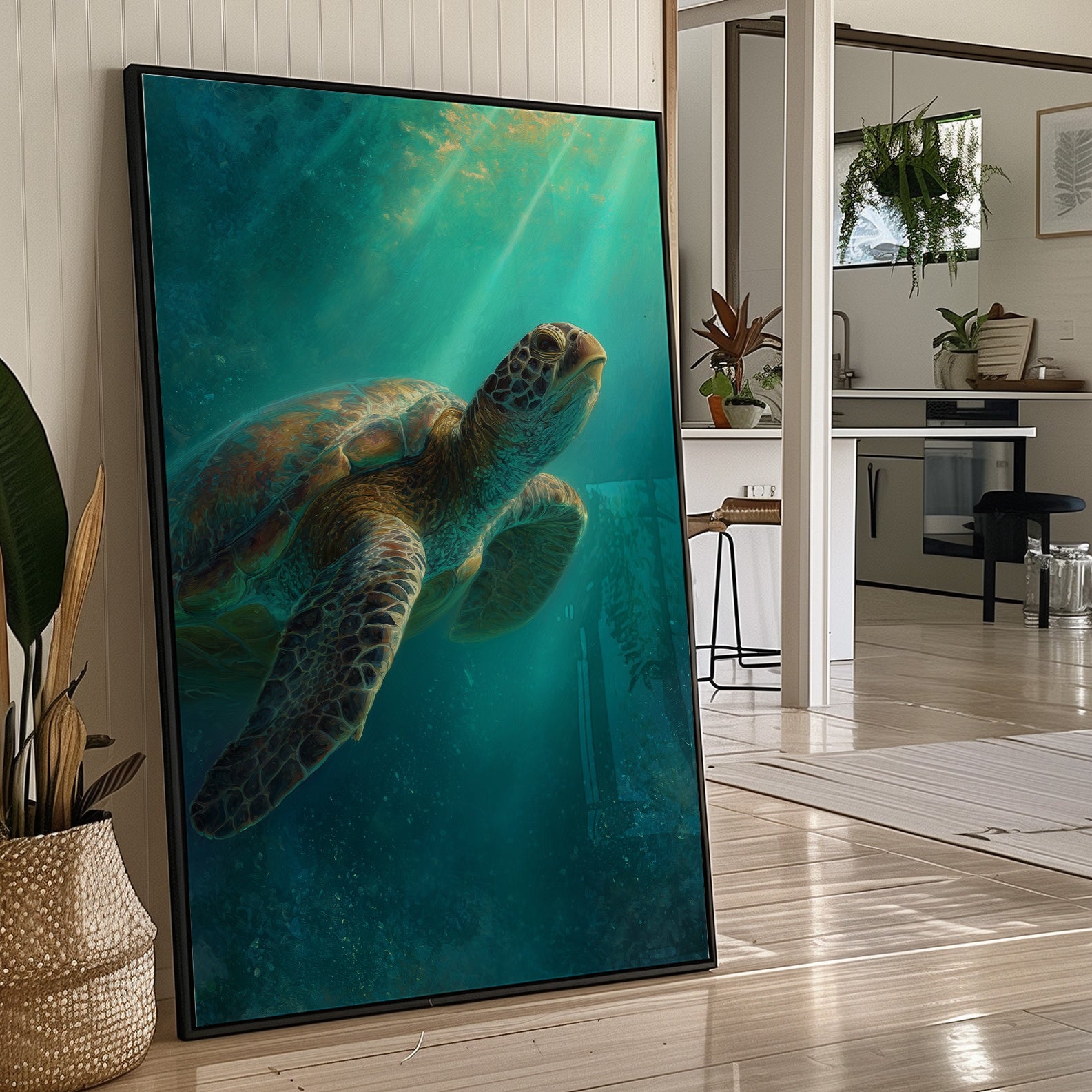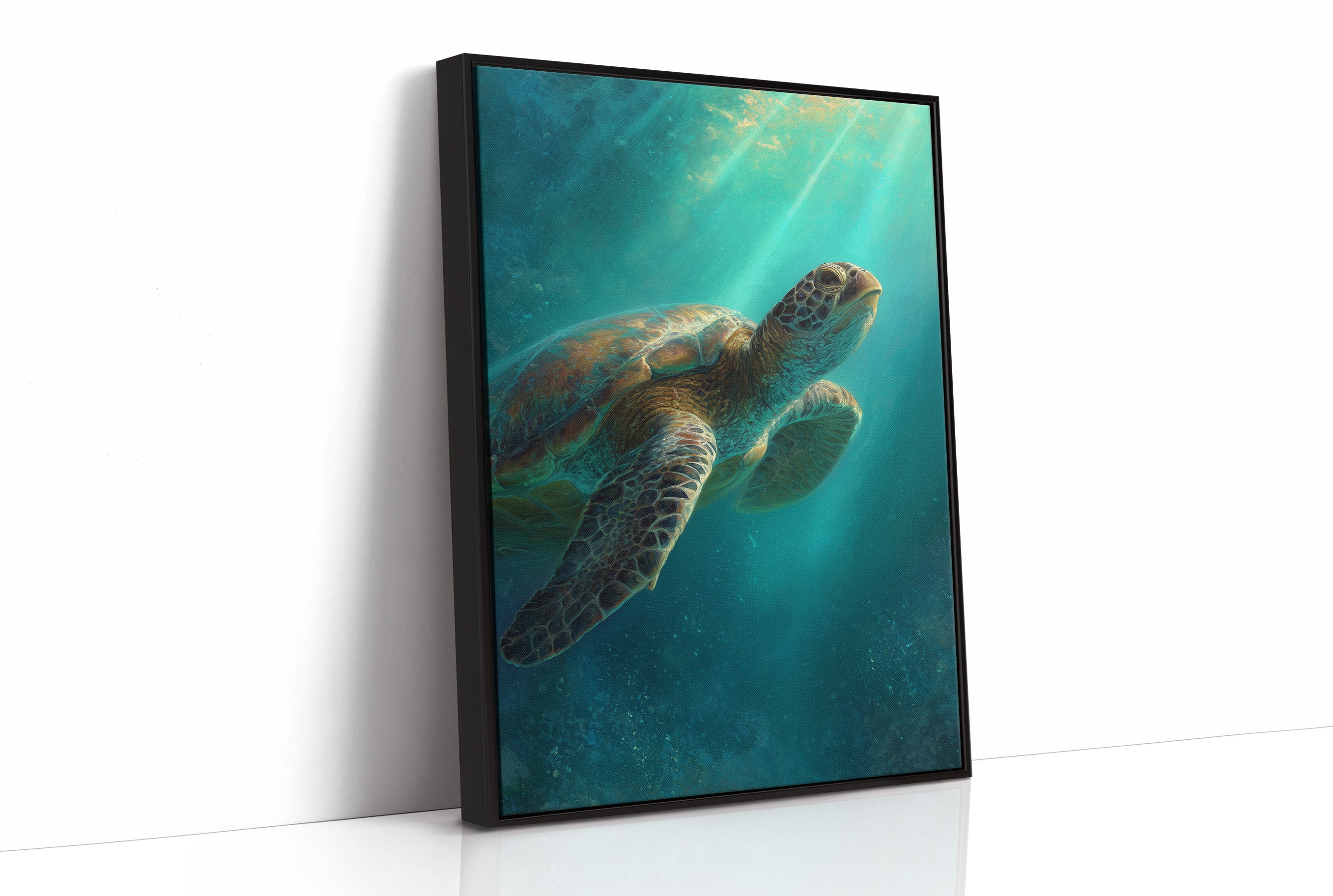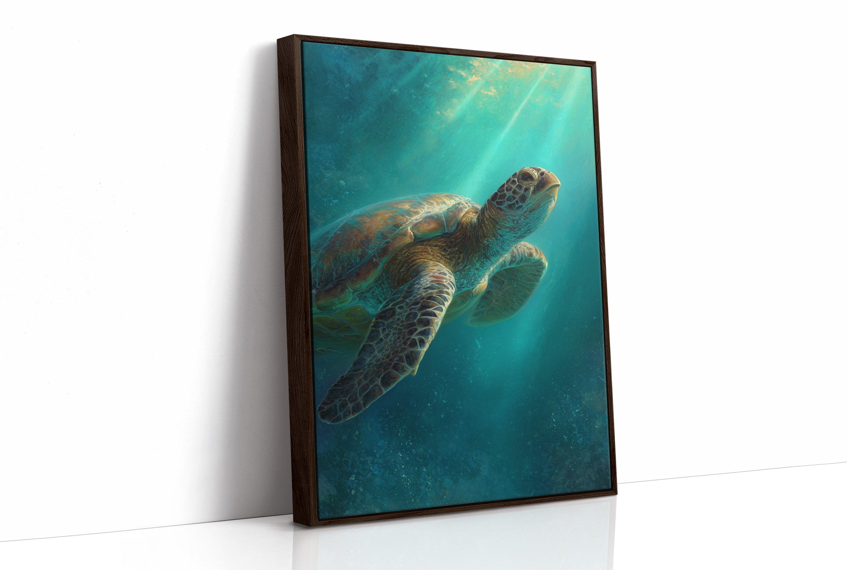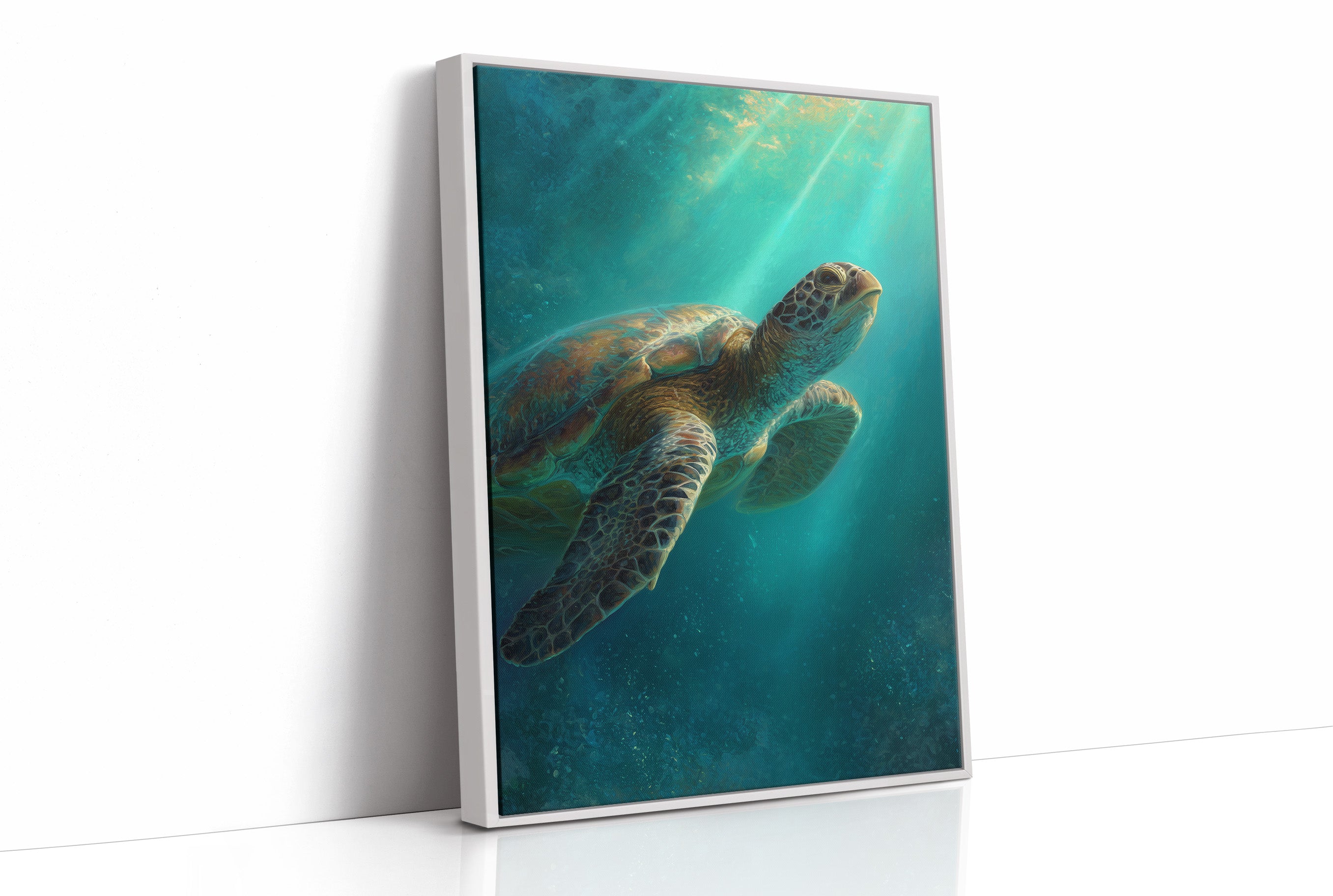 A sea turtle glides gracefully through azure waters, its shell catching the ethereal rays of sunlight filtering down from above. The painting captures that magical underwater moment where light penetrates the depths, creating a dreamlike atmosphere of turquoise and teal hues.