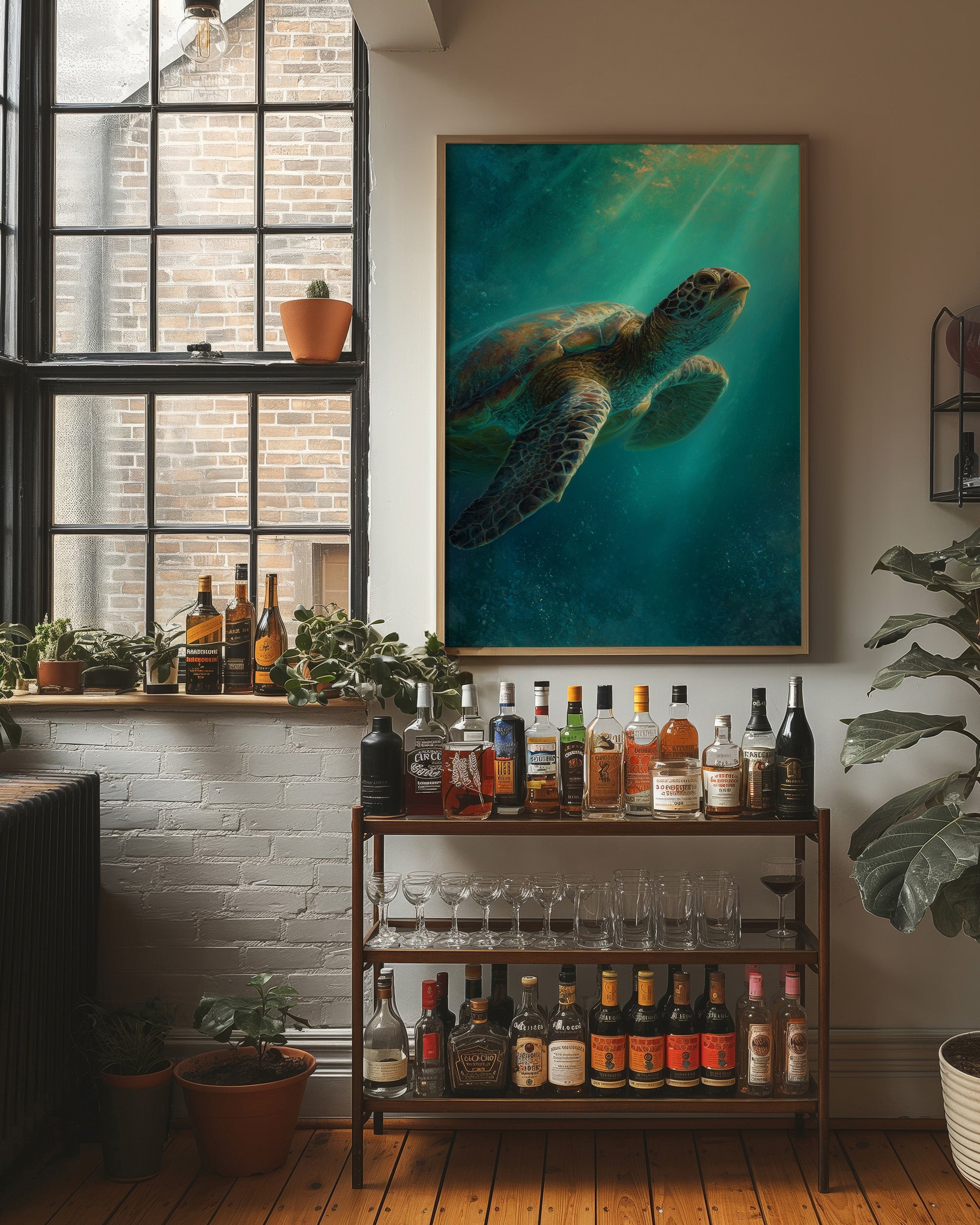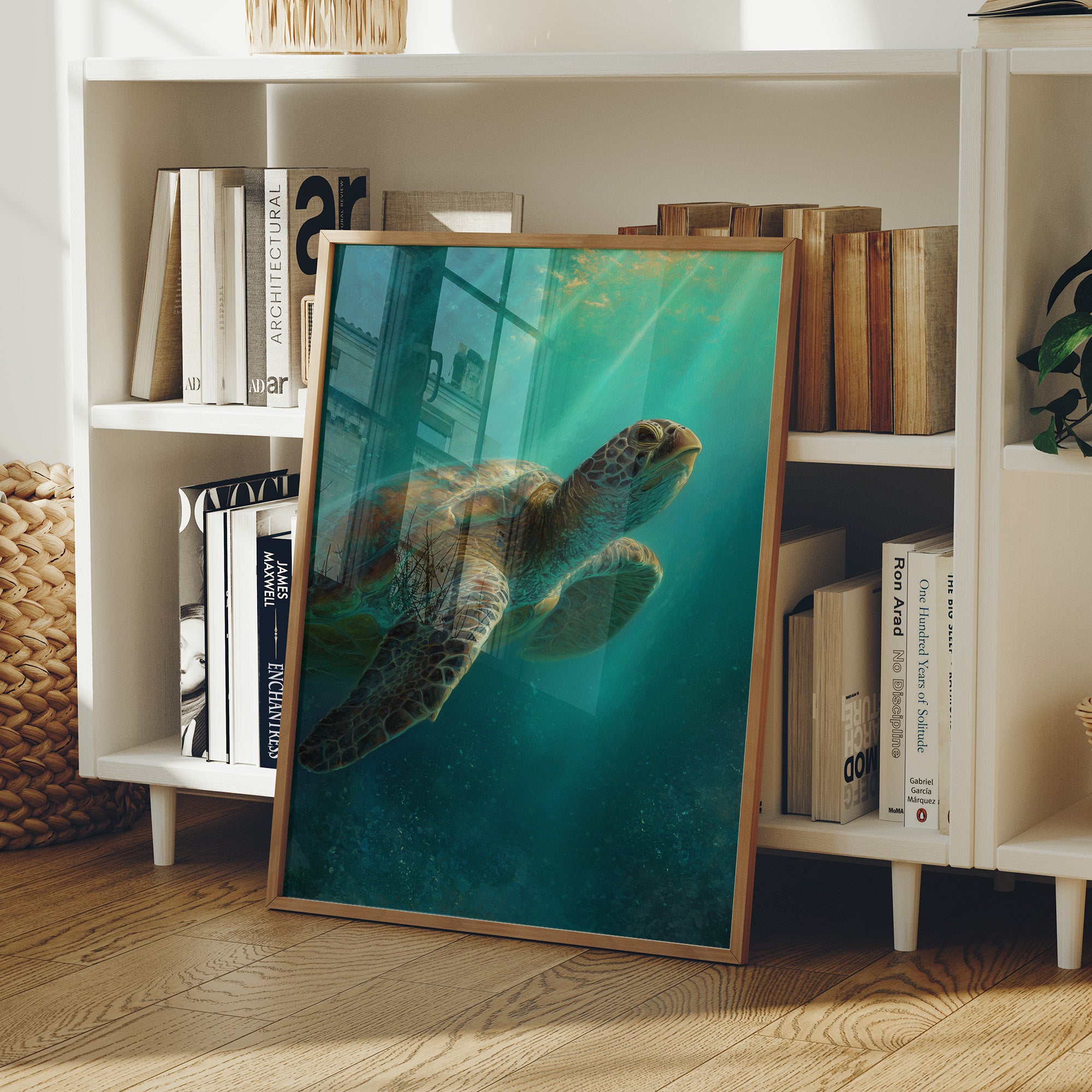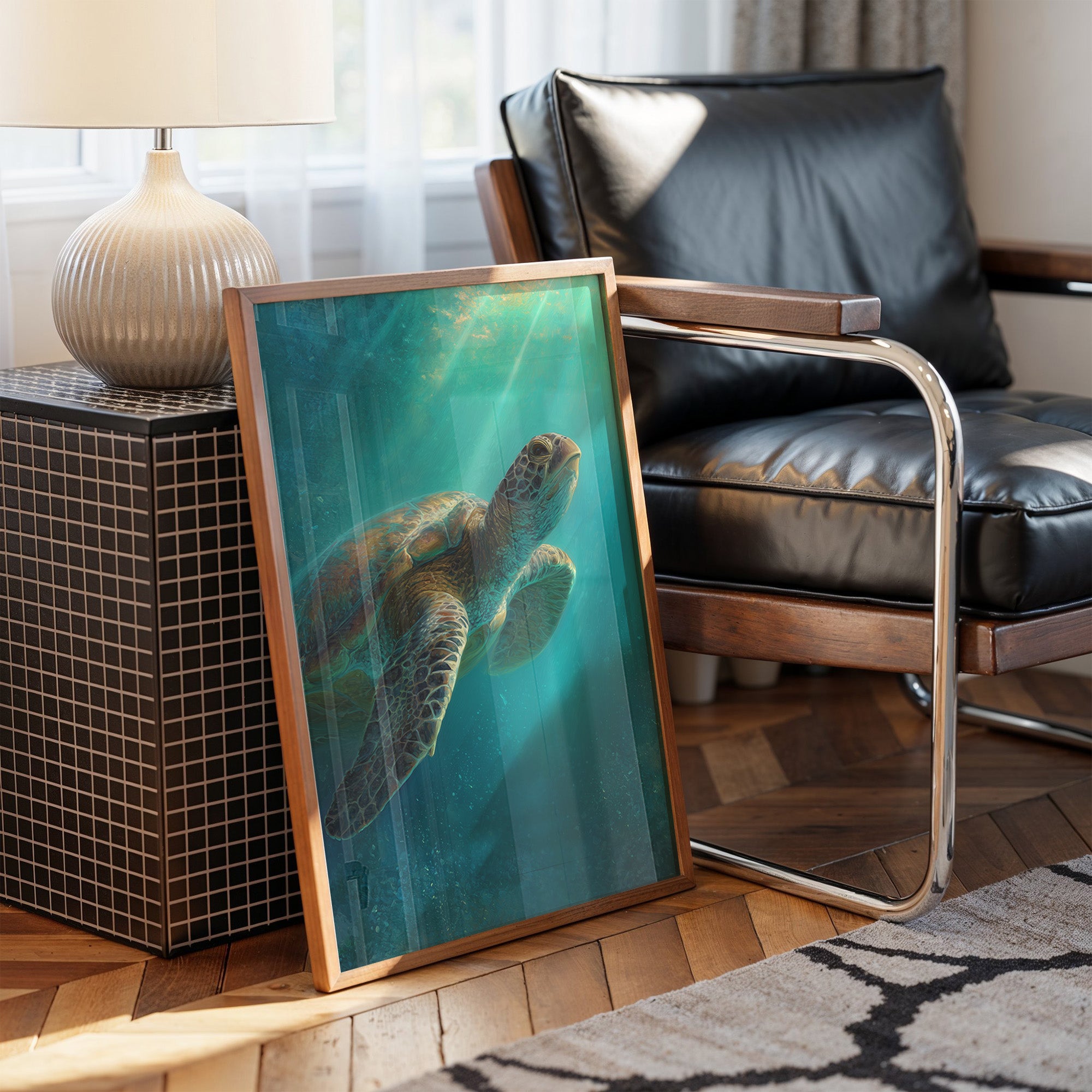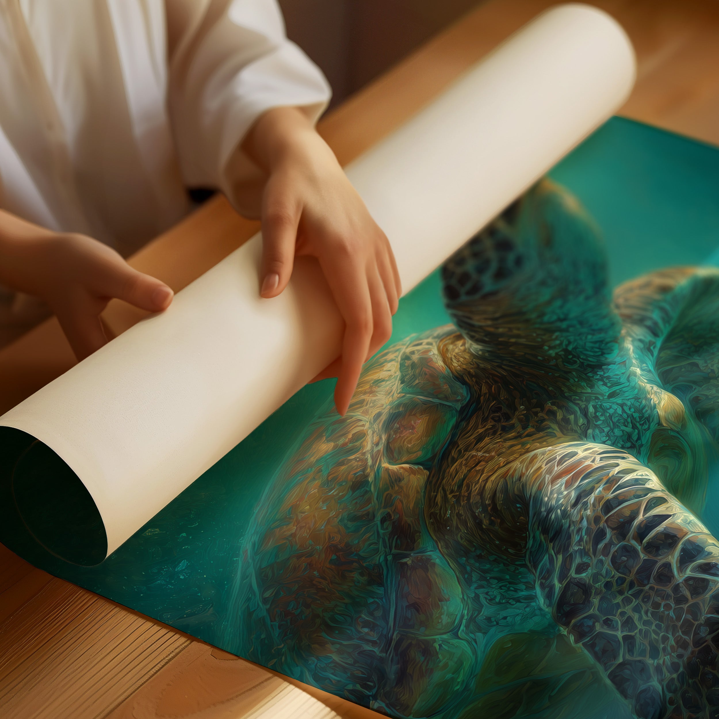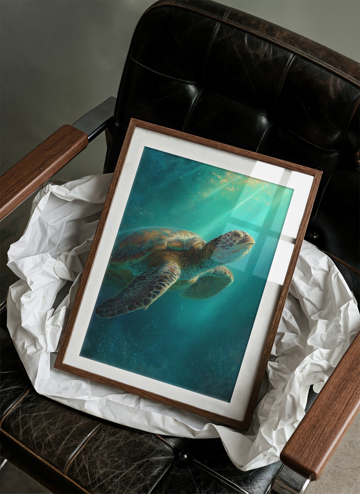 A sea turtle glides gracefully through azure waters, its shell catching the ethereal rays of sunlight filtering down from above. The painting captures that magical underwater moment where light penetrates the depths, creating a dreamlike atmosphere of turquoise and teal hues.