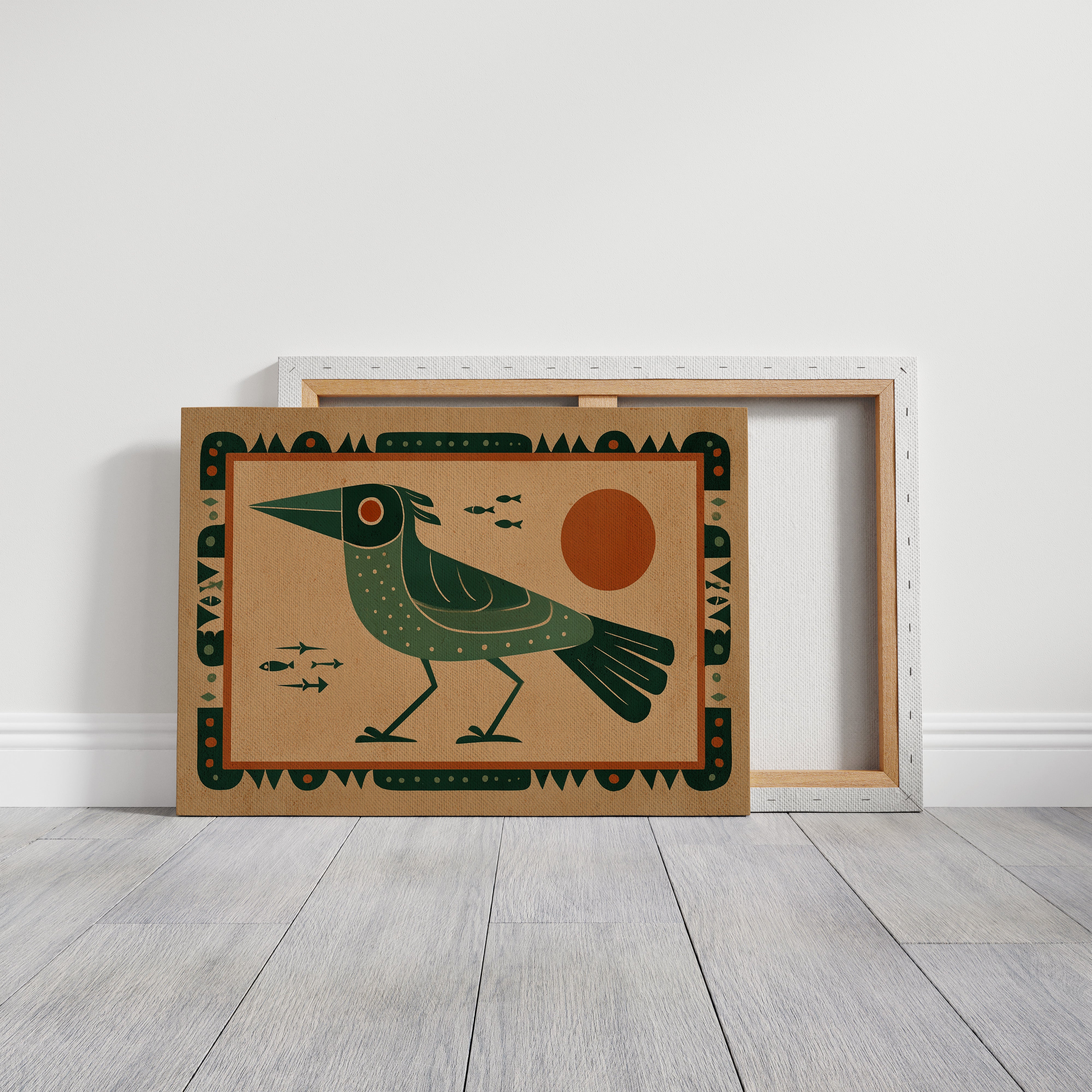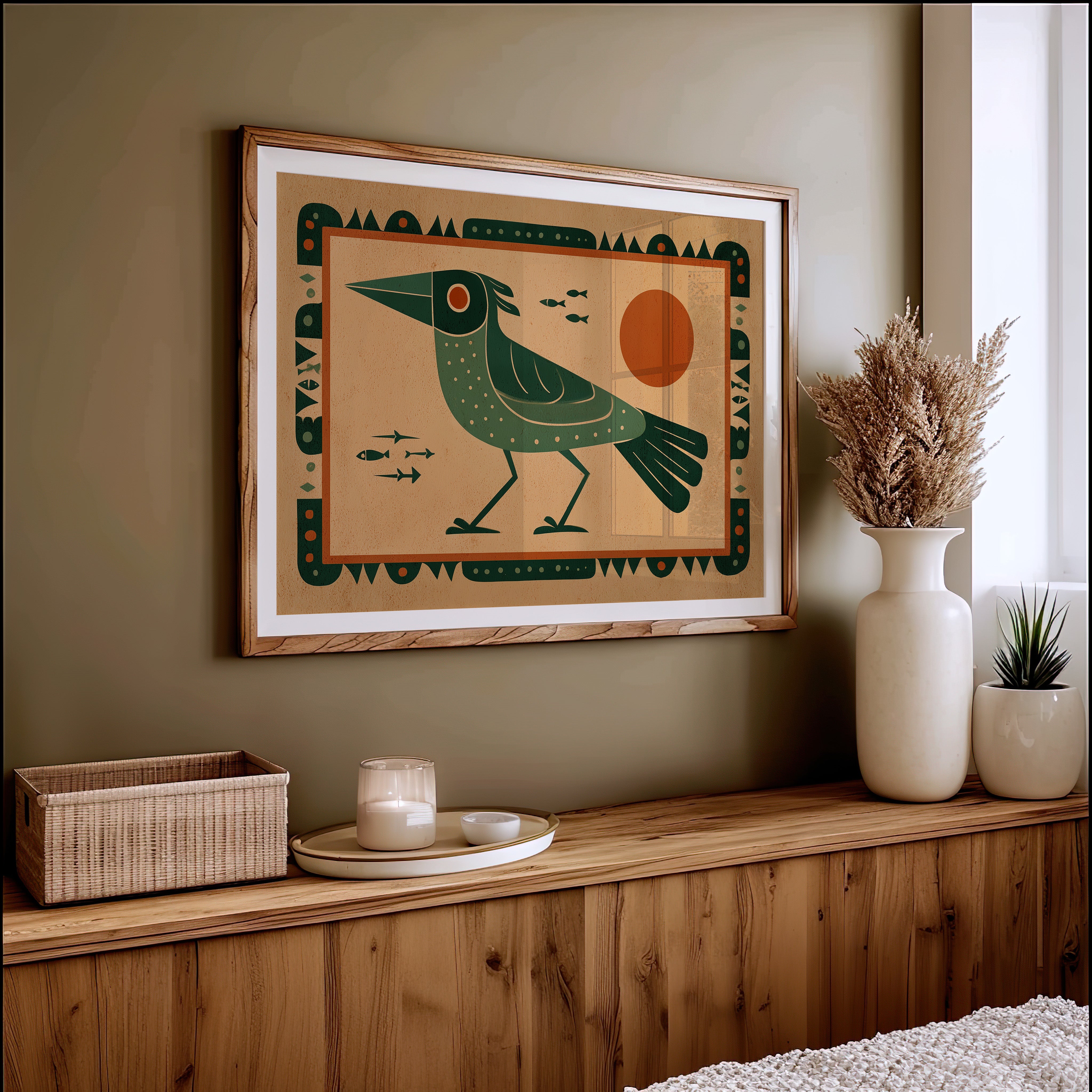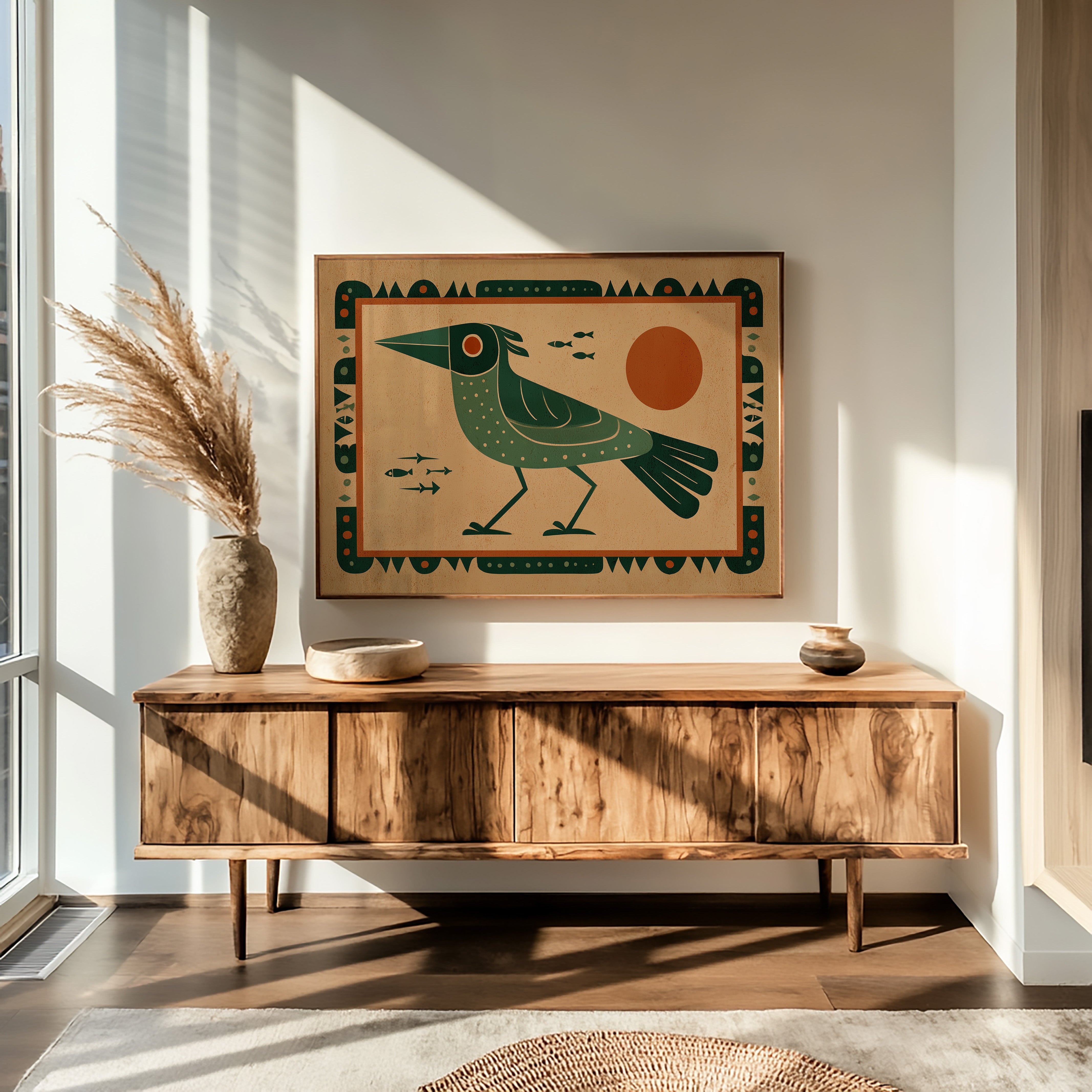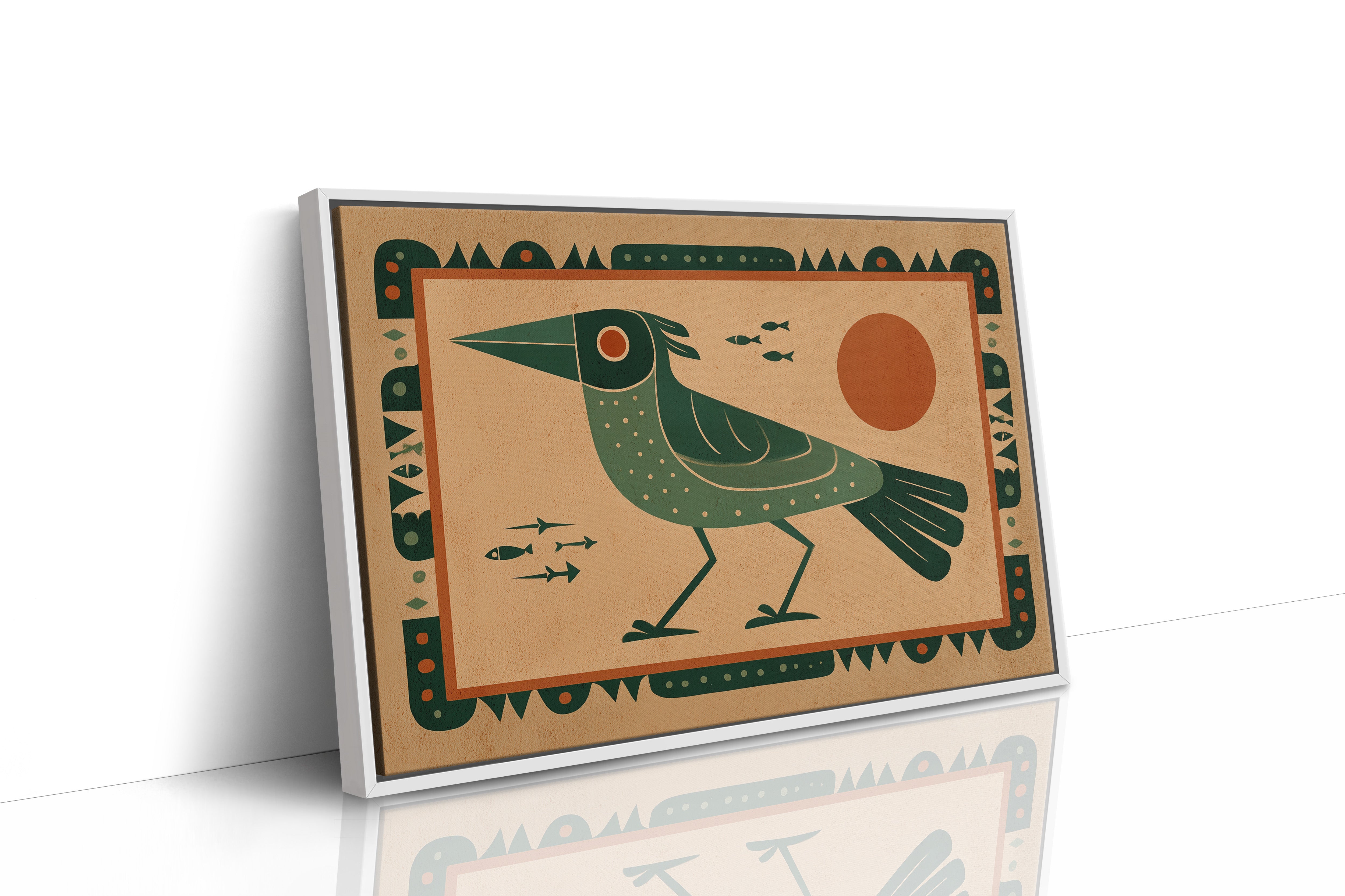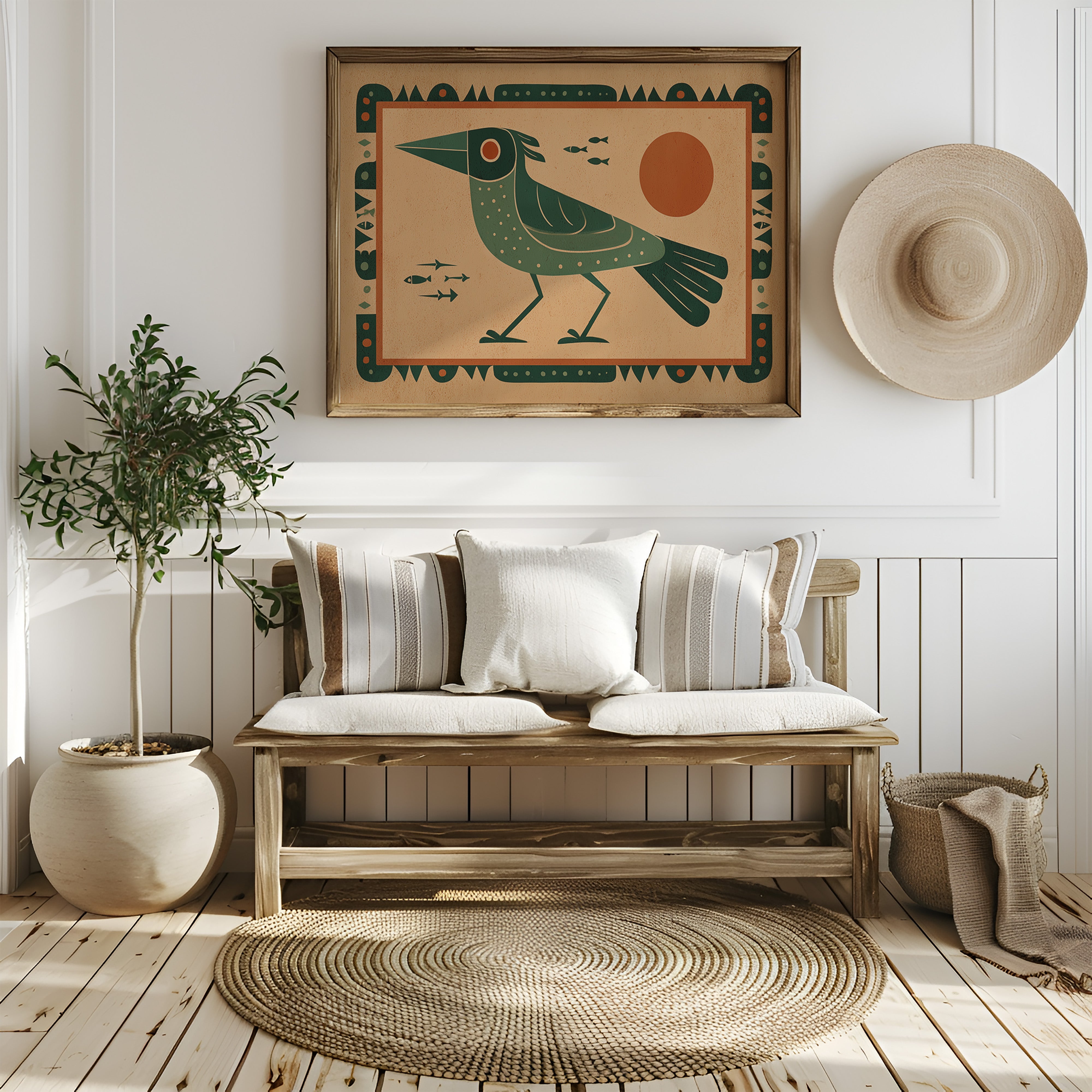 This stylized artwork features a striking green bird with geometric patterns set against a warm terracotta background. The composition draws inspiration from indigenous art traditions while incorporating modern design sensibilities. The bird, depicted in profile with a distinctive pointed beak and dotted plumage, stands vigilantly as small fish swim nearby. A bold orange sun dominates the right side, creating balance with the bird's form. The entire piece is framed by an intricate border of repeating geometric shapes and dots, enhancing its cultural resonance. The limited color palette of deep greens, terracotta, and cream creates a harmonious visual narrative that speaks to humanity's enduring connection with nature and symbolism.
