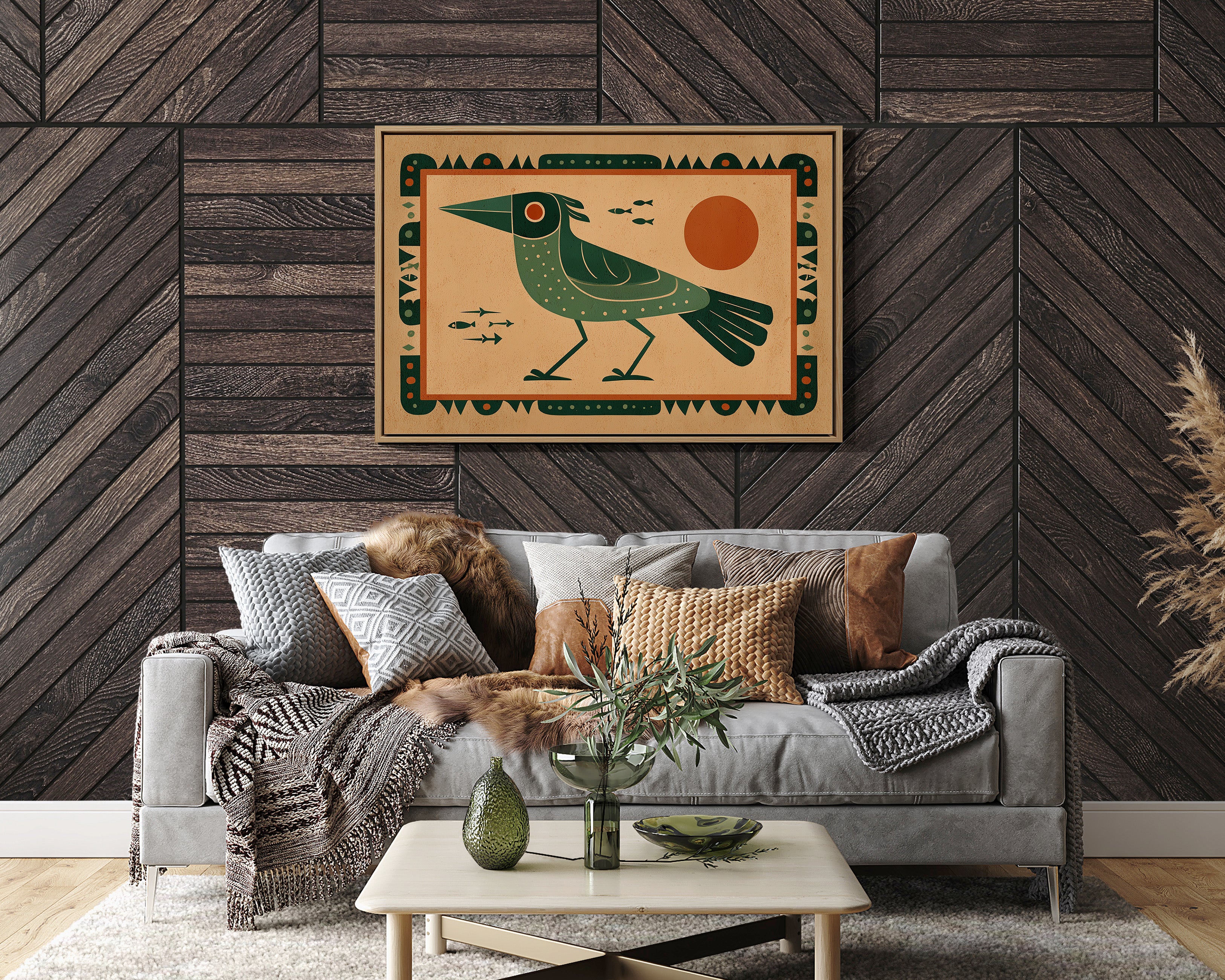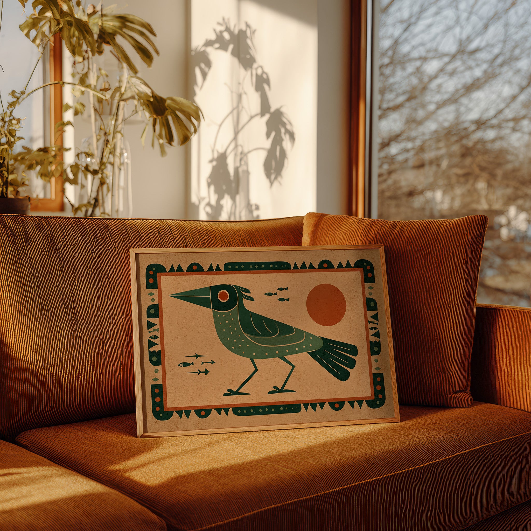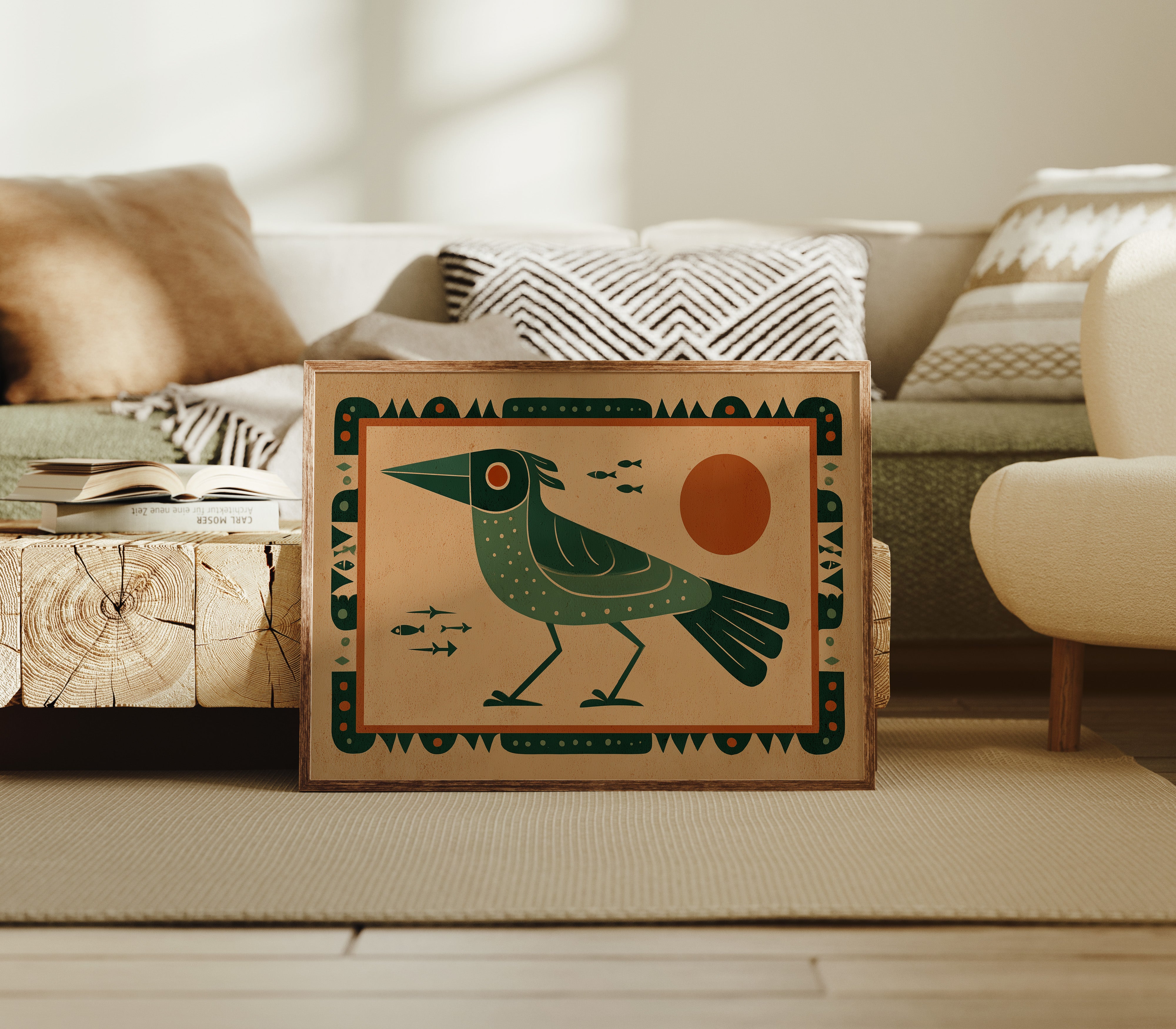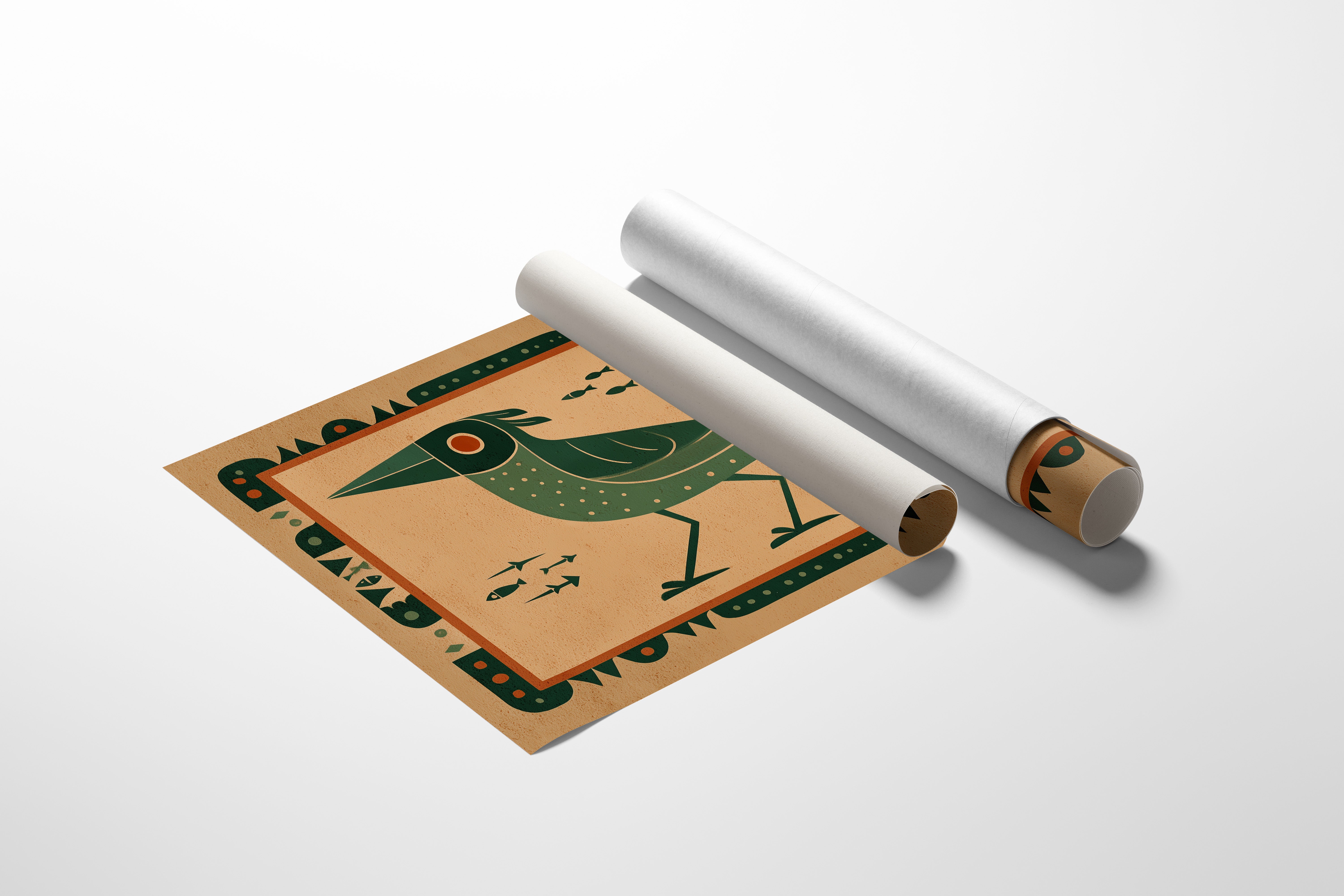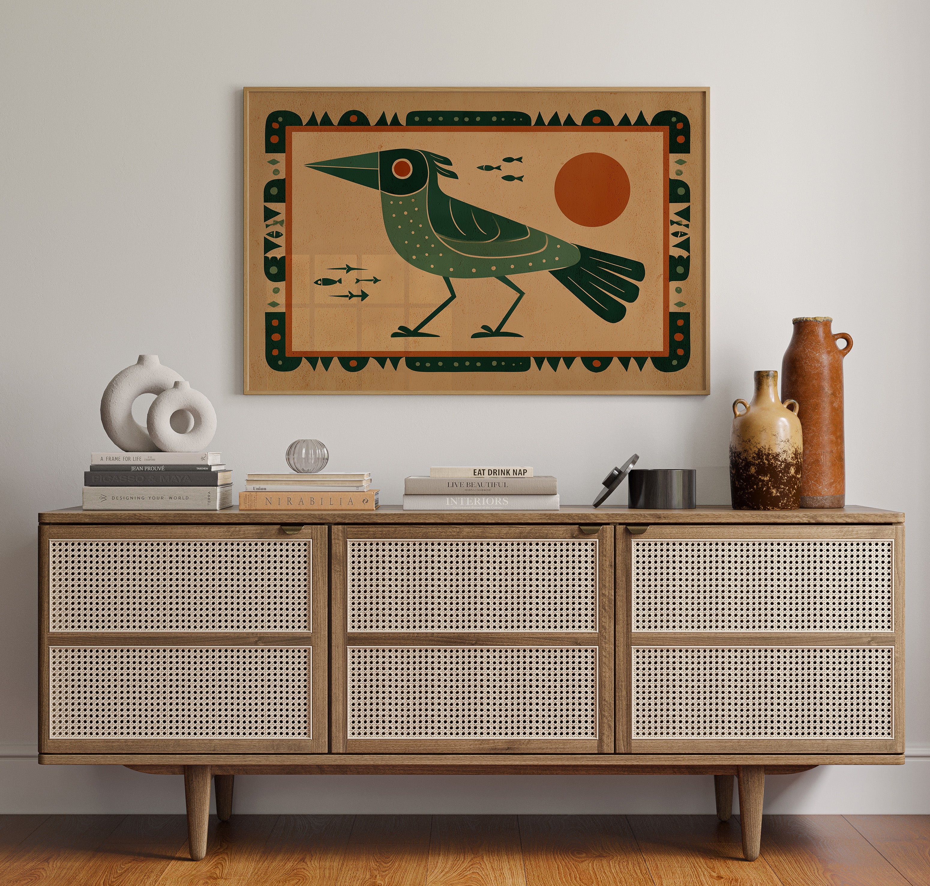 This stylized artwork features a striking green bird with geometric patterns set against a warm terracotta background. The composition draws inspiration from indigenous art traditions while incorporating modern design sensibilities. The bird, depicted in profile with a distinctive pointed beak and dotted plumage, stands vigilantly as small fish swim nearby. A bold orange sun dominates the right side, creating balance with the bird's form. The entire piece is framed by an intricate border of repeating geometric shapes and dots, enhancing its cultural resonance. The limited color palette of deep greens, terracotta, and cream creates a harmonious visual narrative that speaks to humanity's enduring connection with nature and symbolism.