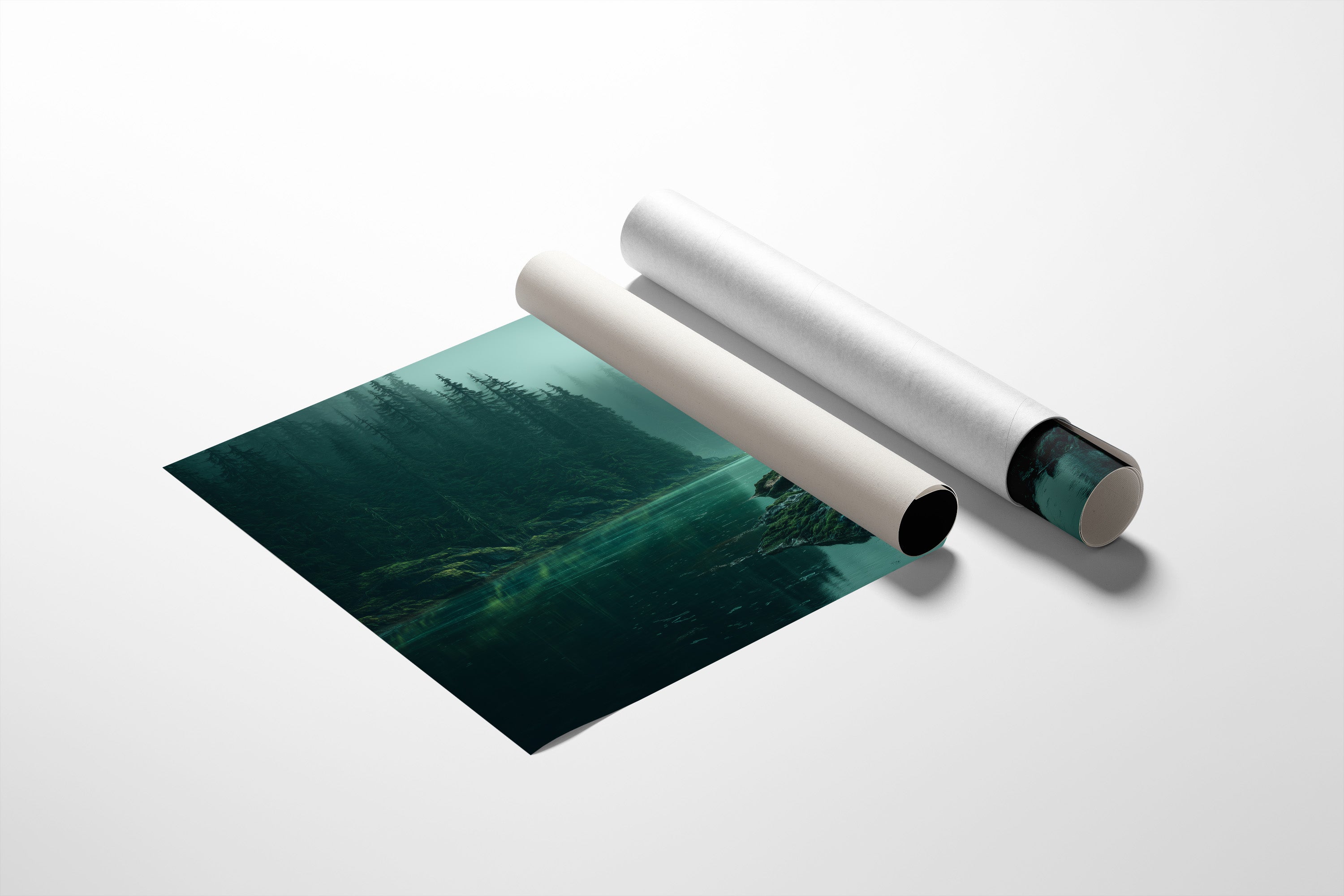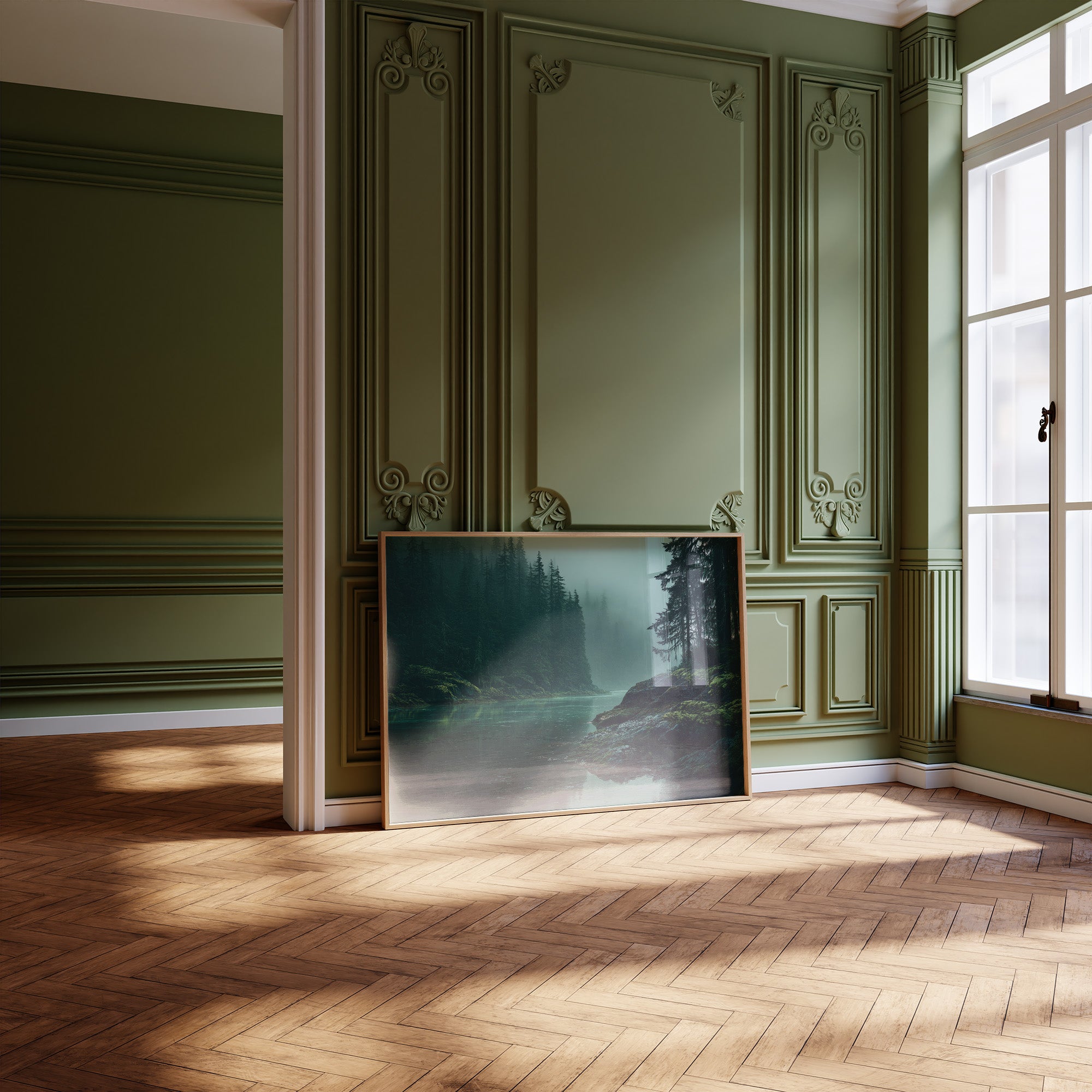 The mist hangs low over a tranquil emerald lake, cradled by ancient evergreens that stand like sentinels in the half-light. Verdant moss clings to rocky shores, creating a perfect mirror where forest meets water in hushed reverence. The scene captures that fleeting moment when the world holds its breathsuspended between daybreak and full morning, between reality and dream. This contemplative piece brings the restorative power of wilderness into your living space, creating a meditative focal point for a home office or reading nook.