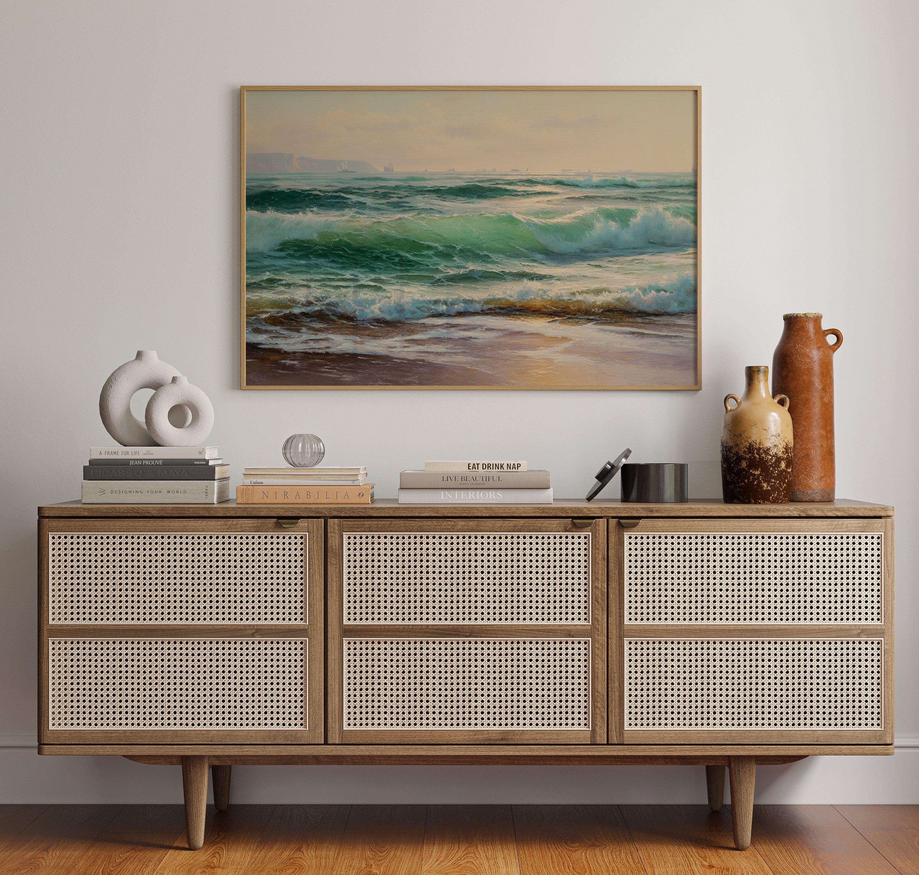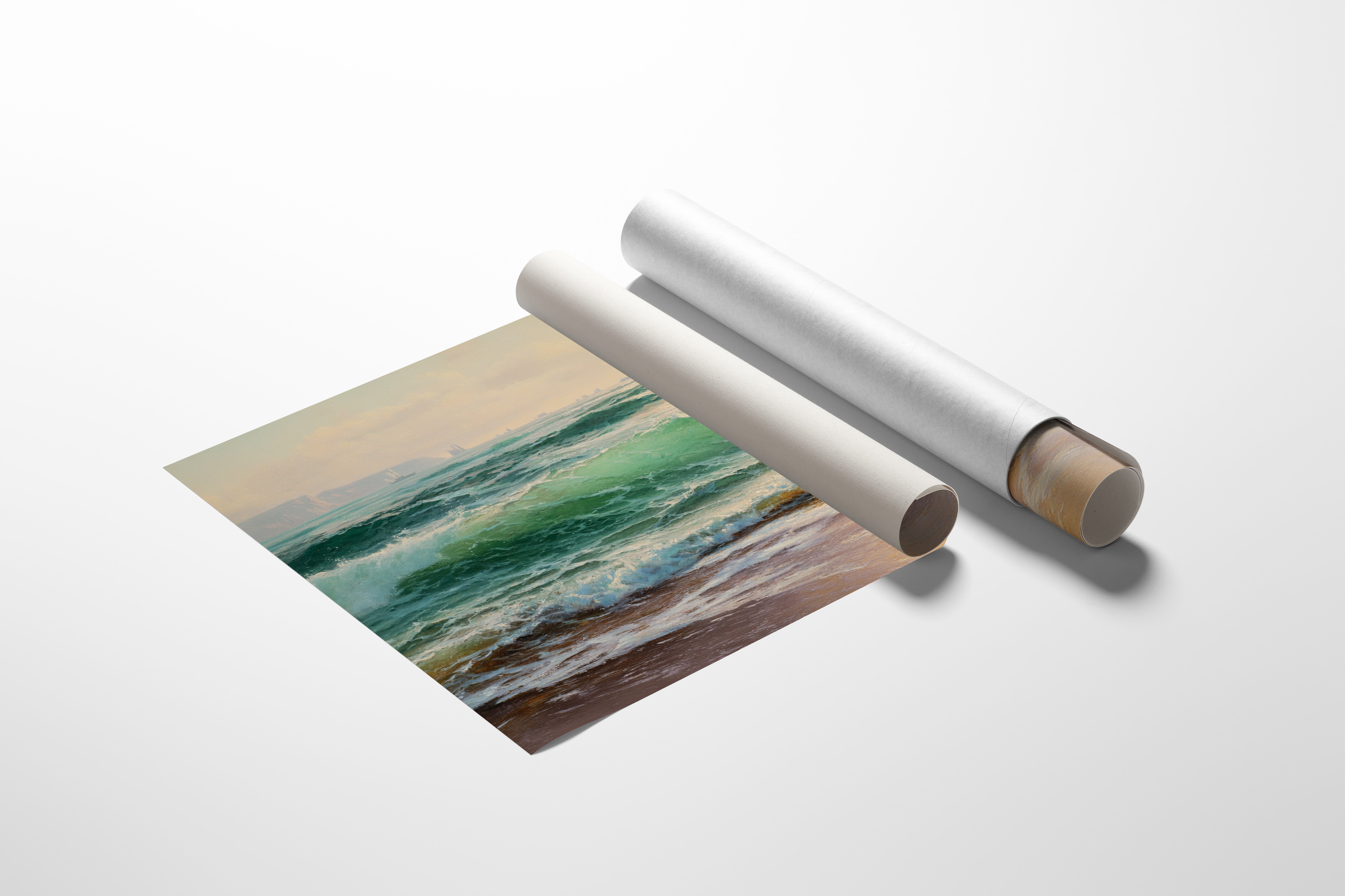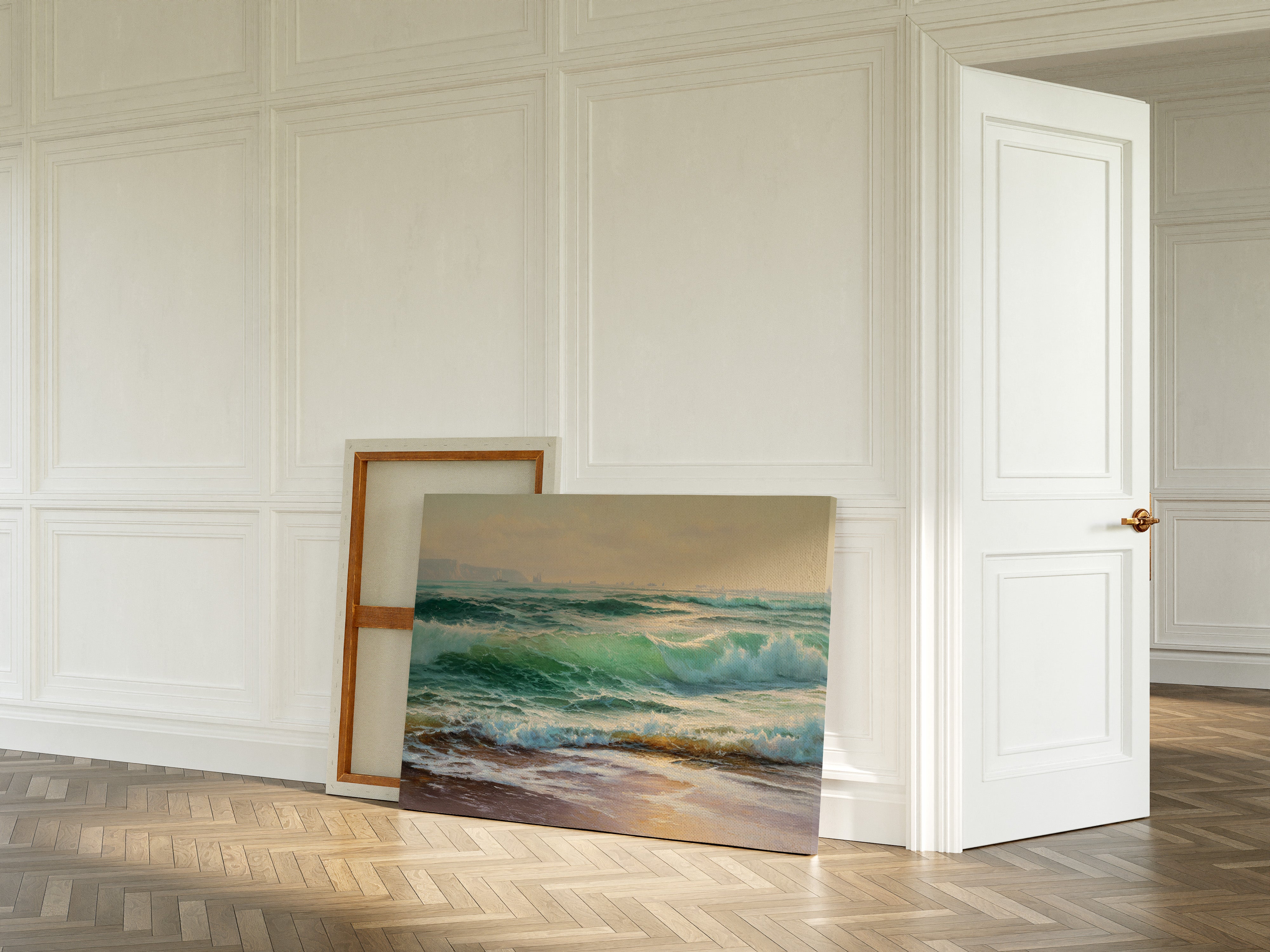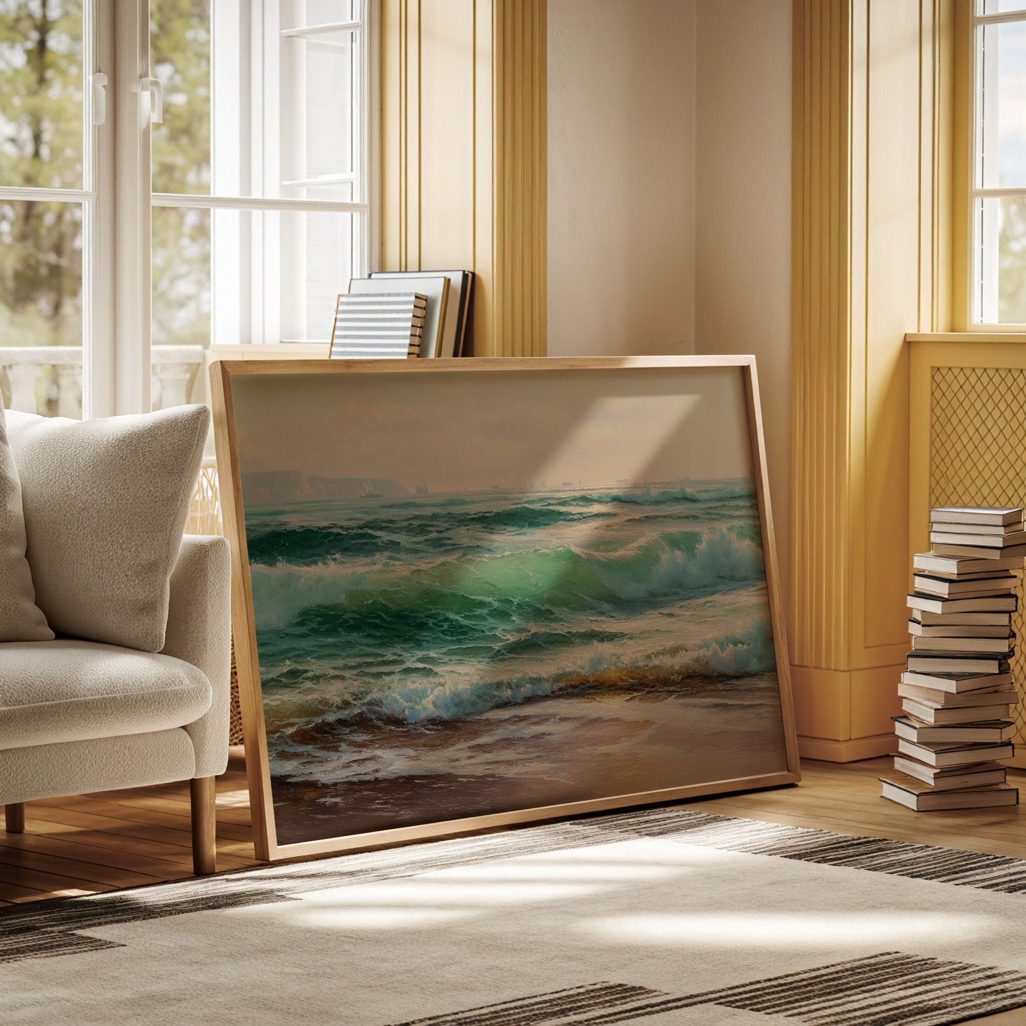 Sunlight filters through sea spray, casting an ethereal glow across tumbling waves of deep emerald and jade. The ocean surges with raw power, each wave carrying stories of distant shores and ancient tides. Translucent peaks catch the light, transforming into liquid crystal before dissolving into foamy cascades along the sand. Distant cliffs stand sentinel through the mist, while sailing vessels dot the horizon like memories of maritime adventures. This piece brings the timeless drama of the sea into living spaces, perfect for creating a contemplative focal point in coastal homes or adding natural majesty to urban retreats.