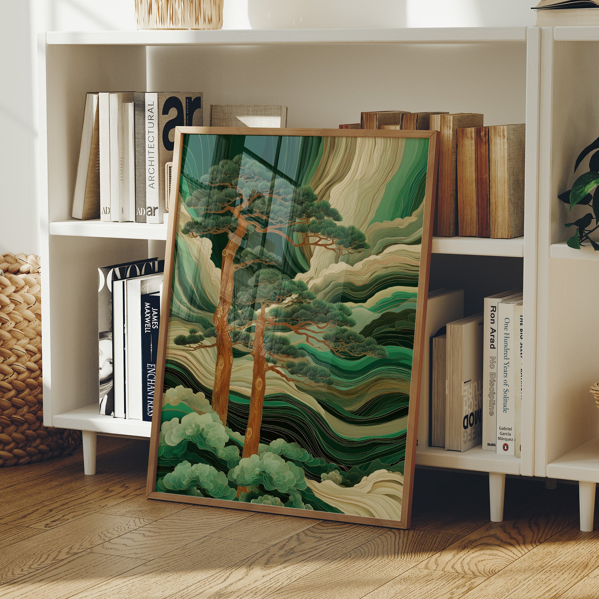 Swirling emerald waves dance across the sky, creating a mesmerizing backdrop for two majestic pine trees standing tall against nature's fluid motion. The composition merges traditional Asian artistry with contemporary flowing lines, as copper-hued trunks rise through layers of jade and forest green swirls. This piece captures the eternal dialogue between stillness and movement, where ancient trees remain steadfast while the world flows around them. This statement piece brings tranquility and natural elegance to any room, perfect for a meditation space or as a focal point in a minimalist living area where its rich greens can inspire contemplation and peace.