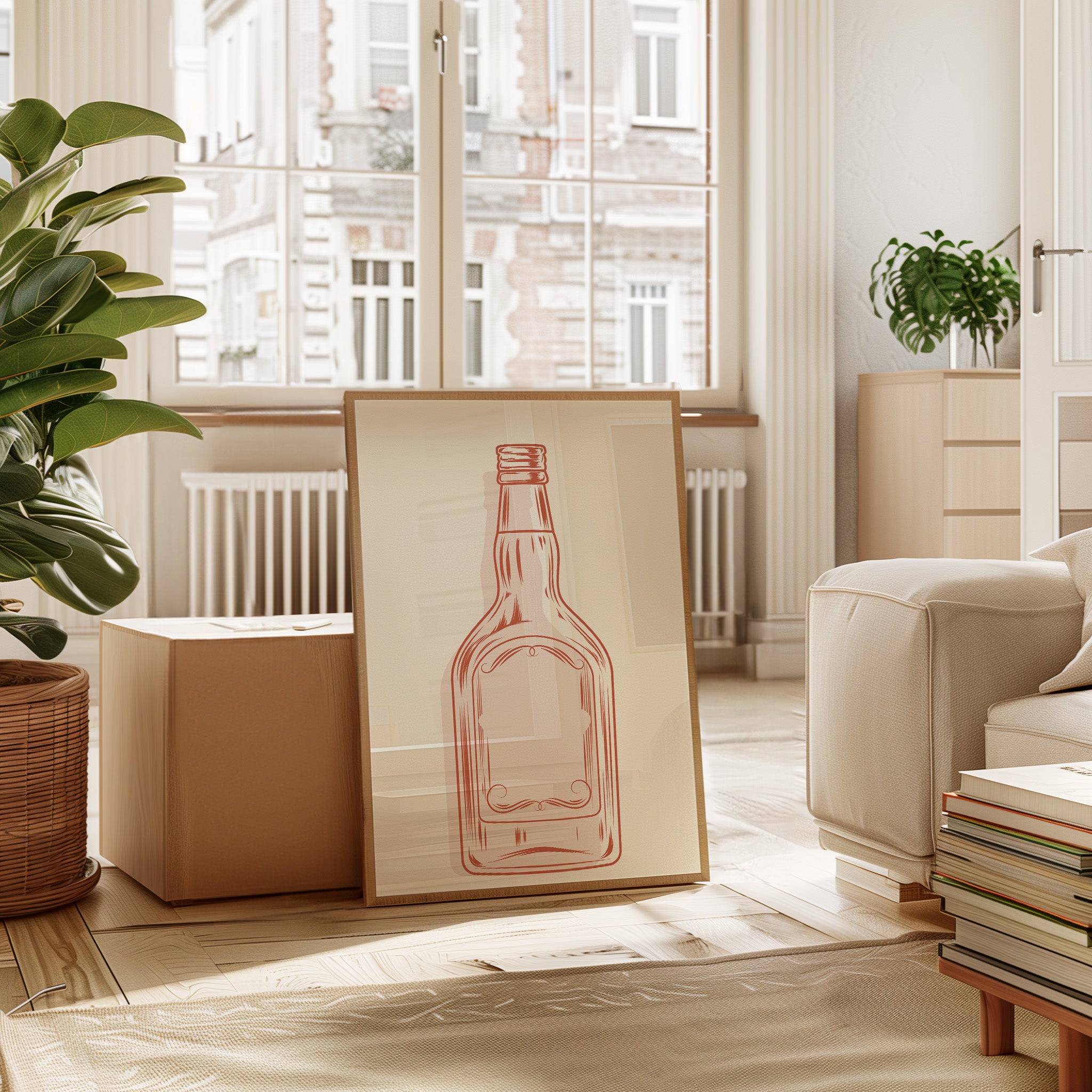 A delicate terracotta line drawing traces memories in glass, capturing the elegant simplicity of a vintage bottle's curves and ornate label frame. Part of our Contemporary collection, this piece marries minimalist design with nostalgic charm. The bottle stands as both presence and absence - its empty label a canvas for imagination, while precise linework creates depth through subtle shading and purposeful strokes. The soft blush background adds warmth, suggesting early evening light through frosted glass. Perfect for adding sophisticated charm to a home bar, dining room, or kitchen space where it can spark conversations about cherished moments and untold tales.