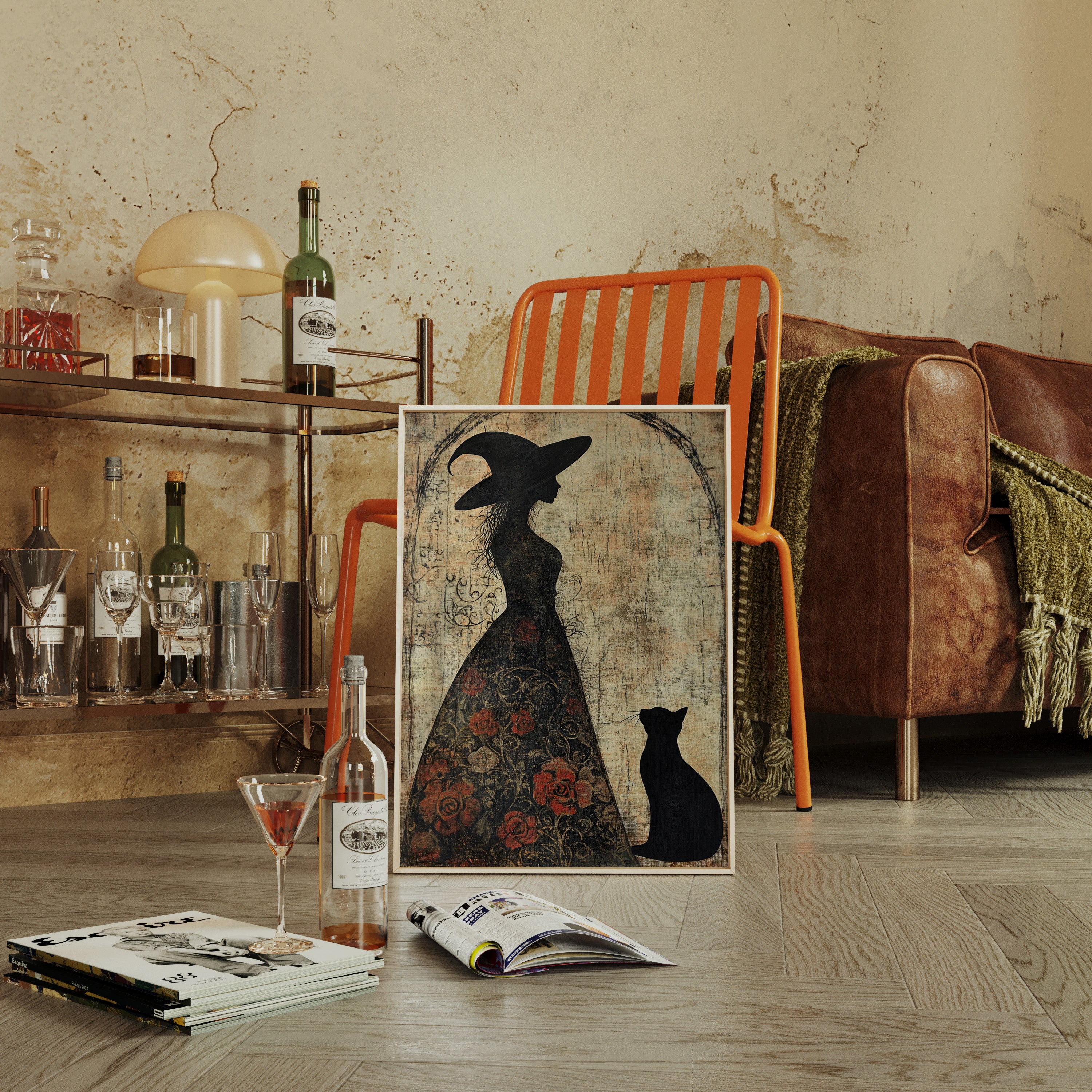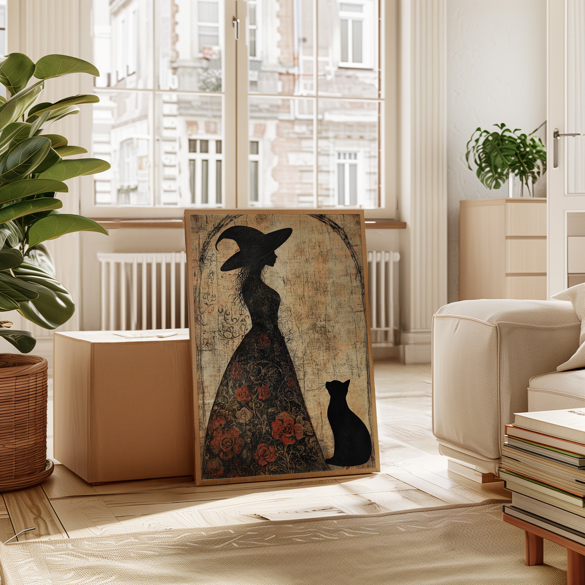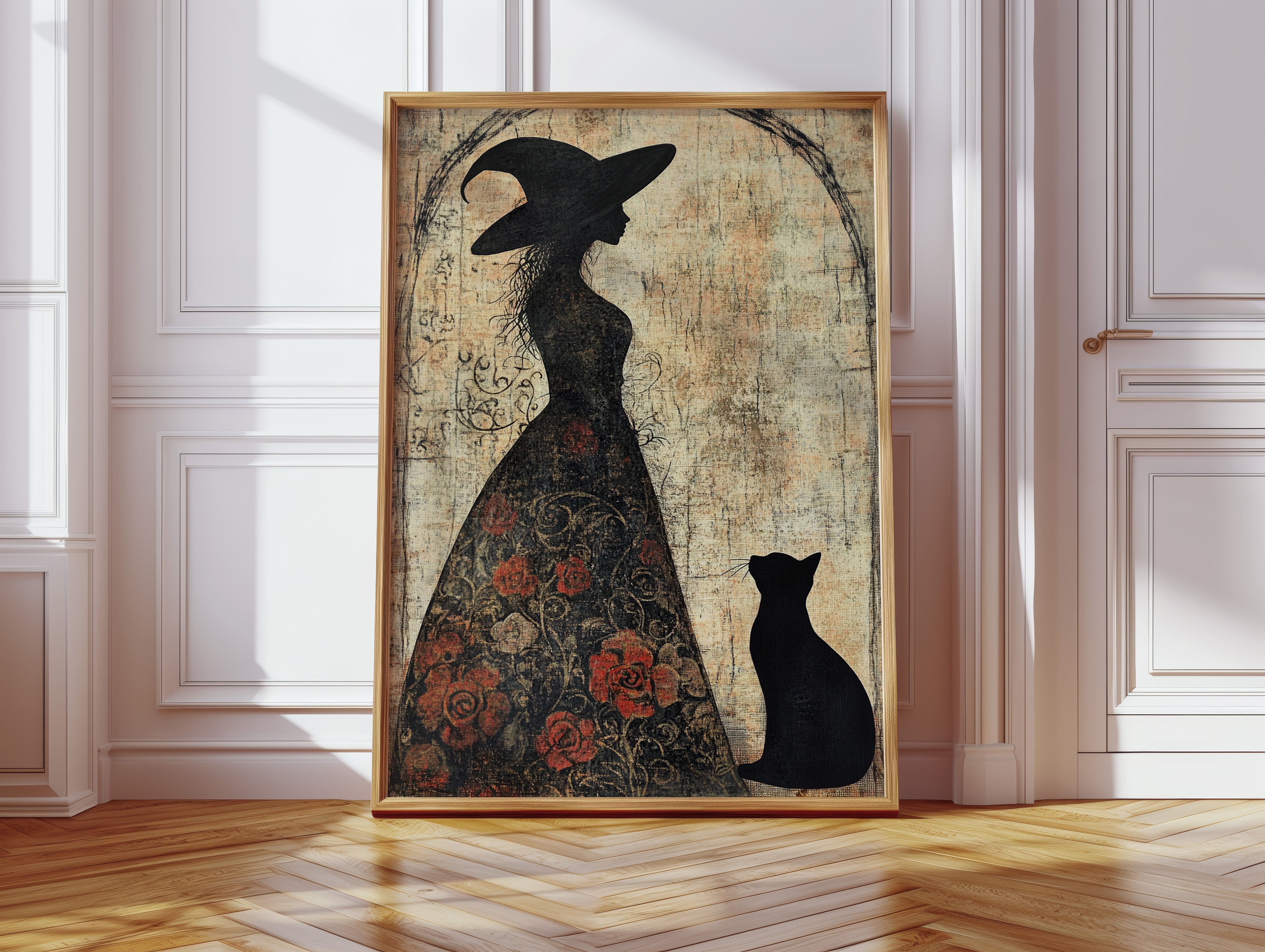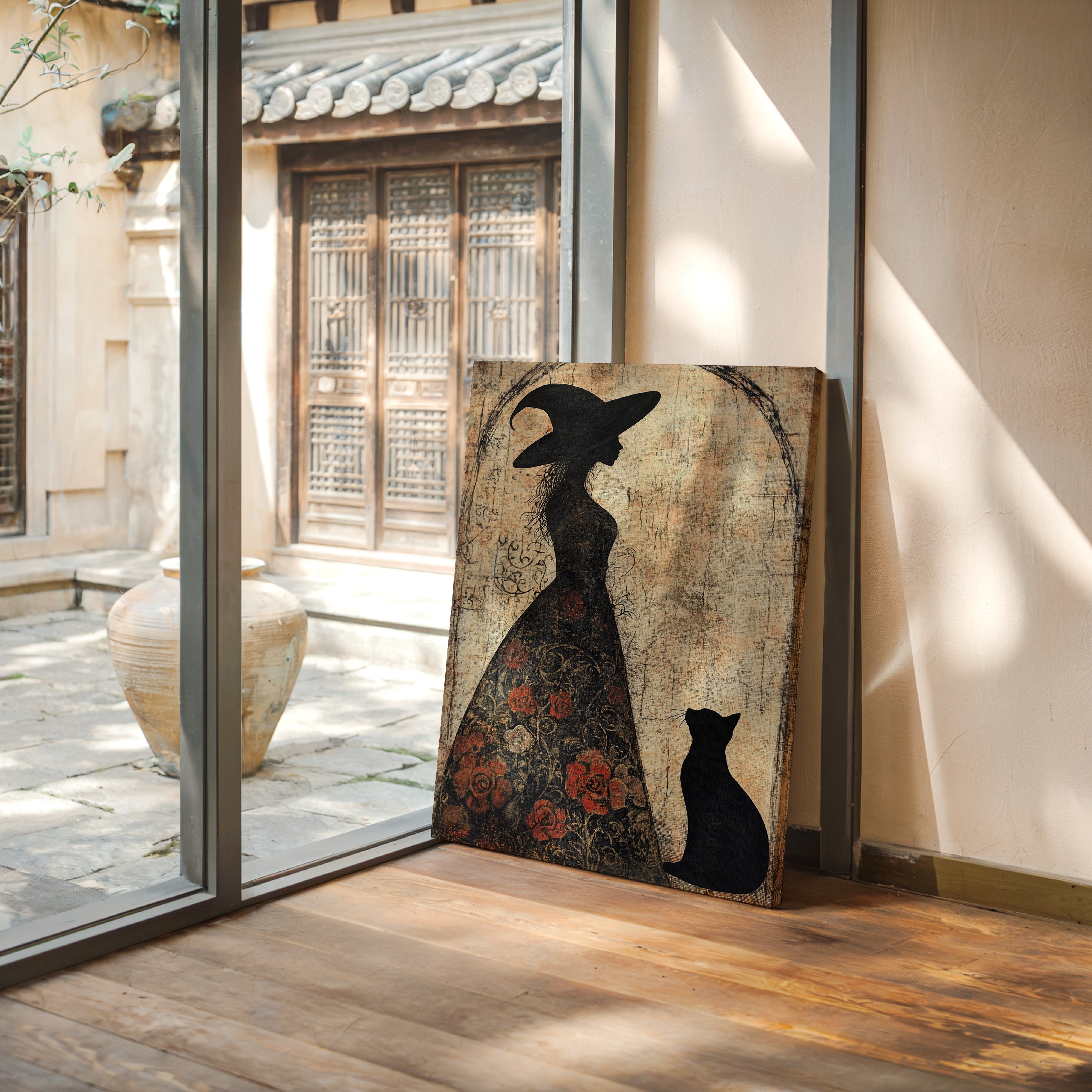 Step into a world of mystique with 'Enchanted Shadows,' where the silhouette of a witch and her feline companion conjures a spellbinding aura. This evocative art piece, with its textured background and floral gown, embodies a vintage charm that whispers secrets of the past. Perfect for those who embrace the whimsical and the mysterious, this artwork serves as a captivating centerpiece for any room, inviting viewers into its magical narrative.