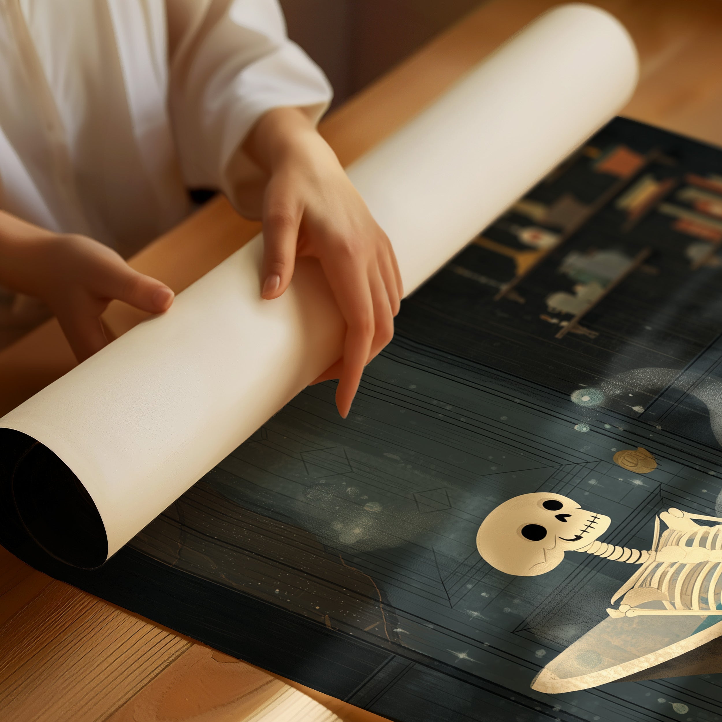 Steam rises like forgotten thoughts as a skeleton lounges in vintage porcelain, finding peace in the afterlife's simple pleasures. The moody dark tones create a hauntingly beautiful scene where death relaxes among brass fixtures and bathroom trinkets, a playful reminder of mortality's unexpected charm. This darkly whimsical piece brings sophisticated macabre elegance to a modern home office or stylish bathroom with attitude.