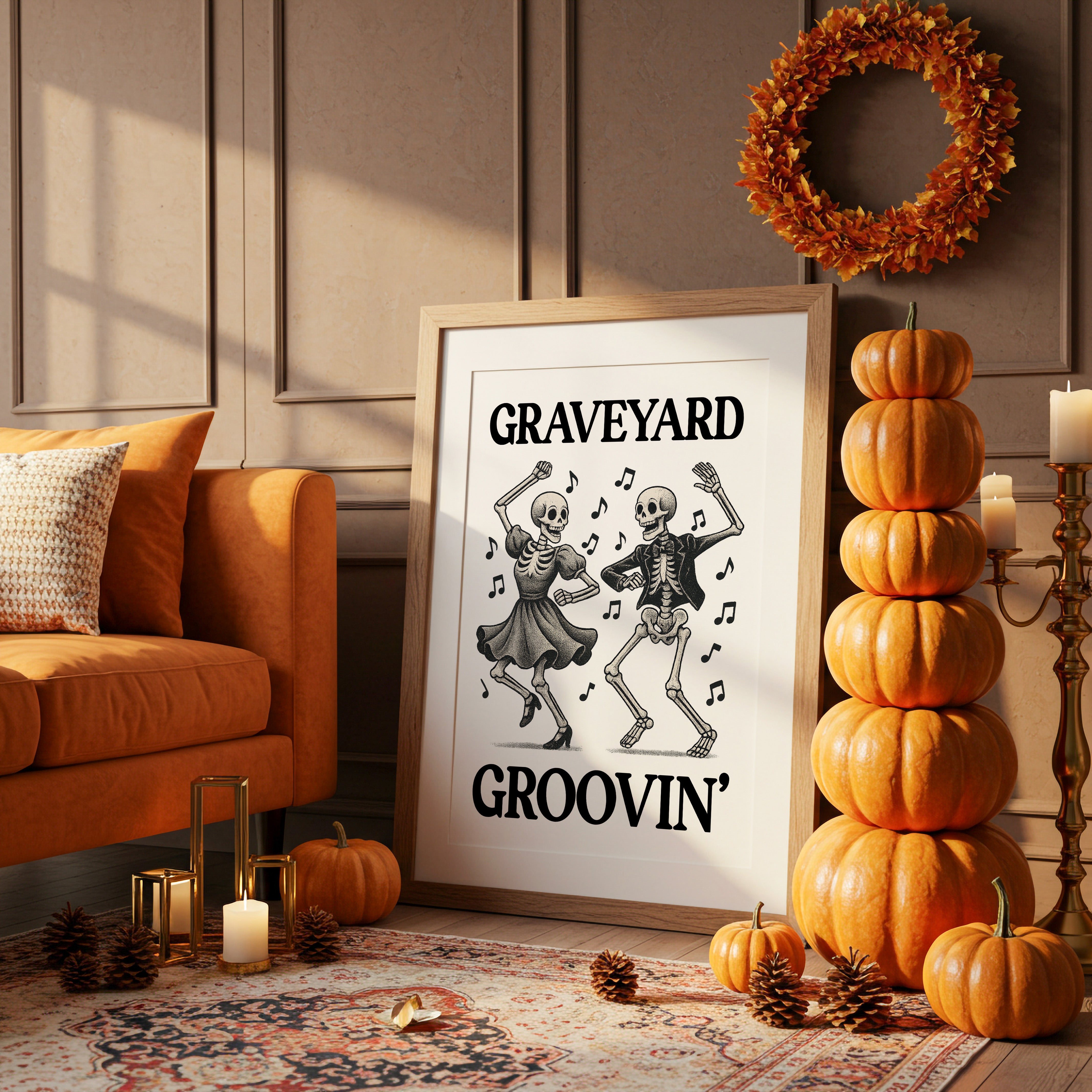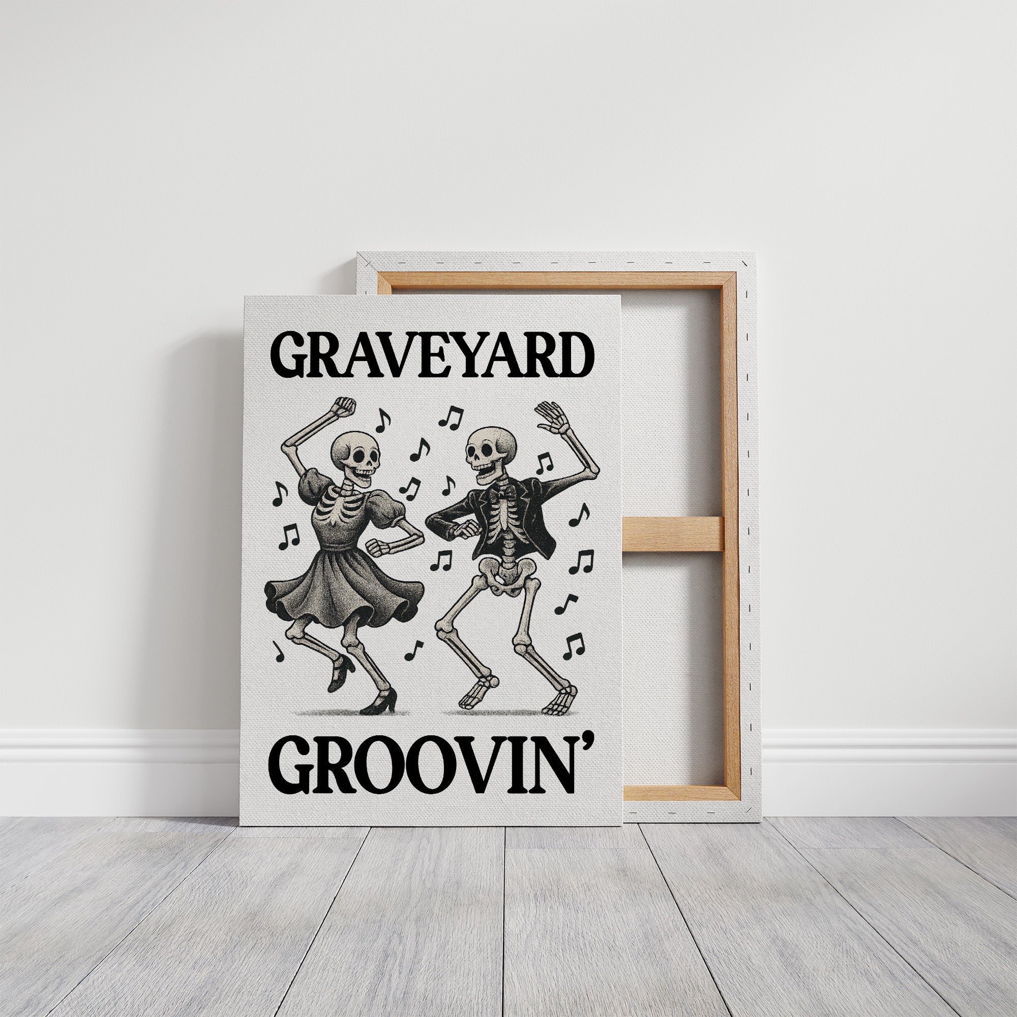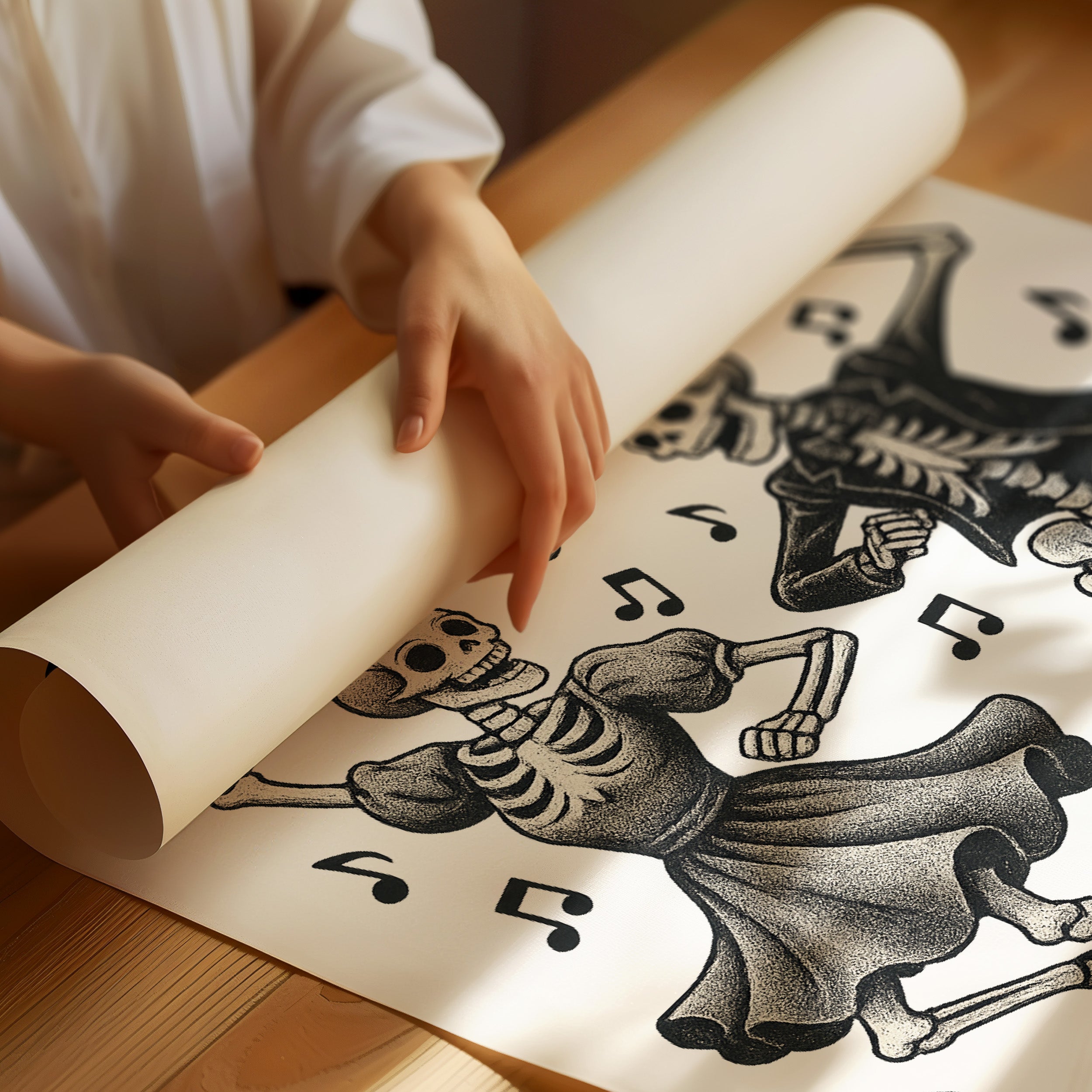 Laughter echoes beyond mortality as two skeletal figures swing to an unheard rhythm, finding bliss in their afterlife celebration. The contrast between the formally dressed gentleman skeleton and his partner in her twirling dress creates a charming narrative of death's unexpected playfulness. Musical notes float around them, suggesting that even in the grave, the melody of existence continues with unexpected vibrancy.