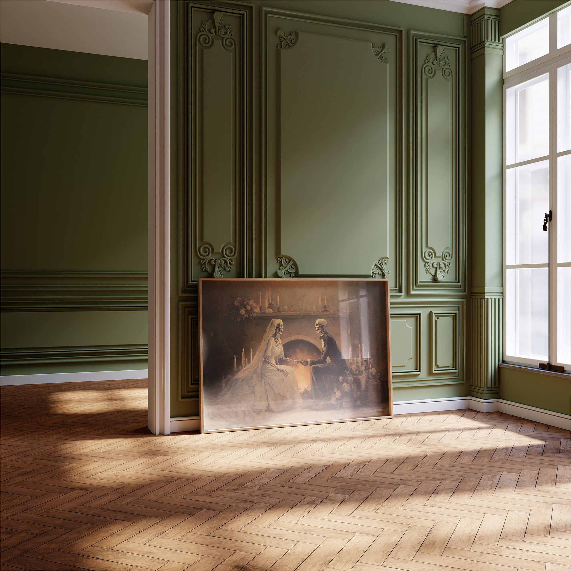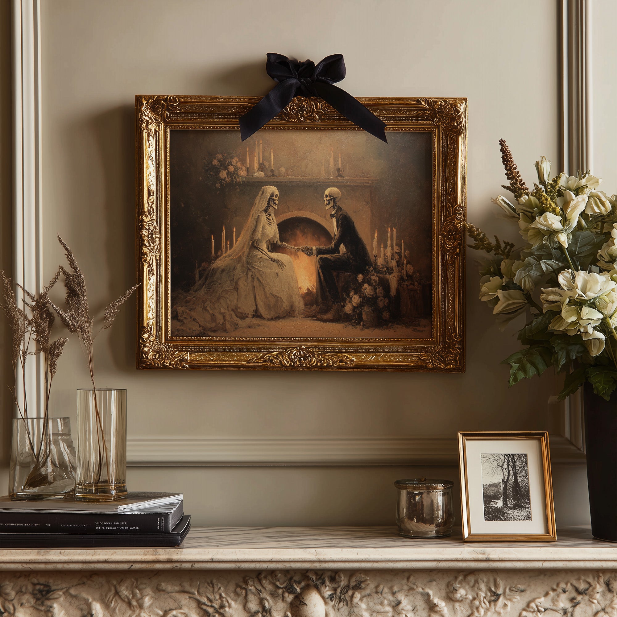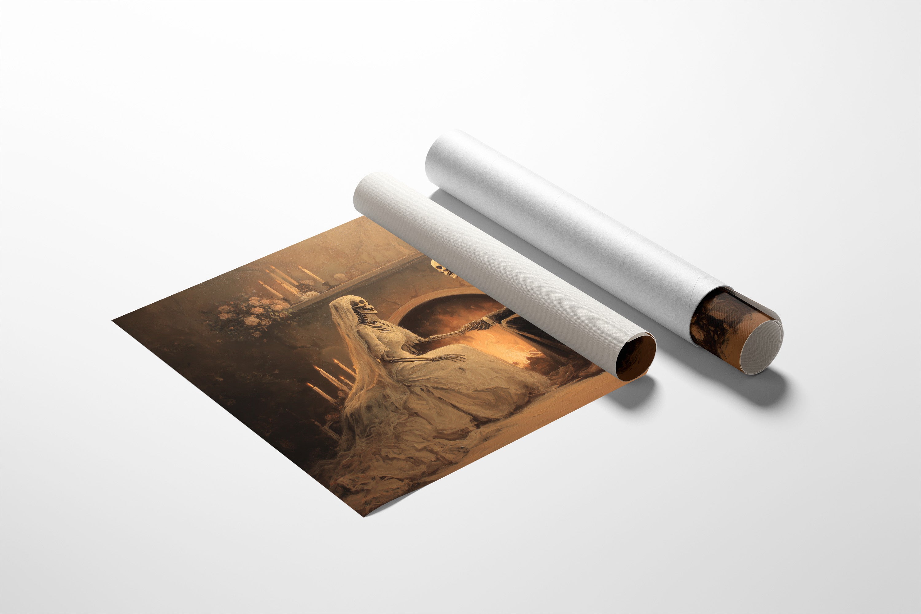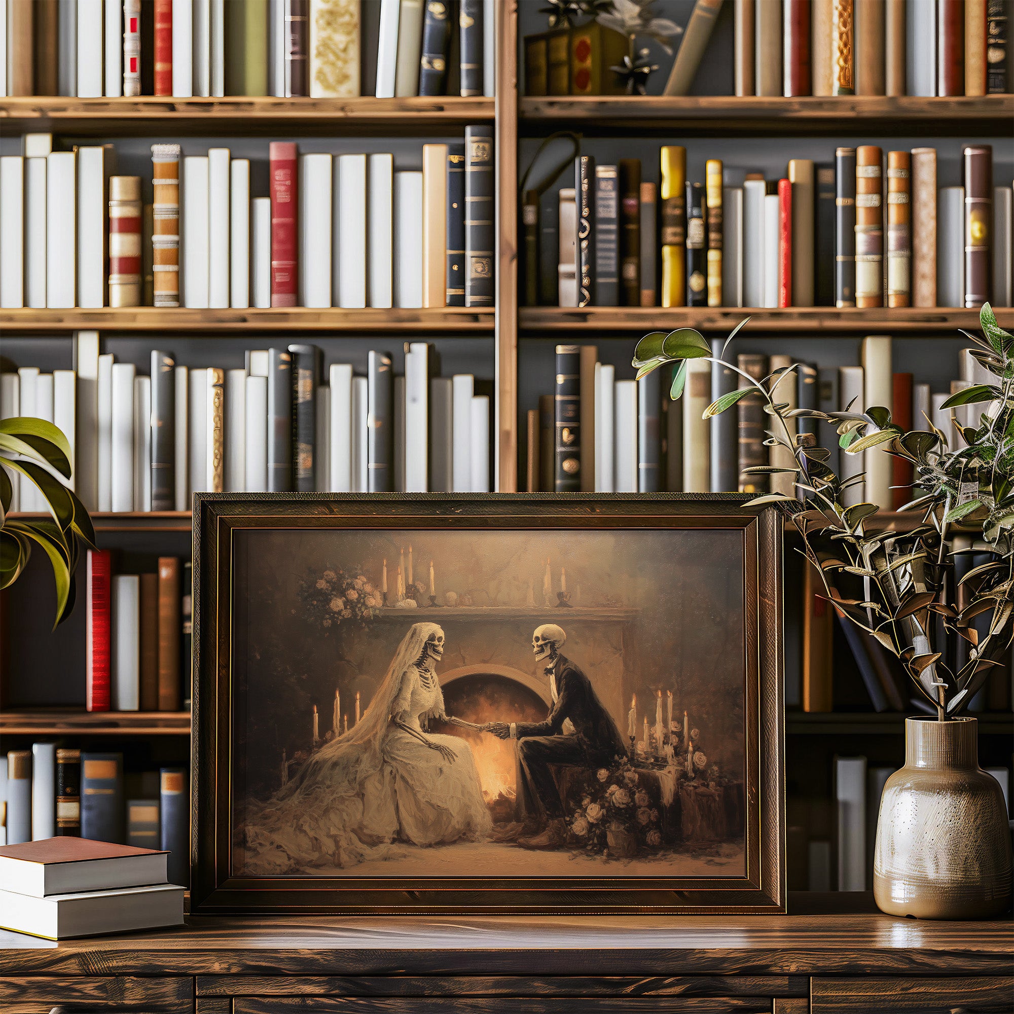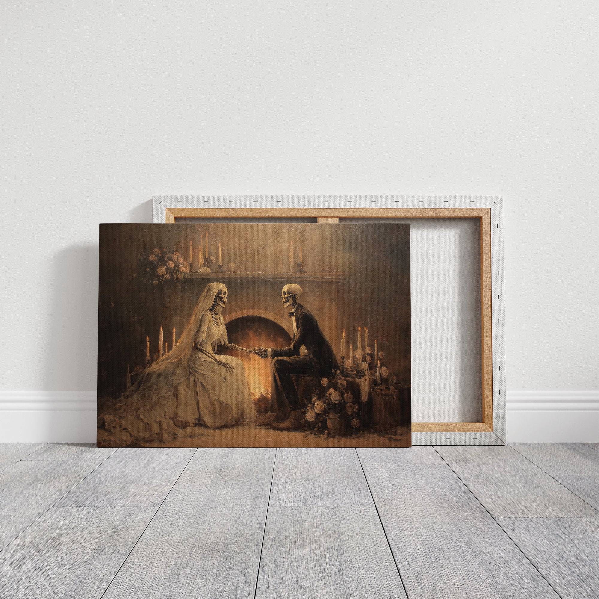 A haunting tableau of devotion that transcends mortality itself. The sepia-toned painting captures skeletal lovers in Victorian attire, joined in matrimonial communion before a warm hearth, surrounded by flickering candles and delicate roses. The juxtaposition of death's imagery against the intimate scene creates a poignant meditation on love's endurance beyond the grave, rendered in soft amber hues and shadowy depths. This conversation piece commands attention in a study, reading nook, or any space where contemplative art sparks philosophical discussion.