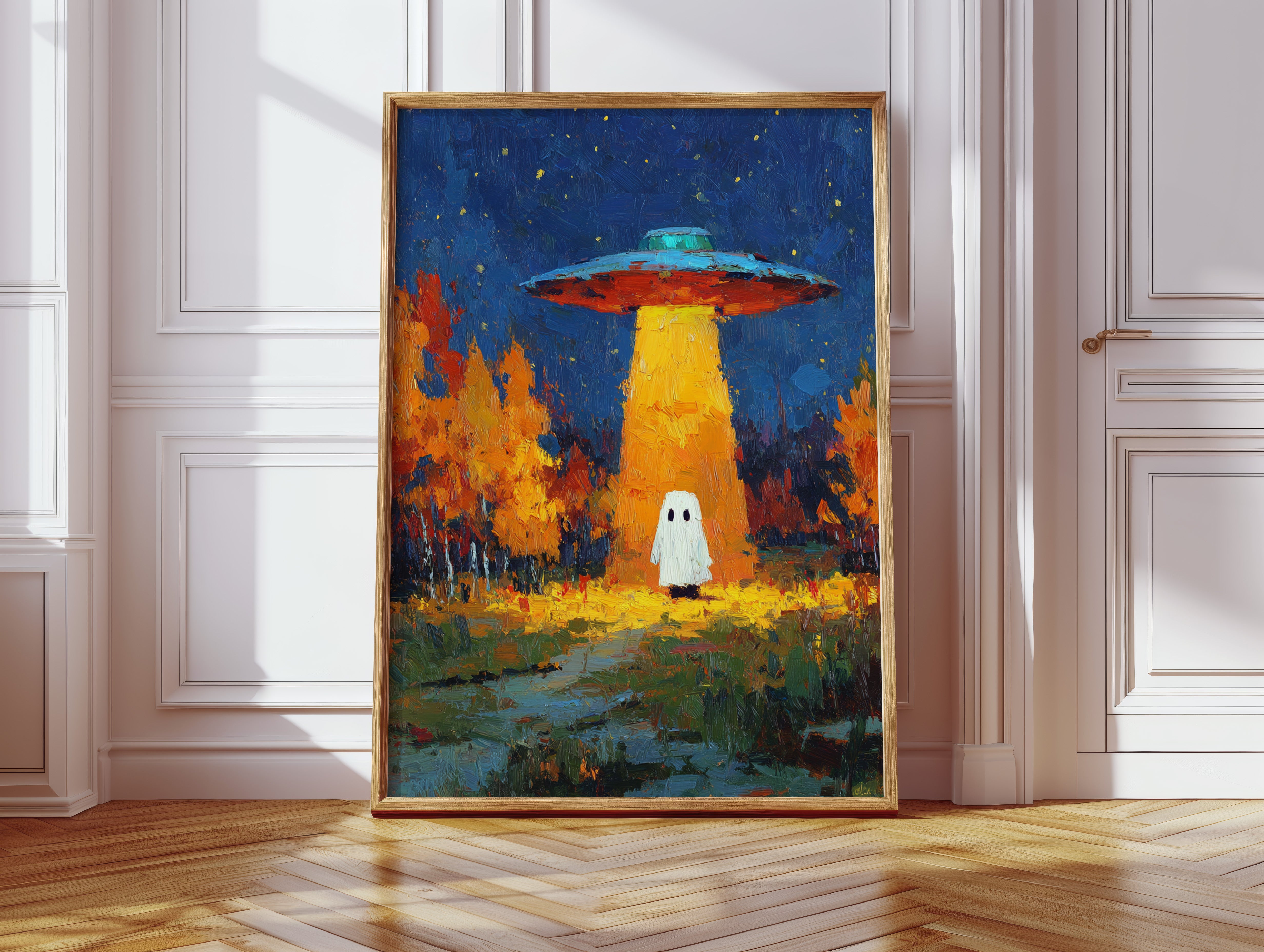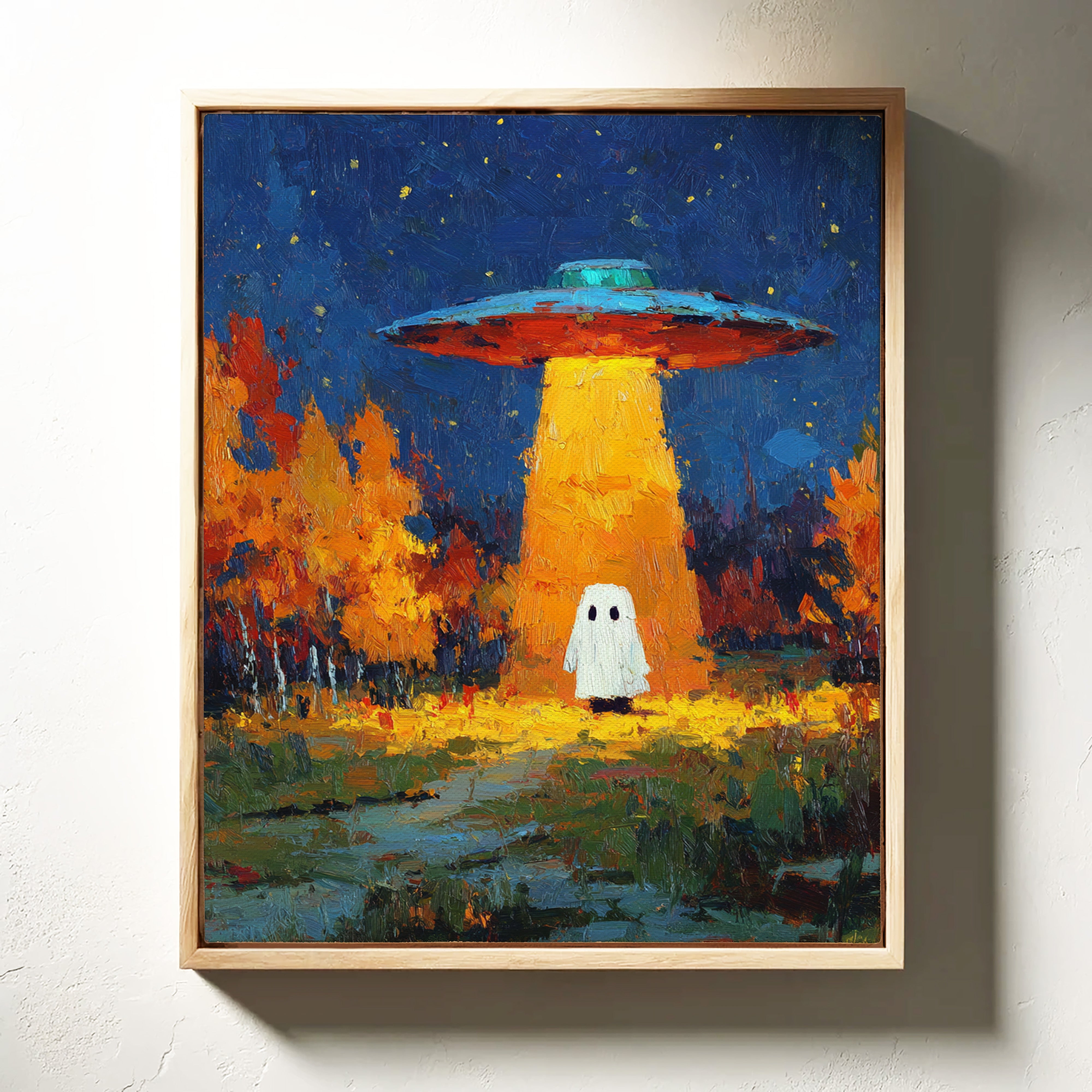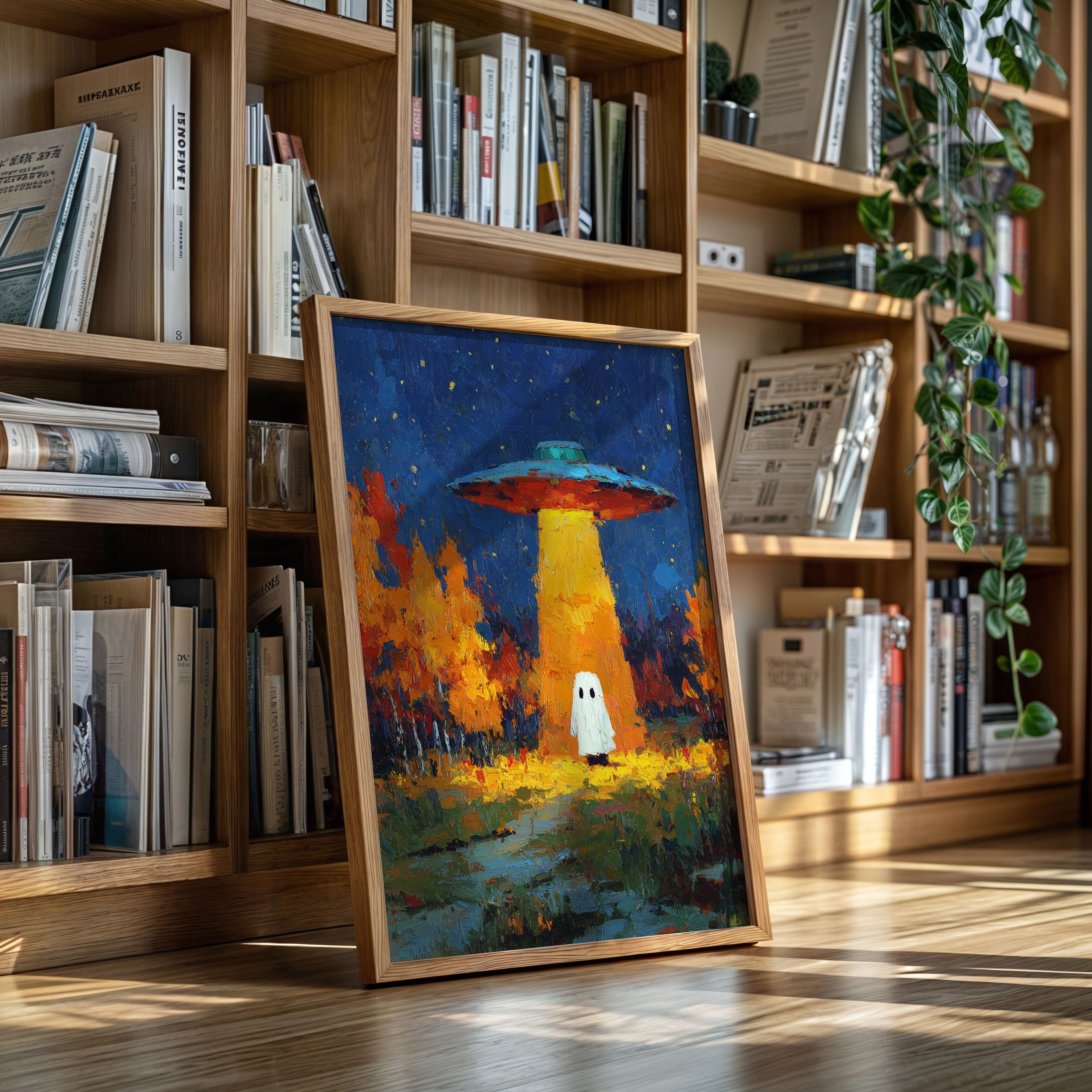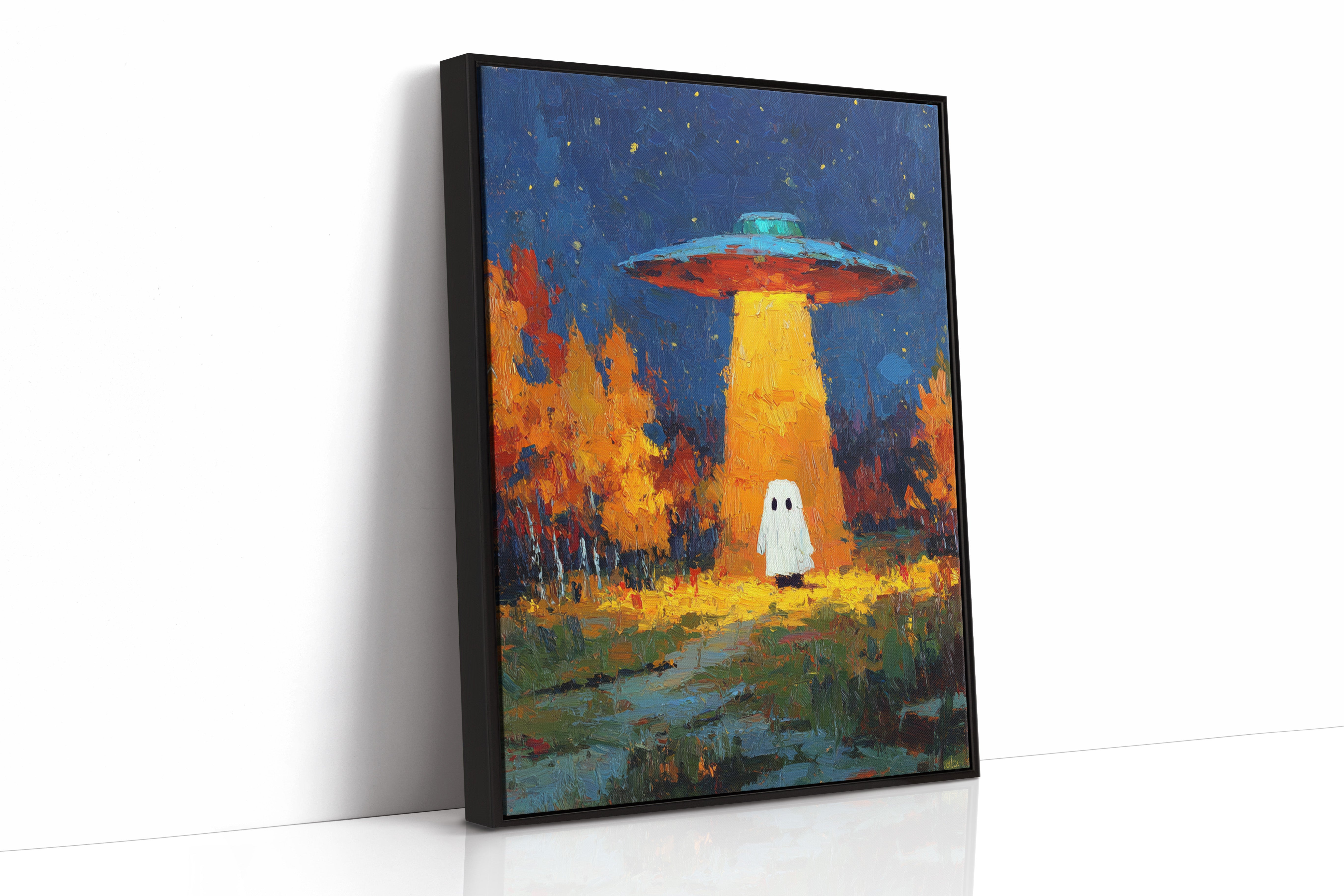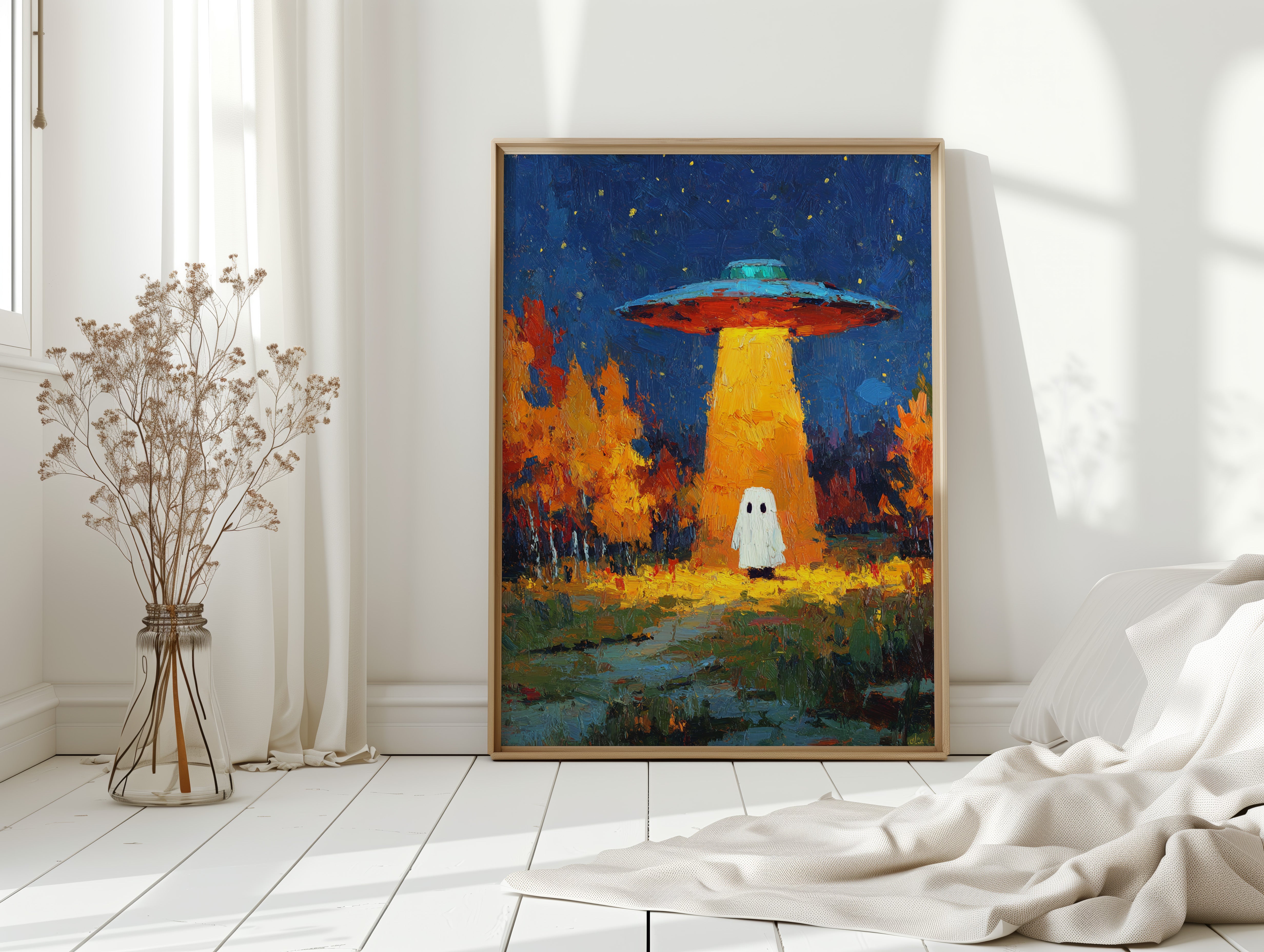 In a vibrant world where autumn leaves dance in the glow of an otherworldly light, a figure stands at the crossroads of wonder and fear. This piece captures the essence of contemporary surrealism, inviting viewers into a narrative of exploration and curiosity. The contrasting hues of orange and blue create a captivating atmosphere, while the whimsical presence prompts a reflection on the unknown. Perfect for a living room or creative space, this artwork encourages conversations about the mysteries that lie beyond our understanding.