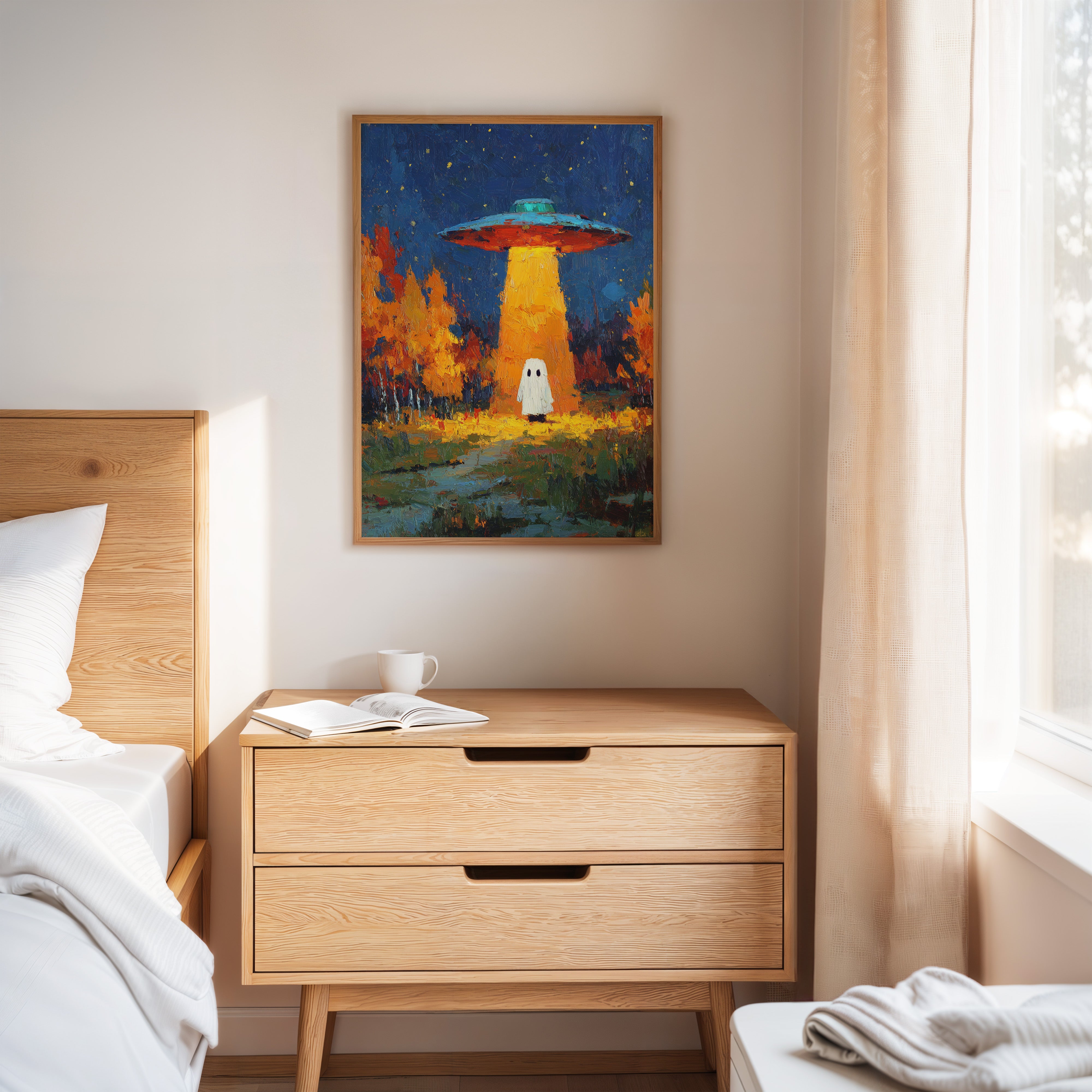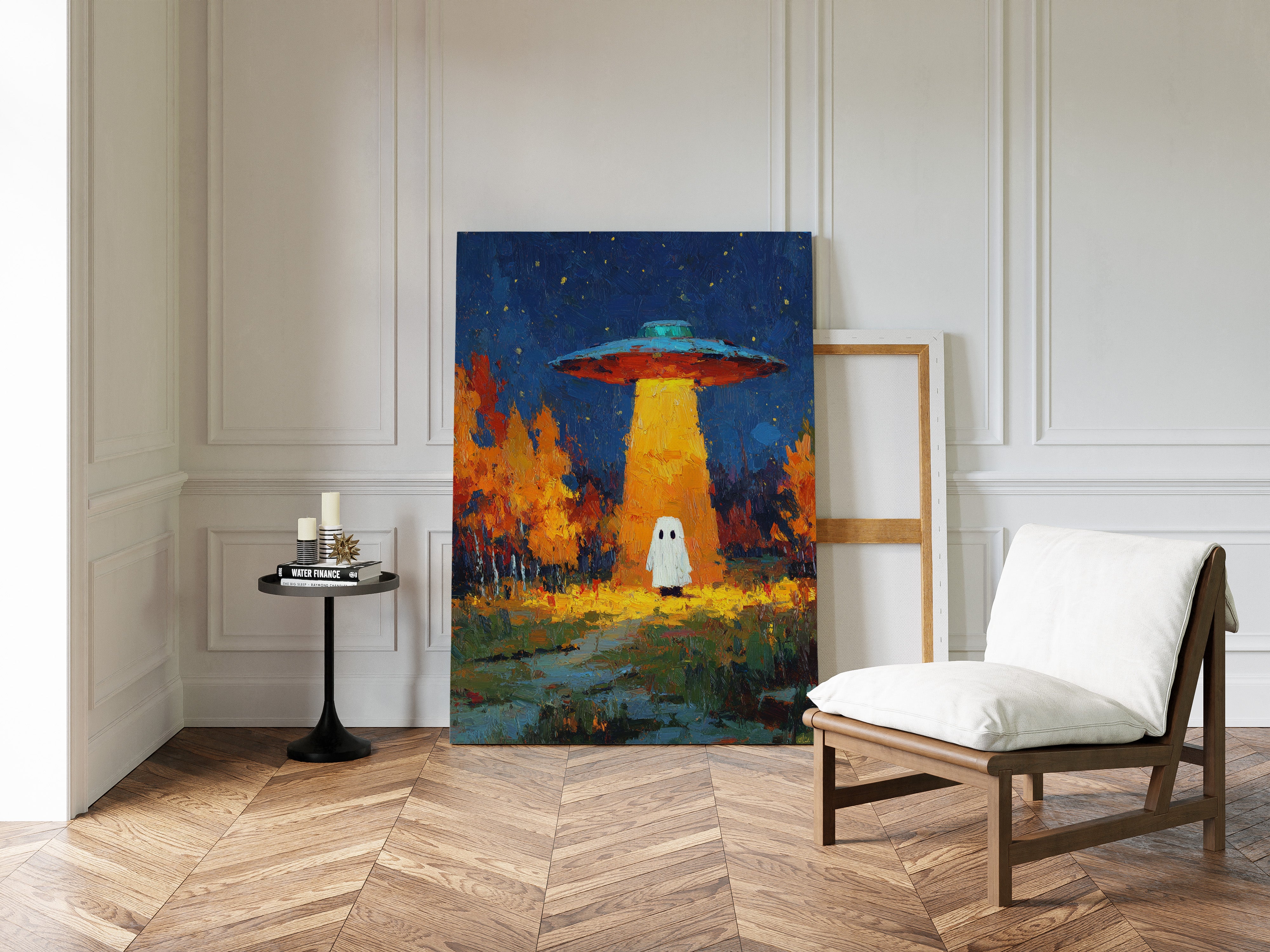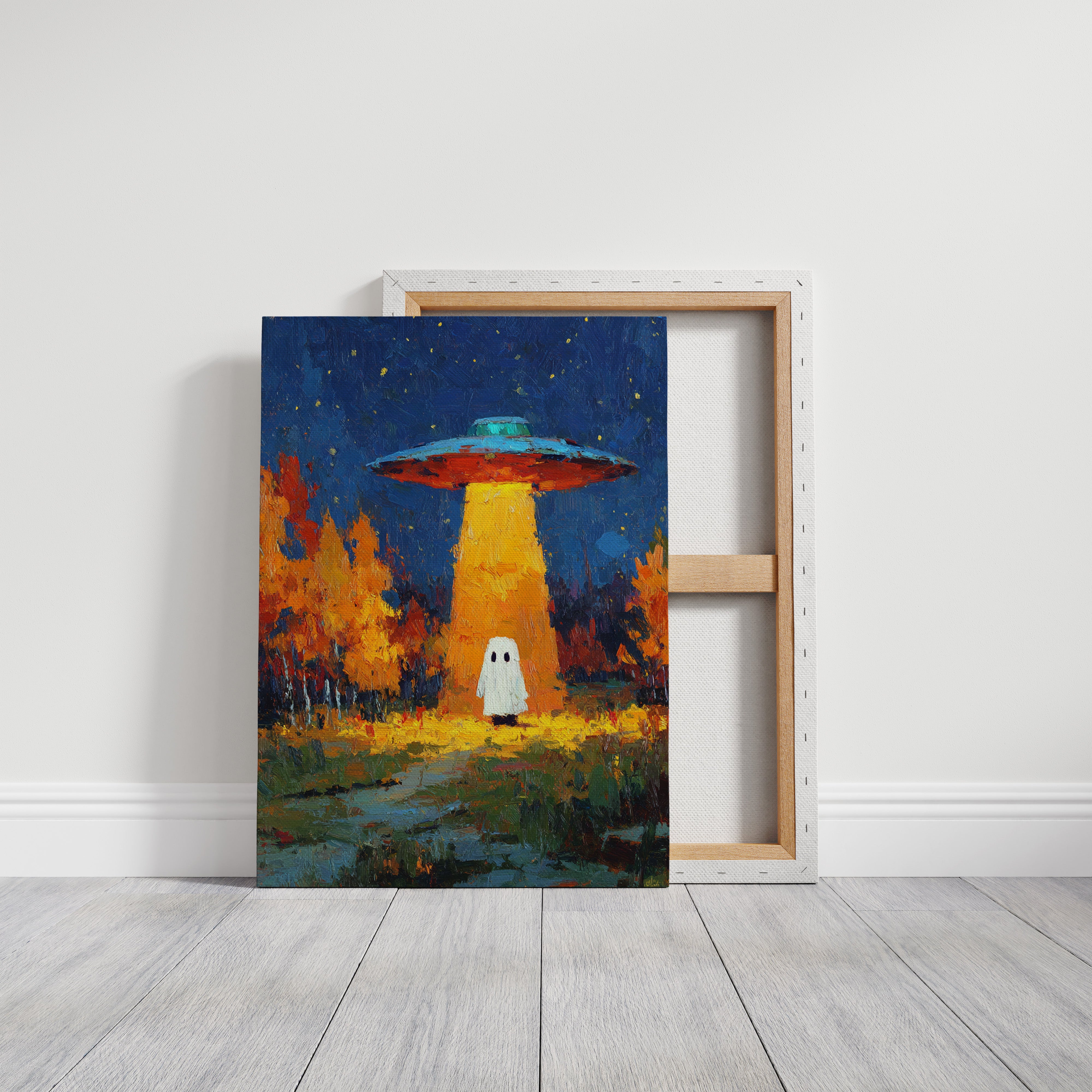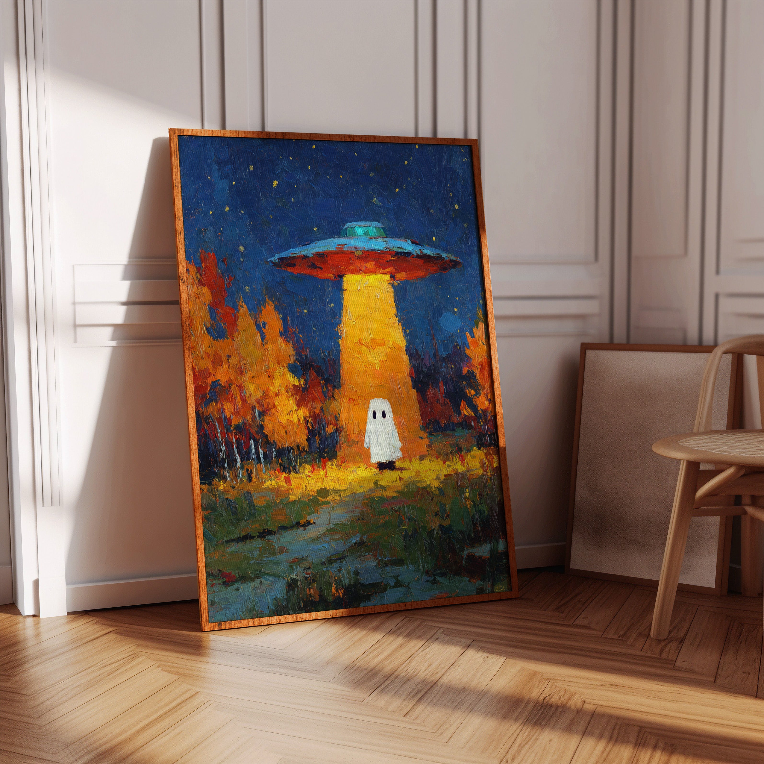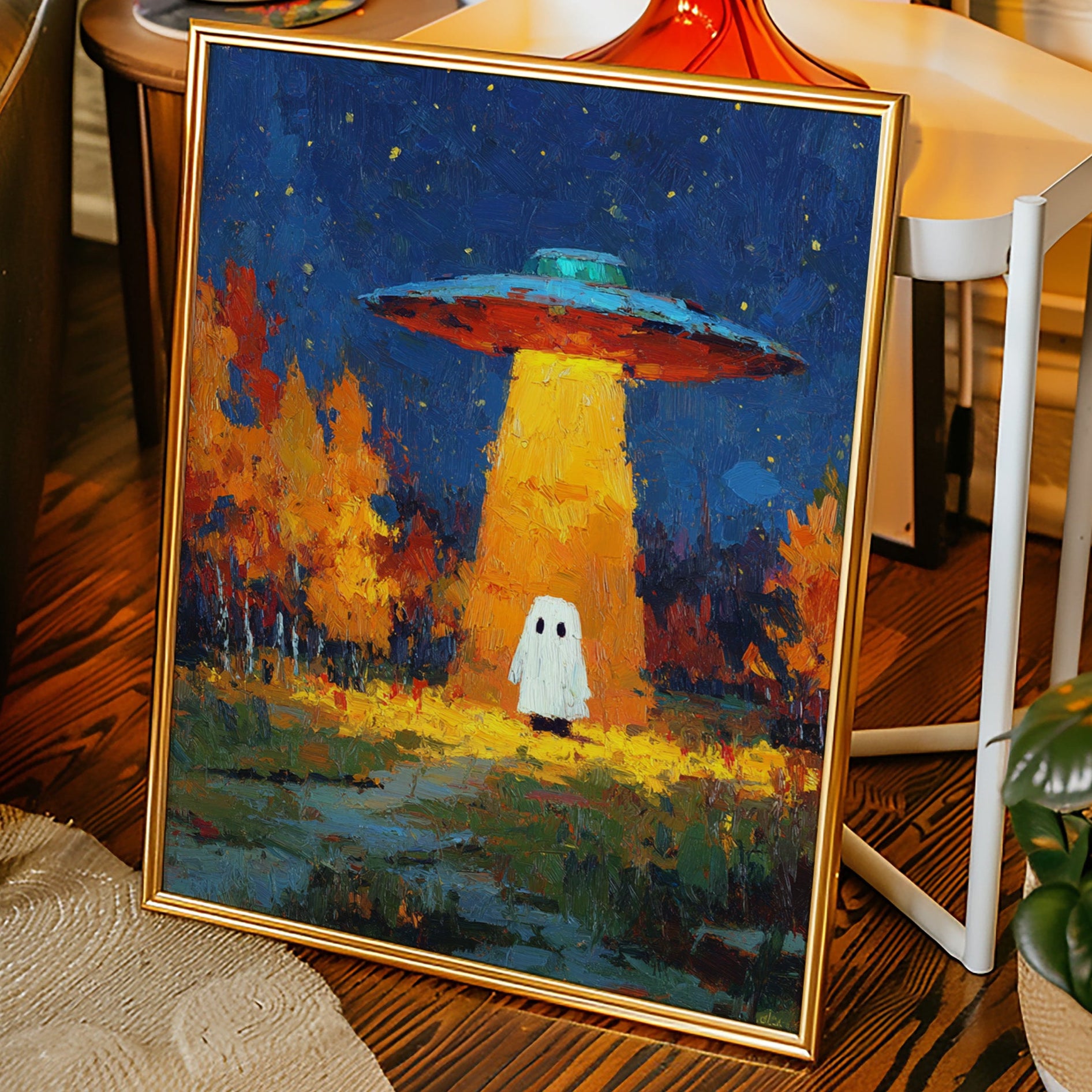 In a vibrant world where autumn leaves dance in the glow of an otherworldly light, a figure stands at the crossroads of wonder and fear. This piece captures the essence of contemporary surrealism, inviting viewers into a narrative of exploration and curiosity. The contrasting hues of orange and blue create a captivating atmosphere, while the whimsical presence prompts a reflection on the unknown. Perfect for a living room or creative space, this artwork encourages conversations about the mysteries that lie beyond our understanding.