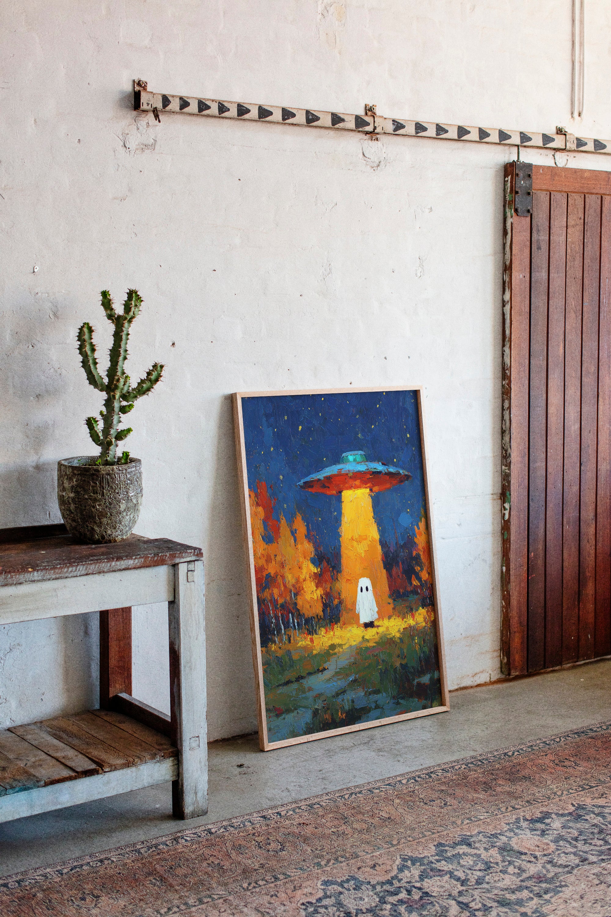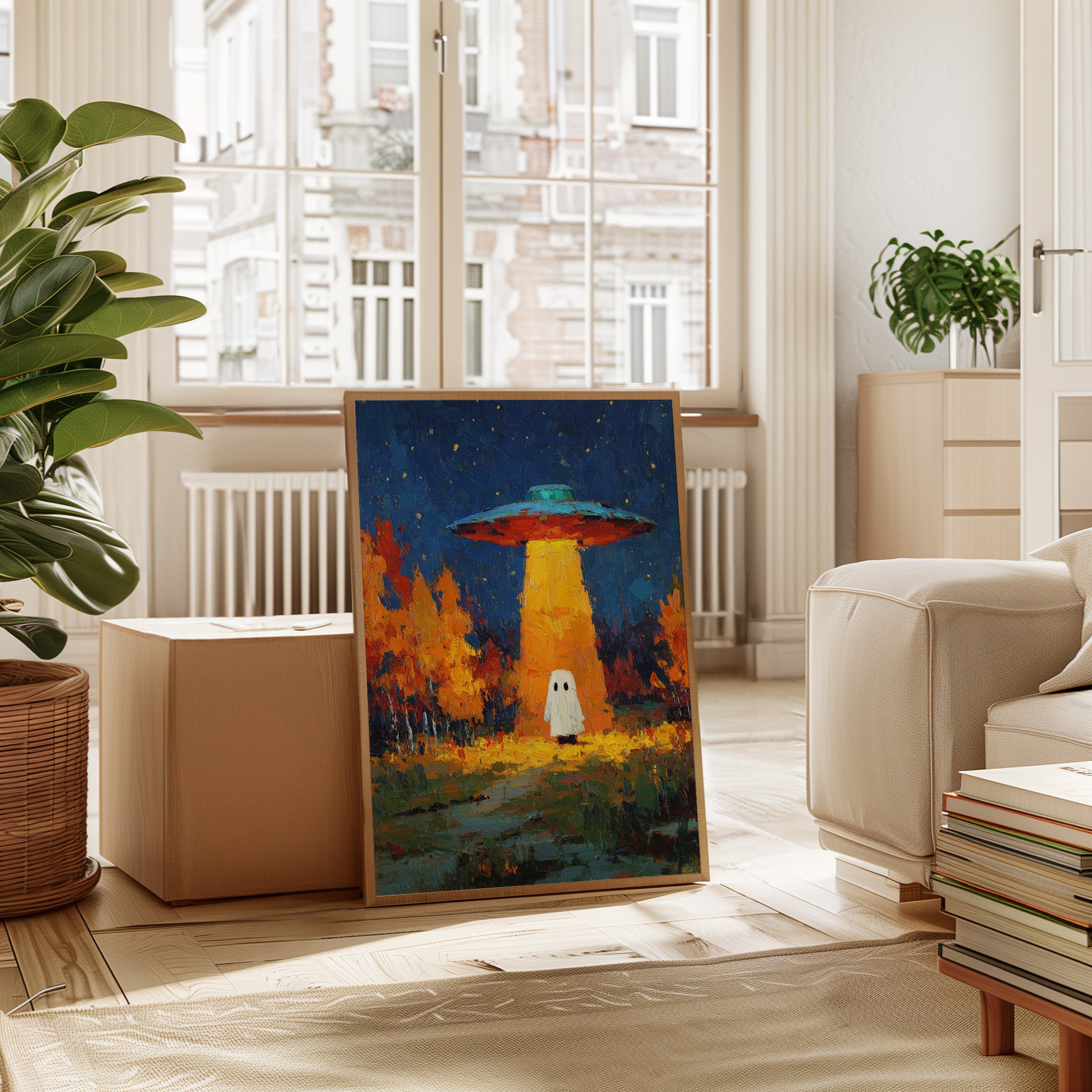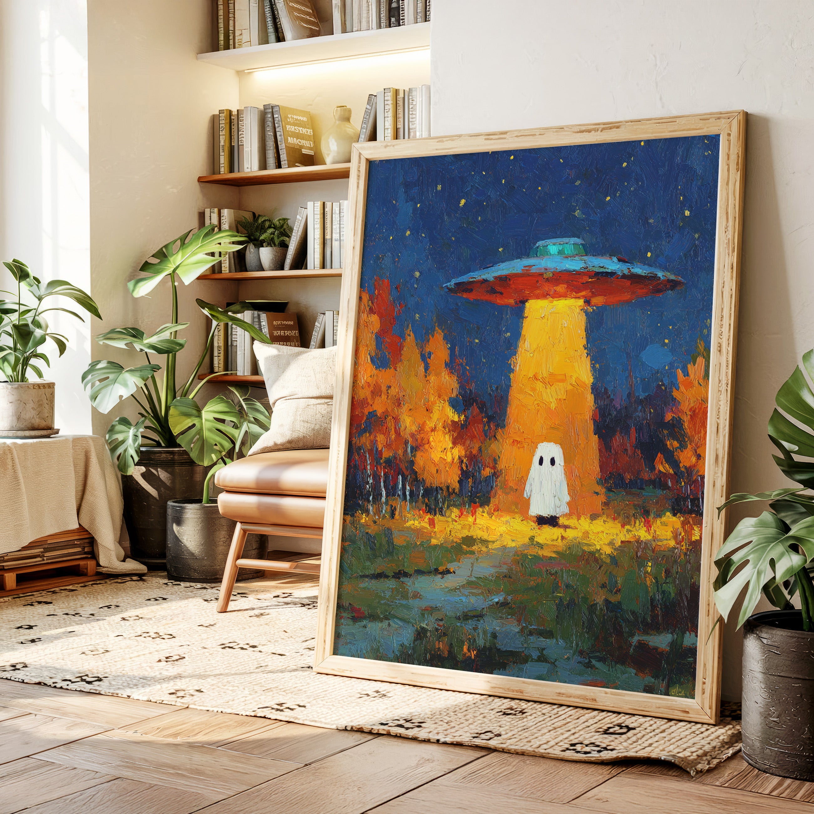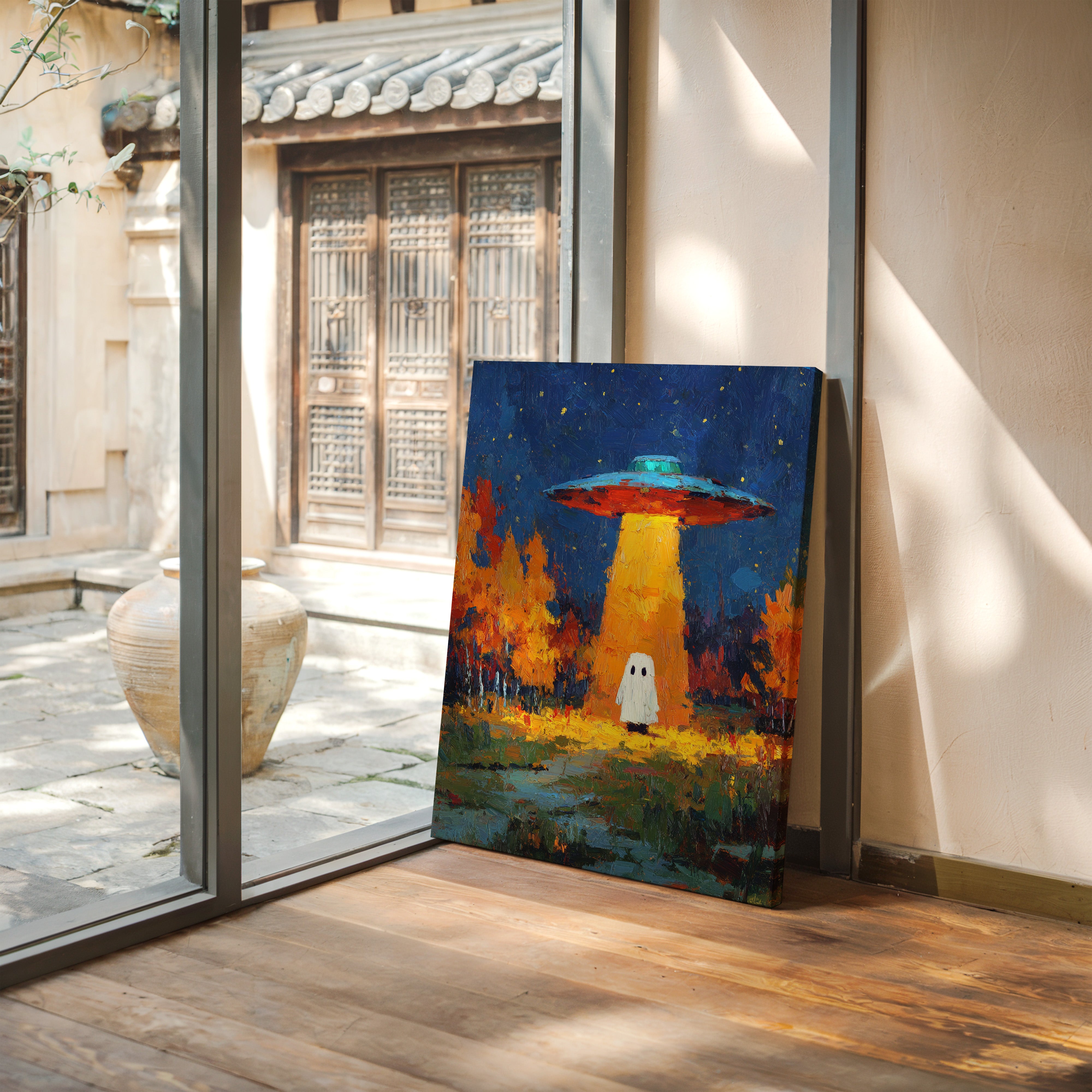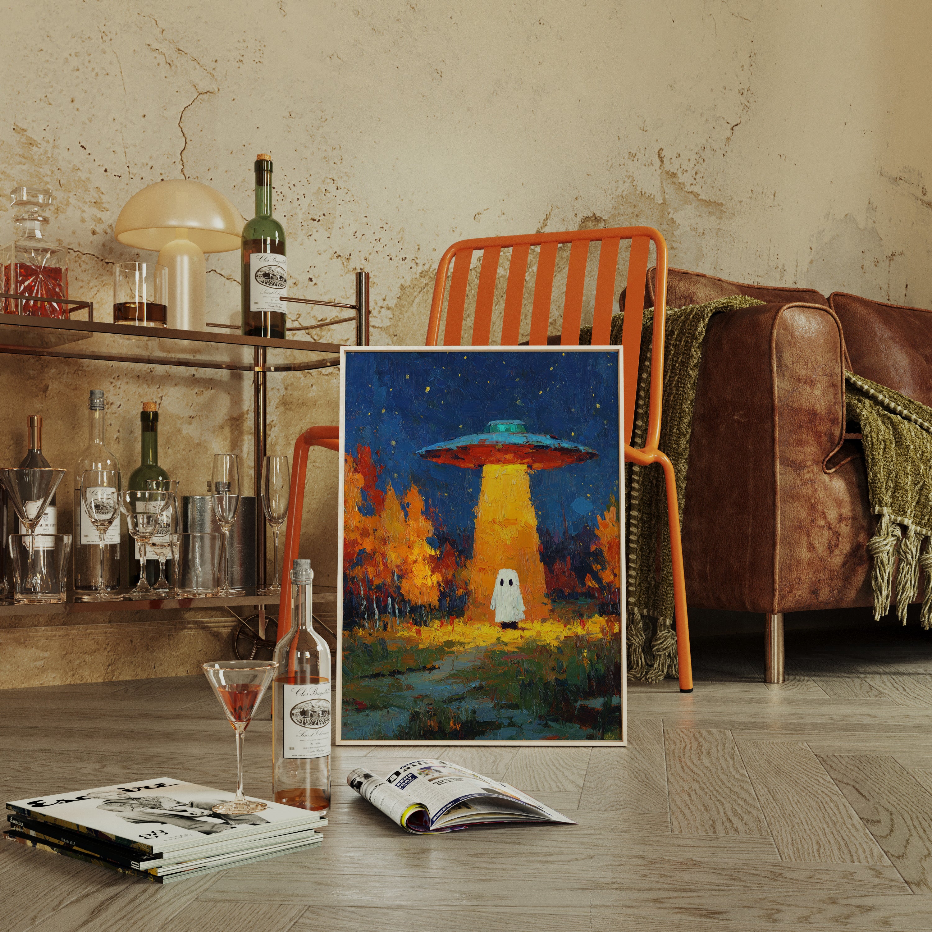 In a vibrant world where autumn leaves dance in the glow of an otherworldly light, a figure stands at the crossroads of wonder and fear. This piece captures the essence of contemporary surrealism, inviting viewers into a narrative of exploration and curiosity. The contrasting hues of orange and blue create a captivating atmosphere, while the whimsical presence prompts a reflection on the unknown. Perfect for a living room or creative space, this artwork encourages conversations about the mysteries that lie beyond our understanding.