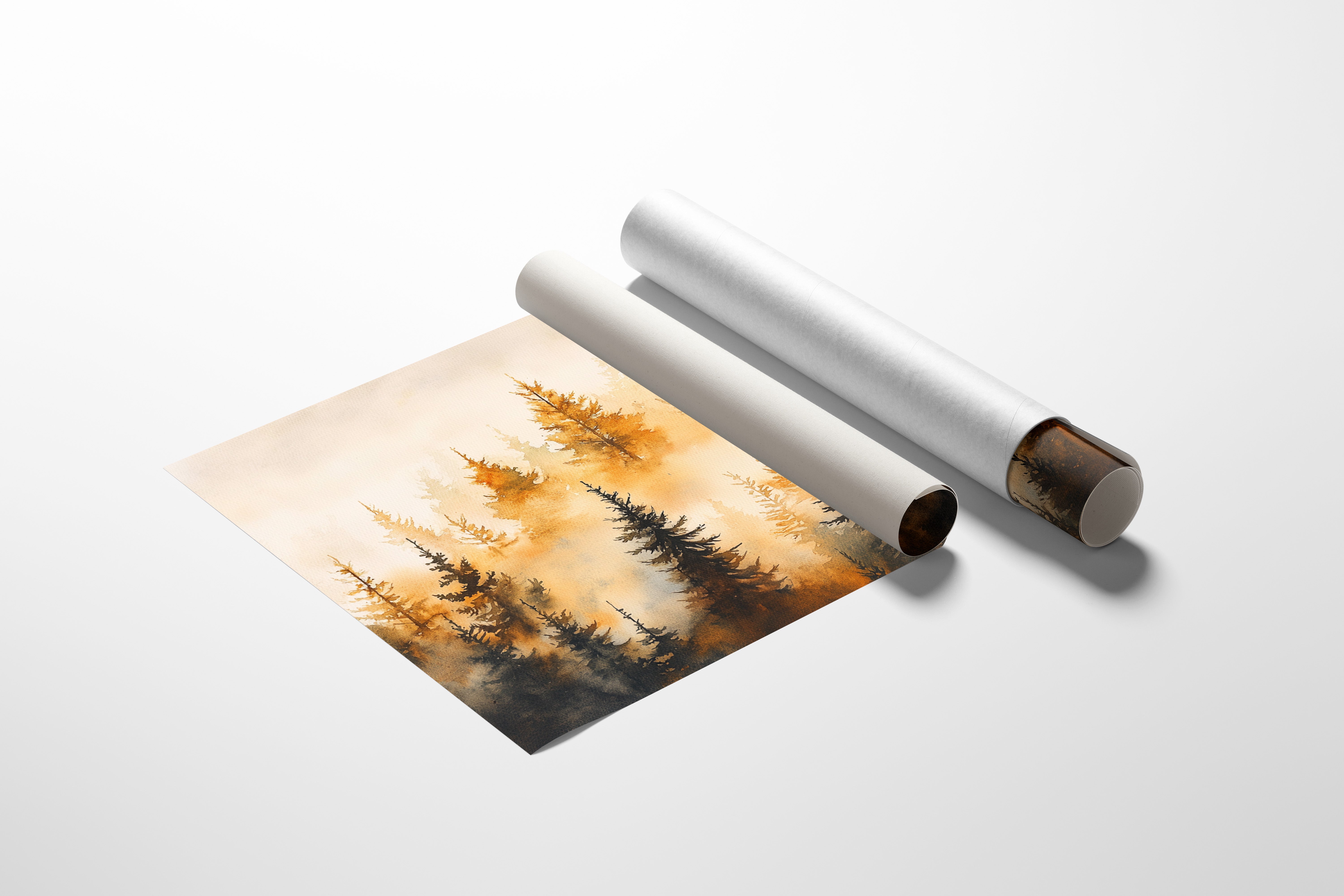 Morning mist swirls through towering evergreens, painting the forest in ethereal amber tones. Delicate watercolor strokes capture the interplay of light and shadow, as sunbeams filter through the dense canopy of pine needles. The composition flows from deep forest greens to luminous honey-gold hues, creating a dreamlike atmosphere where each tree stands as both sentinel and dancer in nature's ballet.