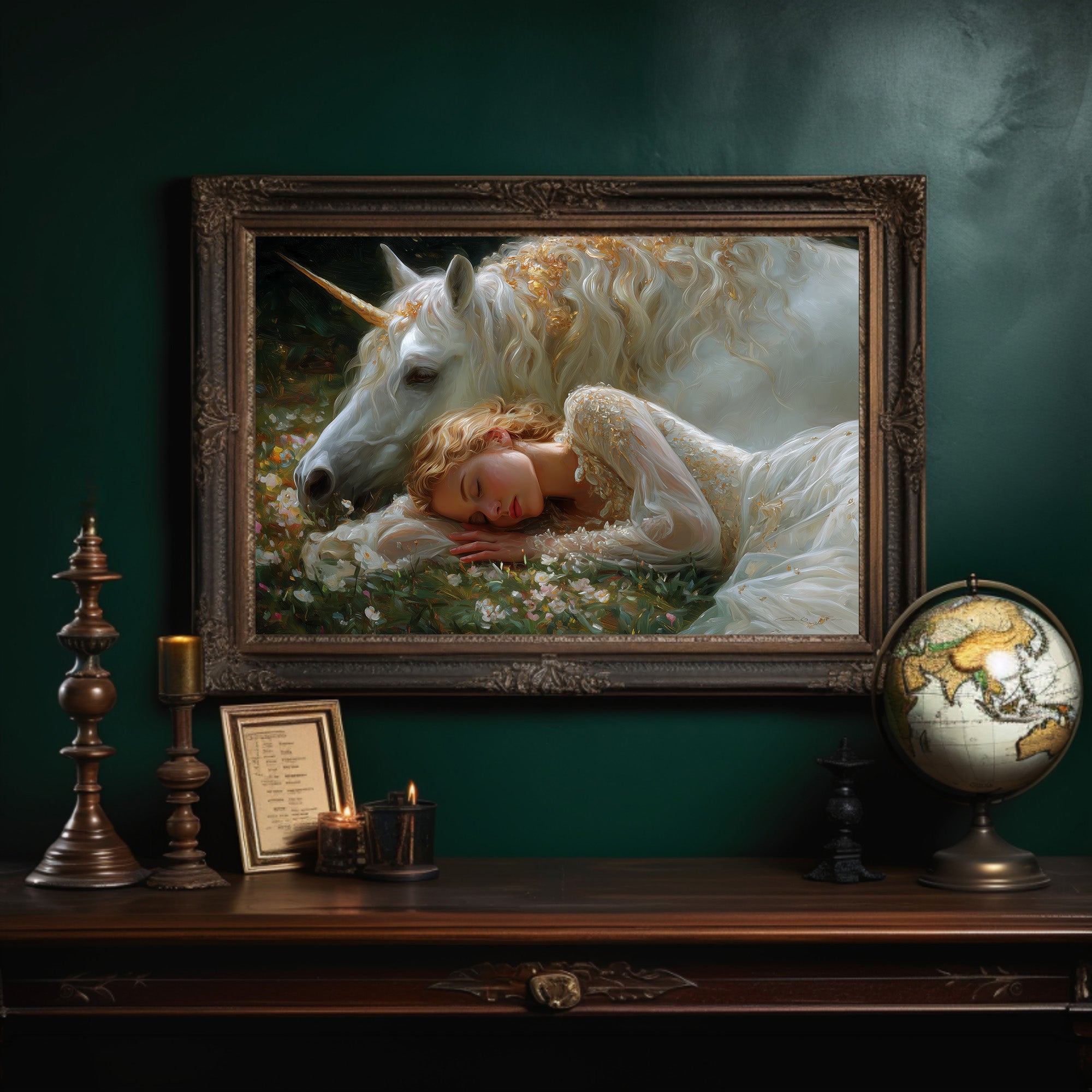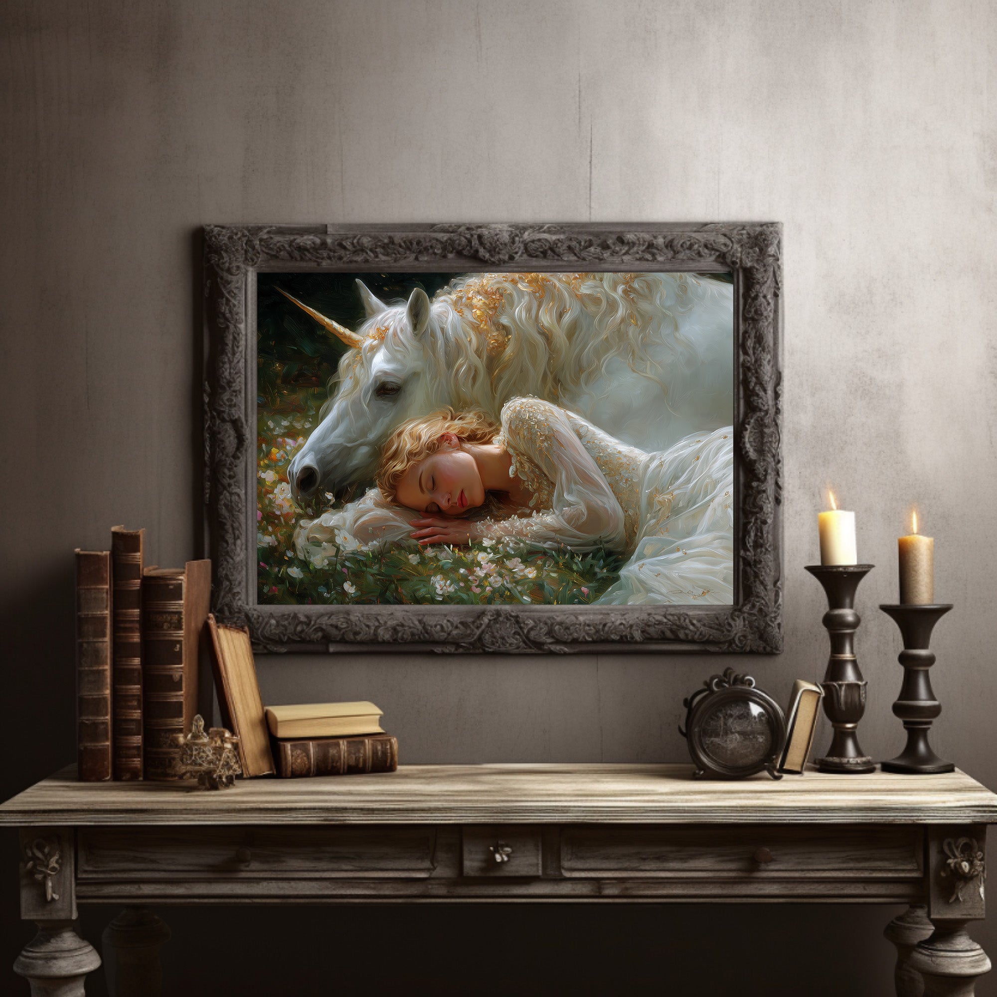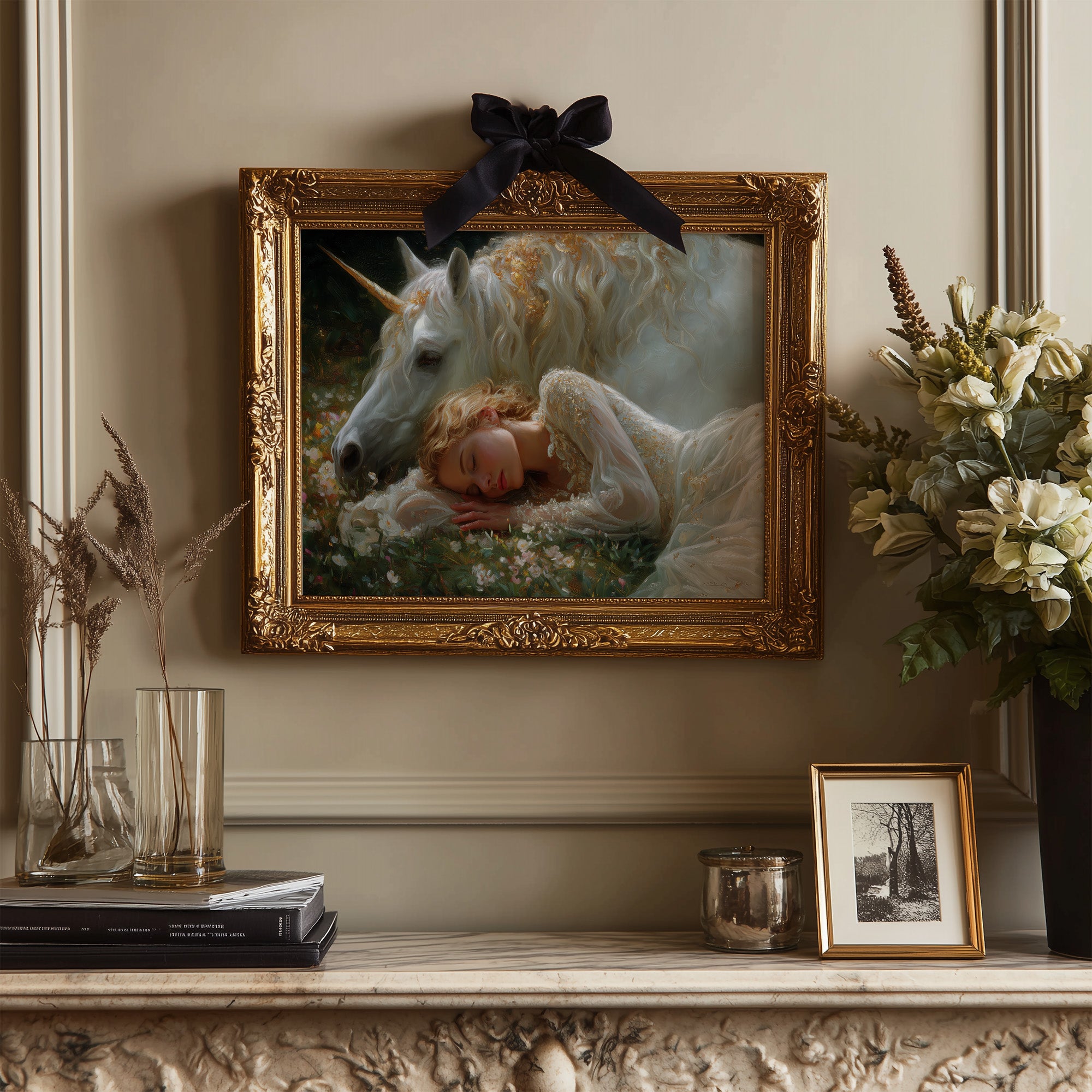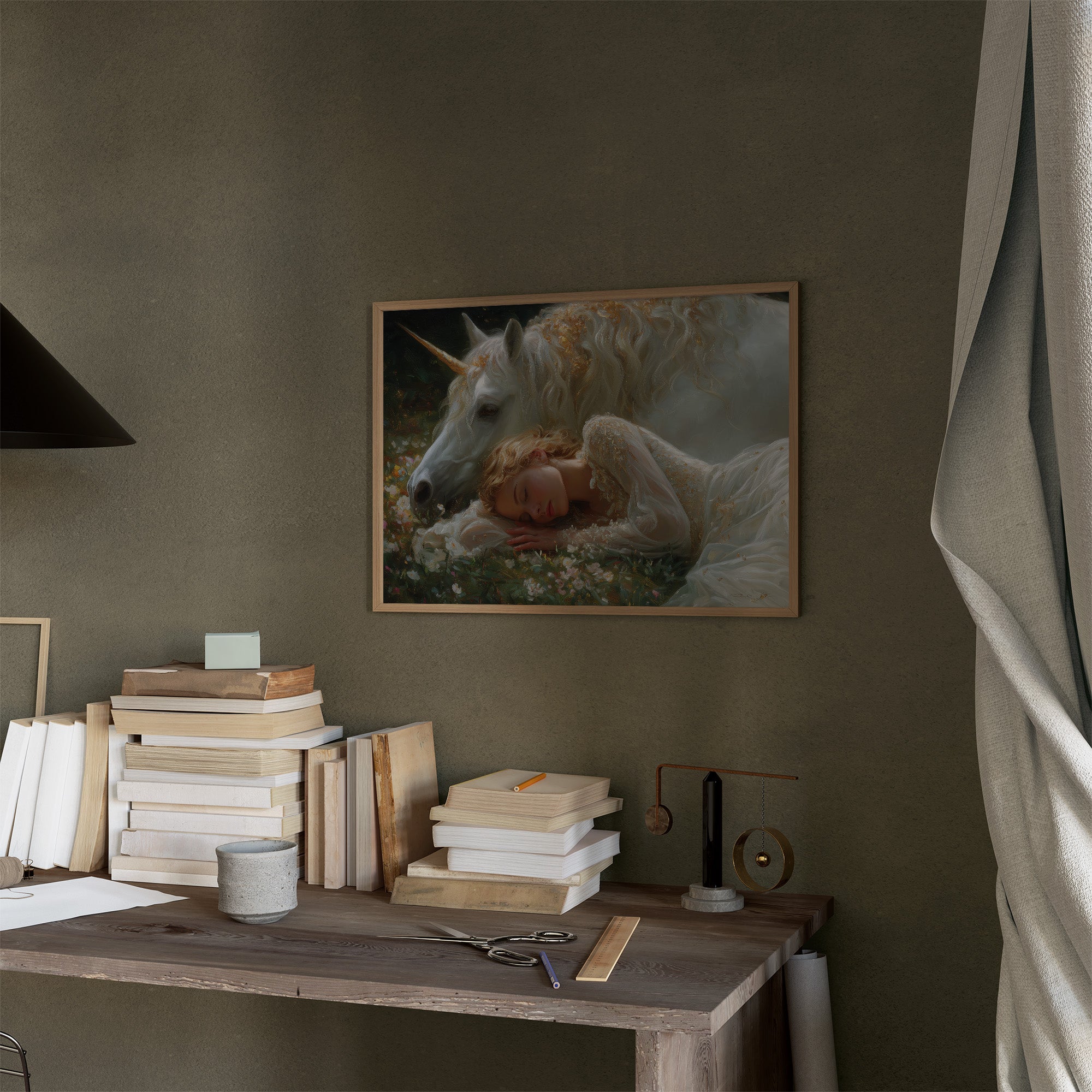 Sunlight filters through a scholarly sanctuary, illuminating a framed fantasy nestled among literary companions. The ethereal painting of a unicorn and sleeping figure rests against wooden shelves filled with countless spines in cream, burgundy, and navy. Delicate houseplants frame the composition, their green leaves adding life to this contemplative corner where mythology meets literature. This piece brings sophisticated whimsy to a home office, reading nook, or any space where imagination and intellect converge.