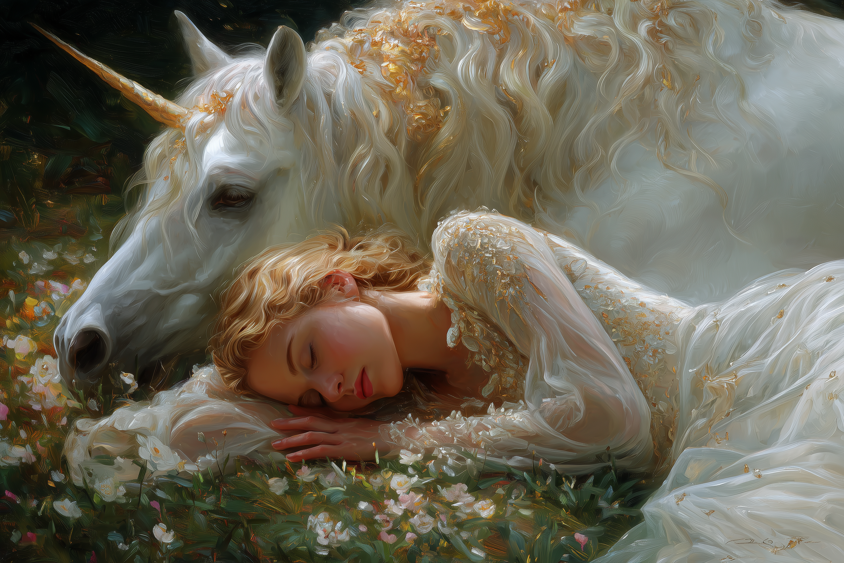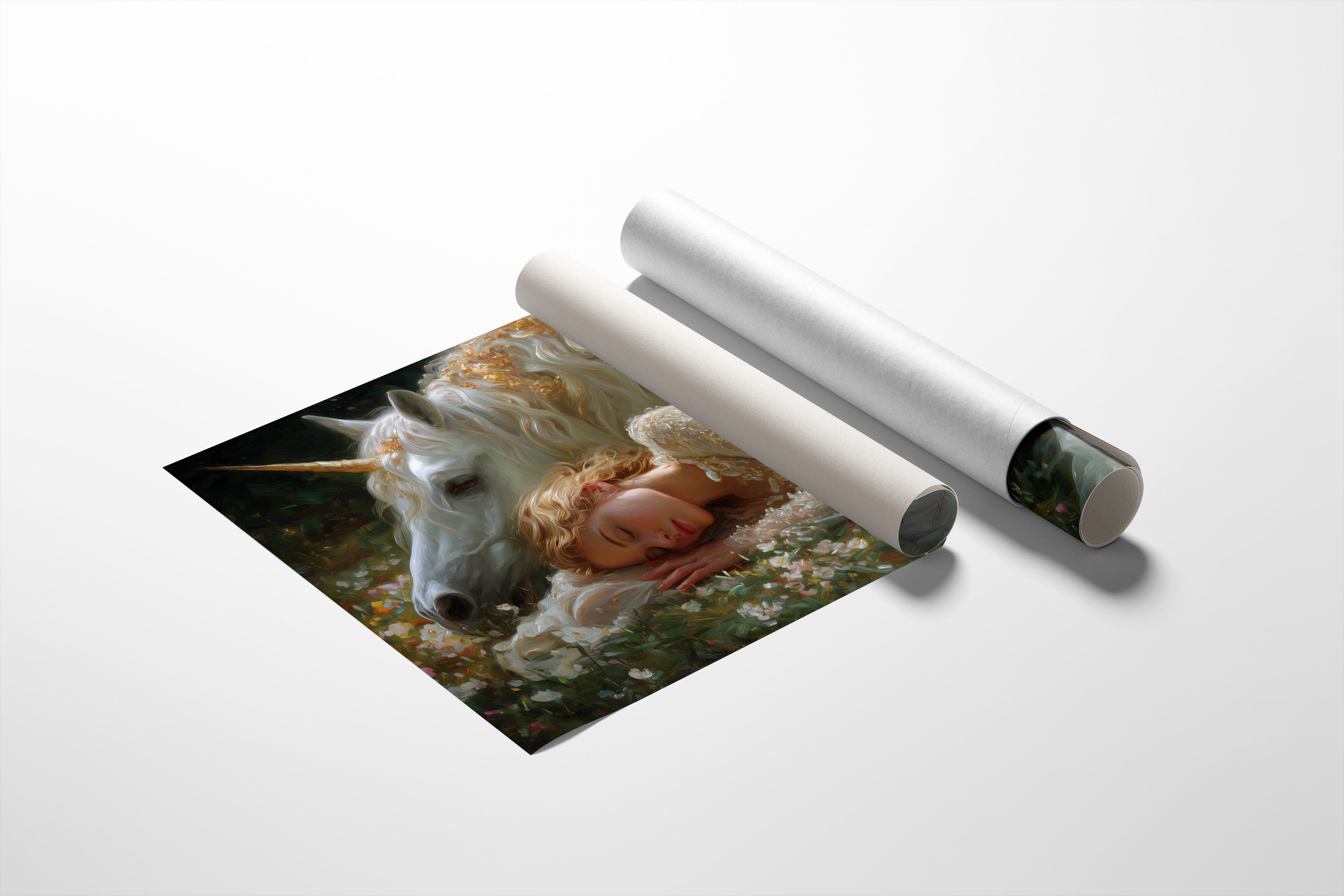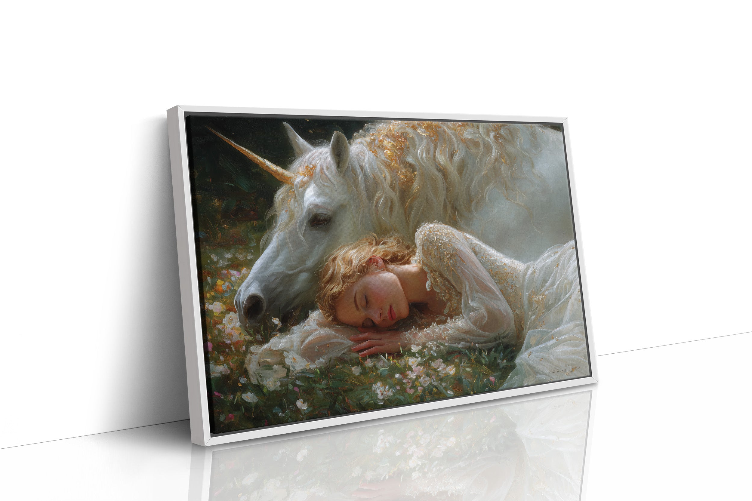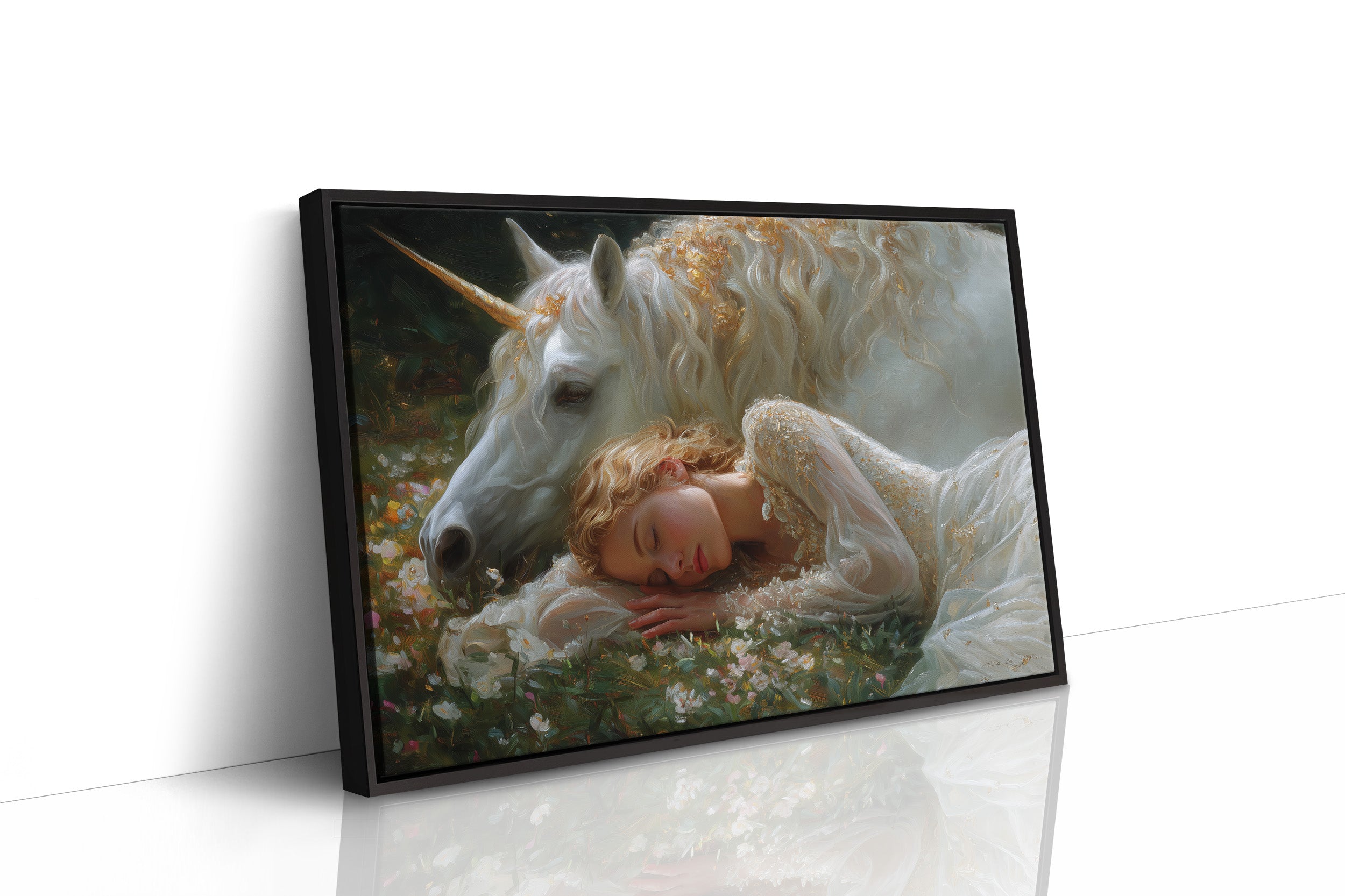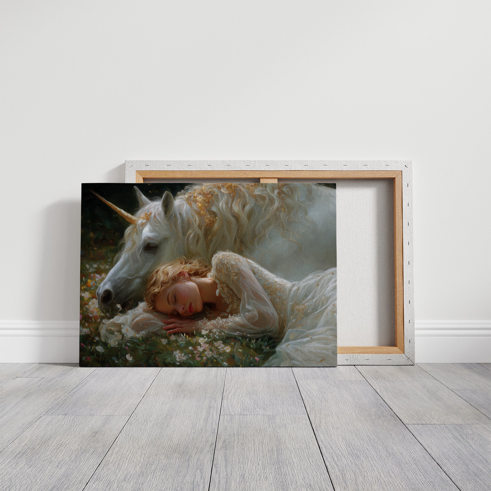 Sunlight filters through a scholarly sanctuary, illuminating a framed fantasy nestled among literary companions. The ethereal painting of a unicorn and sleeping figure rests against wooden shelves filled with countless spines in cream, burgundy, and navy. Delicate houseplants frame the composition, their green leaves adding life to this contemplative corner where mythology meets literature. This piece brings sophisticated whimsy to a home office, reading nook, or any space where imagination and intellect converge.