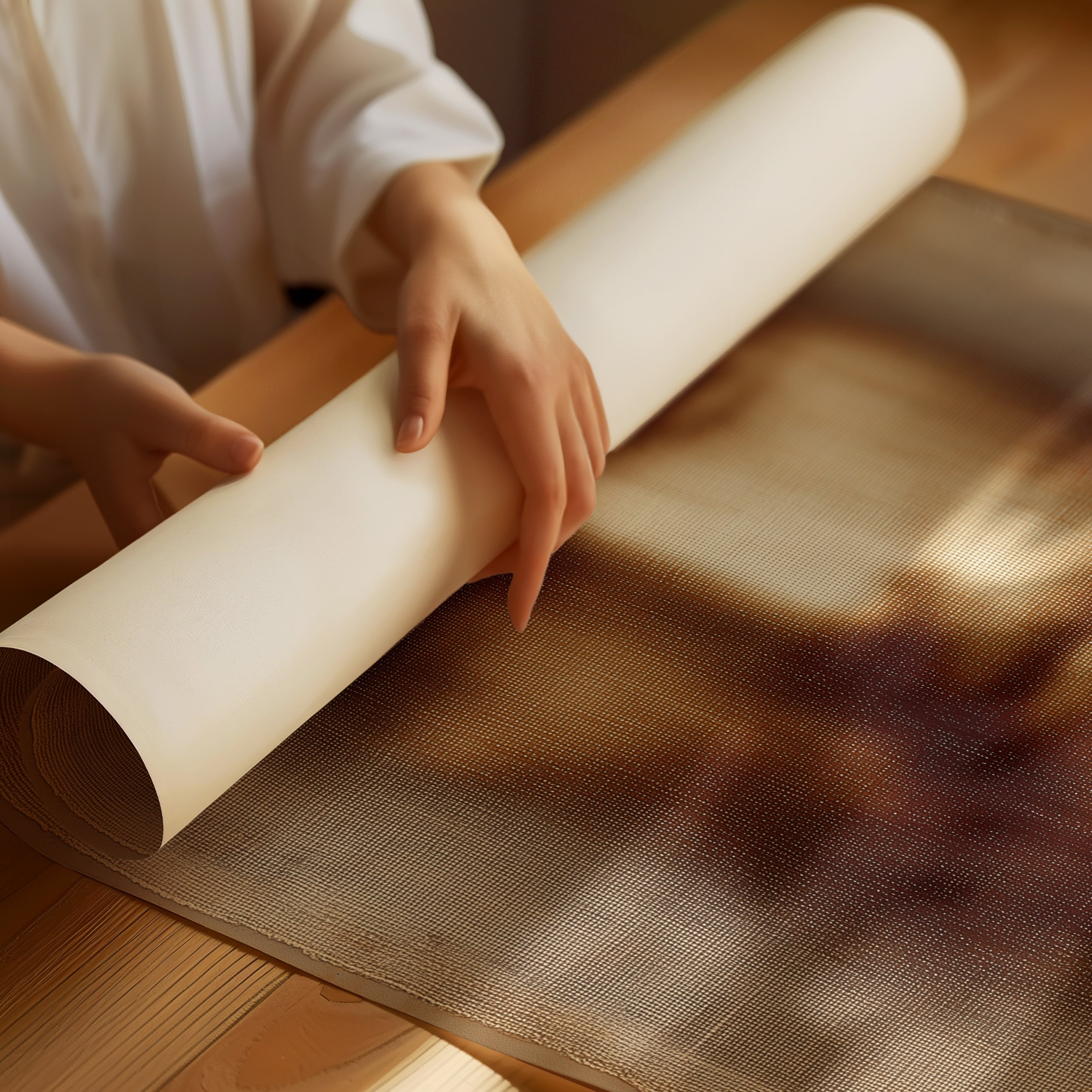 Morning light spills across weathered planks, illuminating an ethereal image printed on textured fabric. Sepia tones blend with cream and umber, creating a mysterious depth against the natural grain of the wooden table. A small cup of coffee and delicate greenery frame the scene, adding warmth to the contemplative moment captured in this tranquil corner.