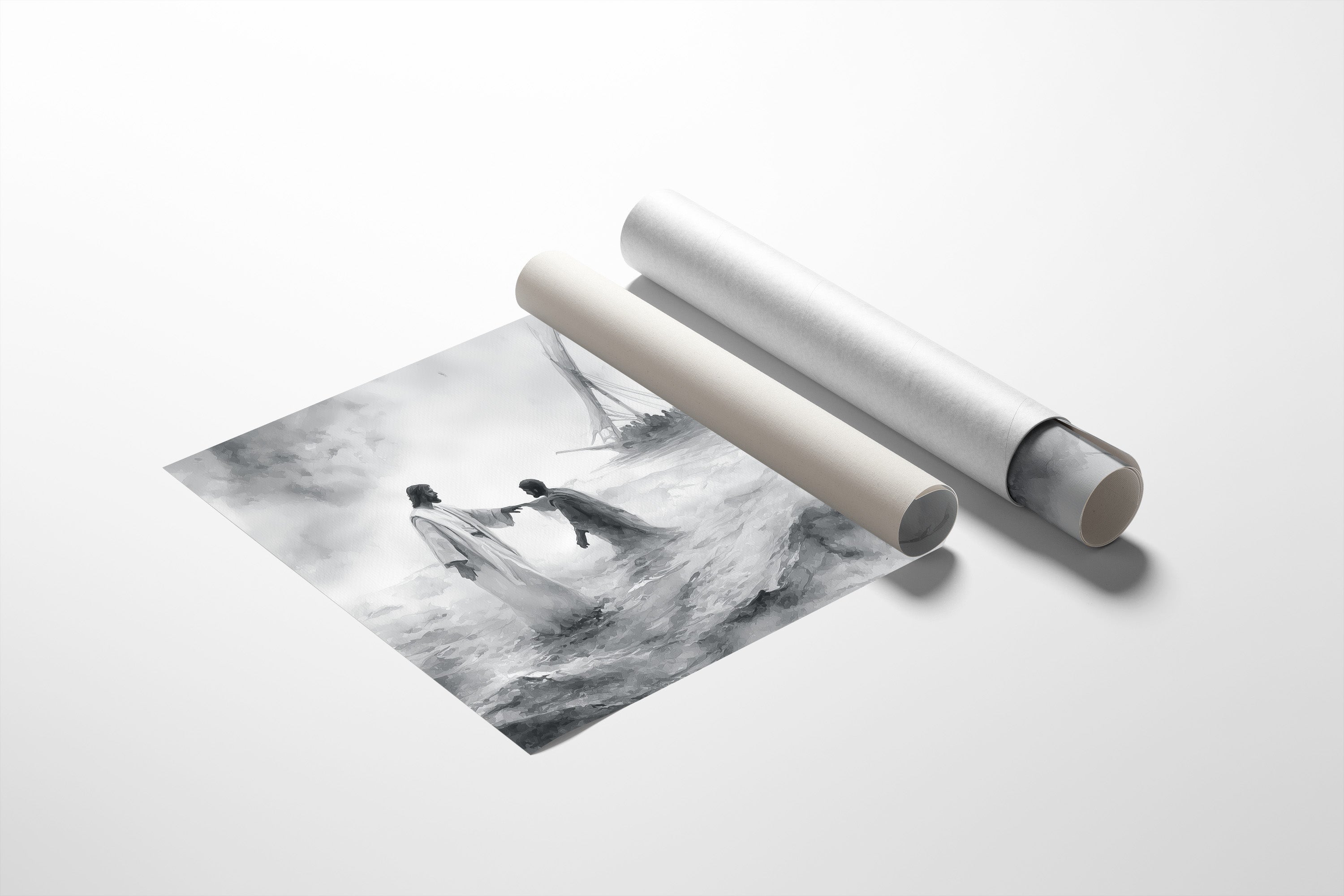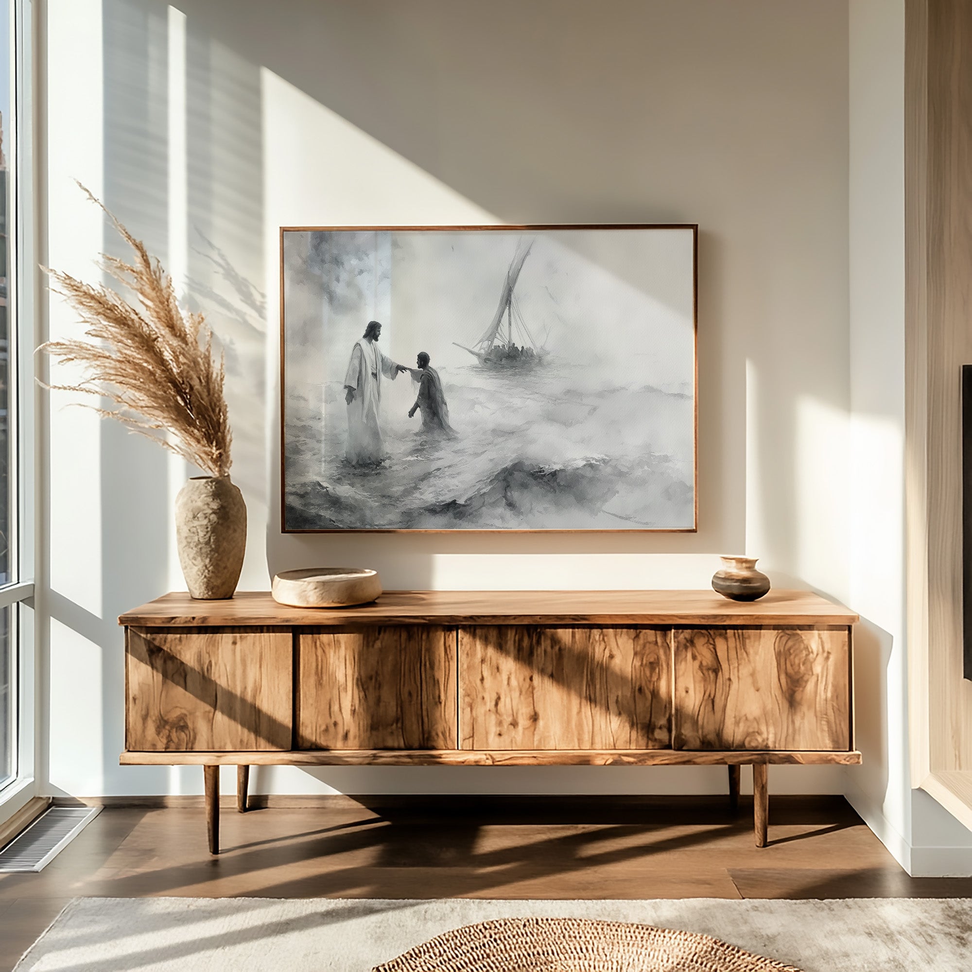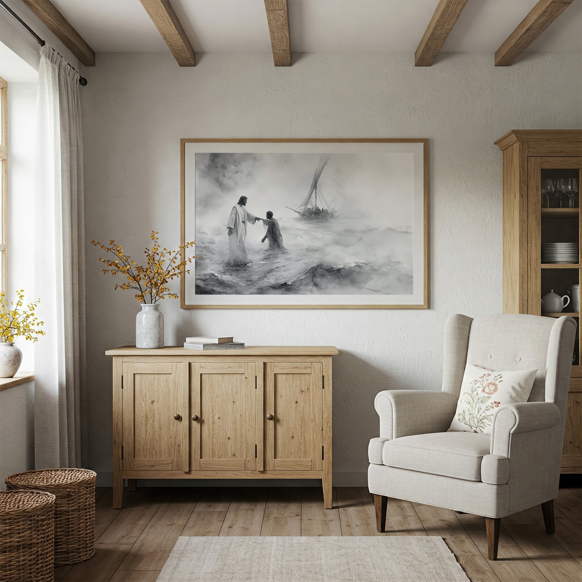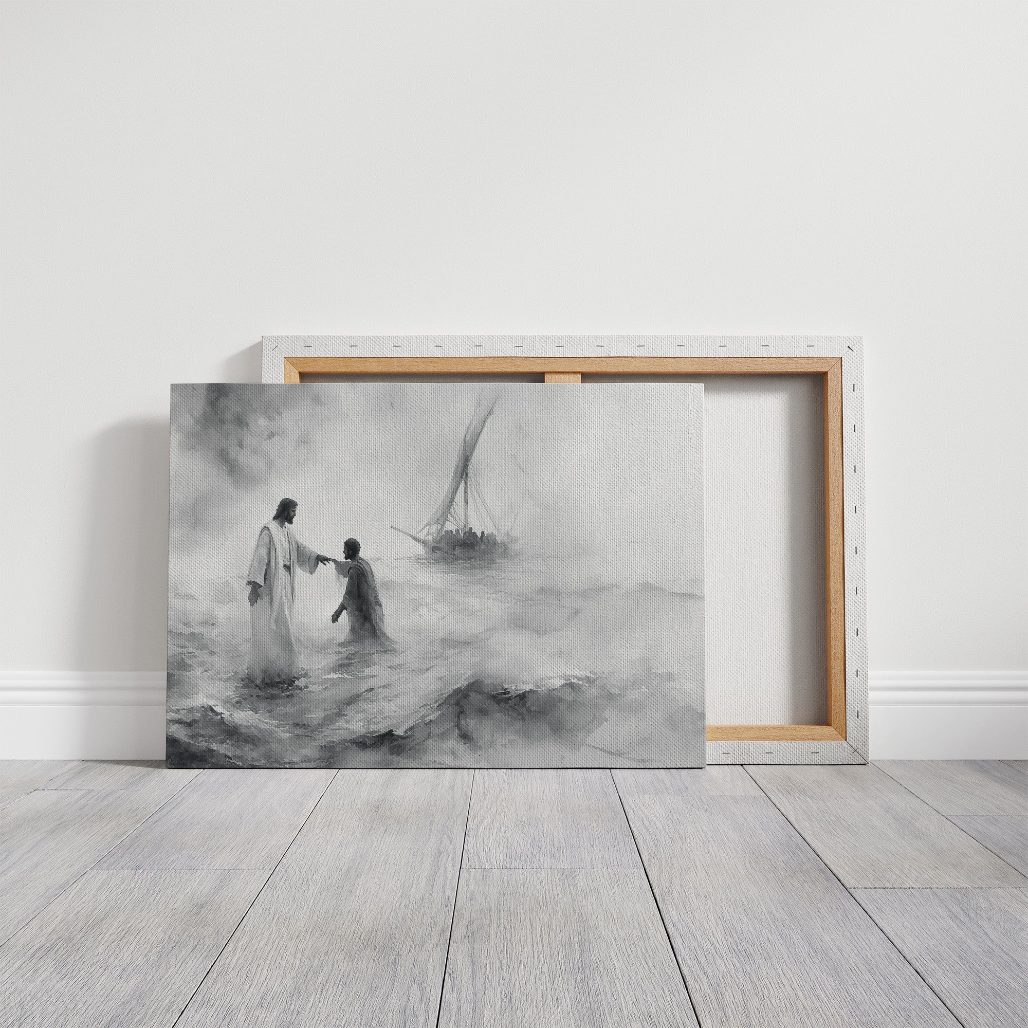 A moment of divine intervention unfolds in misty monochrome, where turbulent waves threaten to overwhelm. The dramatic scene captures two figures standing upon churning waters, with a listing ship barely visible through the atmospheric fog. The delicate brushwork creates a dreamlike quality where light and shadow dance across the tempestuous sea, inviting contemplation of hope amid life's challenges. This piece would bring a contemplative focal point to a reading nook, home office, or hallway where its subtle tones and powerful imagery invite moments of reflection.