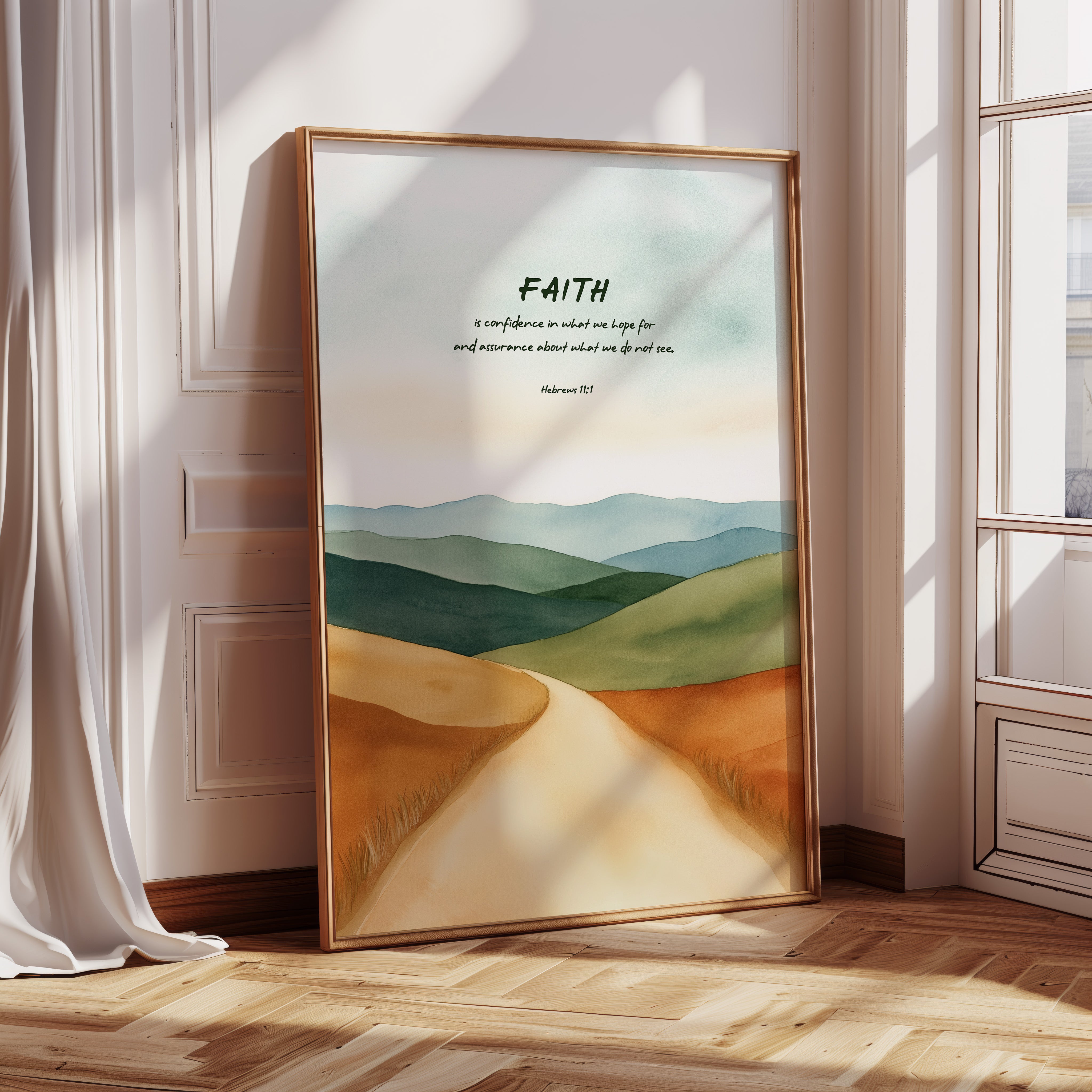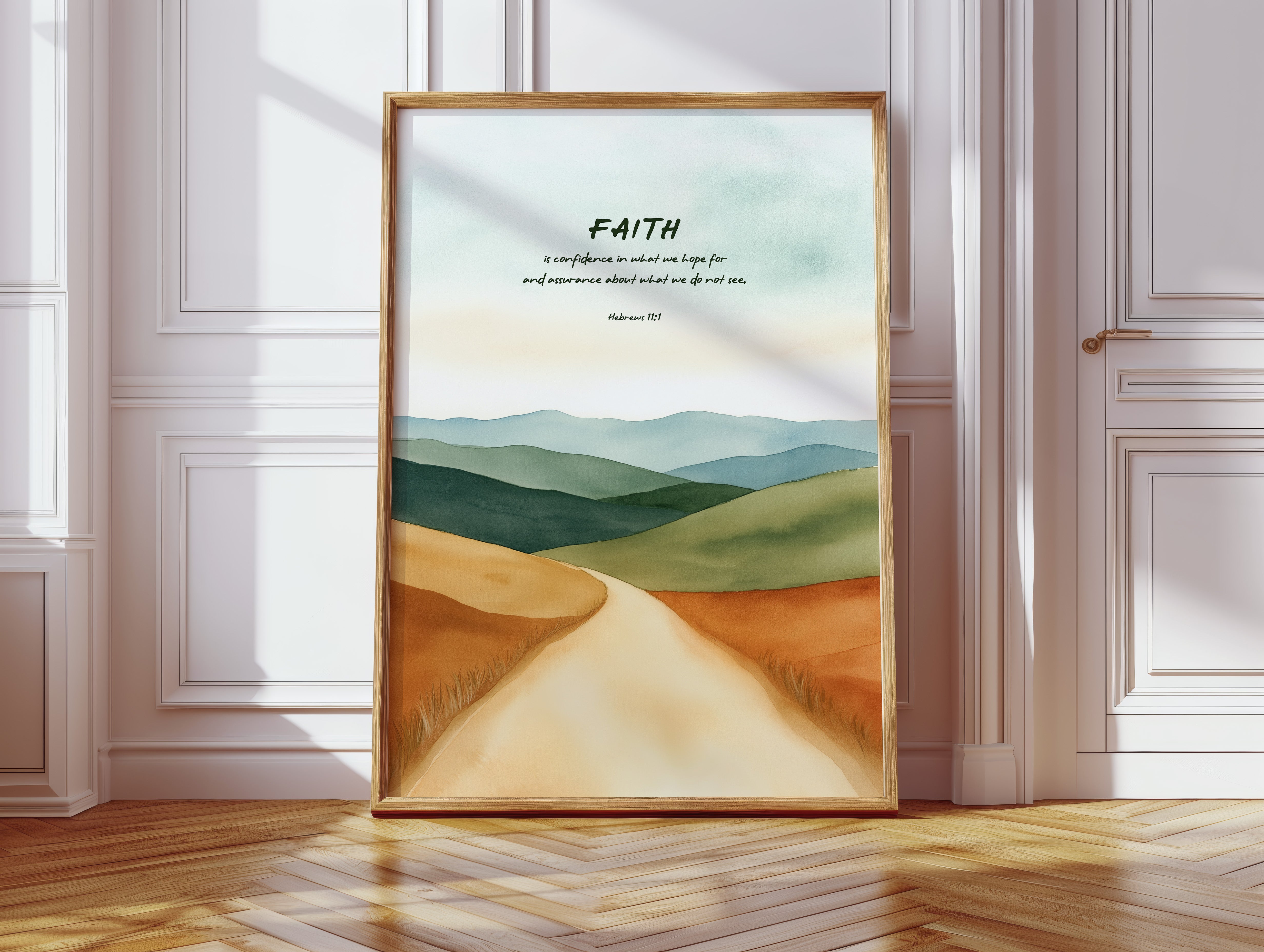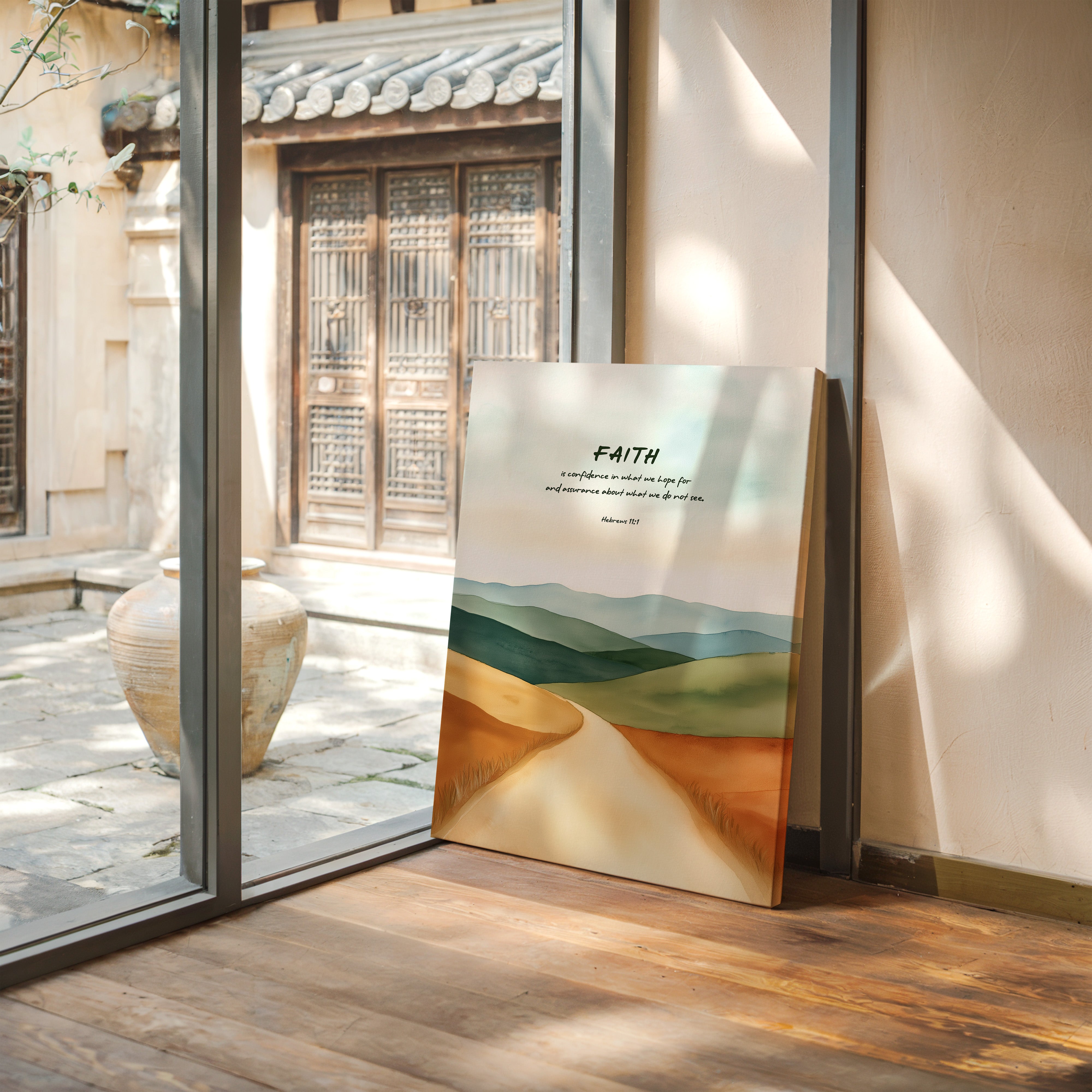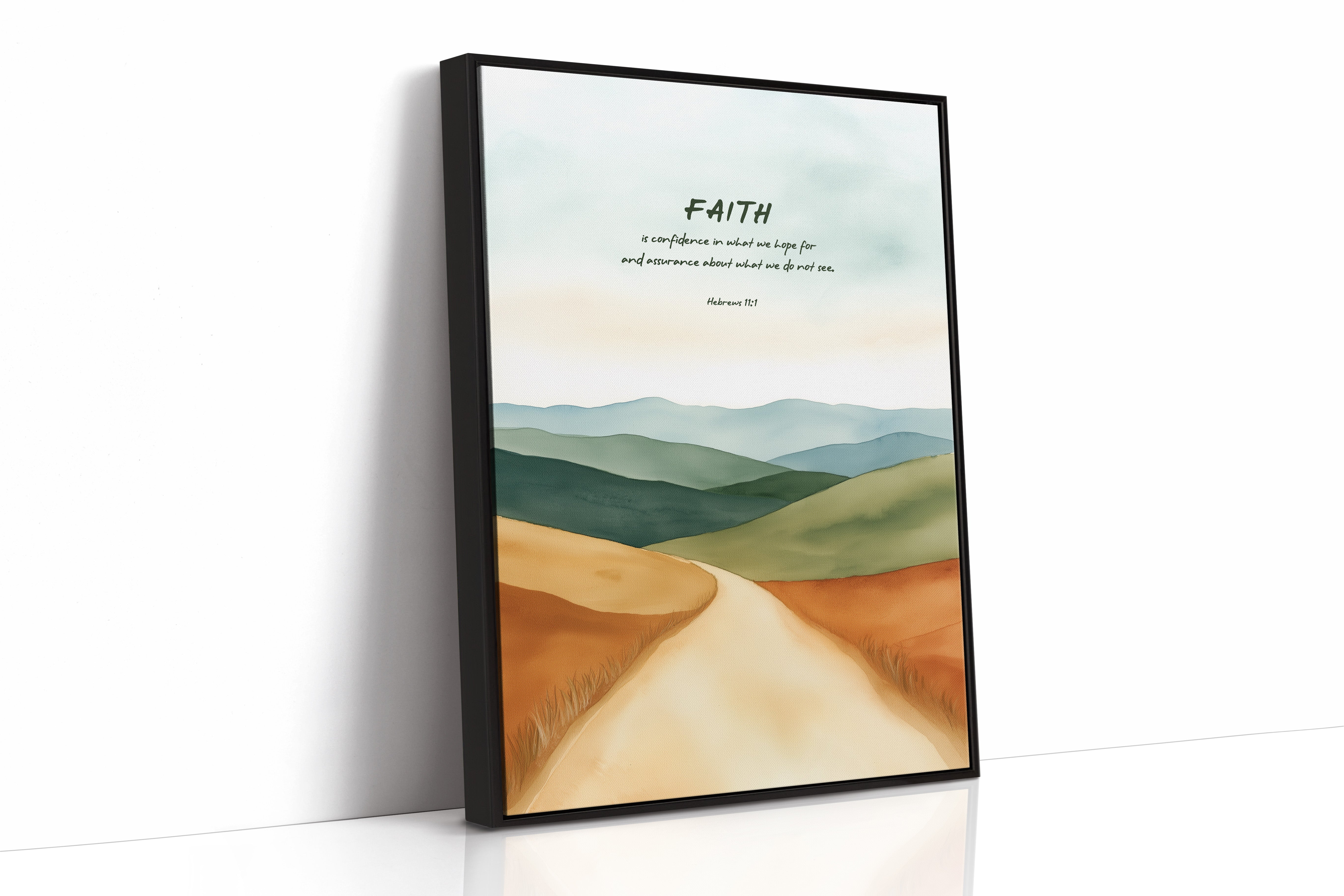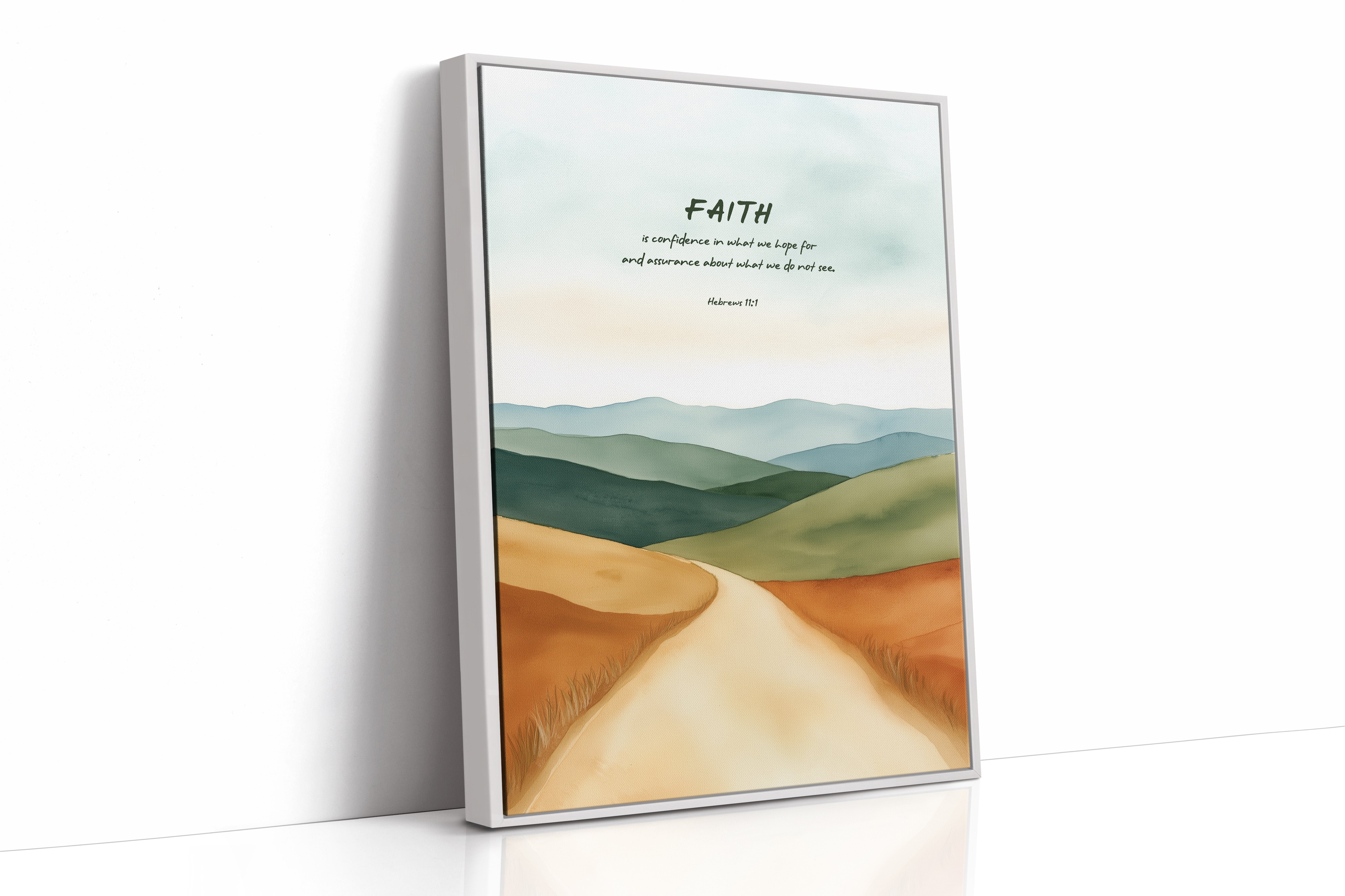 A warm winding road leads into misty mountains, echoing Hebrews 11:1—an invitation to trust beyond what the eye can see.