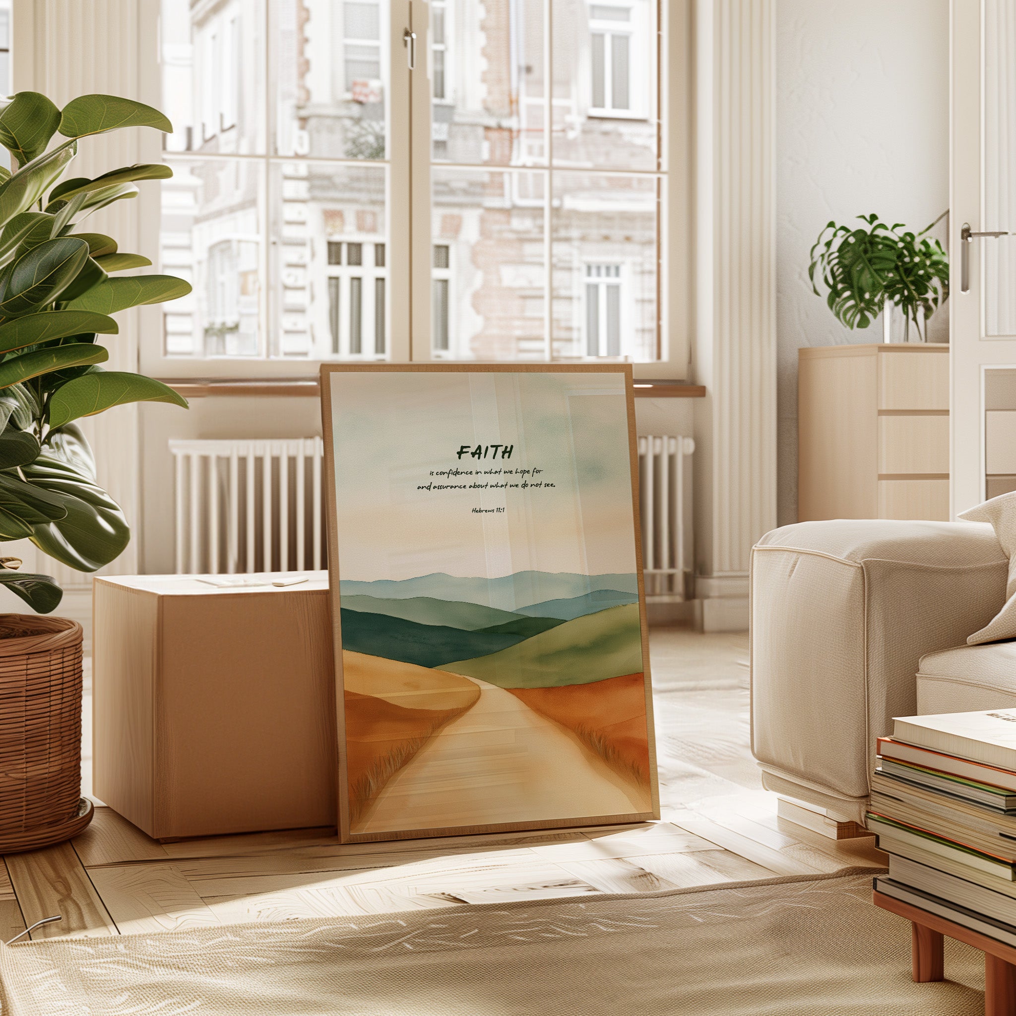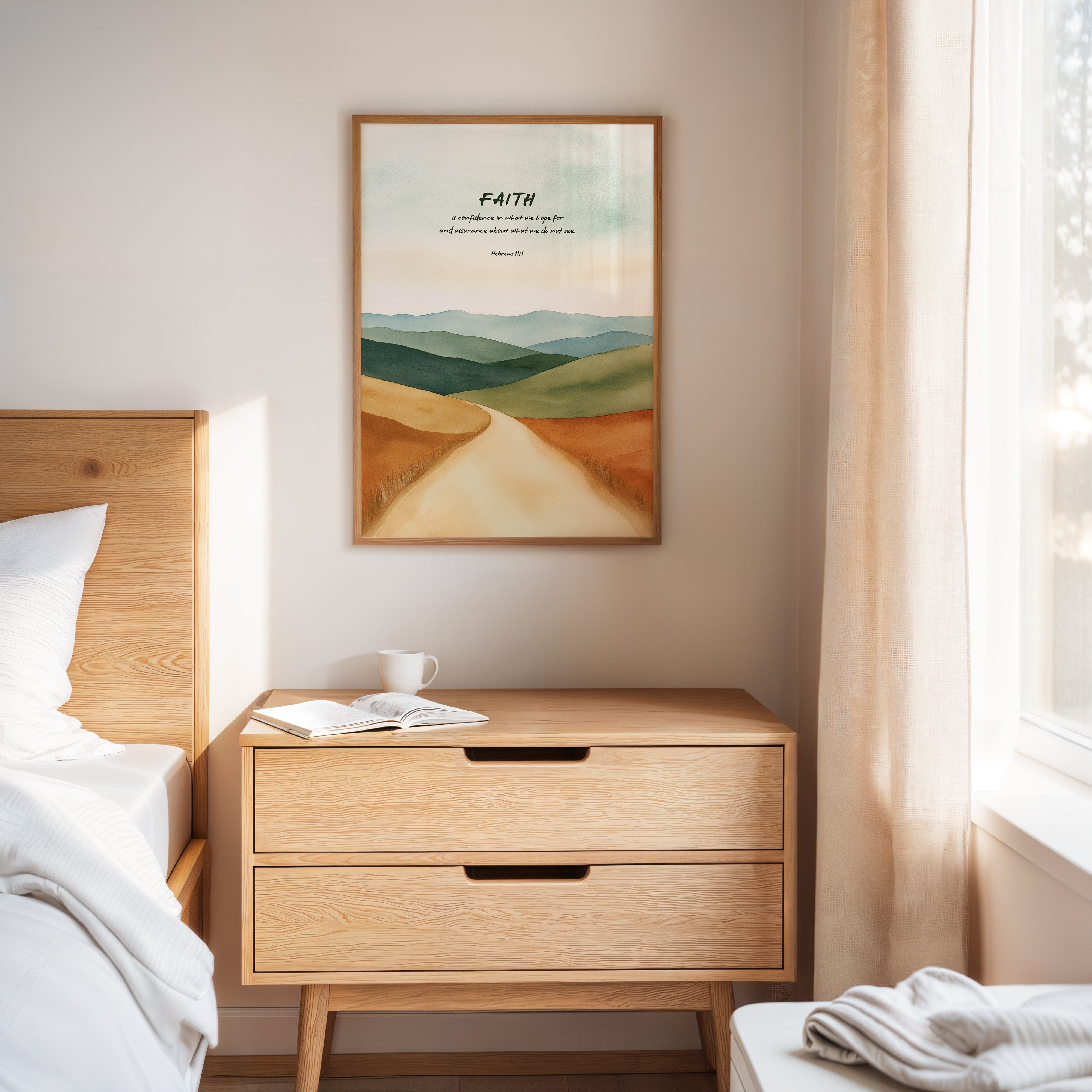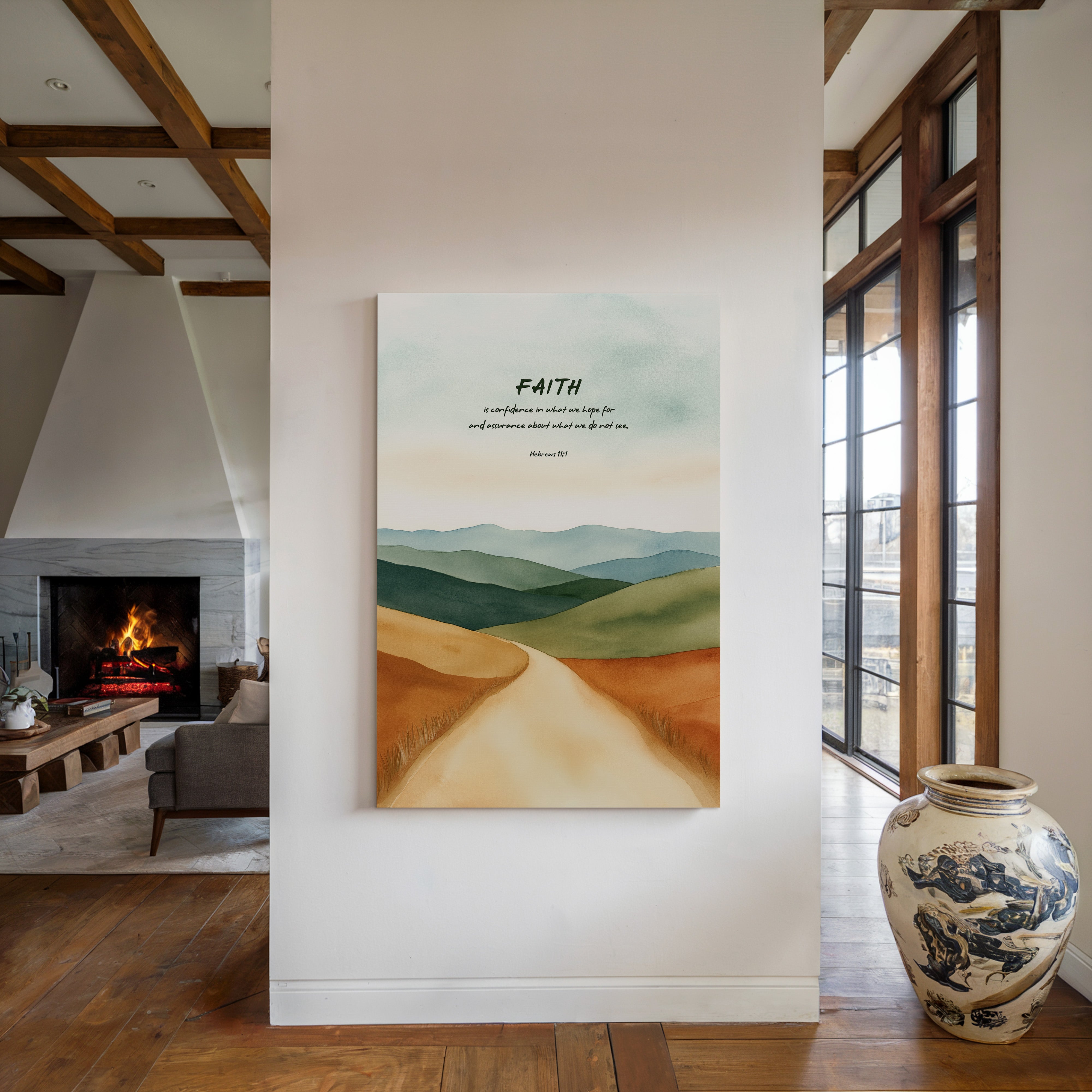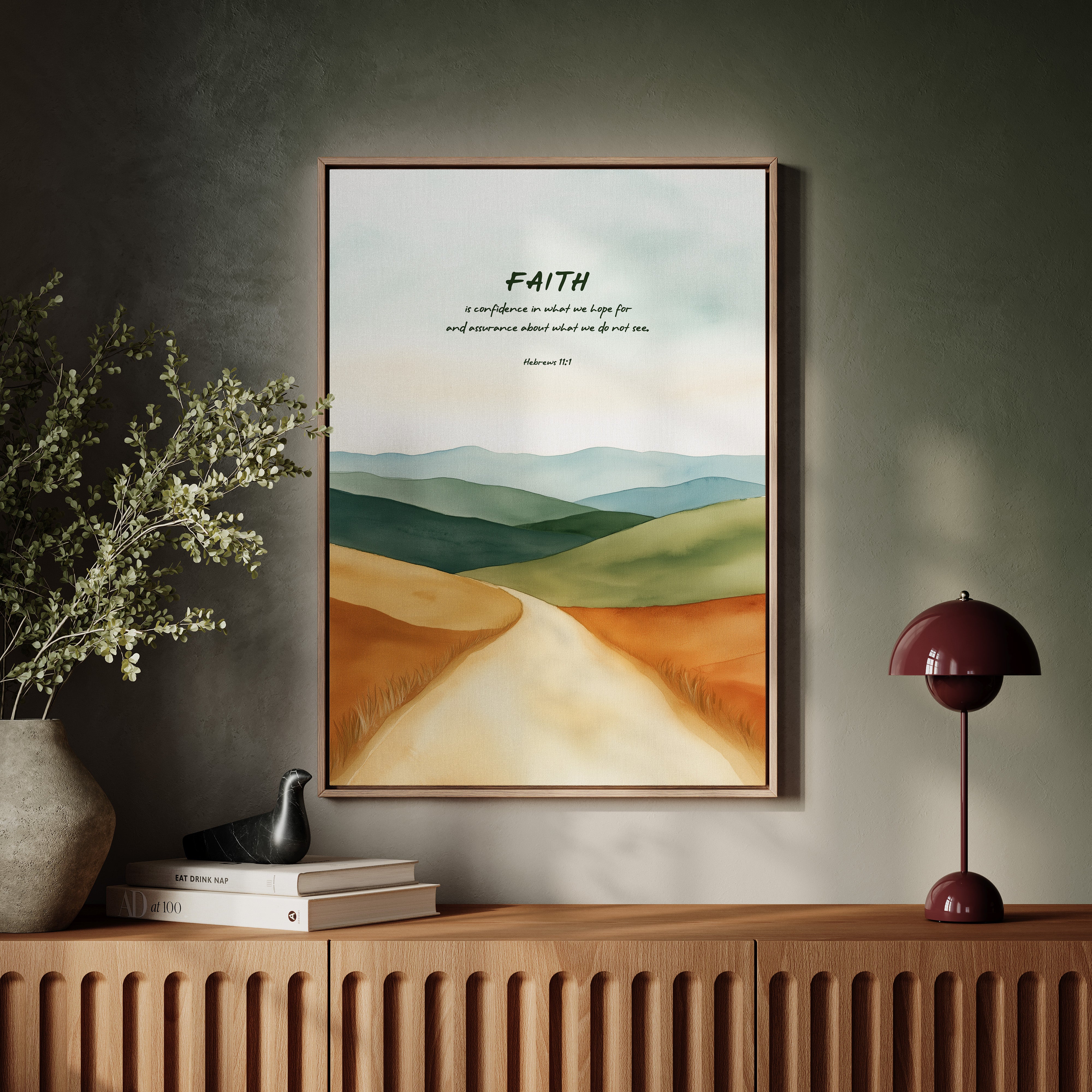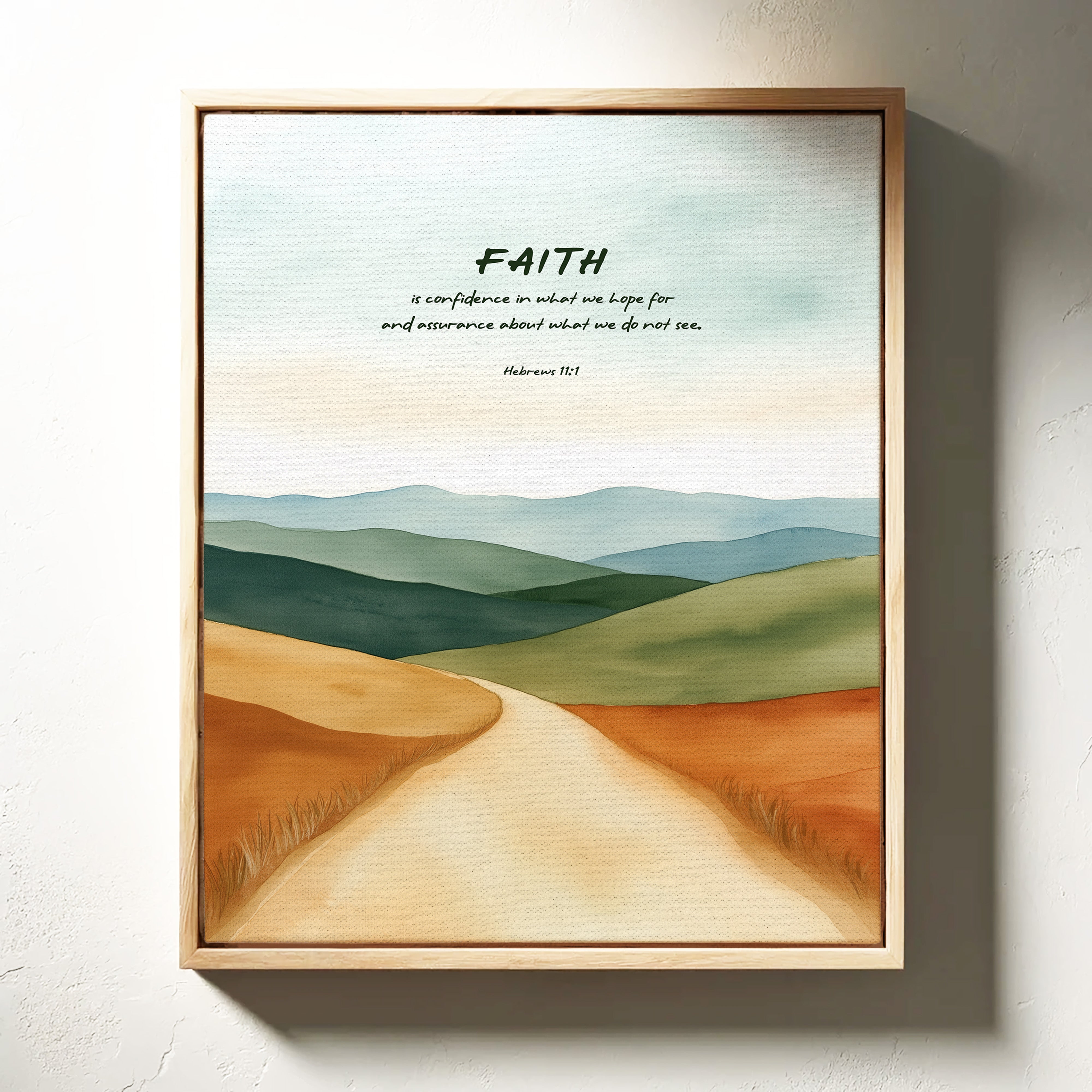 A warm winding road leads into misty mountains, echoing Hebrews 11:1—an invitation to trust beyond what the eye can see.
