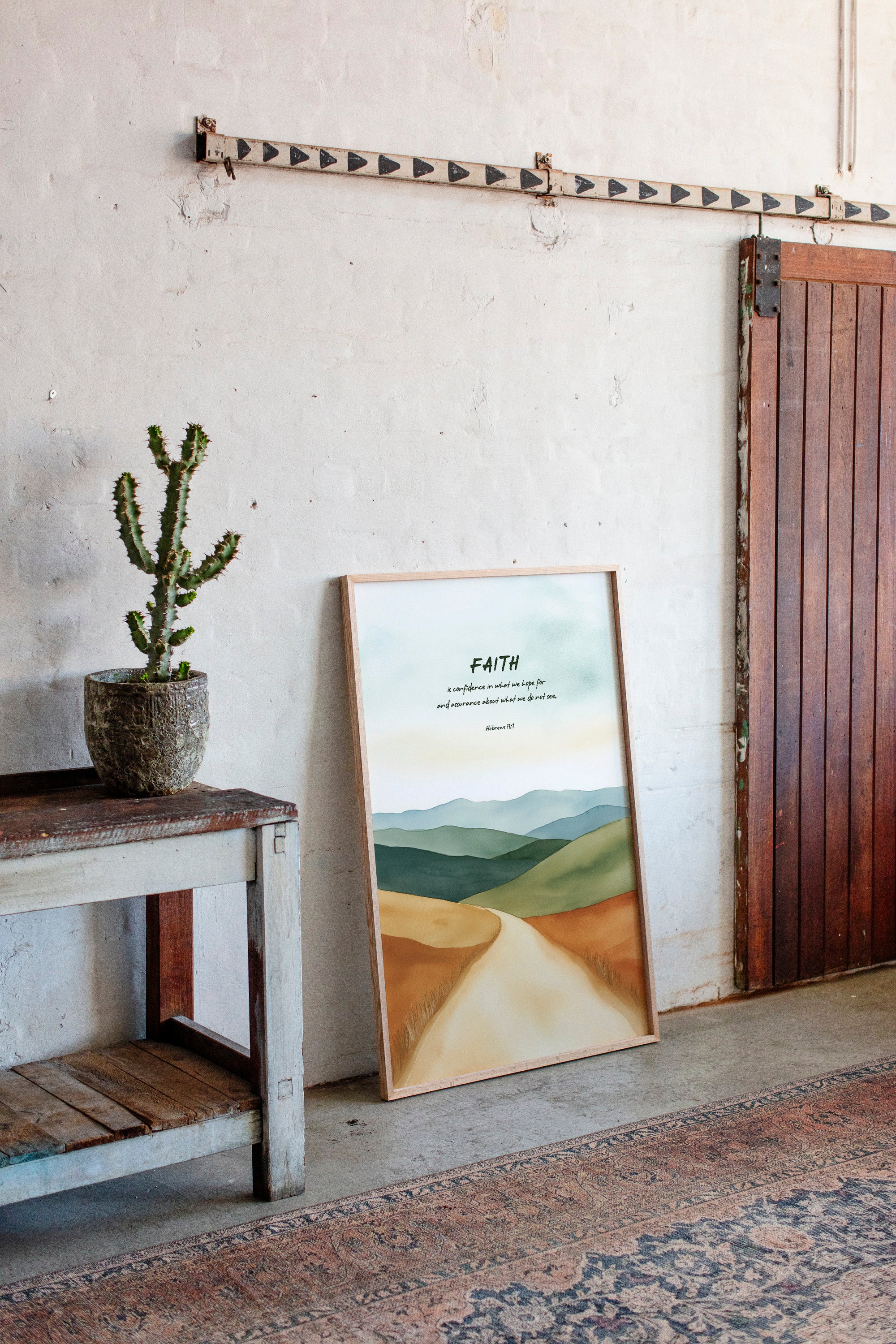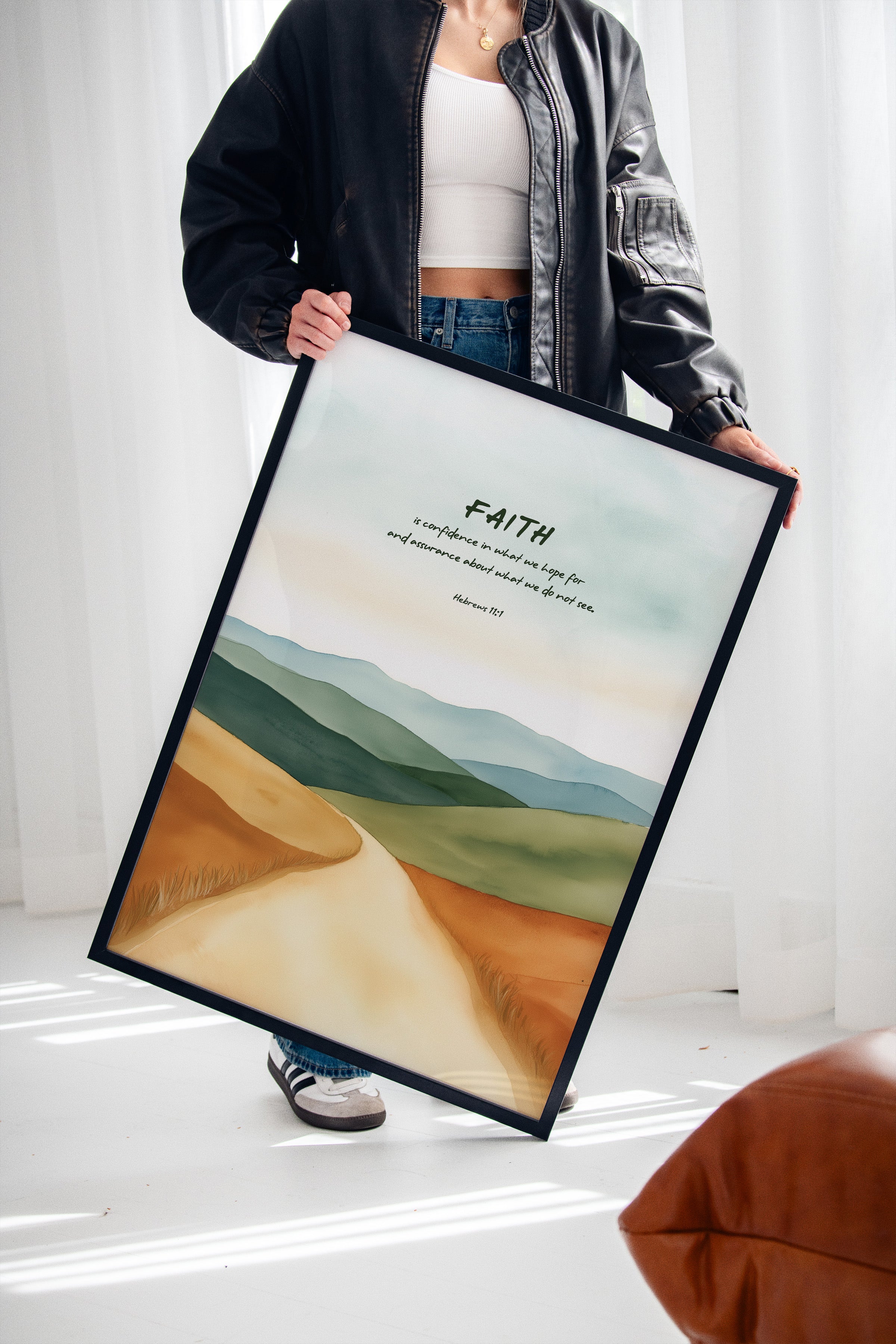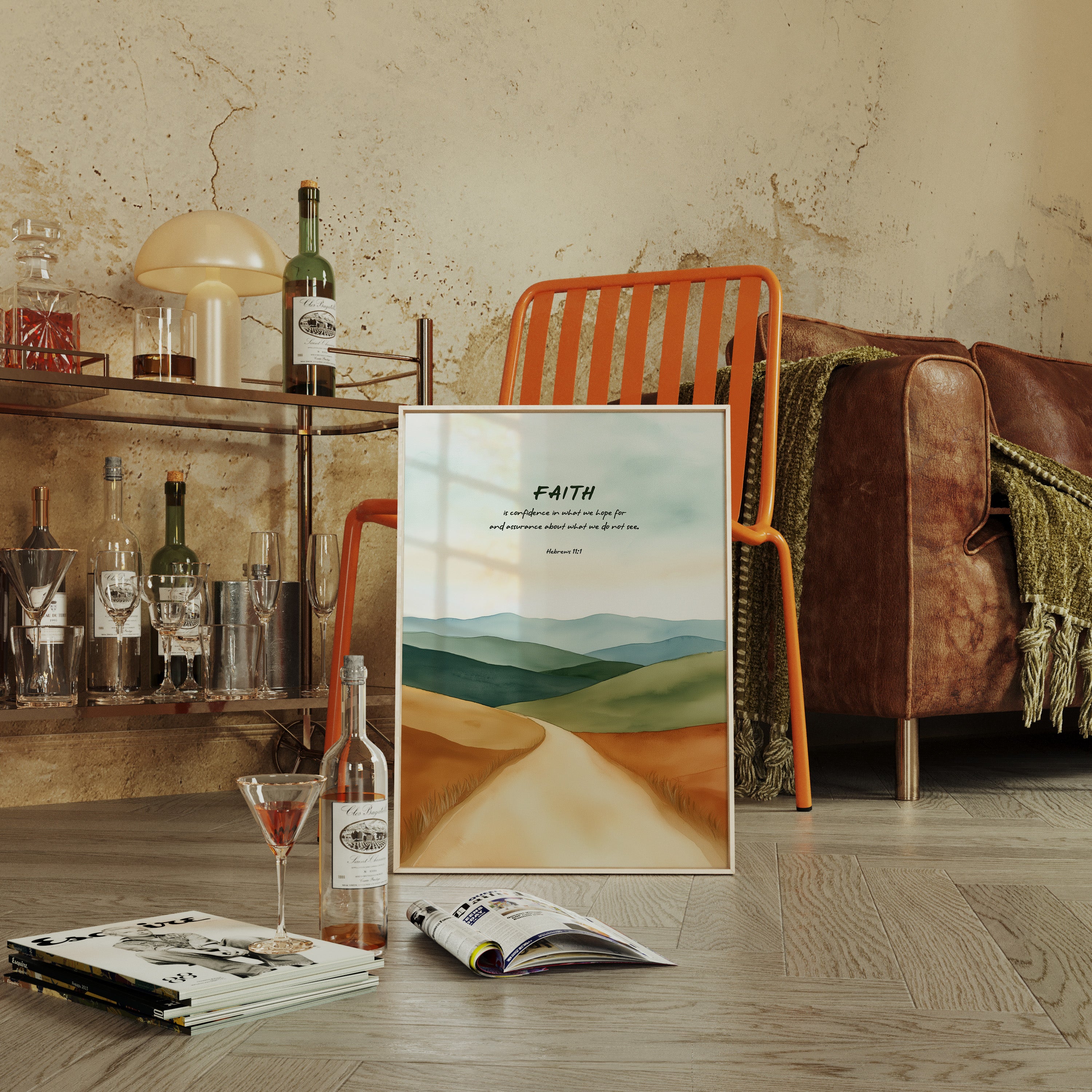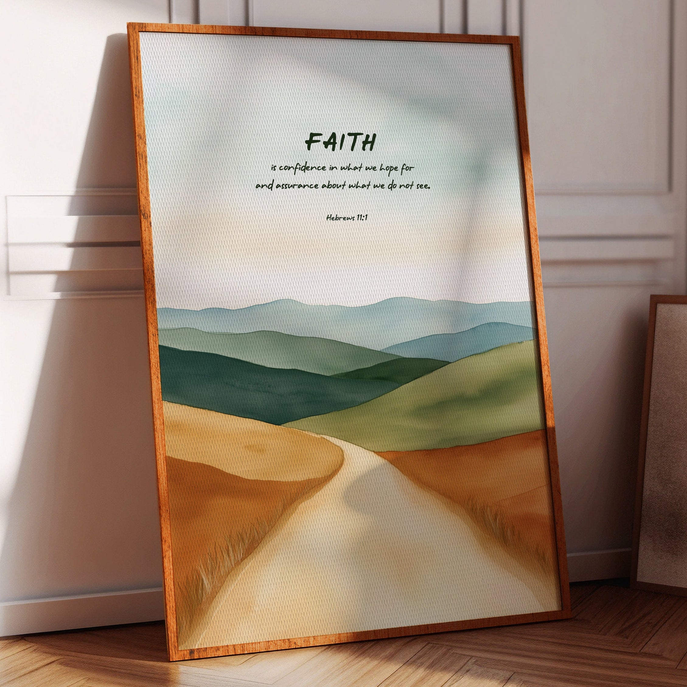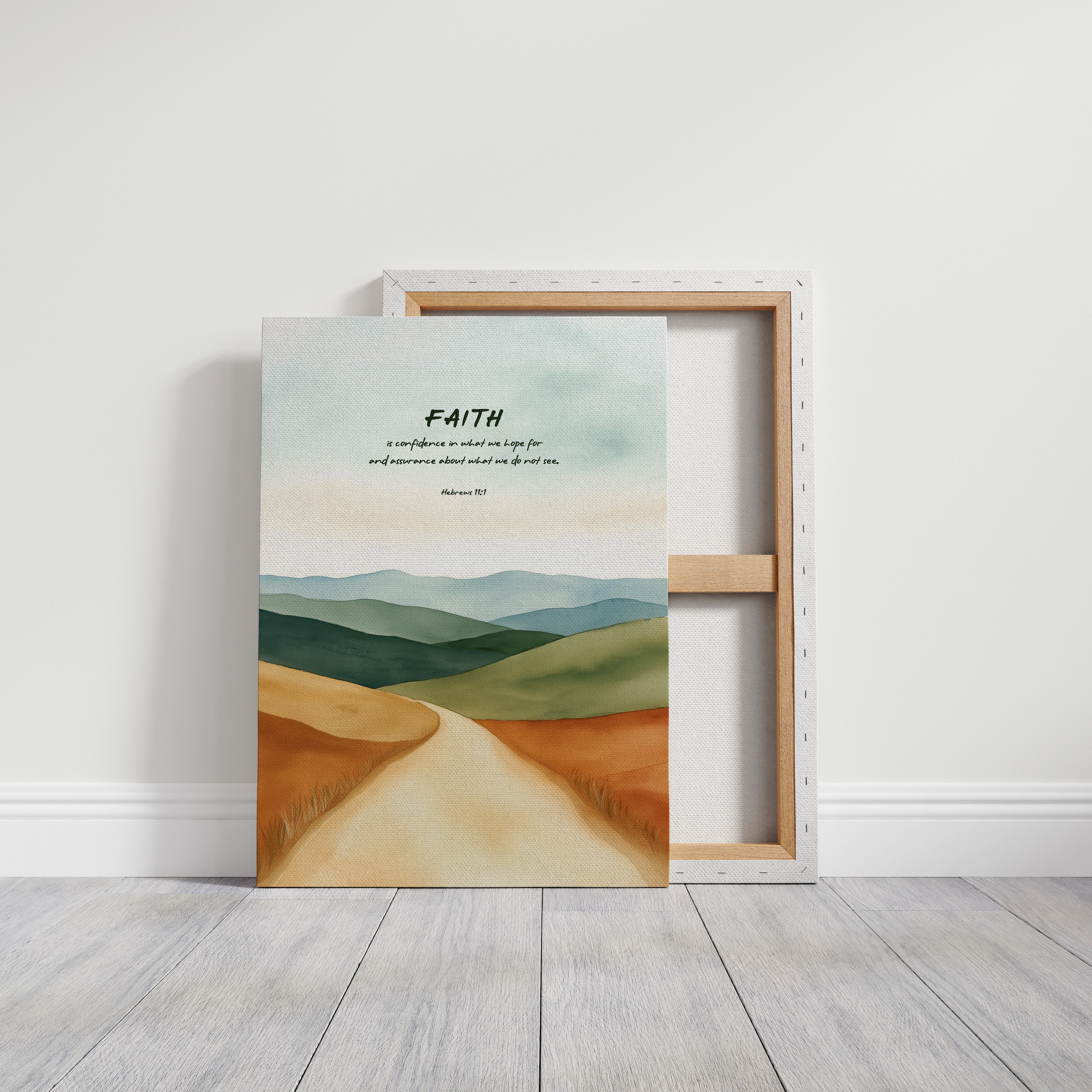A warm winding road leads into misty mountains, echoing Hebrews 11:1—an invitation to trust beyond what the eye can see.