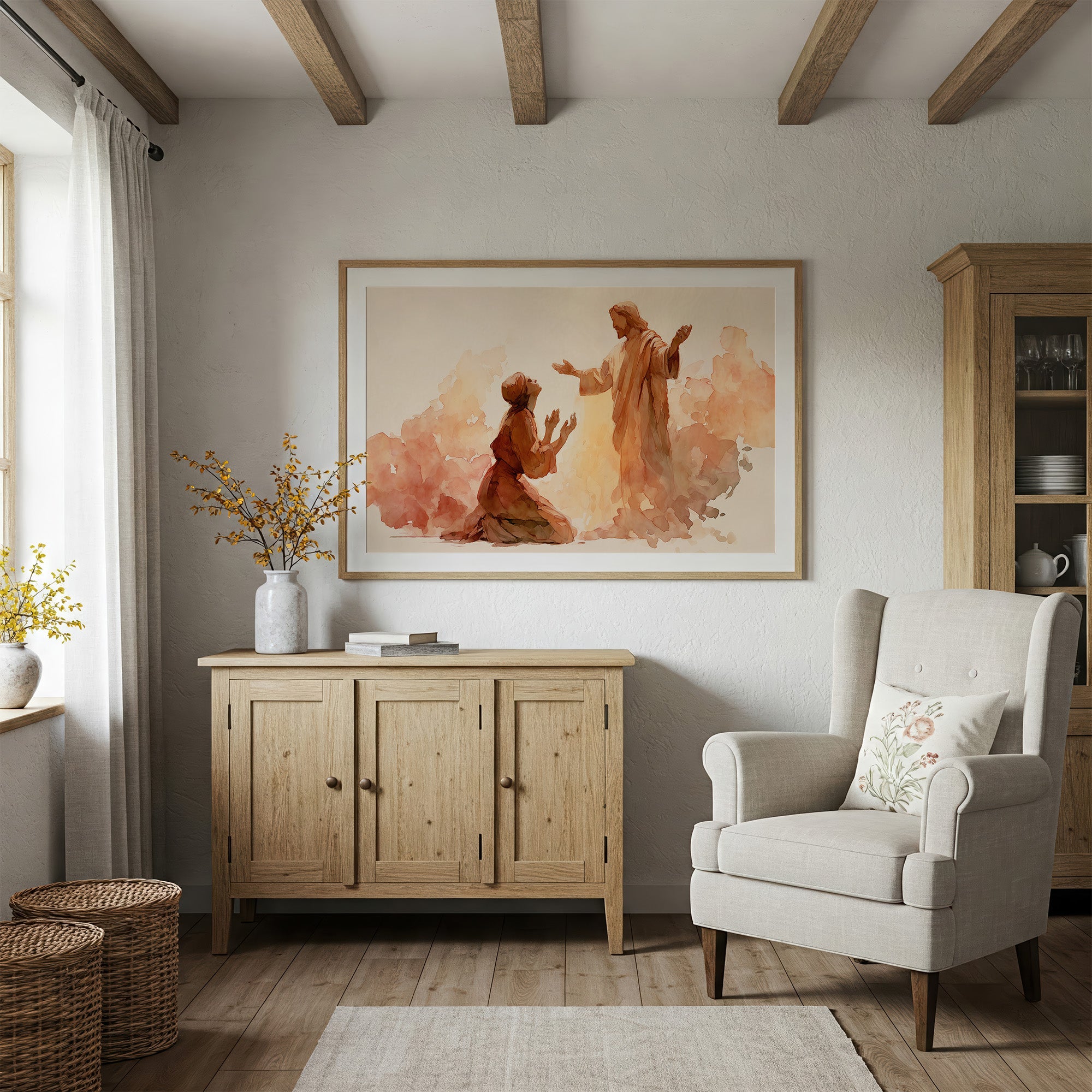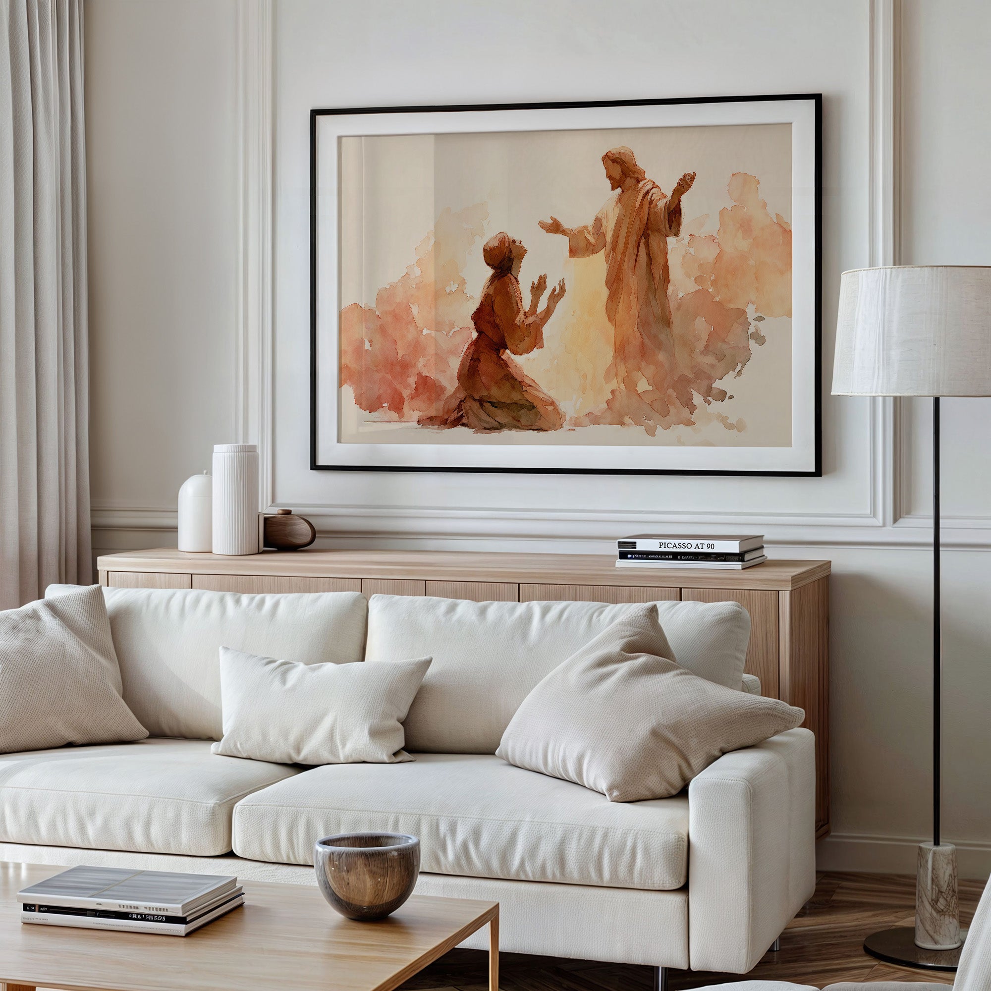Warm washes of peach and amber surround two figures caught in a moment of profound connection. The watercolor artwork captures the tender interaction between the kneeling figure and the standing one, their gestures speaking of reverence and compassion. Soft brushstrokes create an ethereal quality, with the golden background suggesting divine radiance that envelops both figures in its gentle glow. This contemplative piece brings a sense of peace and spiritual warmth to a reading nook, study, or meditation space.
