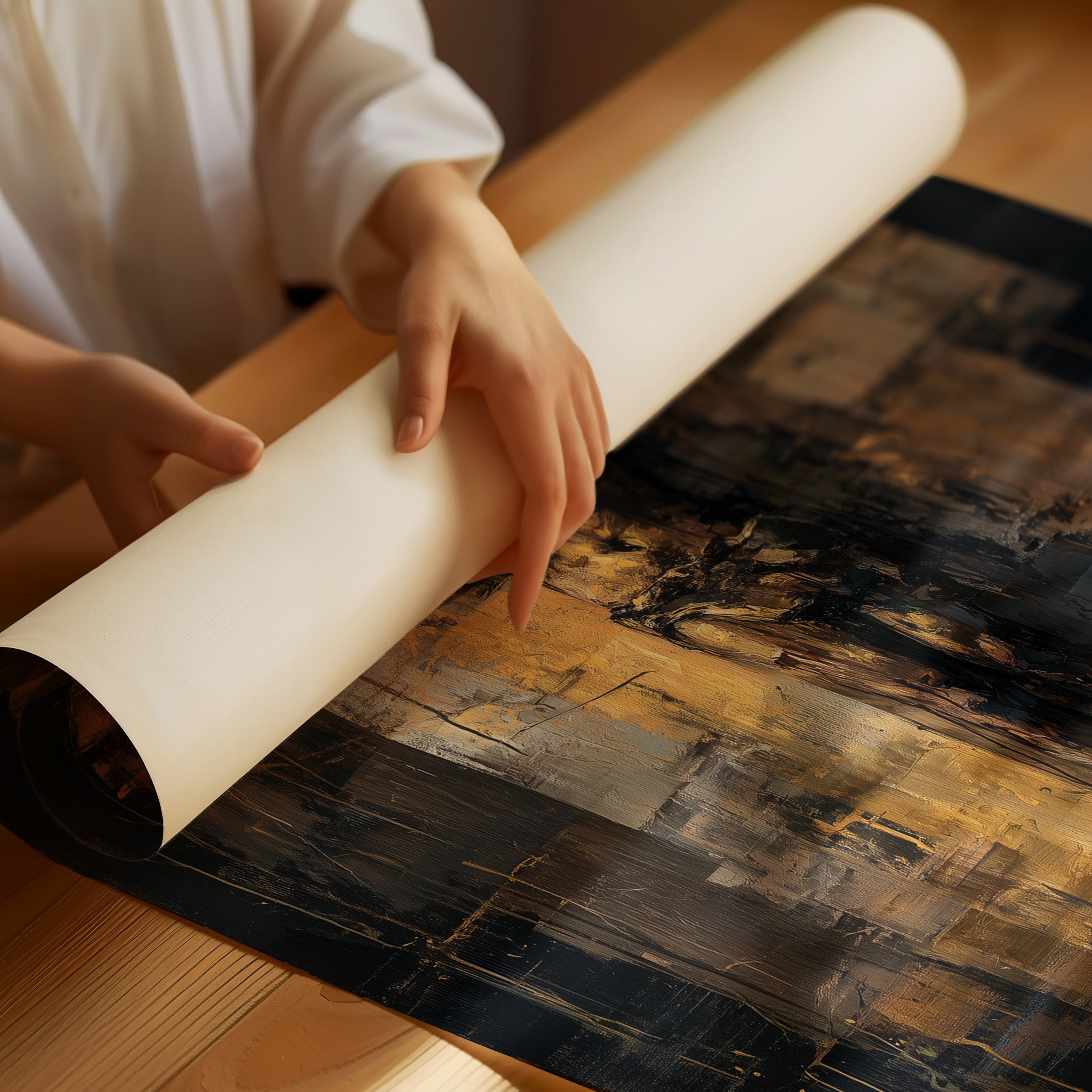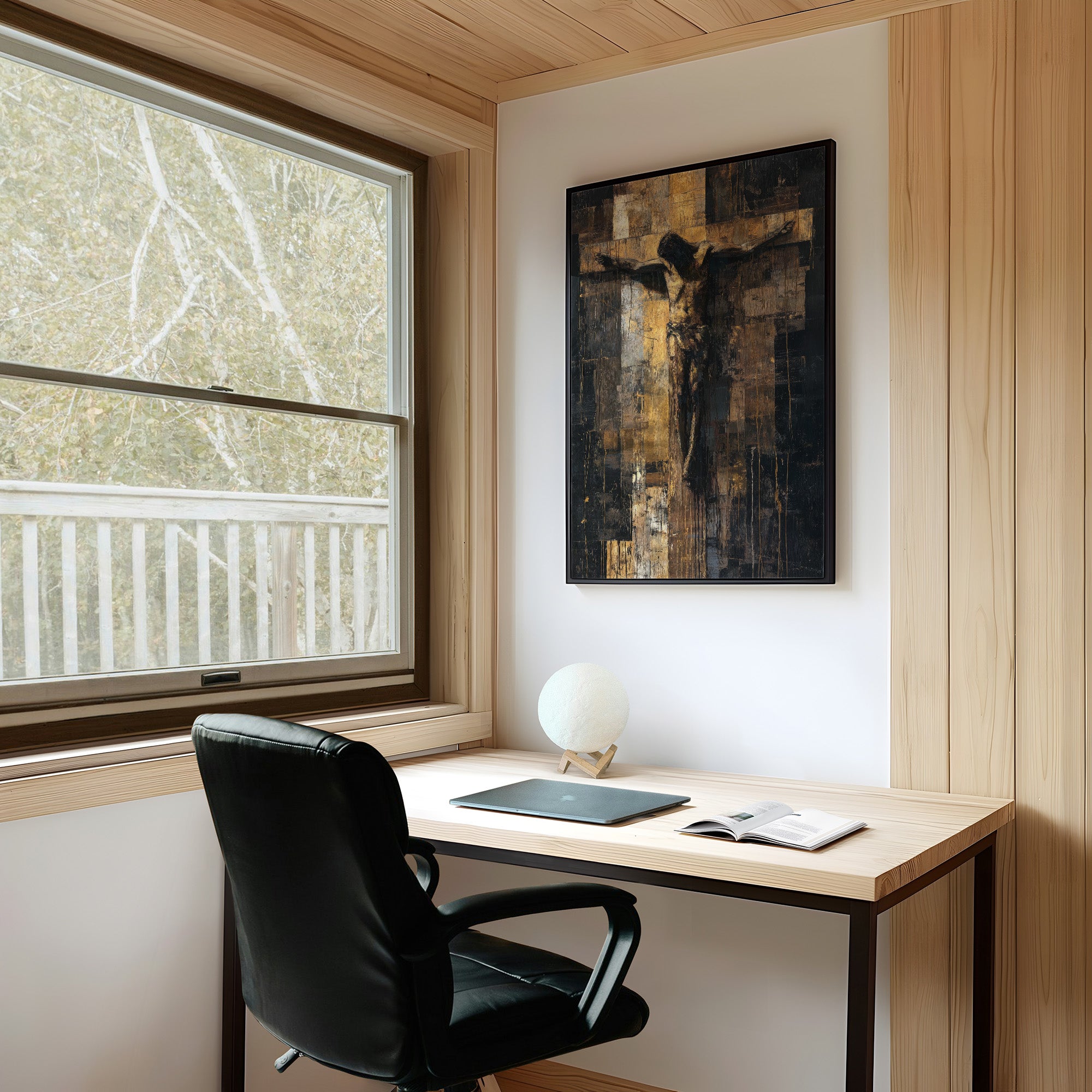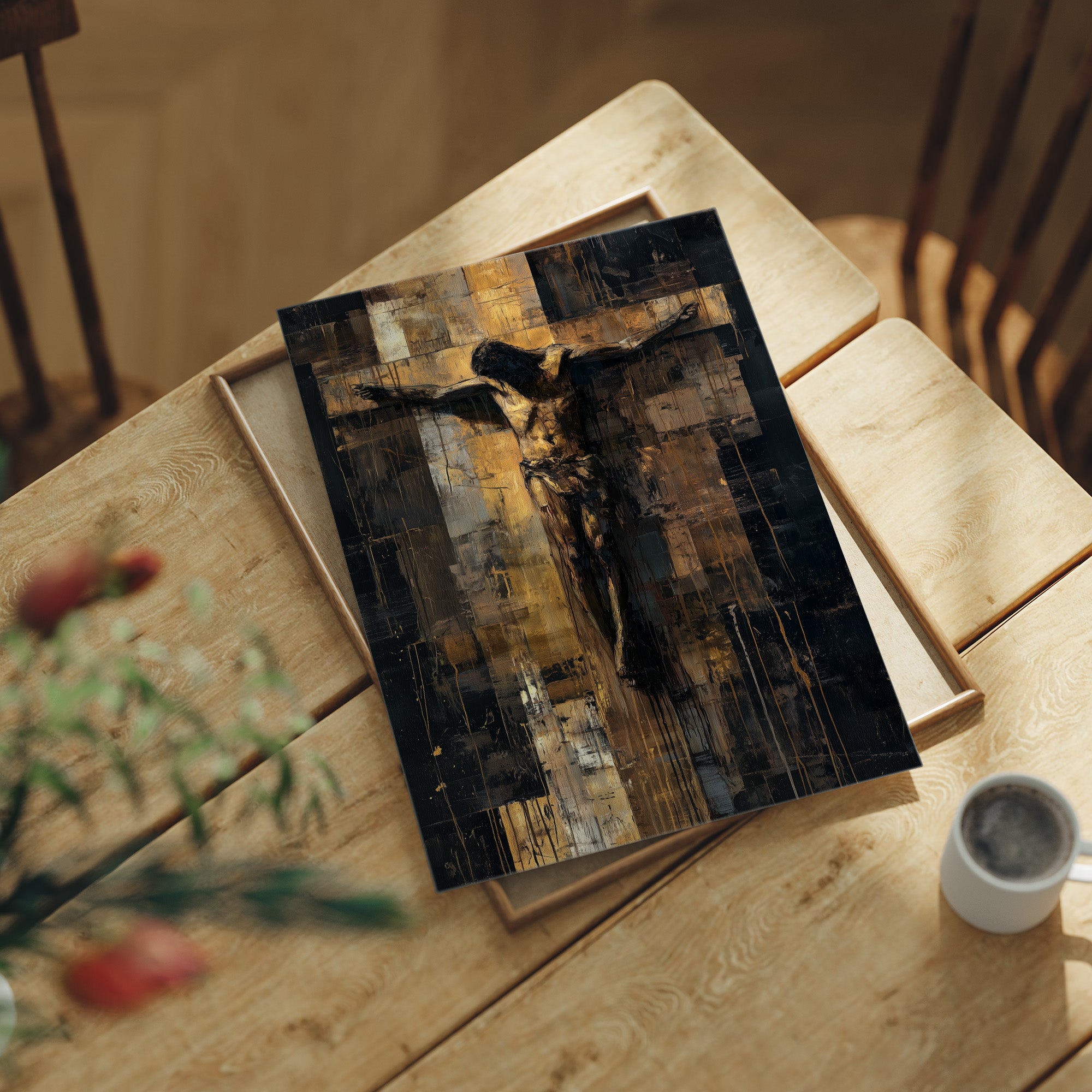 Morning light falls gently across the wooden table where faith takes textured form. The abstract crucifixion painting commands attention with its striking contrast of deep ebony shadows and luminous gold accents, creating a sense of reverence through modern artistic expression. The textured brushstrokes and layered palette knife technique transform traditional religious imagery into a contemporary meditation on sacrifice and hope. This contemplative piece finds its perfect home in a quiet study or meditation space where one can pause for reflection amid life's constant motion.