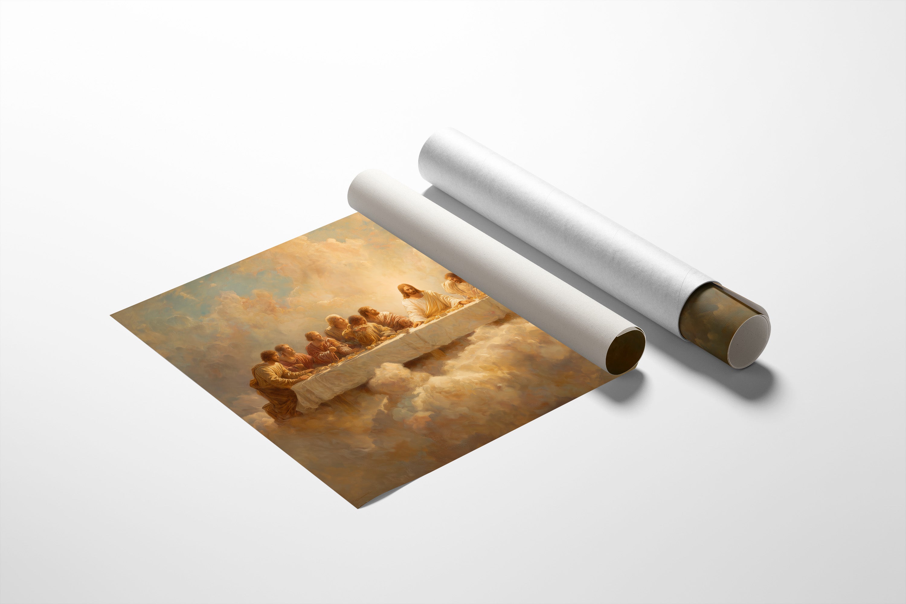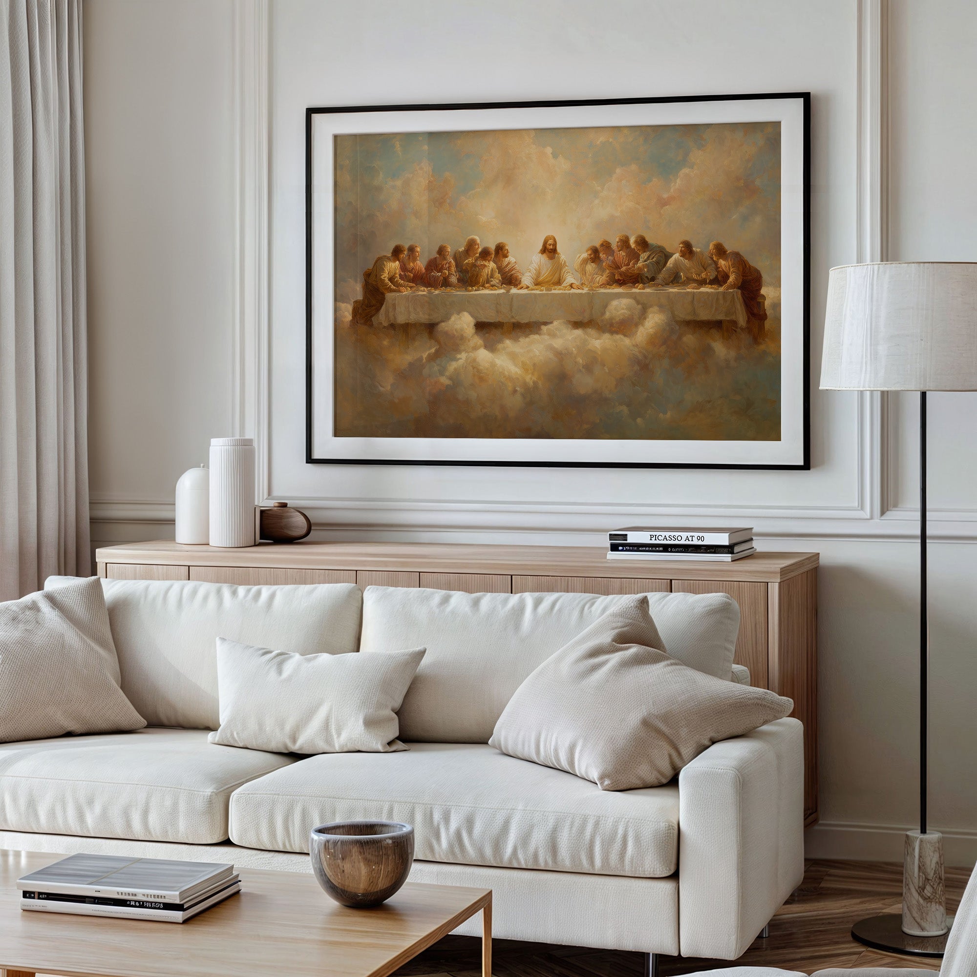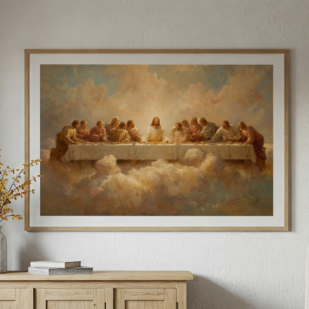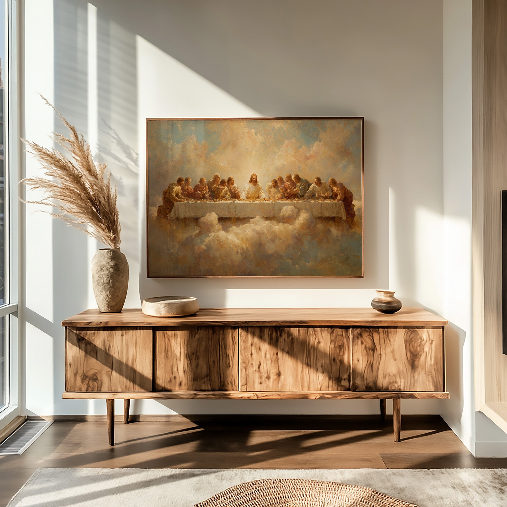 Soft afternoon light bathes this thoughtful corner where spirituality meets intellect. A framed painting of the Last Supper, rendered in ethereal golden hues and heavenly clouds, leans casually against the wall, surrounded by carefully arranged bookshelves. The warm oak shelving cradles an impressive collection of literature while a ceramic vessel of dried pampas grass adds organic texture to this contemplative space.