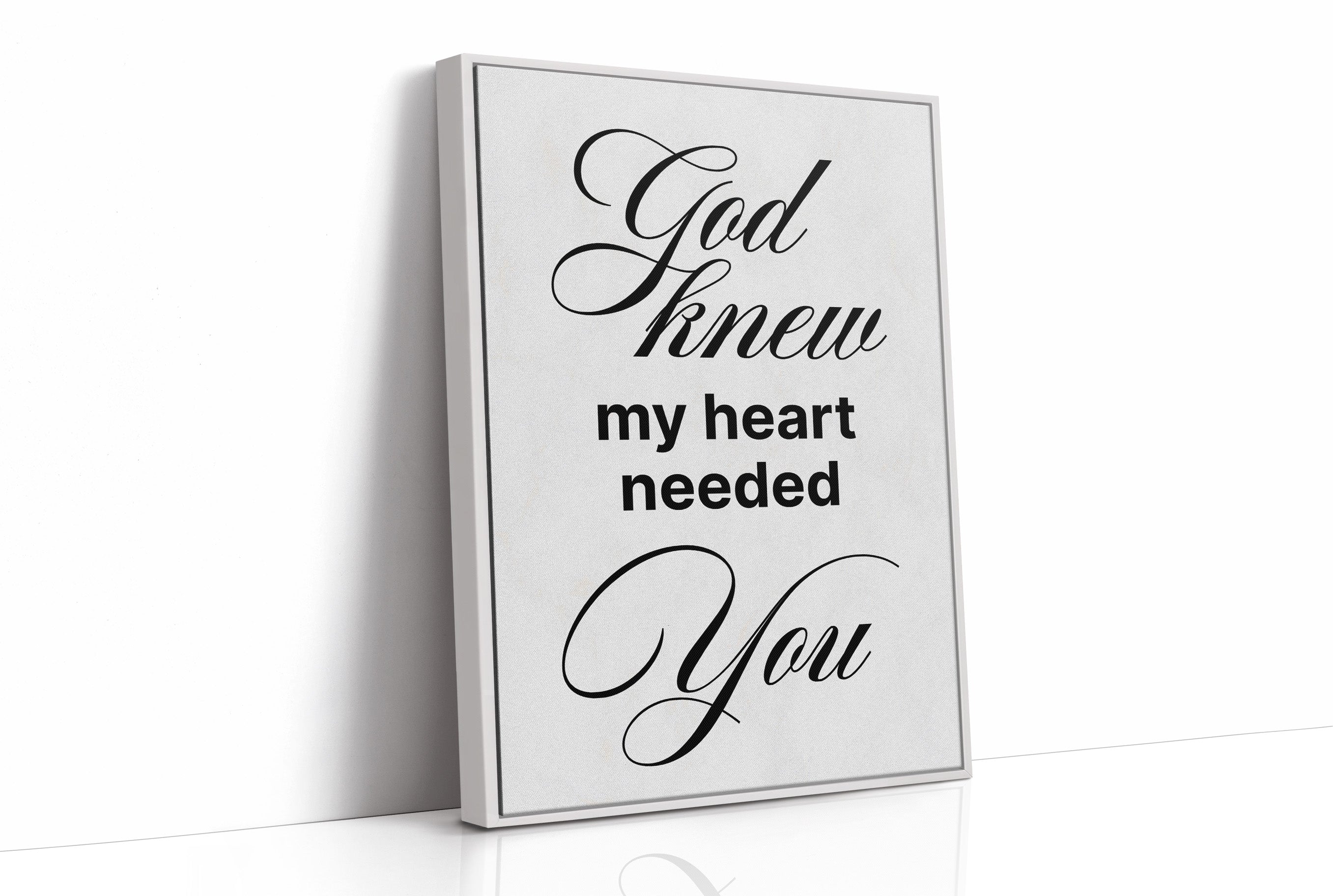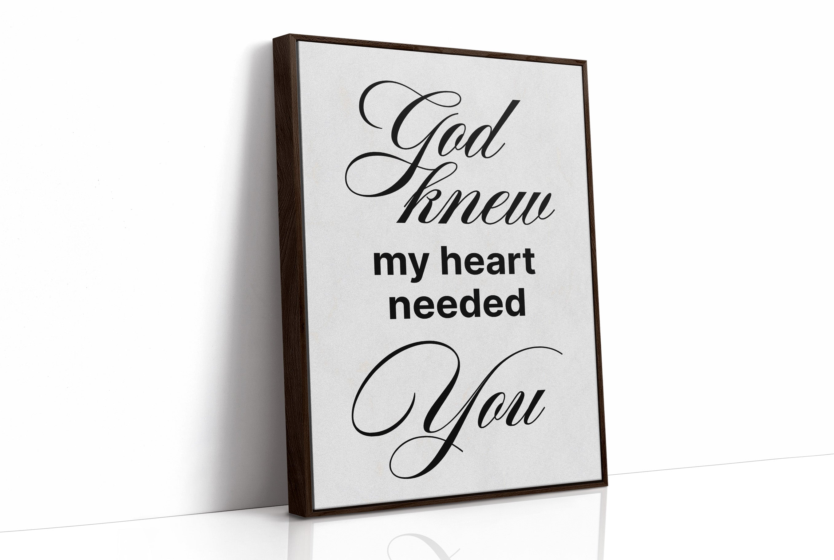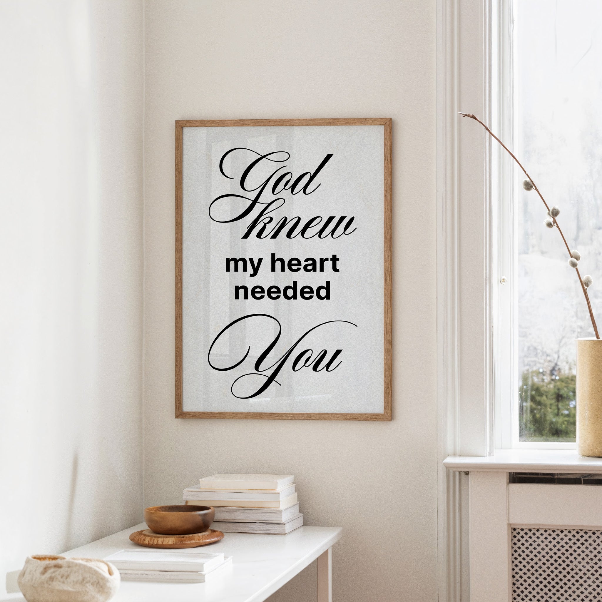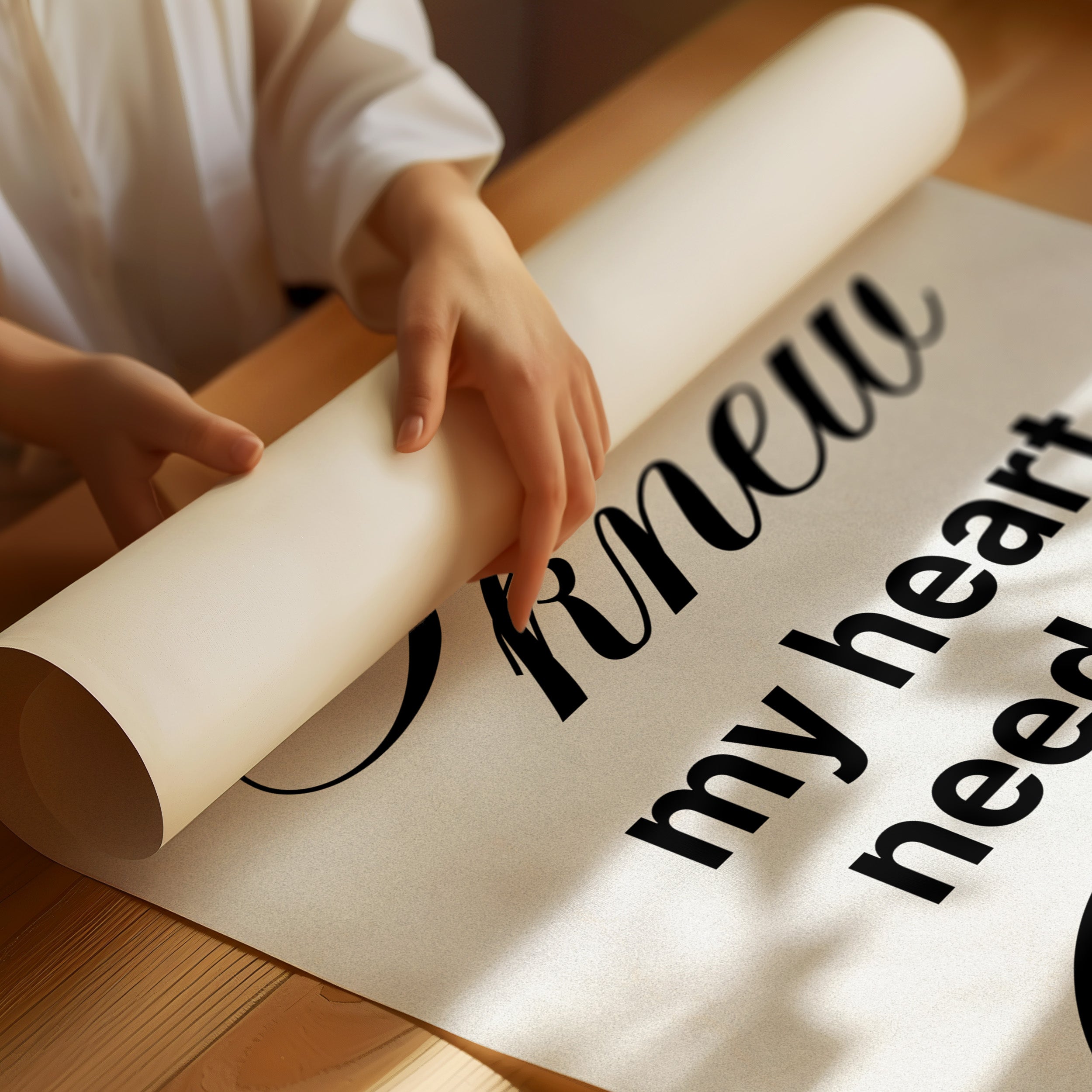 A moment of quiet devotion captured in warm morning light. The elegant typography of a spiritual message rests against the honest grain of wooden slats, inviting contemplation in stillness. The natural textures of the table contrast beautifully with the crisp white paper, while hints of greenery and a small cup suggest a peaceful ritual unfolding. This piece brings a gentle reminder of faith into dining areas, reading nooks, or prayer corners where daily reflections become sacred practice.