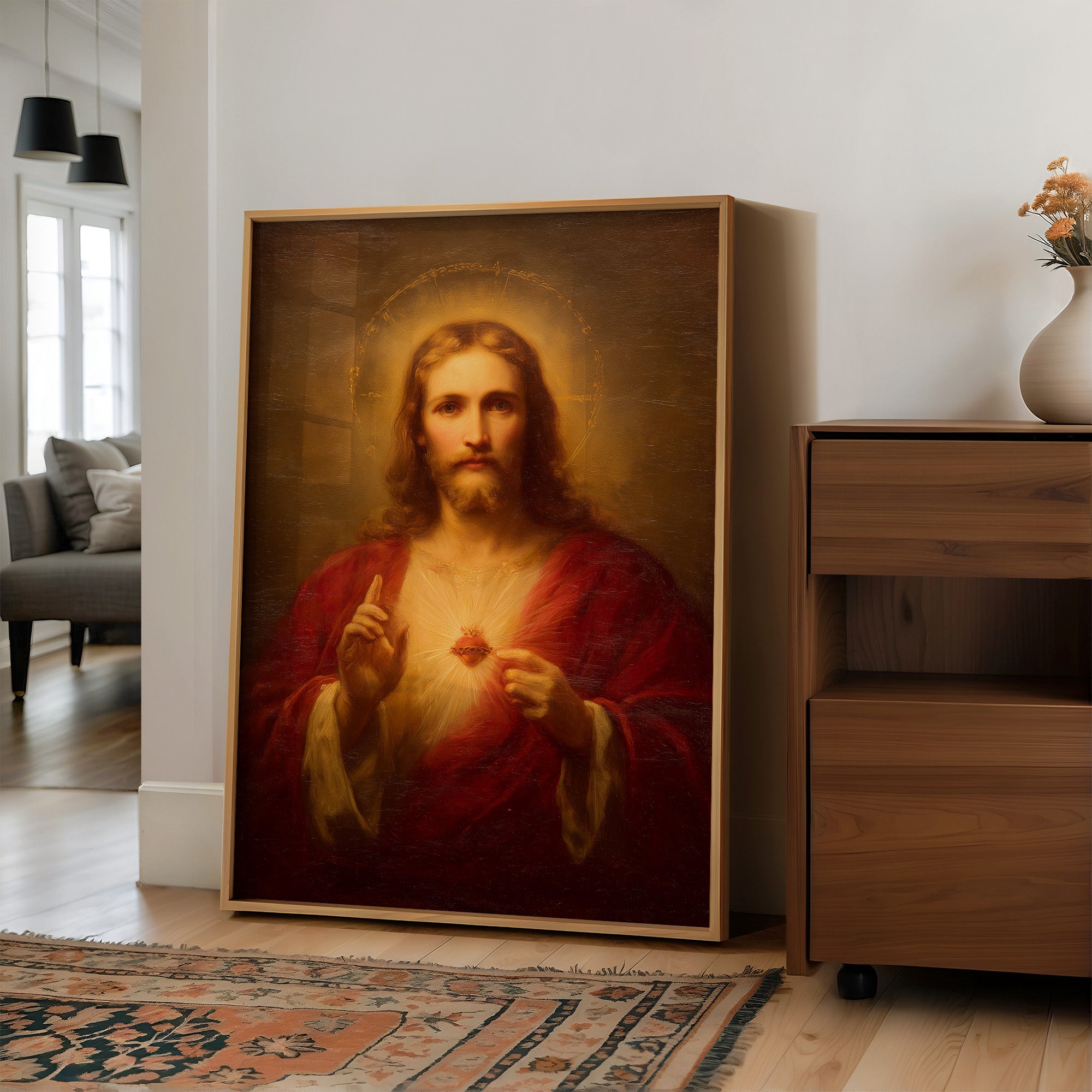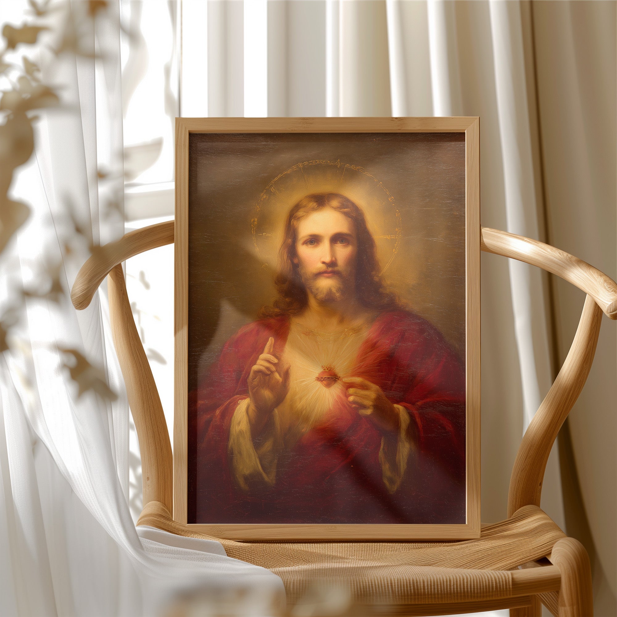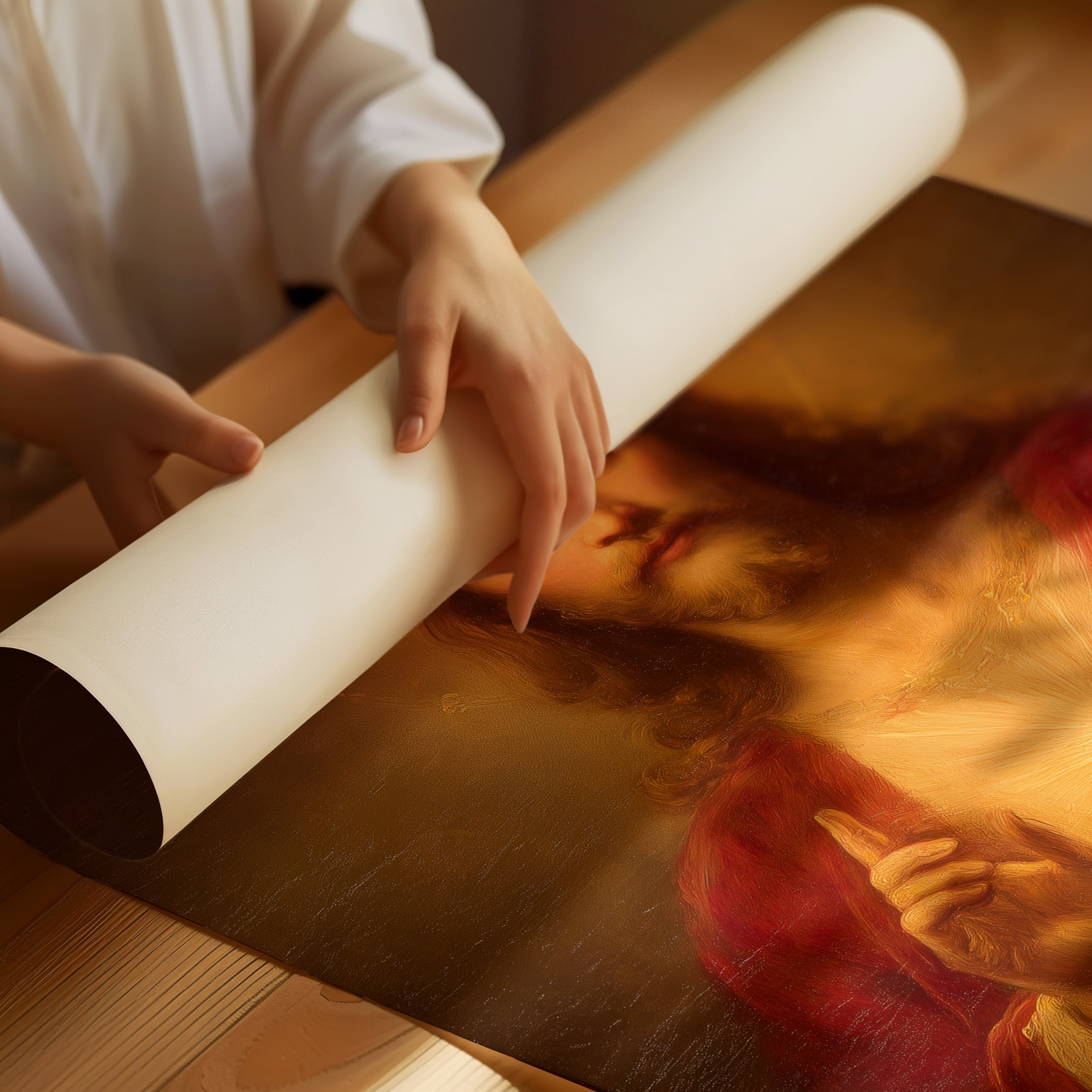 Warm light bathes the sacred portrait resting on weathered planks, creating a moment of quiet reverence. The rich crimson robes and radiant golden halo contrast beautifully with the rustic simplicity of the wooden surface below, while subtle greenery and a small cup frame the scene in humble domesticity. This classical religious artwork finds new meaning in this intimate setting, where everyday life meets spiritual contemplation.
