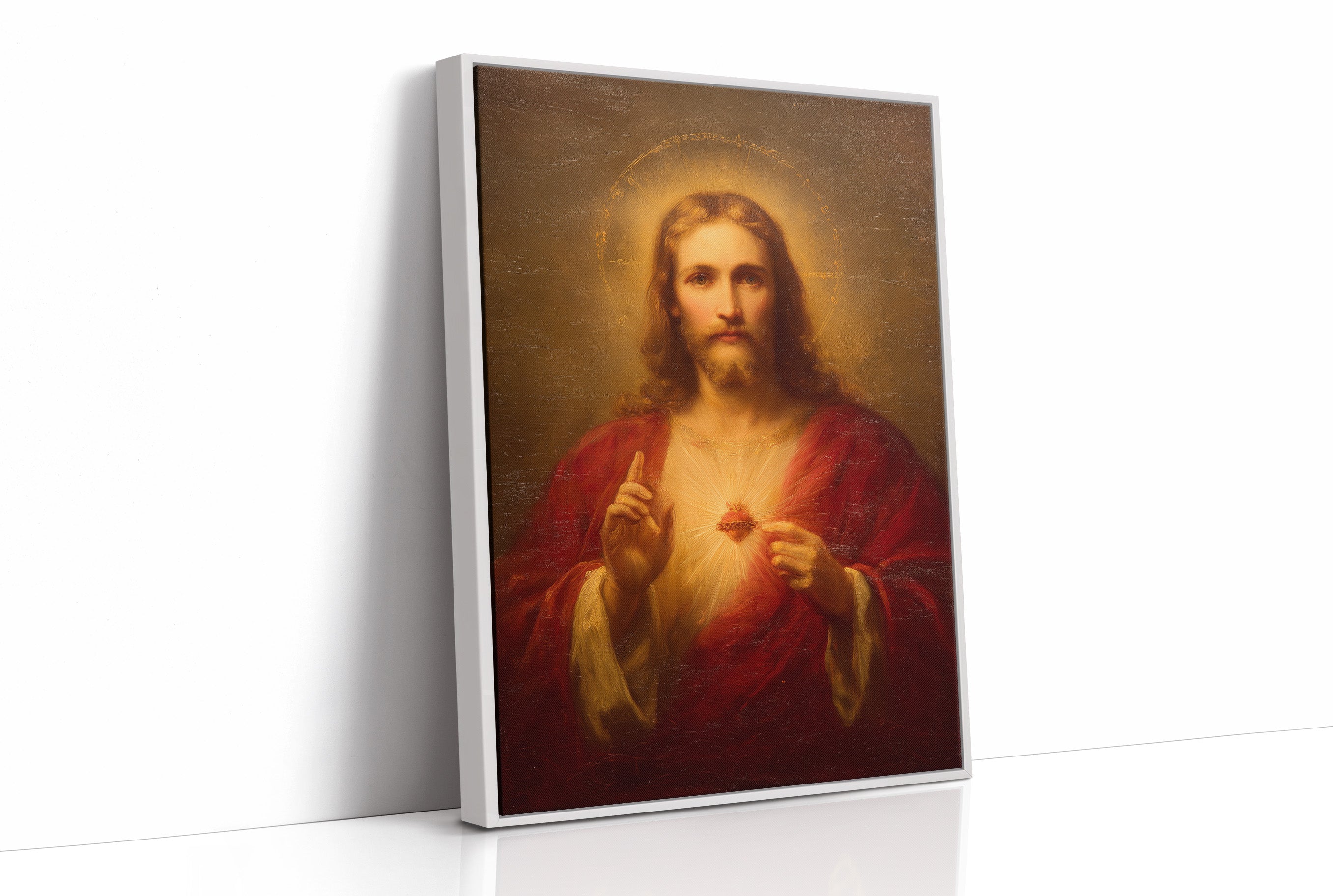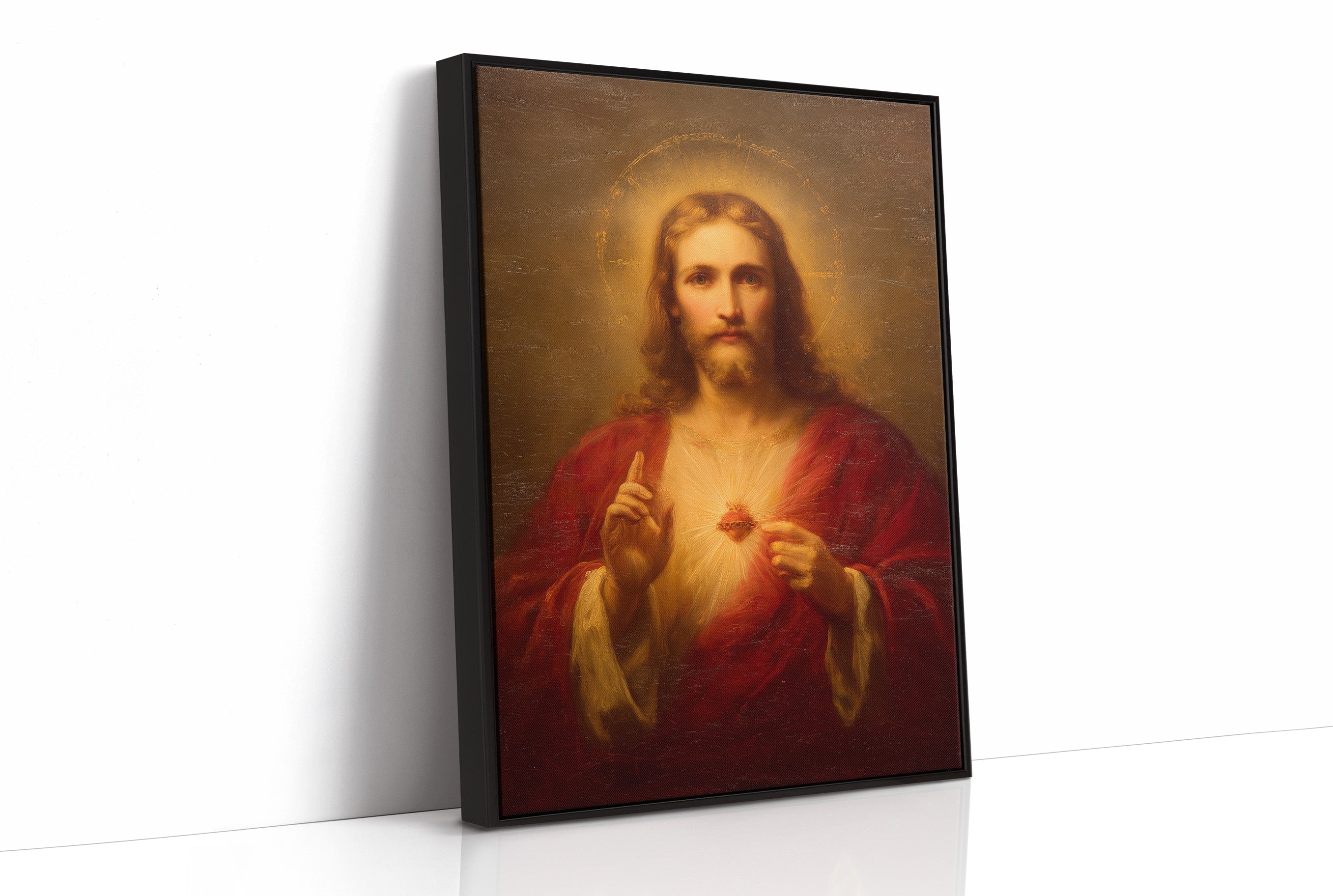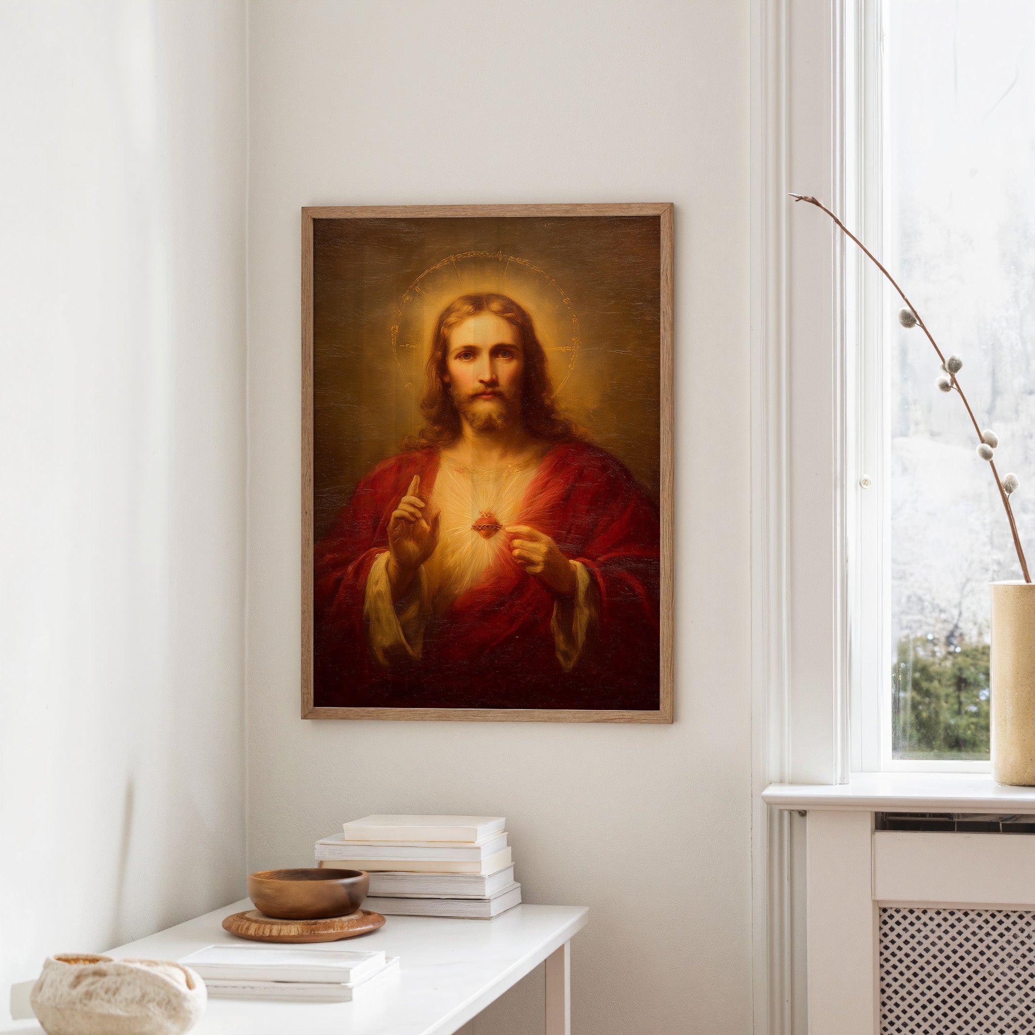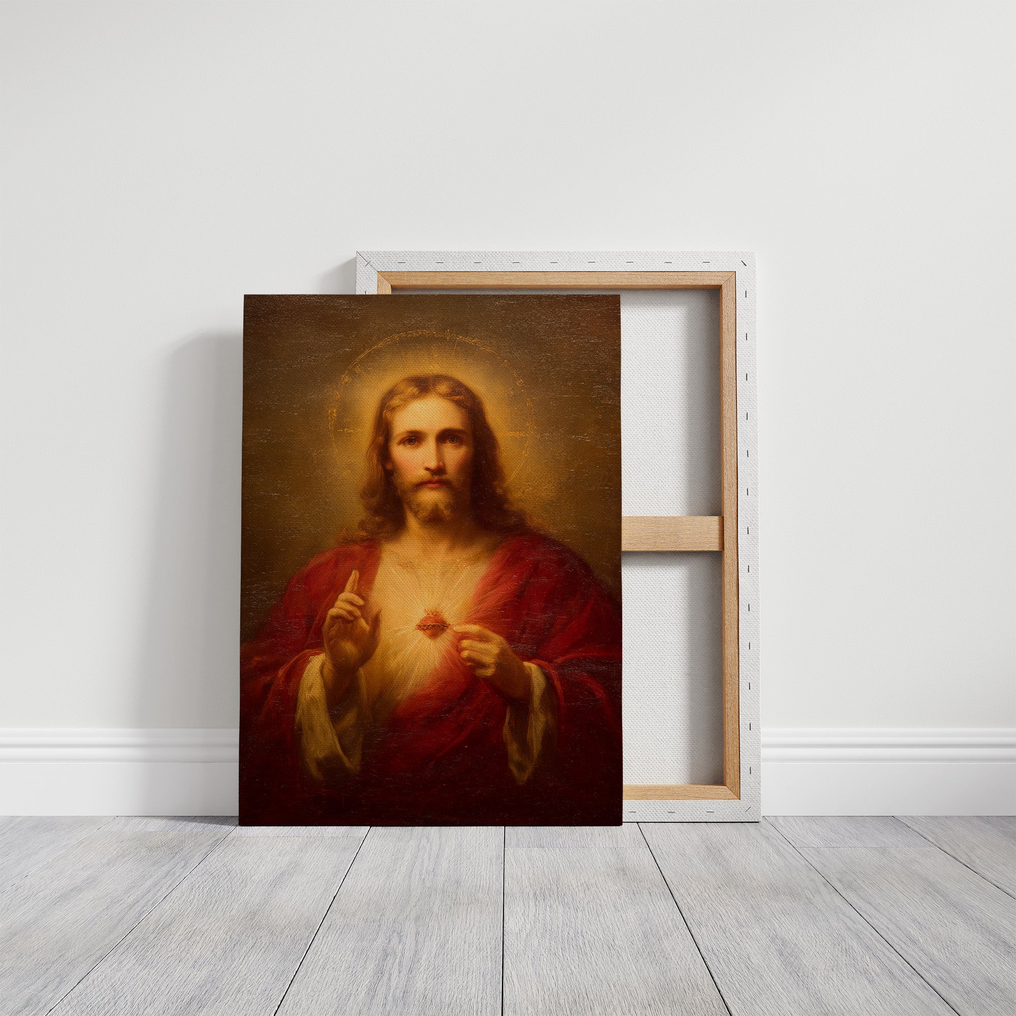 Warm light bathes the sacred portrait resting on weathered planks, creating a moment of quiet reverence. The rich crimson robes and radiant golden halo contrast beautifully with the rustic simplicity of the wooden surface below, while subtle greenery and a small cup frame the scene in humble domesticity. This classical religious artwork finds new meaning in this intimate setting, where everyday life meets spiritual contemplation.
