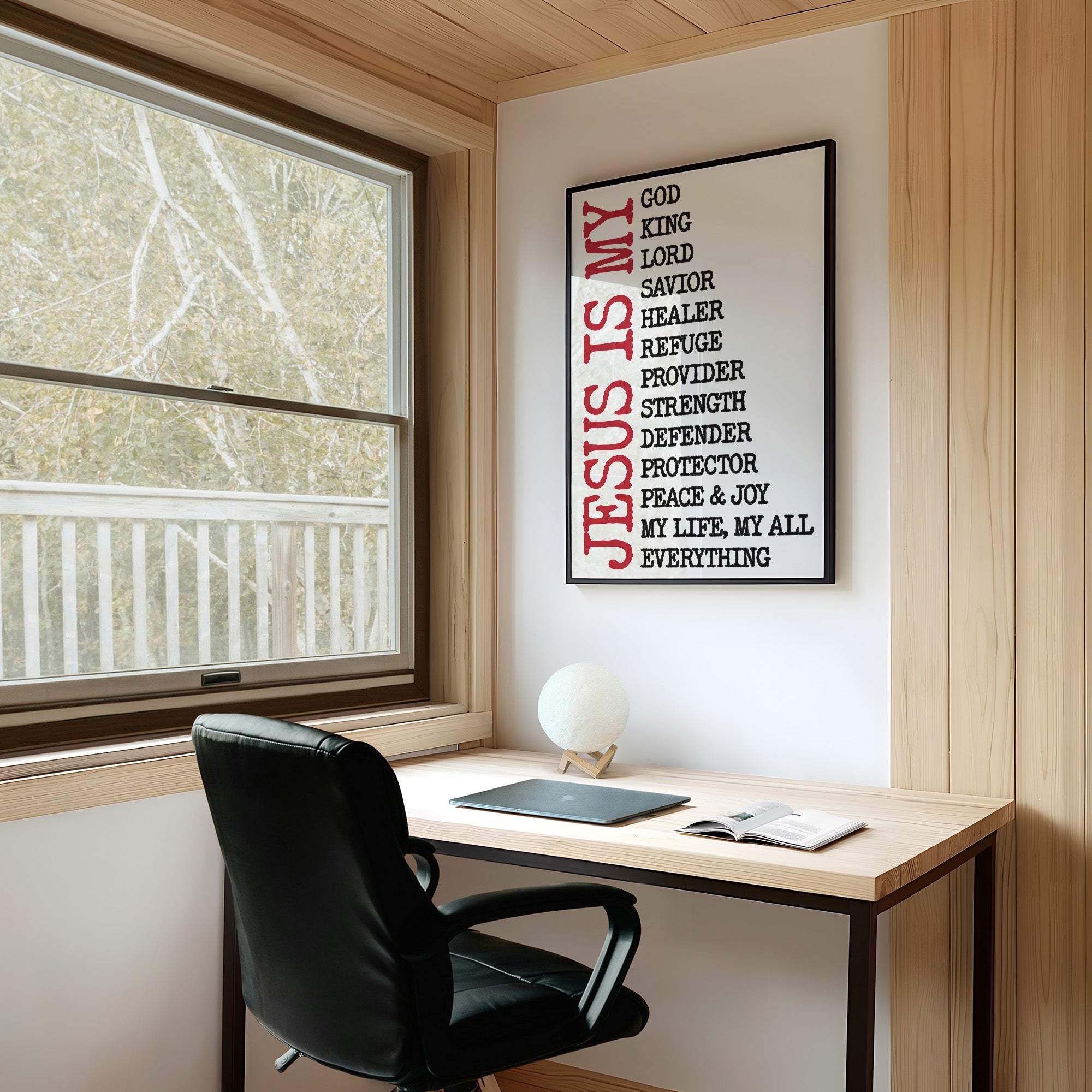 Bold crimson letters stand against pristine white, declaring the essence of devotion with striking simplicity. The vertical proclamation unfolds like a spiritual manifesto, each attribute building upon the last to create a powerful testament of belief. The stark contrast between the deep red "JESUS" and the black descriptive words creates a visual rhythm that pulls the eye downward through this modern expression of faith.