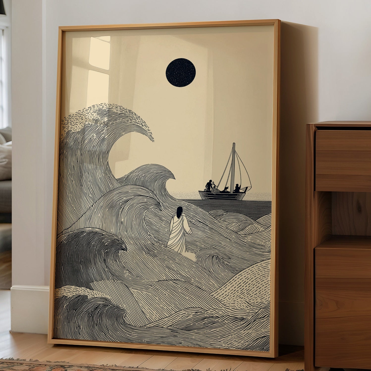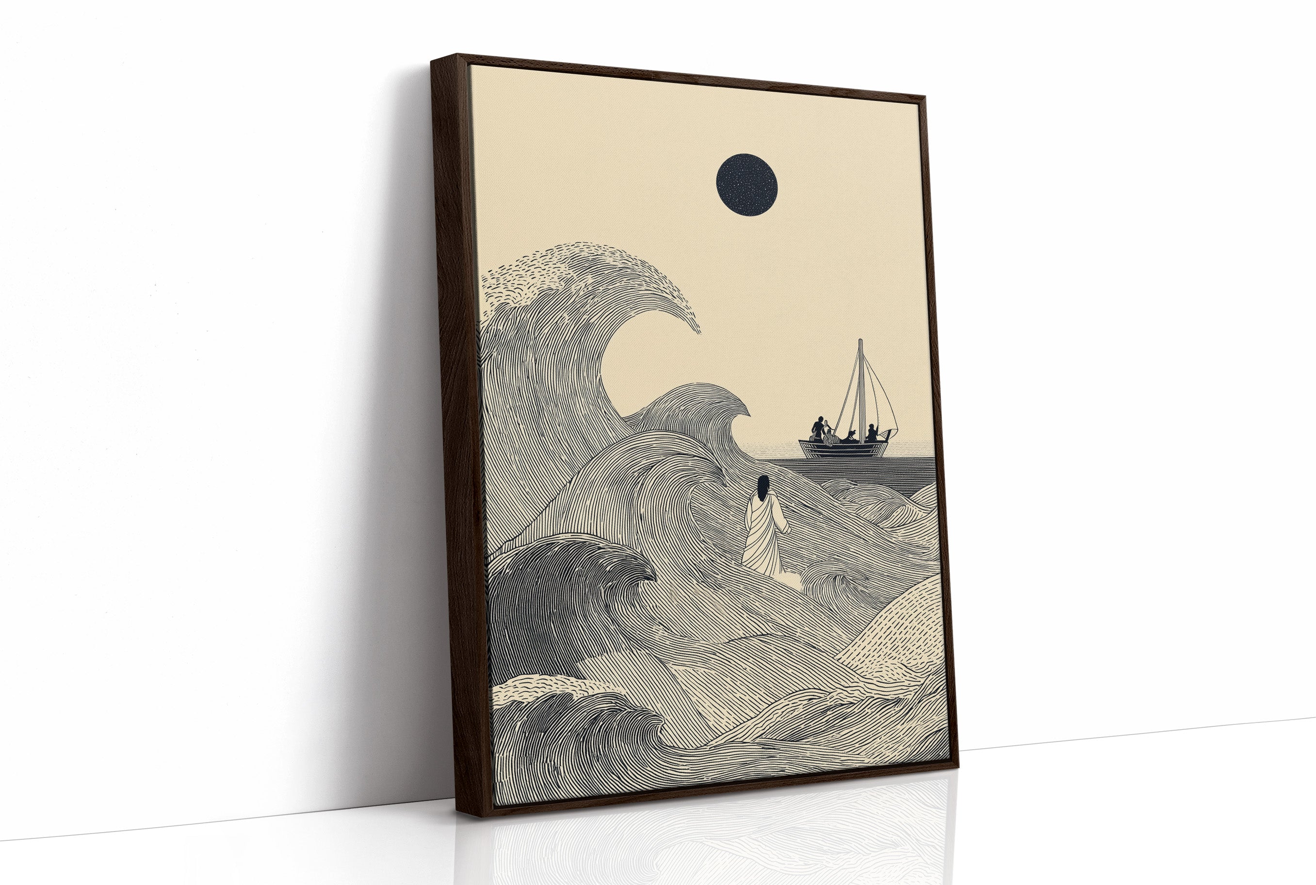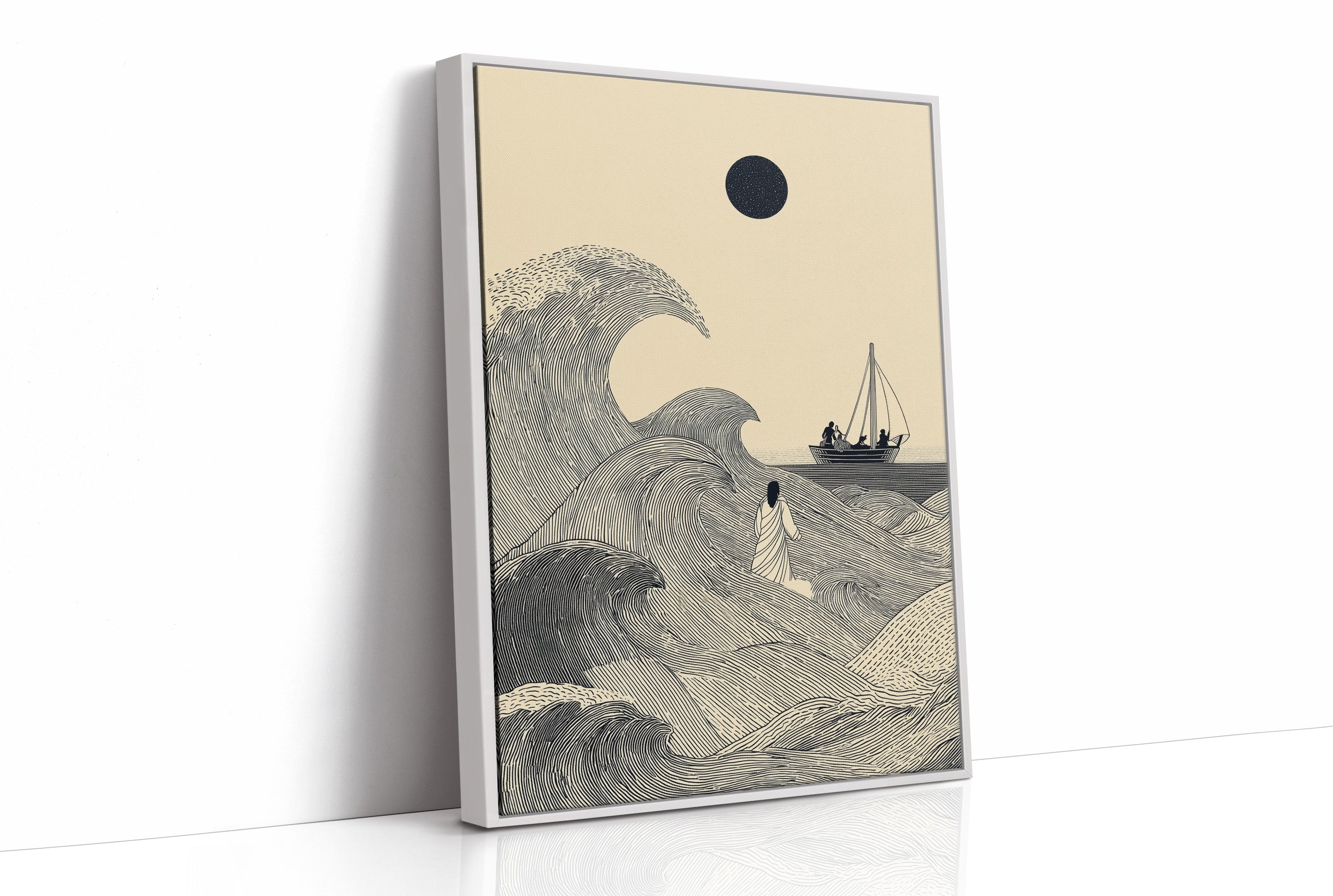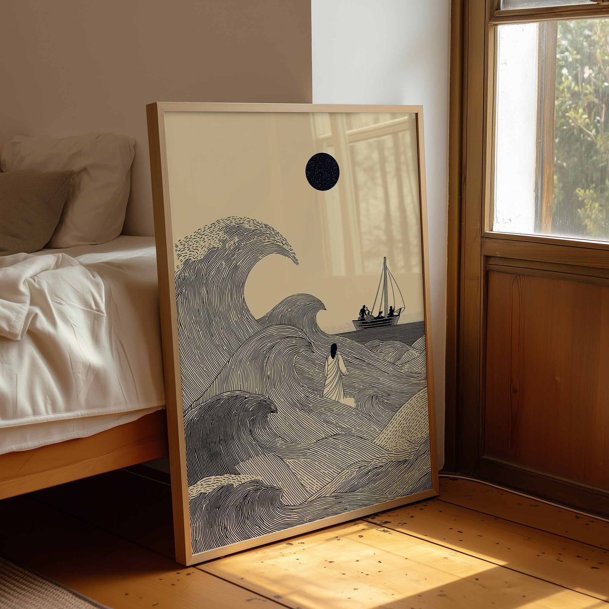 Morning light washes over a delicate illustration where line art dances across cream-colored paper. The intricate drawing captures a solitary figure standing amid swirling waves, facing a distant boat beneath a stark black moon. Fine, meticulous linework transforms tumultuous waters into a meditation on courage and solitude, each stroke building texture against the warm simplicity of the page. This contemplative piece brings serene sophistication to reading nooks, home offices, or meditation spaces where quiet reflection is cherished.