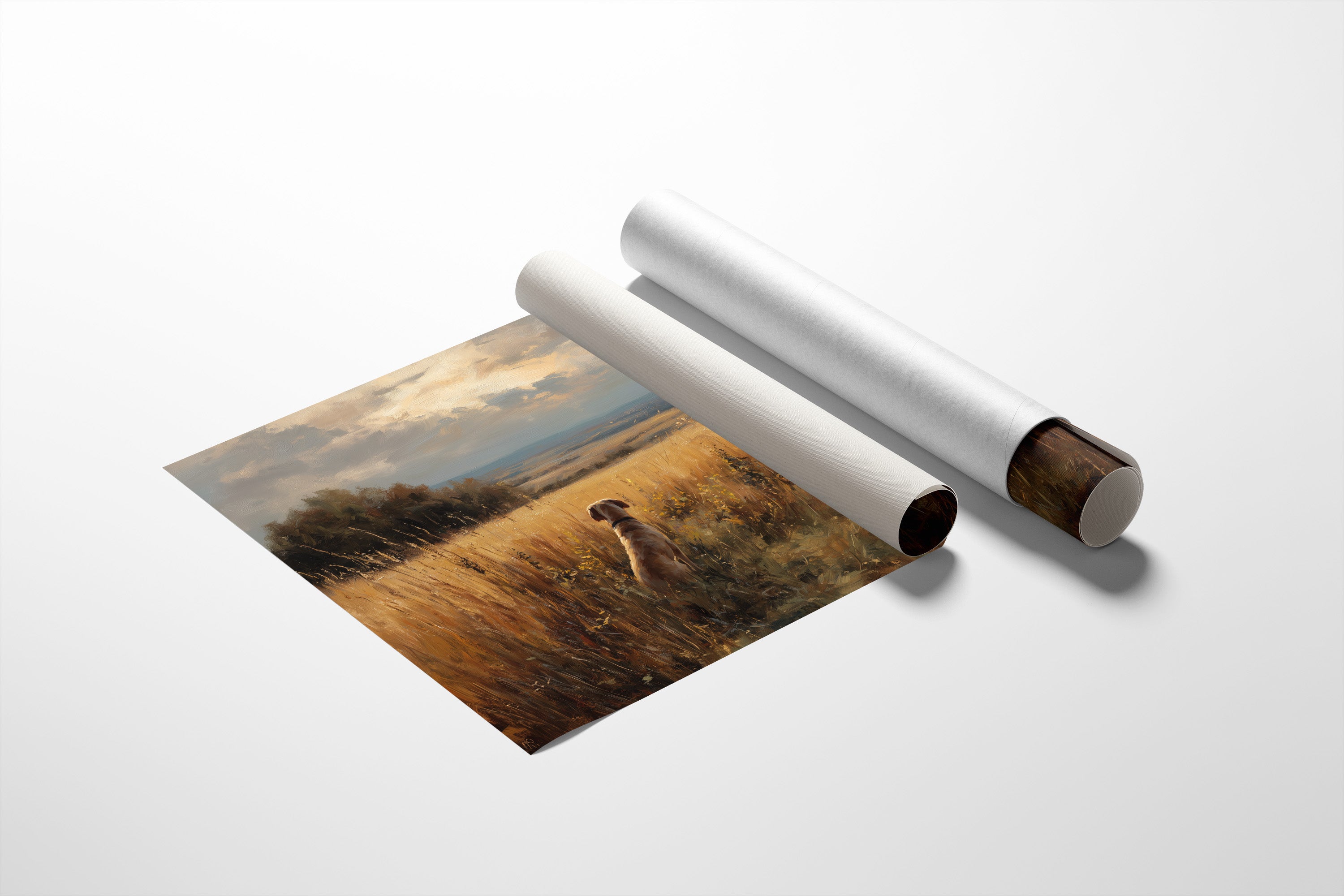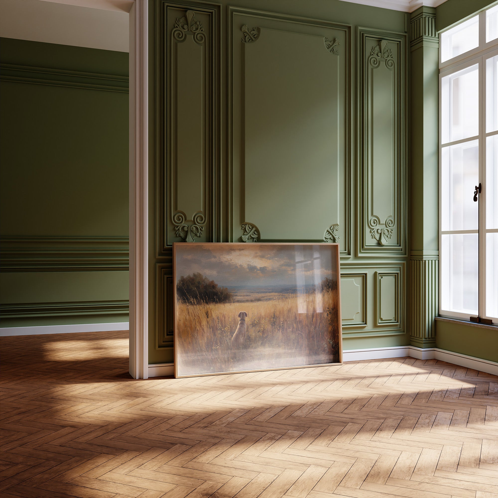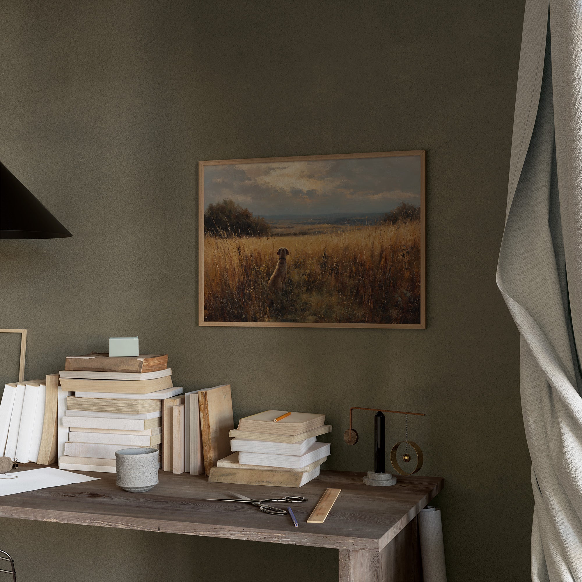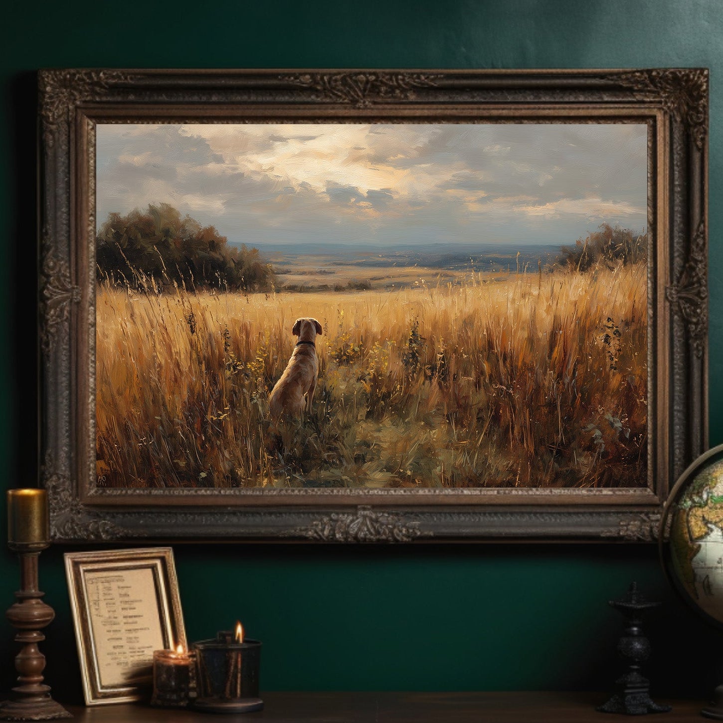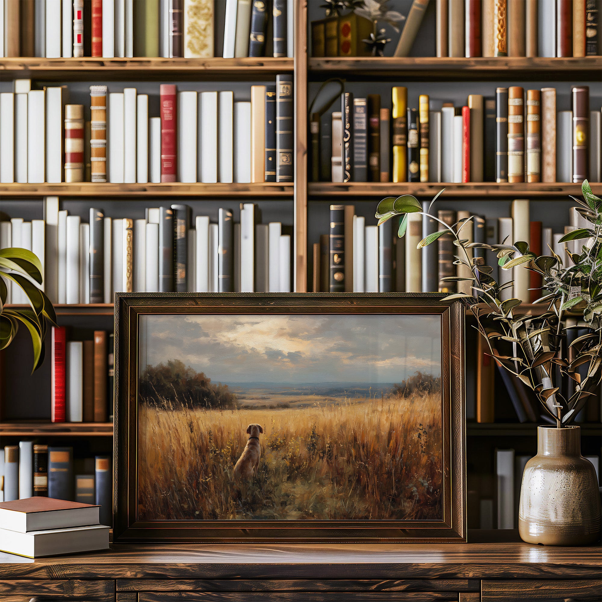 A moment of quiet anticipation captured in golden afternoon light. The painting depicts a loyal dog sitting among tall amber grasses, gazing outward toward a vast landscape that stretches to the distant horizon. Warm earth tones blend with soft blues of the expansive sky, creating a sense of peaceful solitude and patient companionship. The framed artwork rests elegantly against a backdrop of bookshelves, where knowledge and nature coexist in harmonious balance.